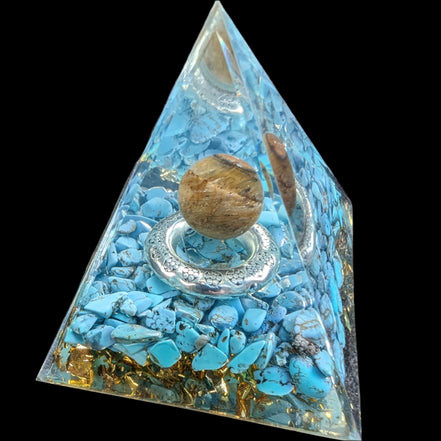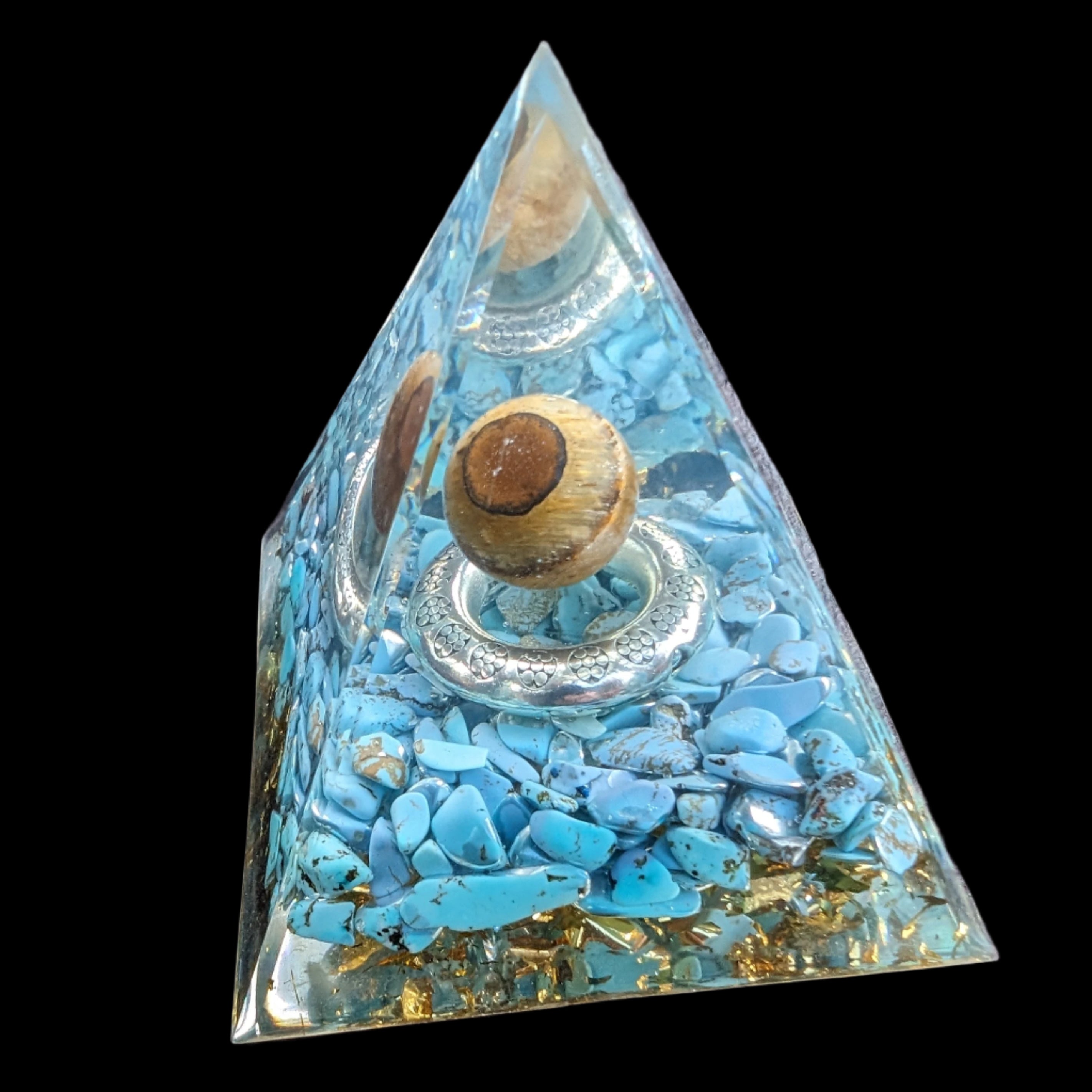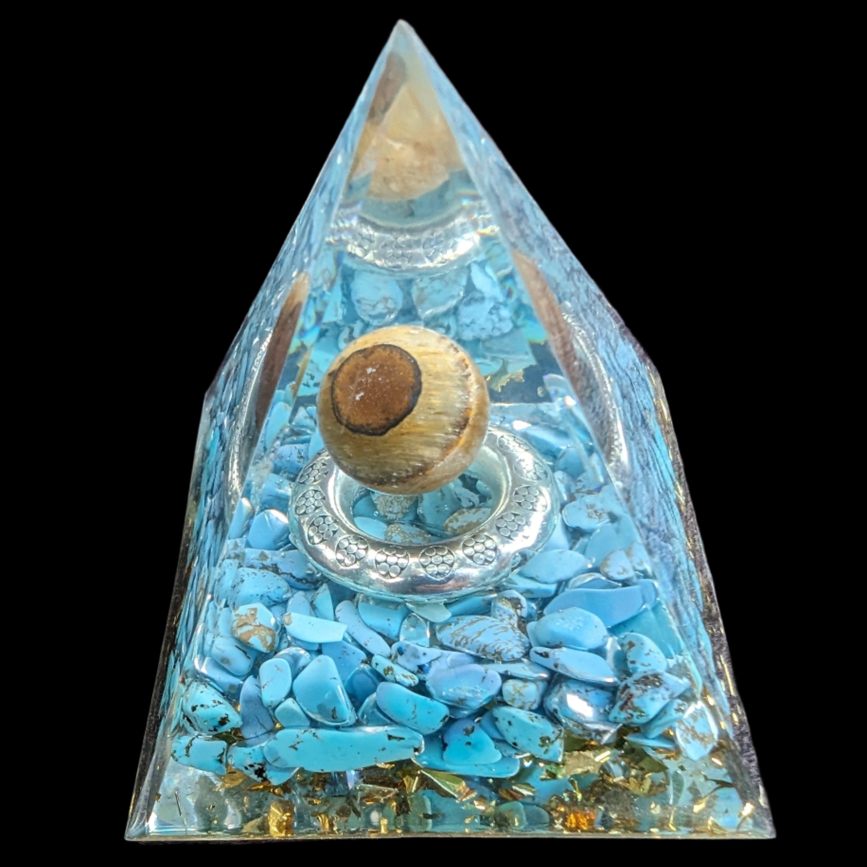 This Orgone pyramid weighs 65g. Its features include a Tigers Eye sphere. Orgone pyramids combine crystal and metal in resin. The composition and geometry is based on Wilhelm Reich’s research and theories on orgone energy. Orgone pyramids amplify and transmit healing frequencies through the structured combination of their different elements. Orgone energy has similarities the energies described in ancient traditions that are known as Prana, Chi, or universal energy. Orgone energy is created by the layers of organic resin and the inorganic crystals and metals. Orgone pyramids may also feature symbols drawn from Astrology, Reiki or traditional knowledges. Examples include the Buddha’s Wheel of Dharma, Astrological symbols, the Gnosa (a reiki symbol), the Hindu Om symbol, and the Tree of Life.