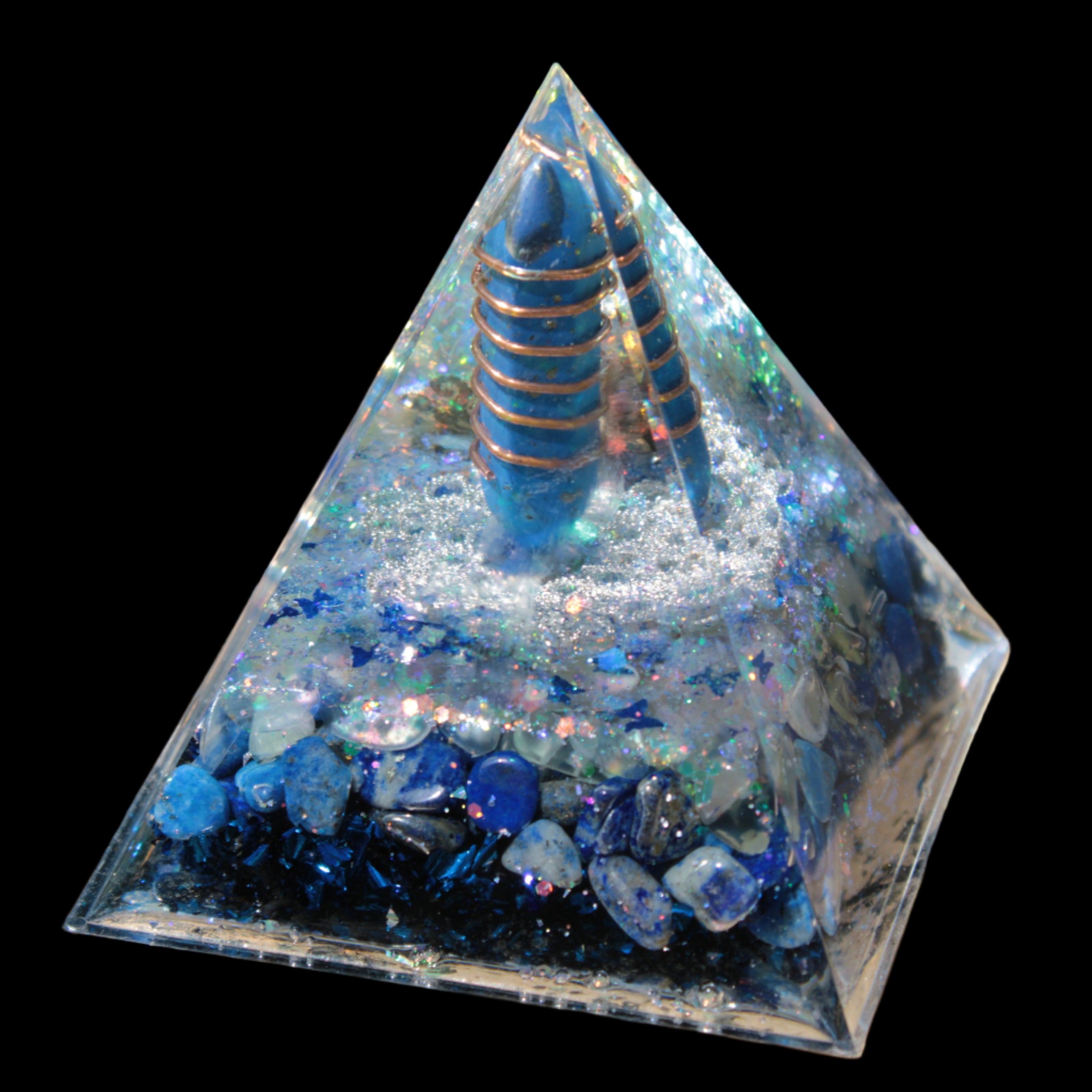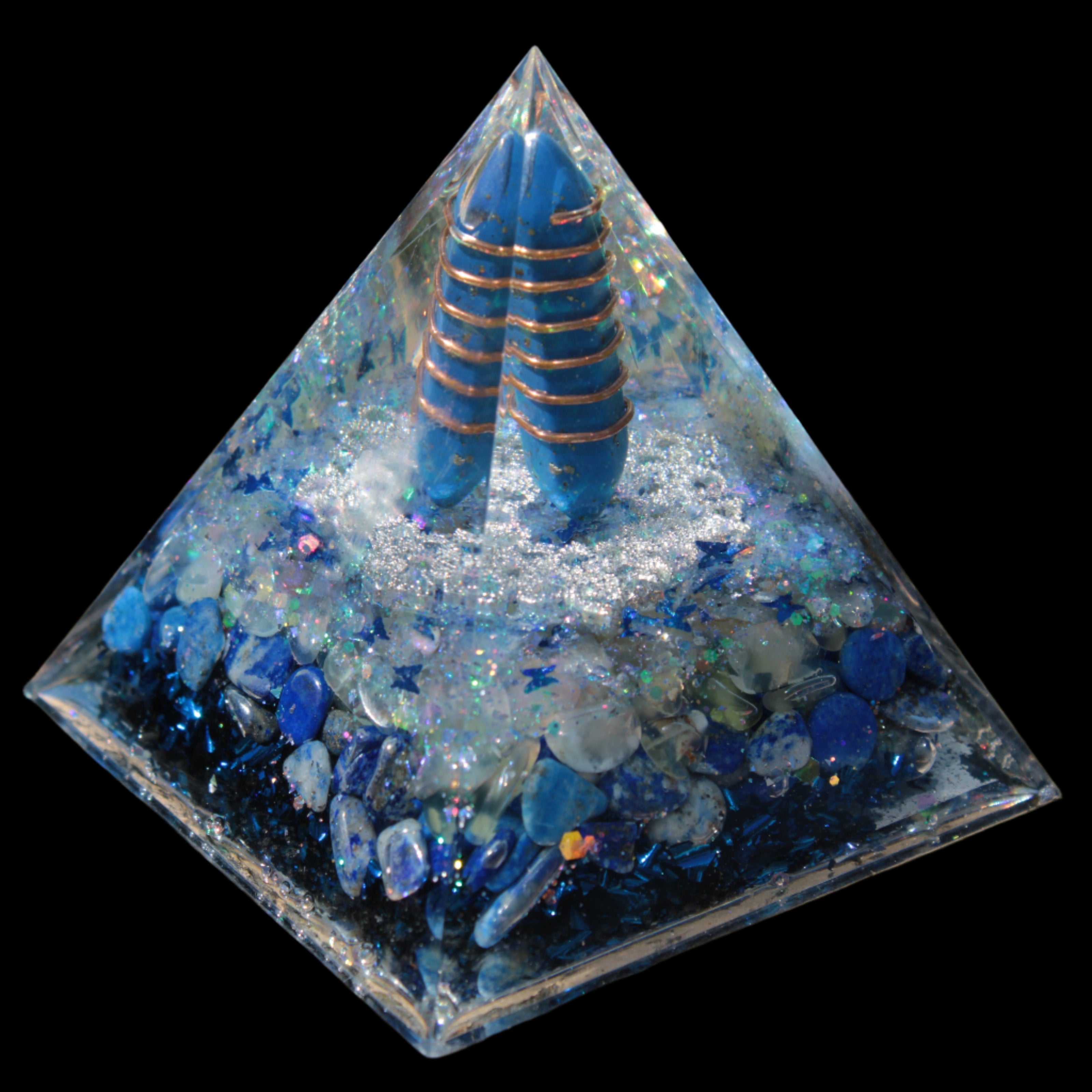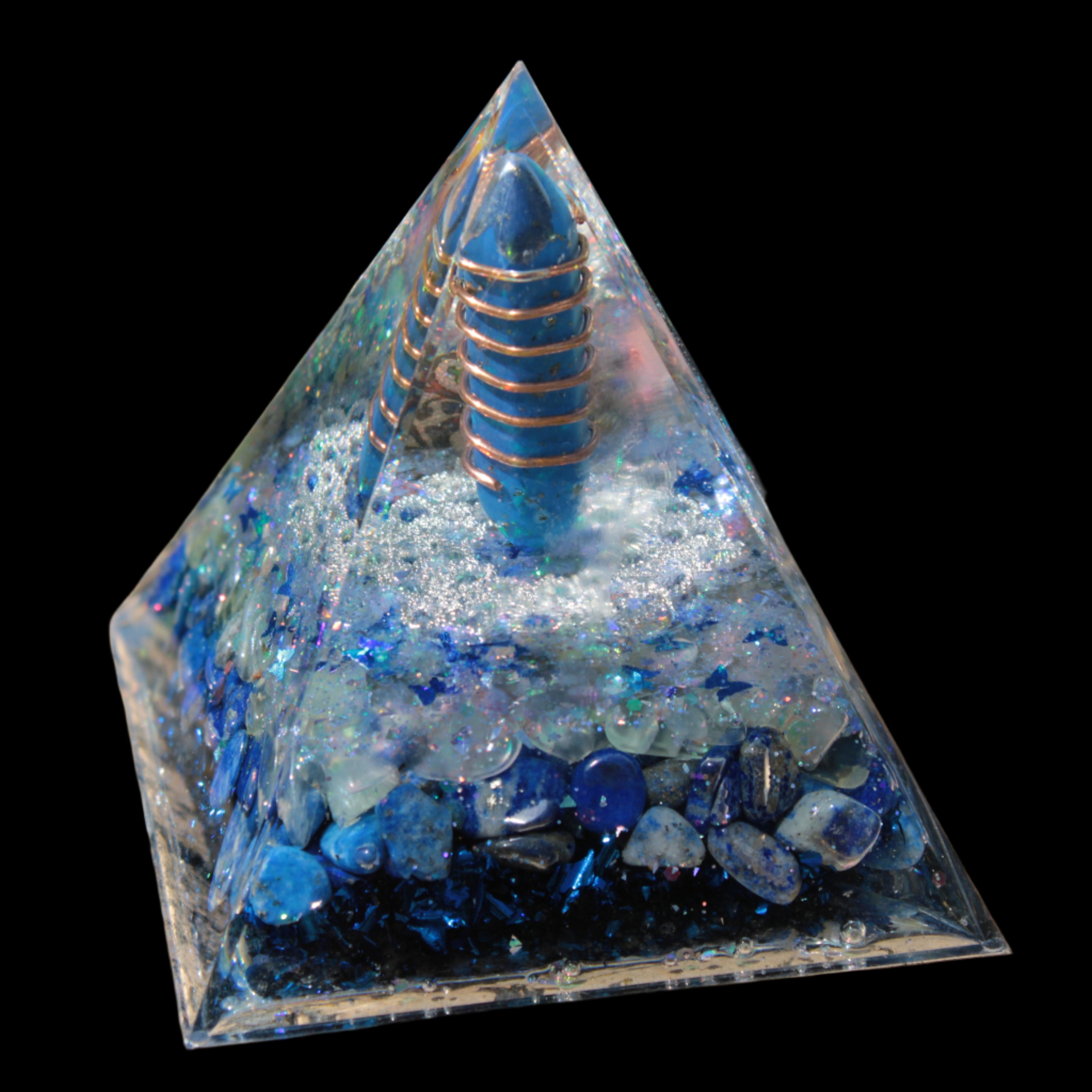 This Orgone pyramid blue weighs 112g. Orgone pyramids combine crystal and metal in resin. The composition and geometry is based on Wilhelm Reich’s research and theories on orgone energy. Orgone pyramids amplify and transmit healing frequencies through the structured combination of their different elements.