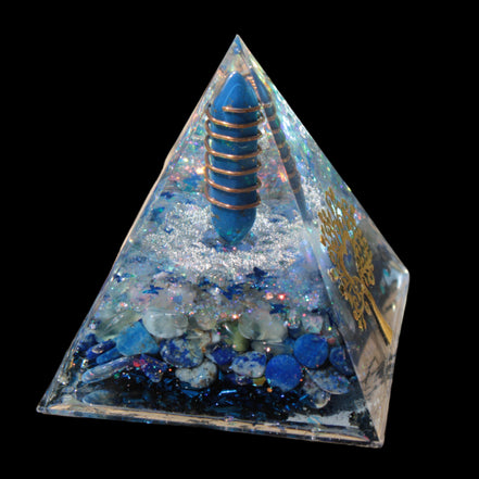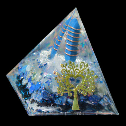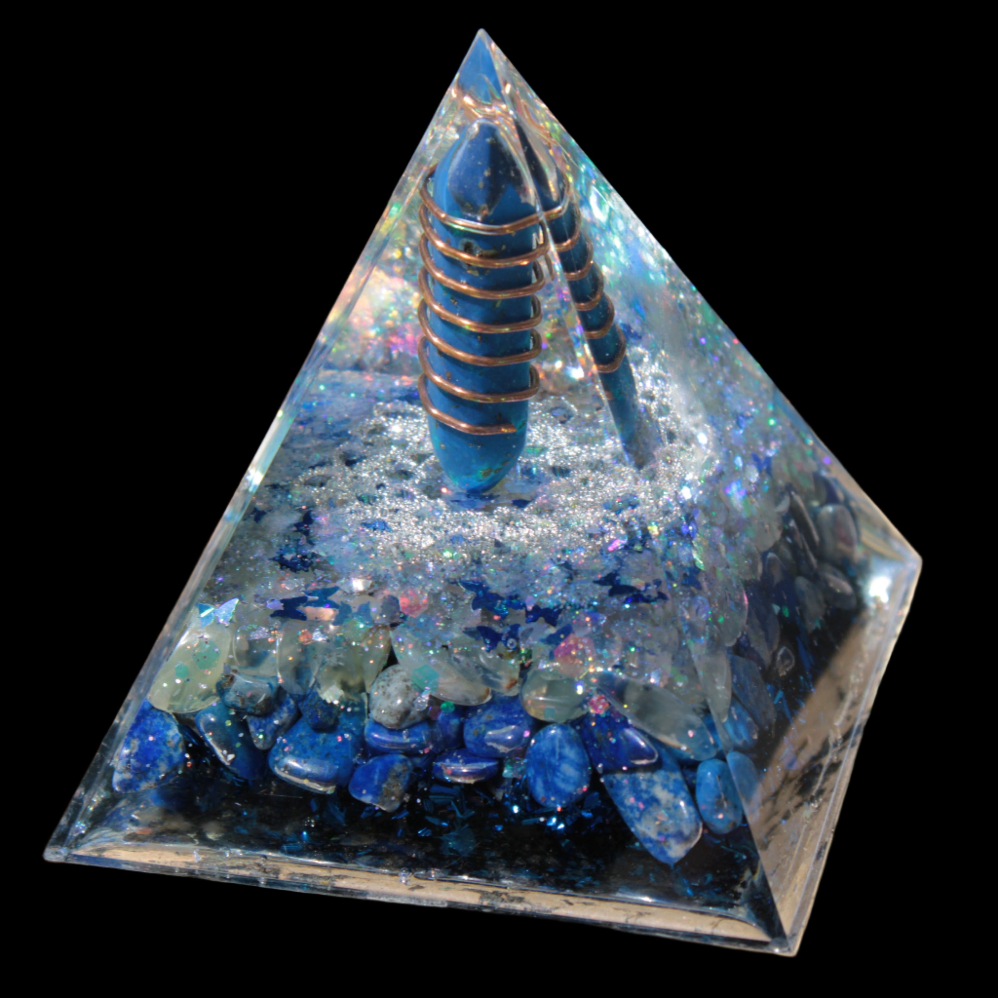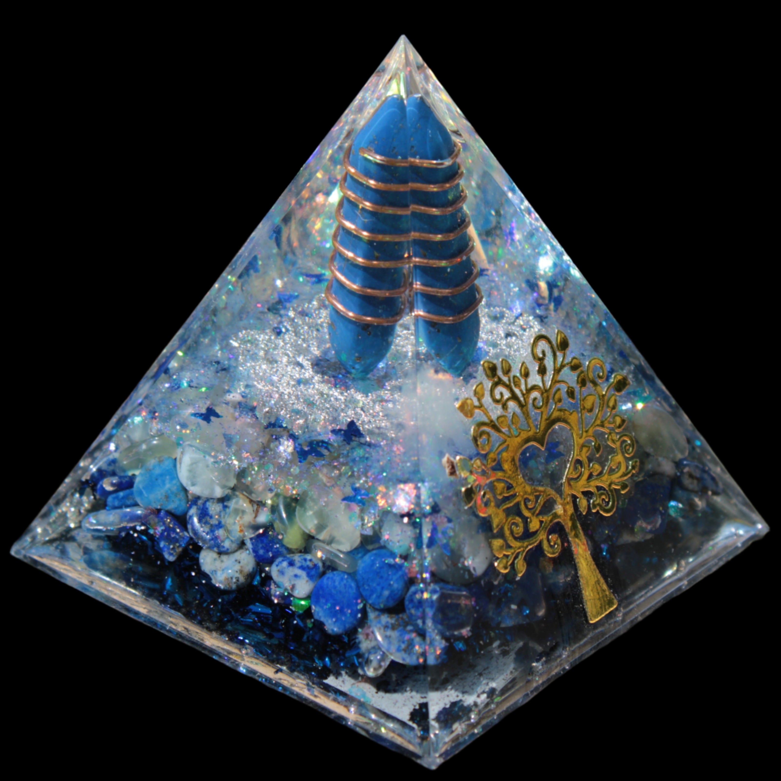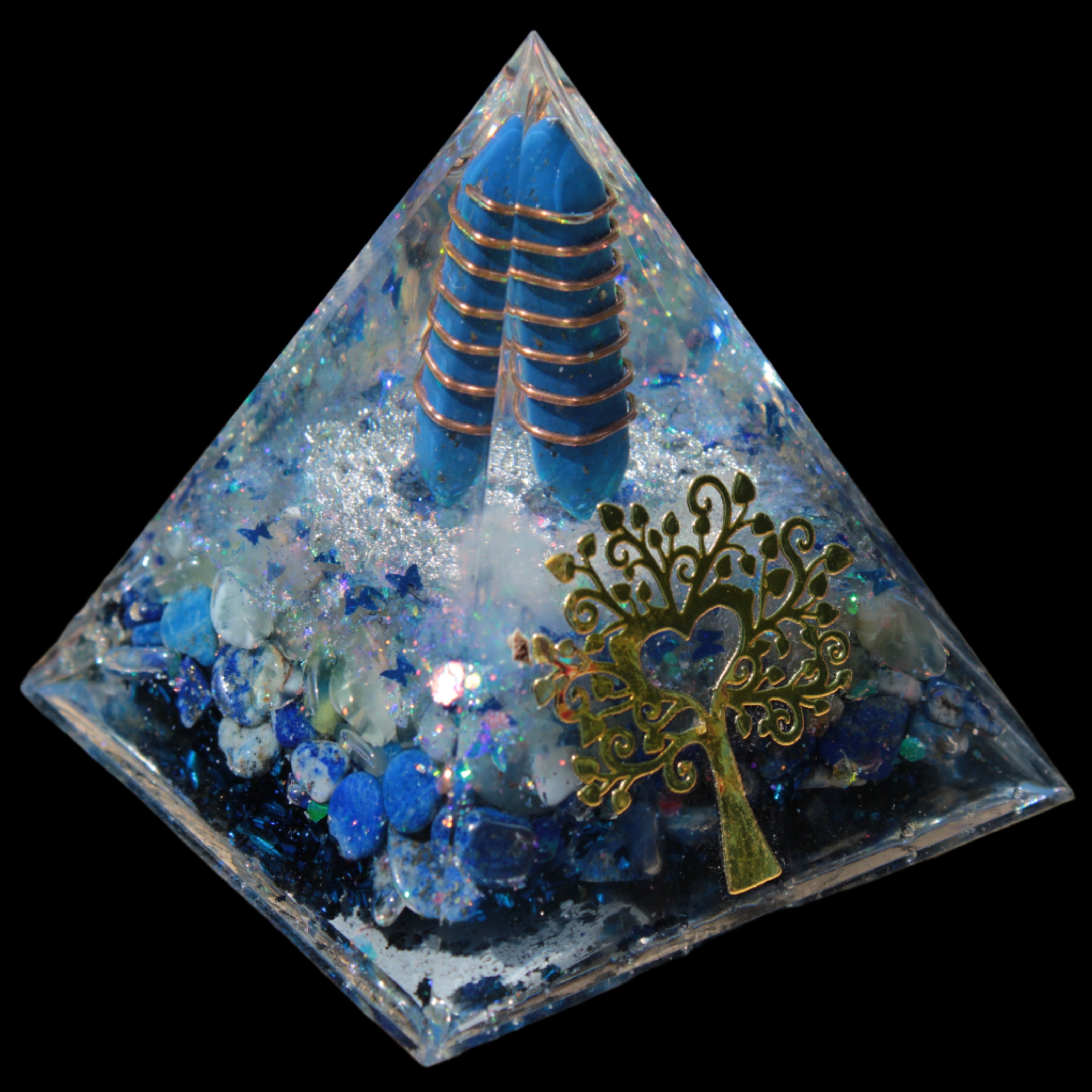 This Orgone pyramid blue weighs 112g. Orgone pyramids combine crystal and metal in resin. The composition and geometry is based on Wilhelm Reich’s research and theories on orgone energy. Orgone pyramids amplify and transmit healing frequencies through the structured combination of their different elements.