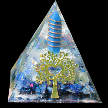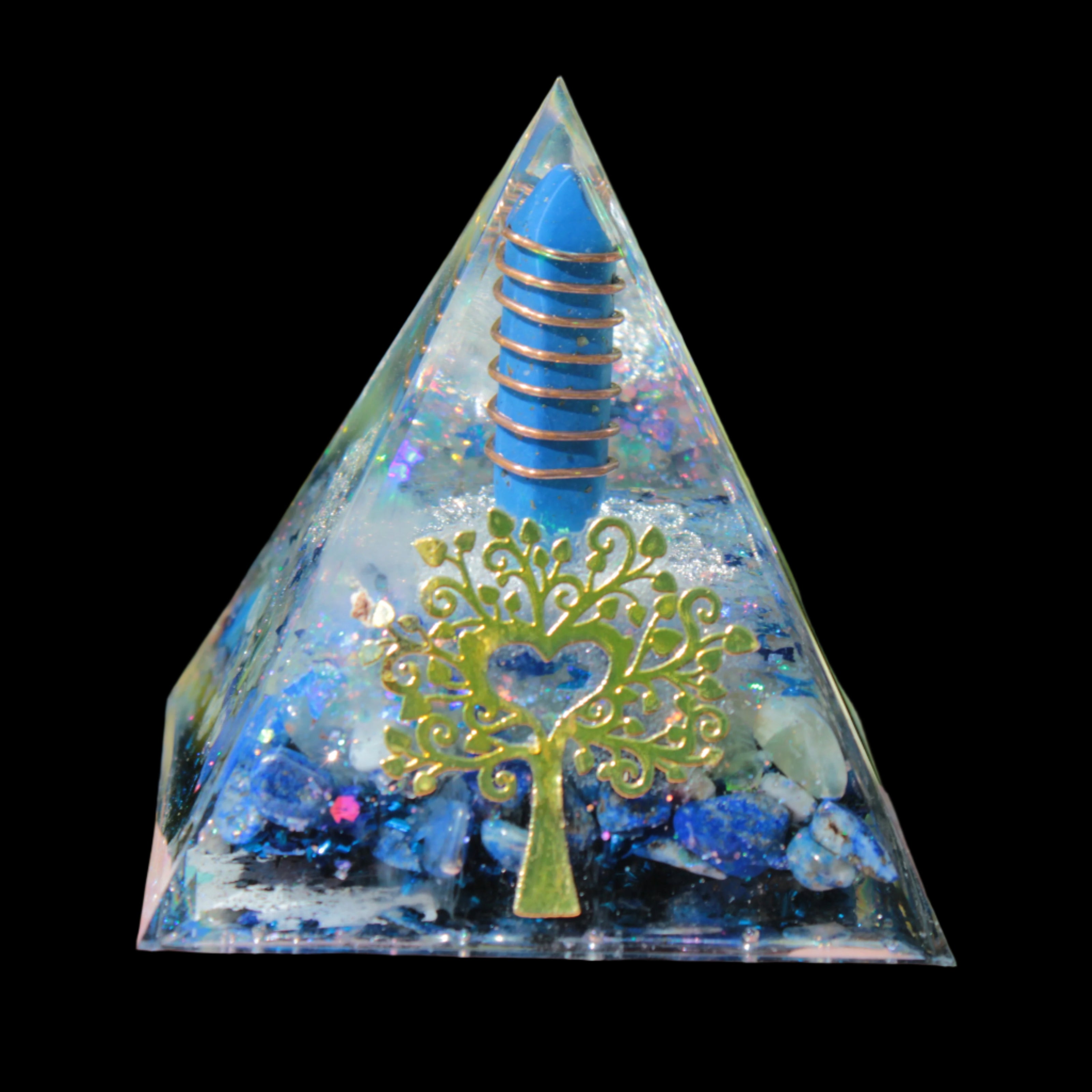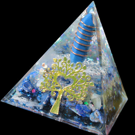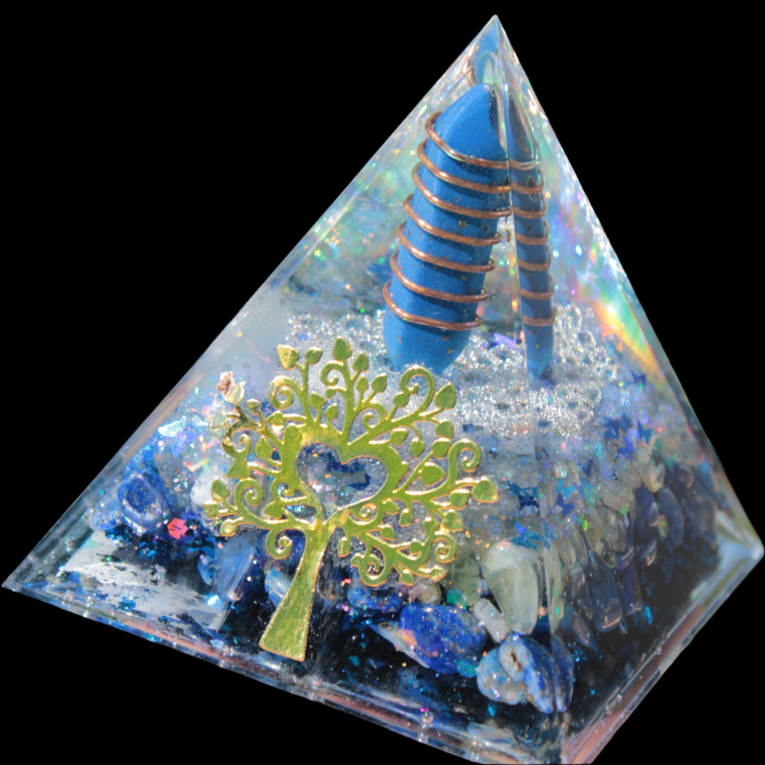 Orgone energy has similarities the energies described in ancient traditions that are known as Prana, Chi, or universal energy. Orgone energy is created by the layers of organic resin and the inorganic crystals and metals. Orgone pyramids may also feature symbols drawn from Astrology, Reiki or traditional knowledges. Examples include the Buddha’s Wheel of Dharma, Astrological symbols, the Gnosa (a reiki symbol), the Hindu Om symbol, and the Tree of Life.