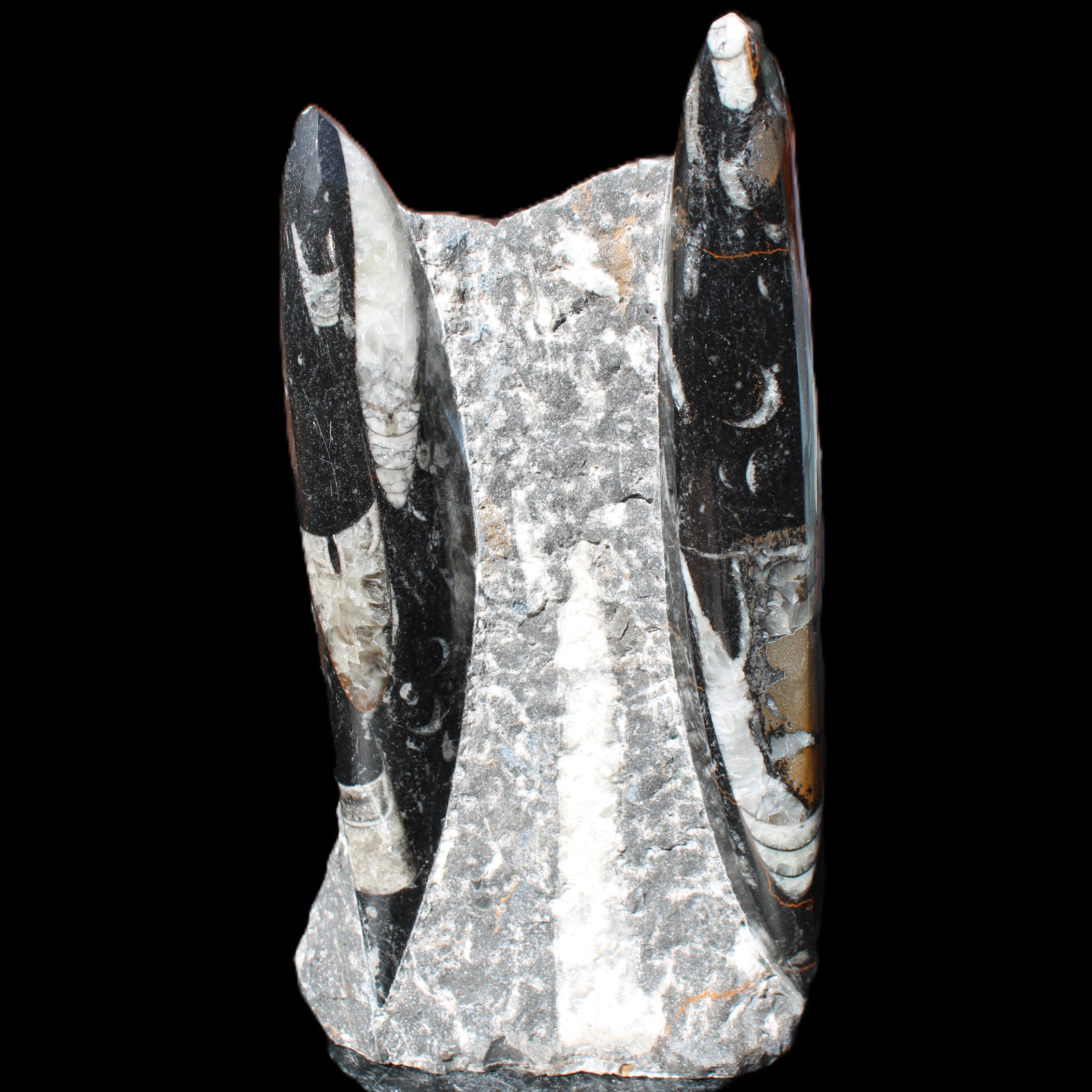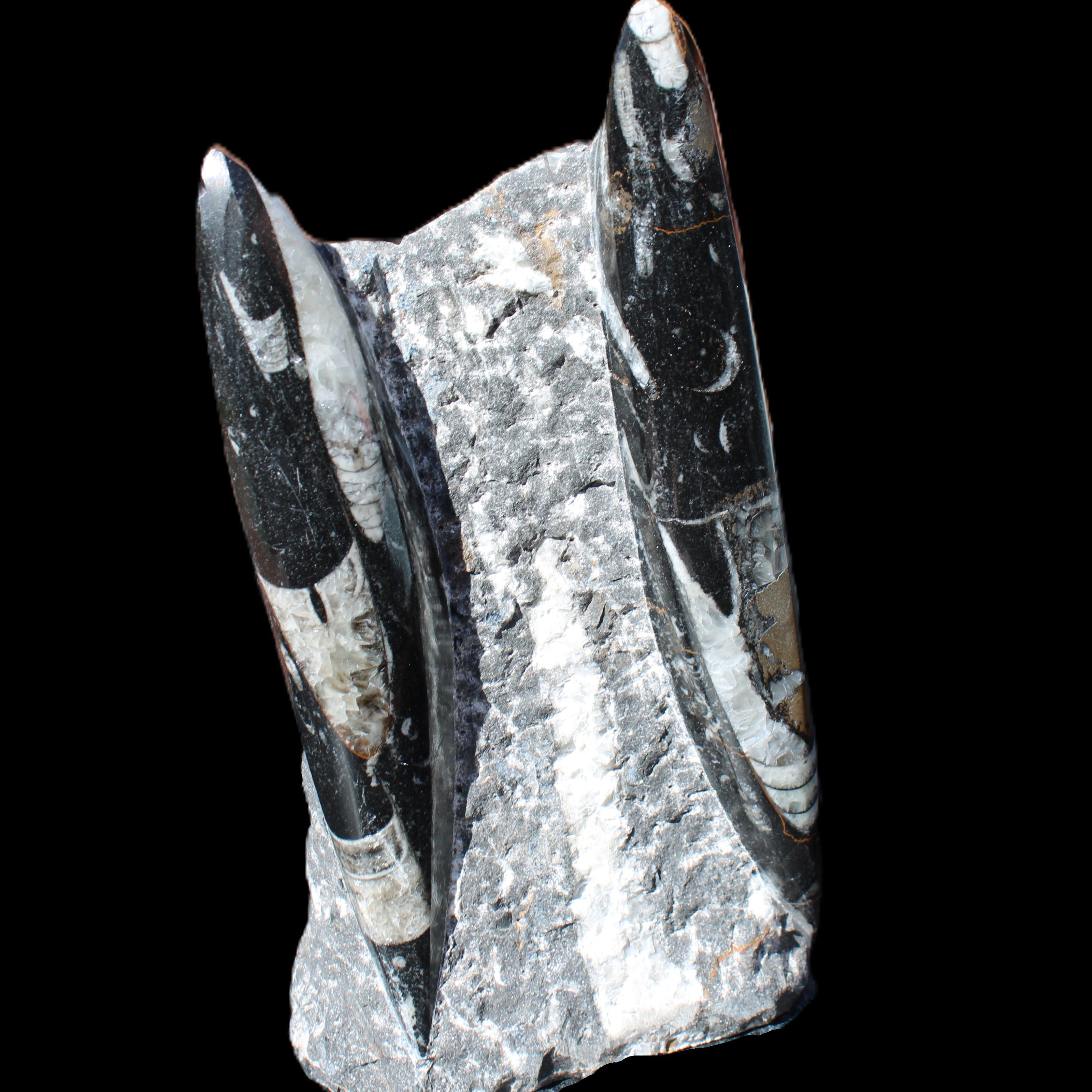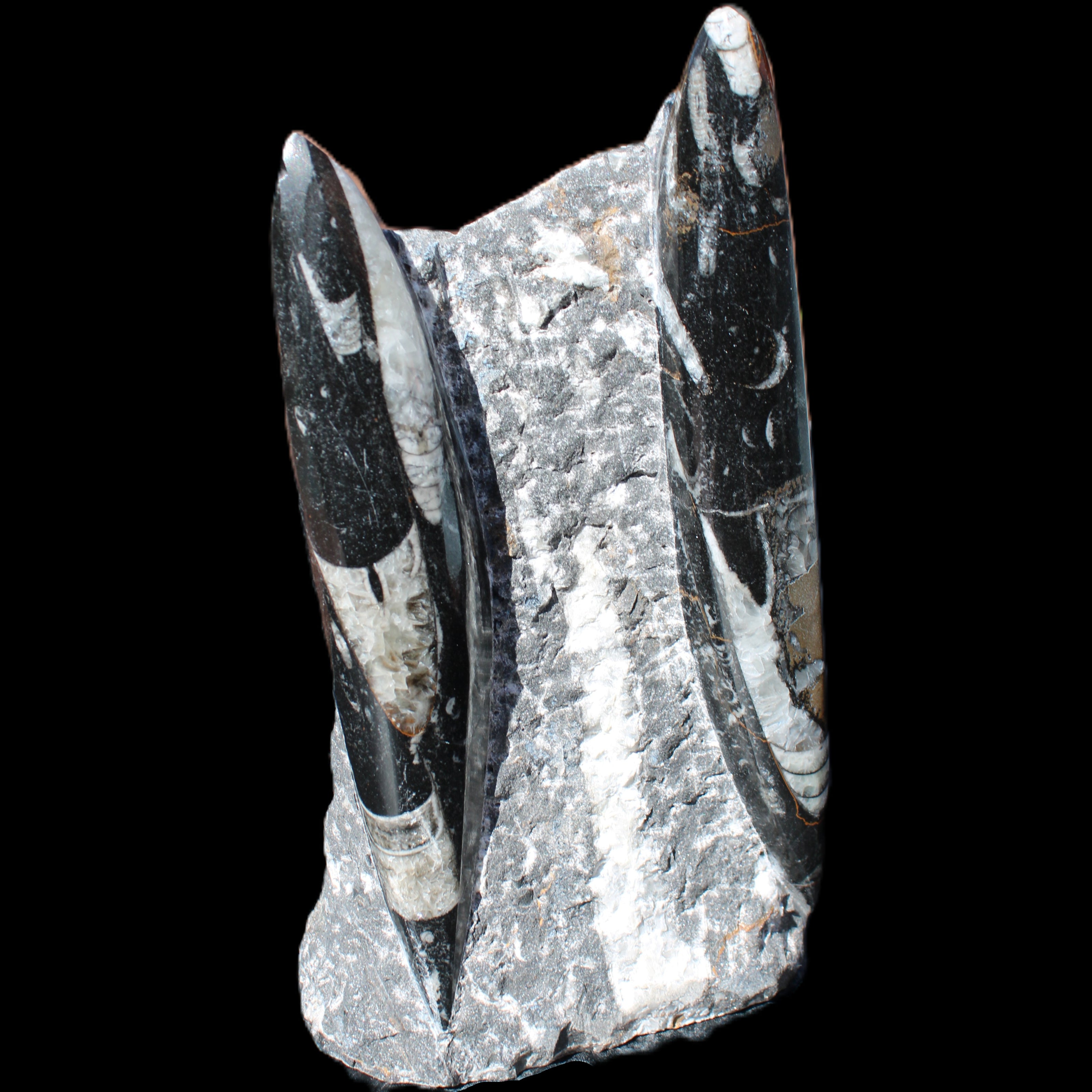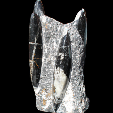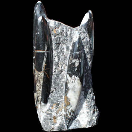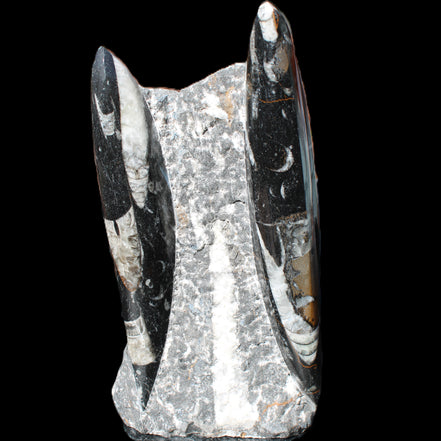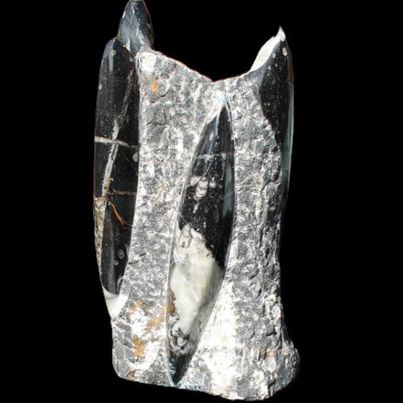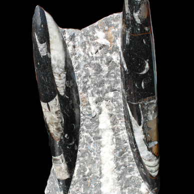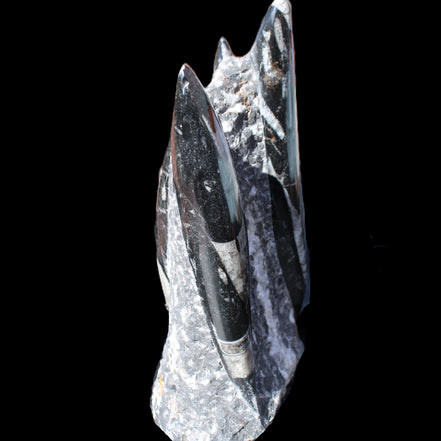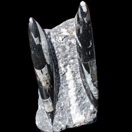 Orthoceras fossils are typically black or grey, with white or beige patterns of calcite and (blackish) mud and organic matter remnants. These fossils are found in sedimentary limestone and shale deposits around the globe. Orthoceras were Nautiloid cephalopods, ancestors to modern-day squid and octopus. Orthoceras fossils are mainly found and mined in Morocco. There, they are commonly found with round Ammonites called Goniatites. Orthoceras fossils are among the earliest recognizable animals. Although they were among the earliest forms of life, this class of Nautiloid is considered one of the more intelligent forms of ocean life.