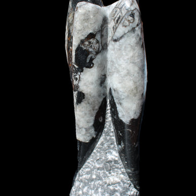 Orthoceras fossils are typically black or grey, with white or beige patterns of calcite and (blackish) mud and organic matter remnants. These fossils are found in sedimentary limestone and shale deposits around the globe. Orthoceras were Nautiloid cephalopods, ancestors to modern-day squid and octopus. Orthoceras fossils are mainly found and mined in Morocco. There, they are commonly found with round Ammonites called Goniatites. Orthoceras fossils are among the earliest recognizable animals. Although they were among the earliest forms of life, this class of Nautiloid is considered one of the more intelligent forms of ocean life.