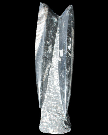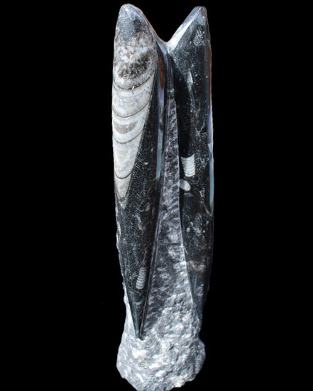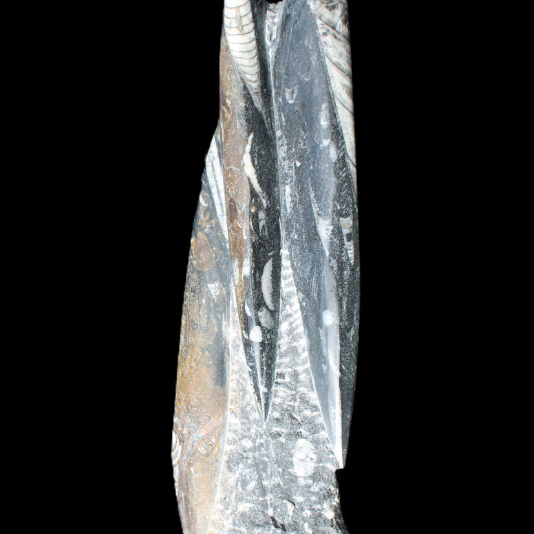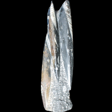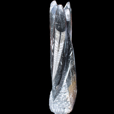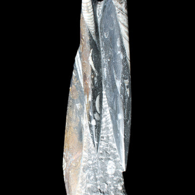 Orthoceras fossils are typically black or grey, with white or beige patterns of calcite and (blackish) mud and organic matter remnants. These fossils are found in sedimentary limestone and shale deposits around the globe. Orthoceras were Nautiloid cephalopods, ancestors to modern-day squid and octopus. Orthoceras fossils are mainly found and mined in Morocco. There, they are commonly found with round Ammonites called Goniatites. Orthoceras fossils are among the earliest recognizable animals. Although they were among the earliest forms of life, this class of Nautiloid is considered one of the more intelligent forms of ocean life.