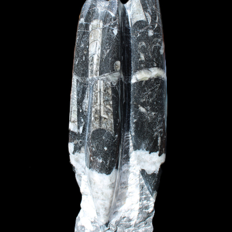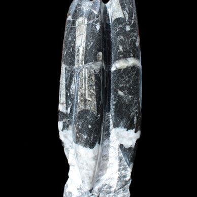 Orthoceras fossils are typically black or grey, with white or beige patterns of calcite and (blackish) mud and organic matter remnants. These fossils are found in sedimentary limestone and shale deposits around the globe. Orthoceras were Nautiloid cephalopods, ancestors to modern-day squid and octopus. Orthoceras fossils are mainly found and mined in Morocco. There, they are commonly found with round Ammonites called Goniatites. Orthoceras fossils are among the earliest recognizable animals. Although they were among the earliest forms of life, this class of Nautiloid is considered one of the more intelligent forms of ocean life.