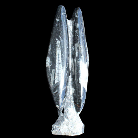 Orthoceras fossils are typically black or grey, with white or beige patterns of calcite and (blackish) mud and organic matter remnants. These fossils are found in sedimentary limestone and shale deposits around the globe. Orthoceras were Nautiloid cephalopods, ancestors to modern-day squid and octopus. Orthoceras fossils are mainly found and mined in Morocco. There, they are commonly found with round Ammonites called Goniatites. Orthoceras fossils are among the earliest recognizable animals. Although they were among the earliest forms of life, this class of Nautiloid is considered one of the more intelligent forms of ocean life.