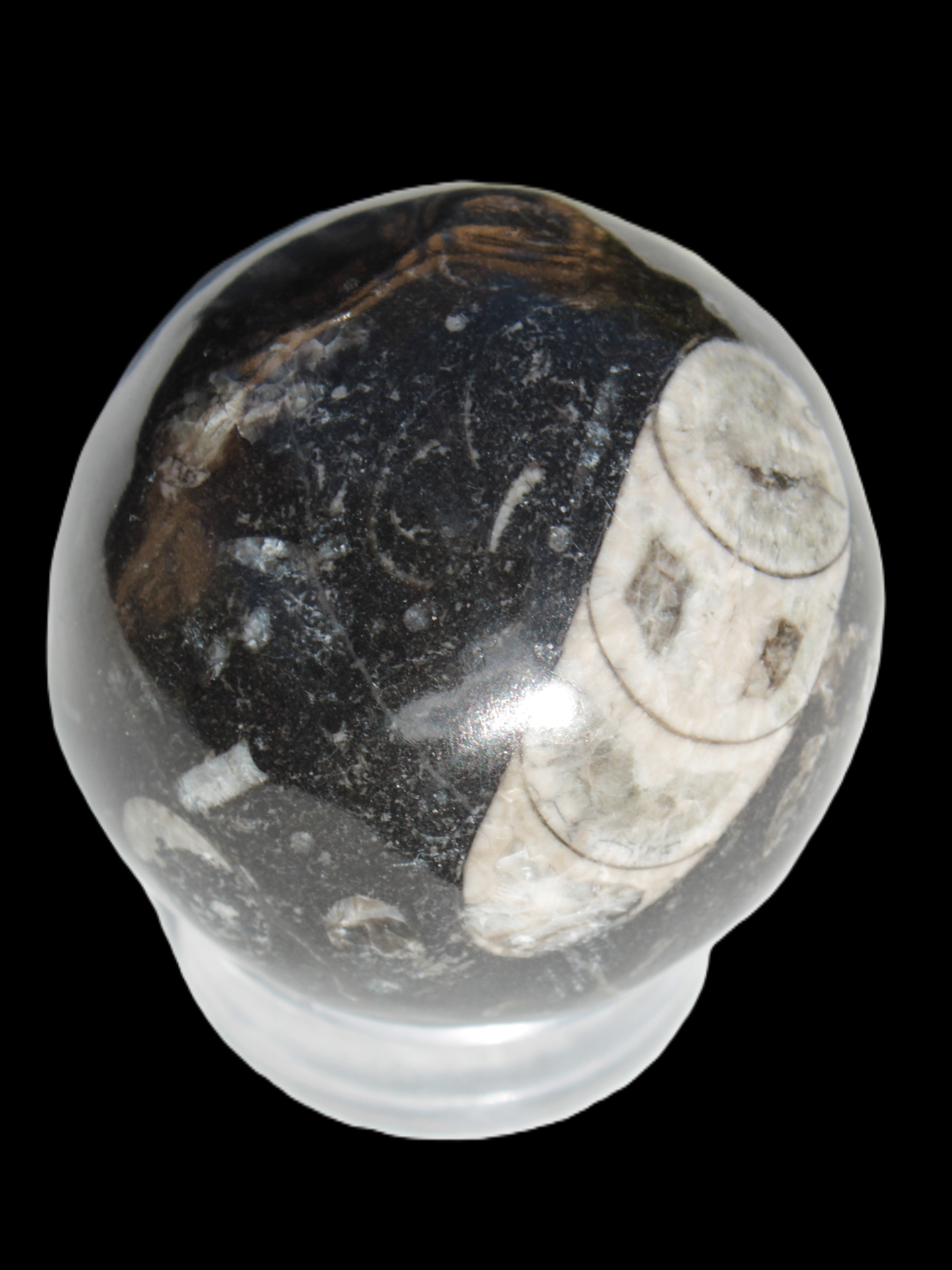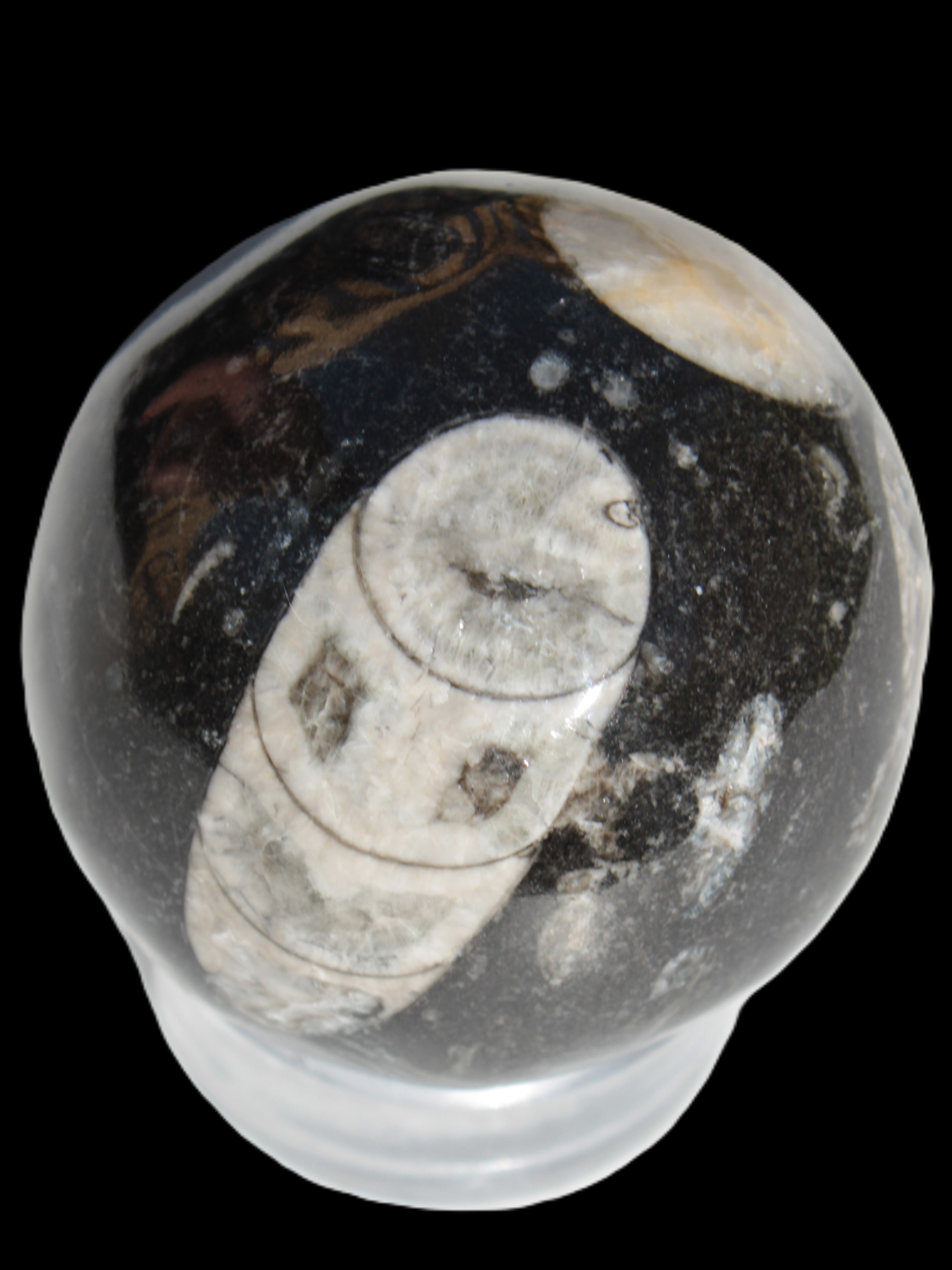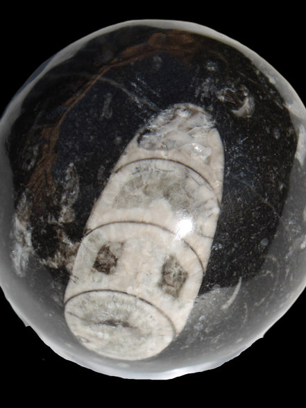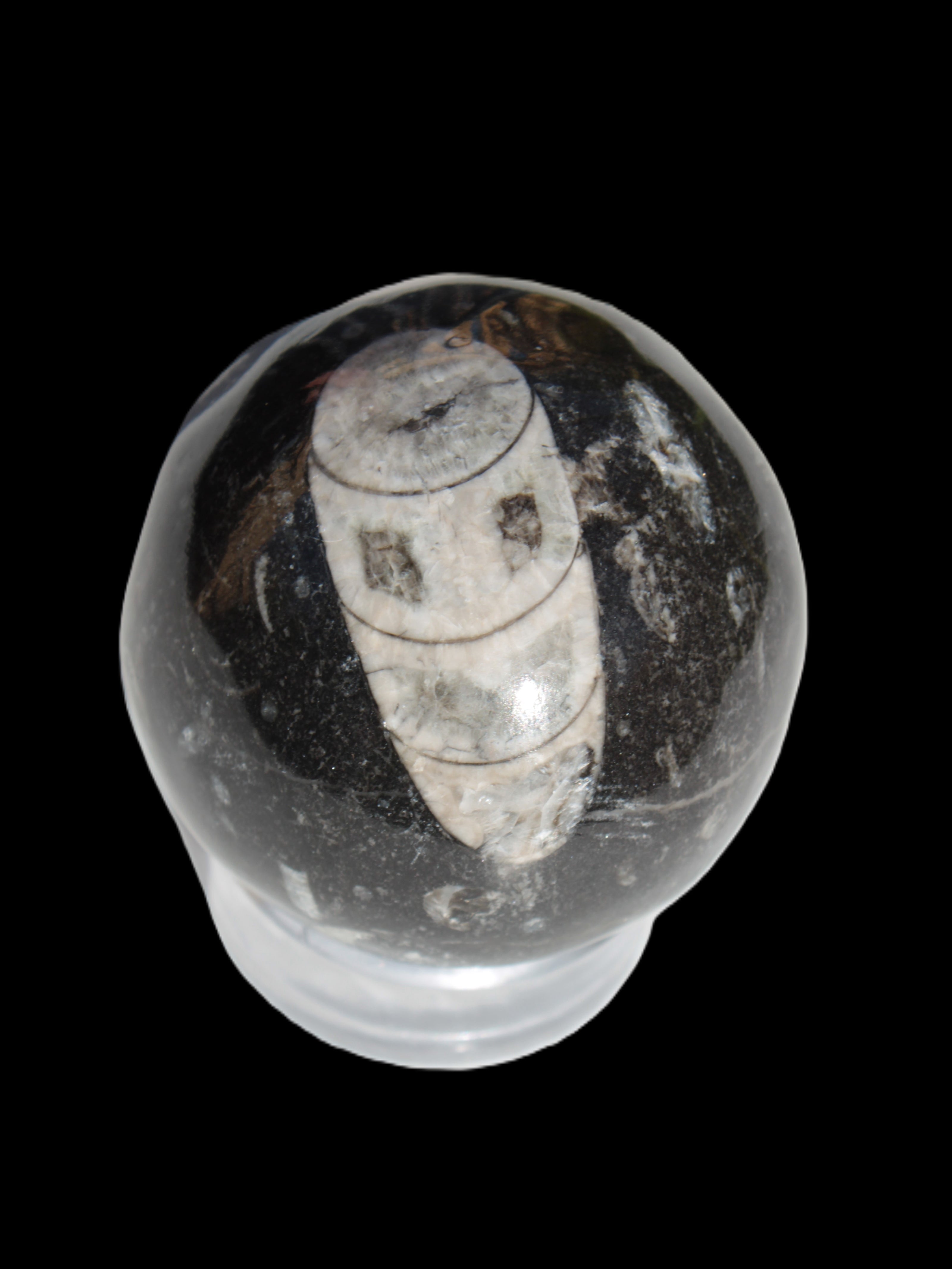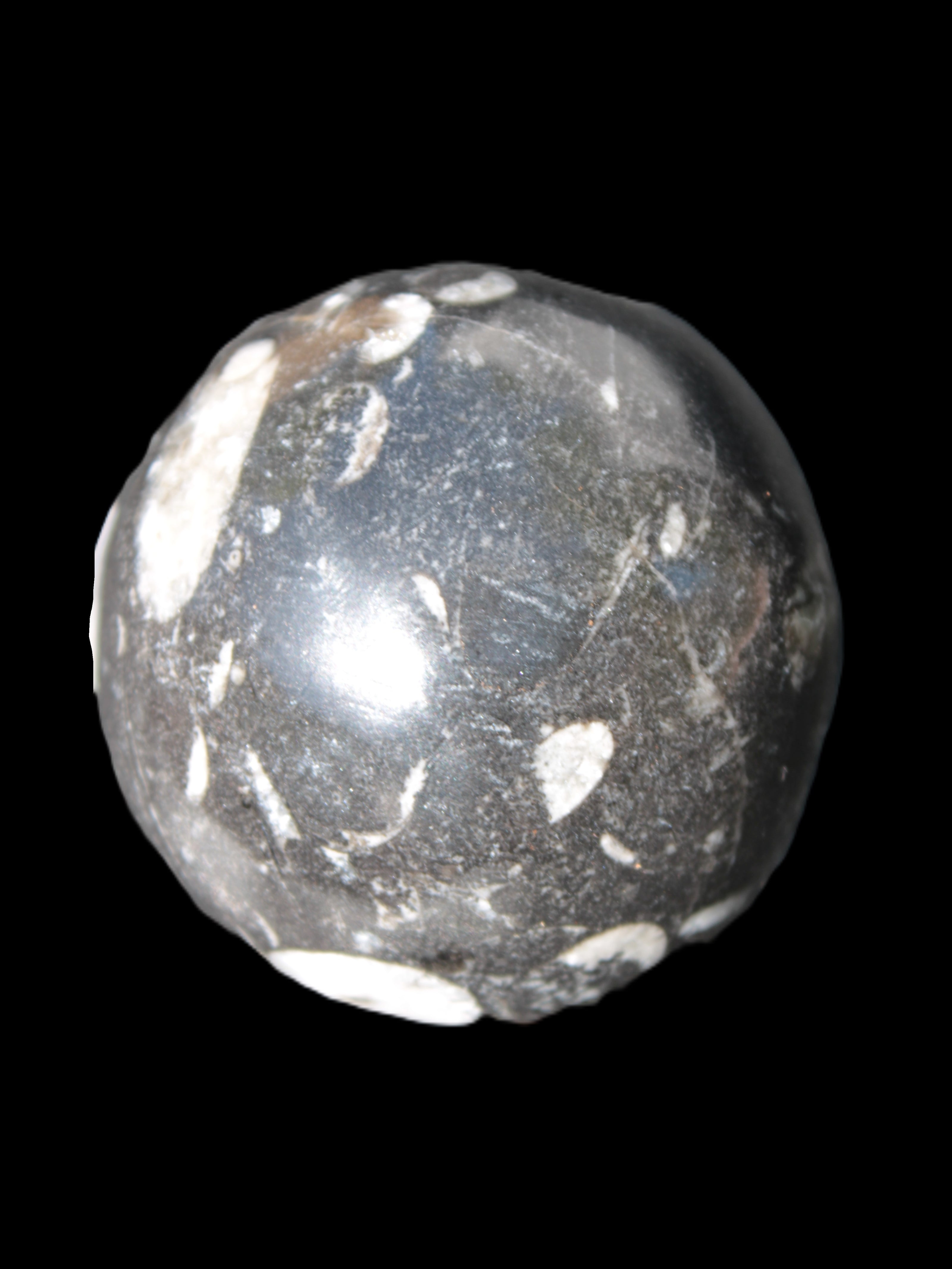 Orthoceras were Cephalopods, ancestors to modern-day squid and octopus. They are a long straight form of Ammonite fossil, mainly found and mined in Morocco. The fossil remains preserved in this stone originated there and were shaped into this sphere. Orthoceras fossils are among the earliest recognizable animals.