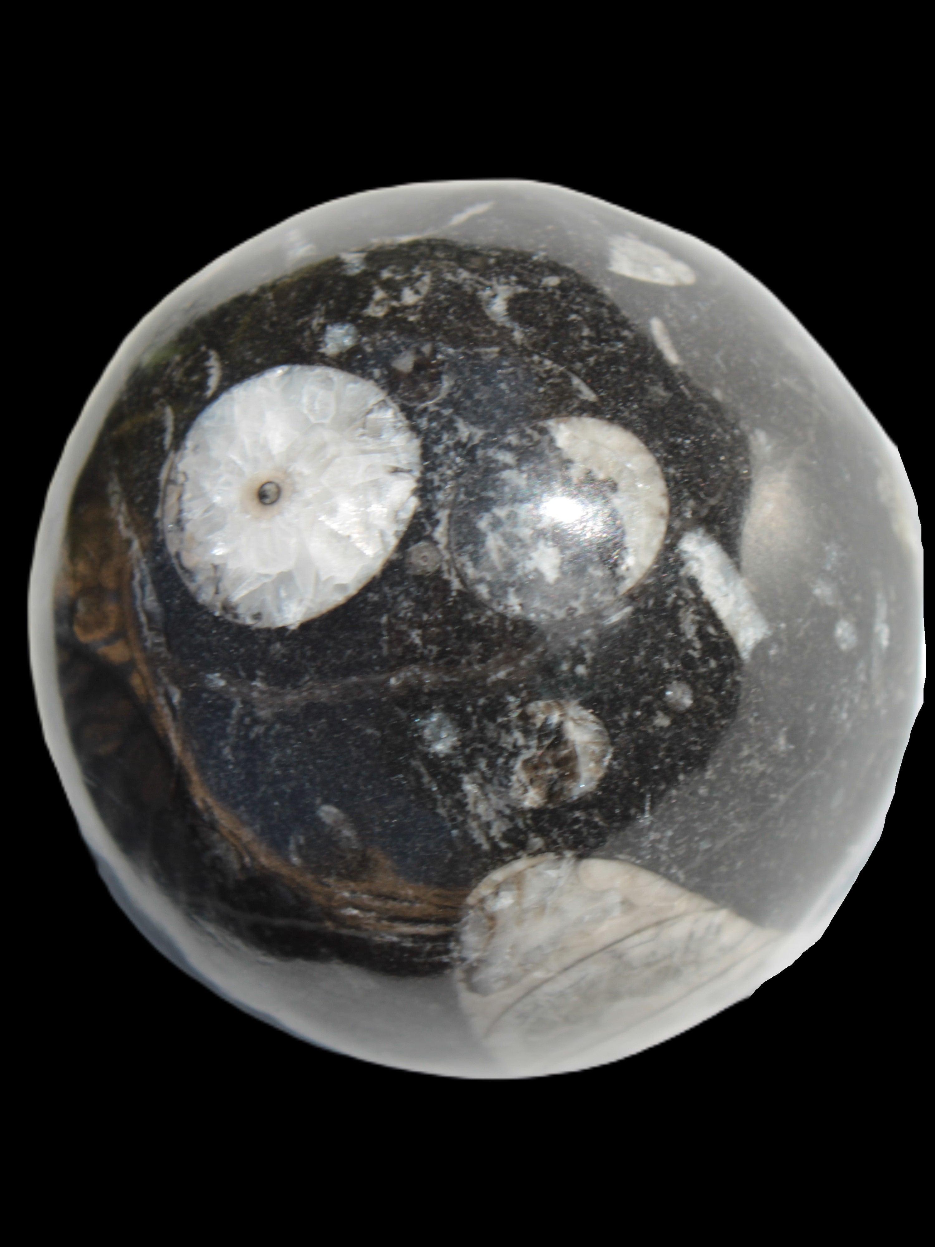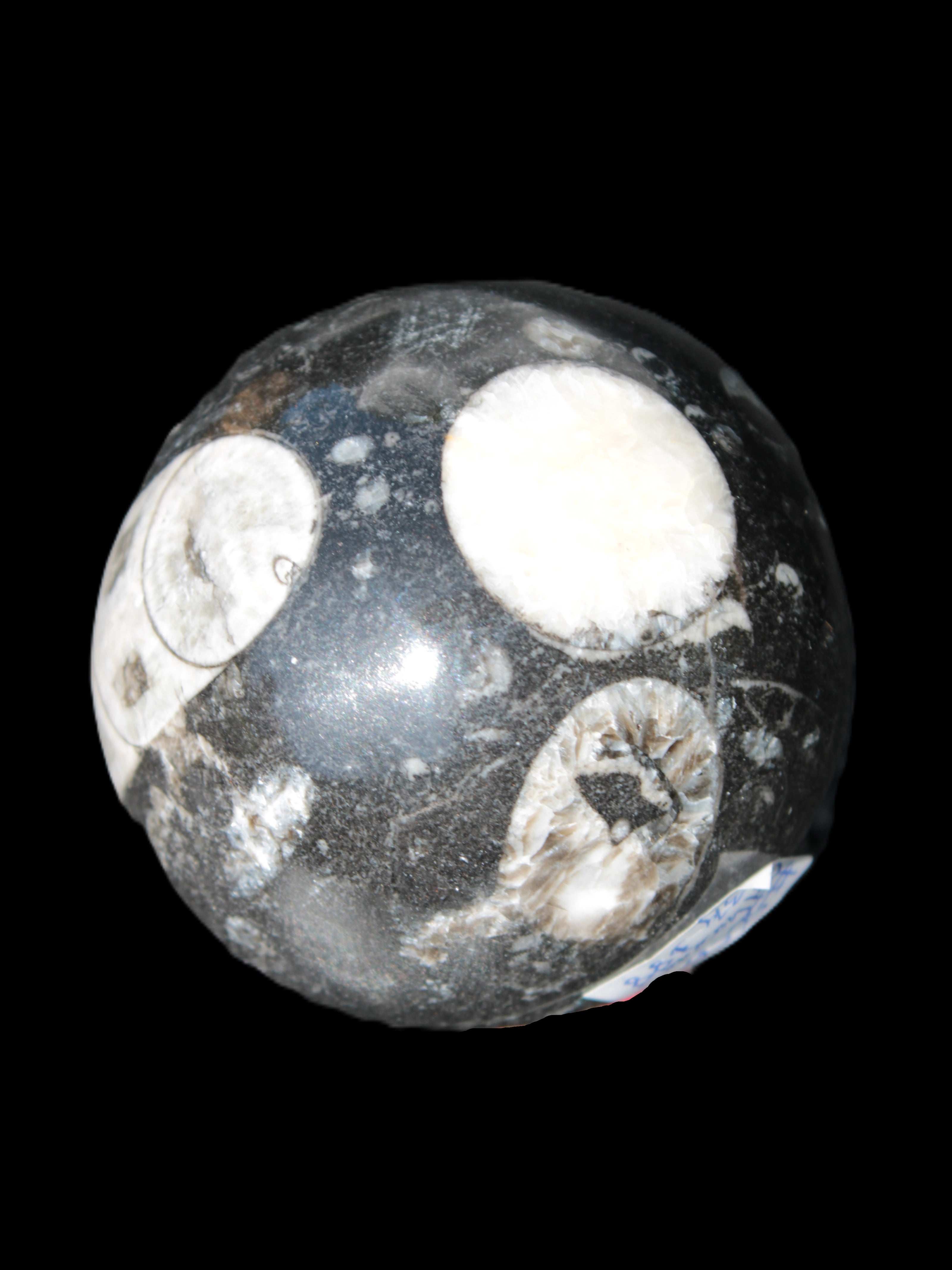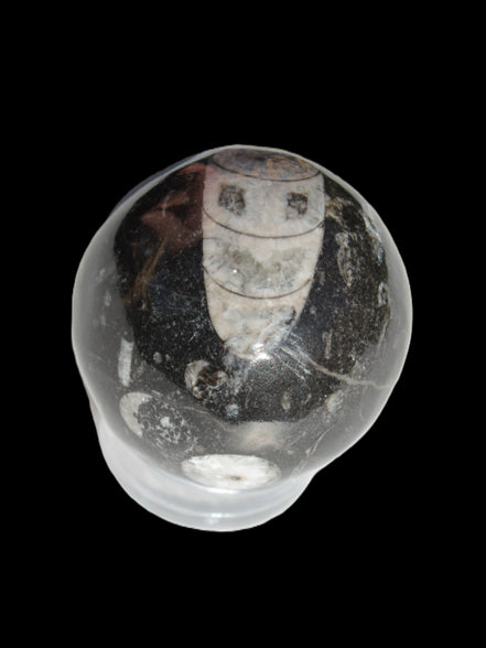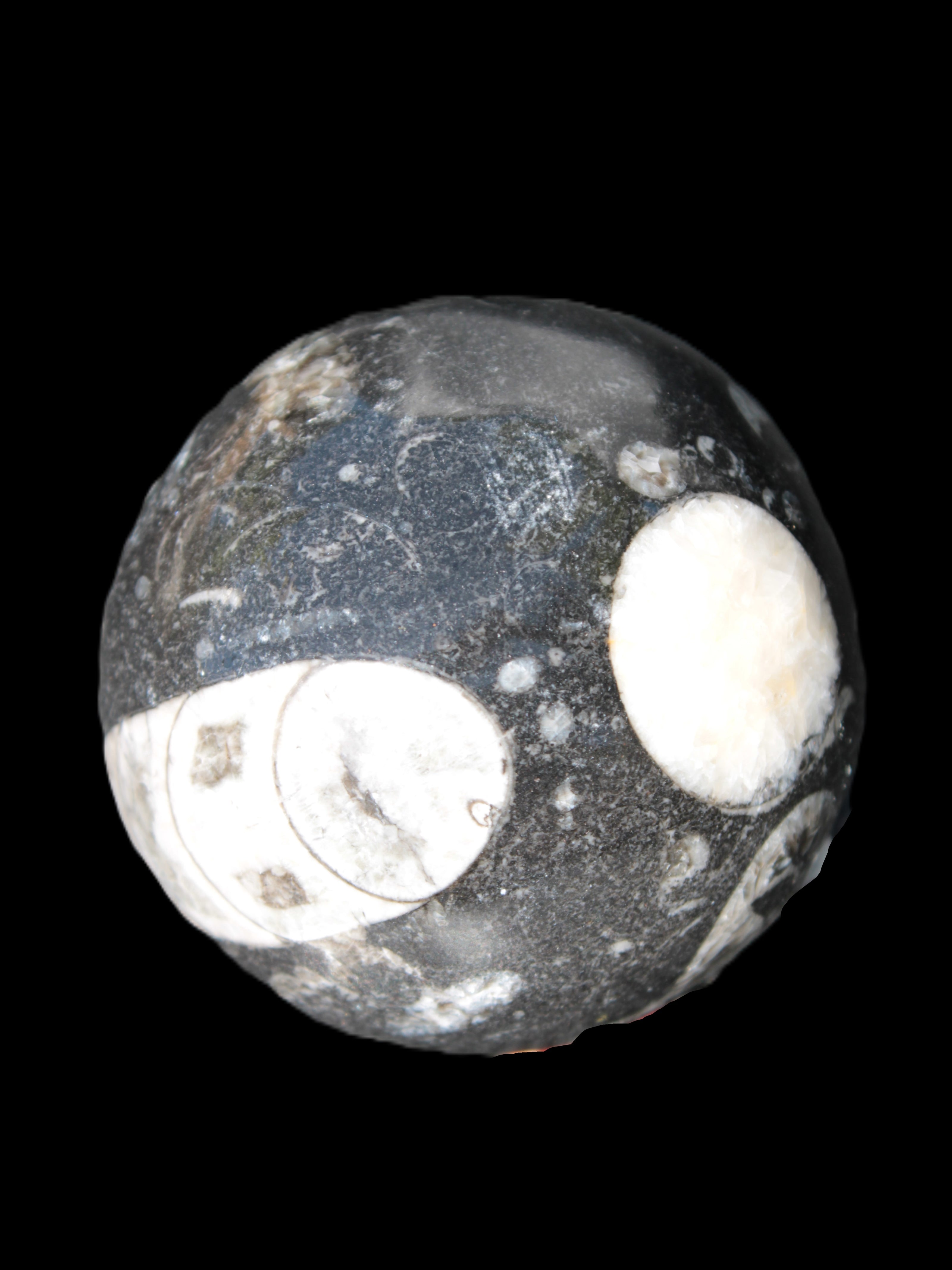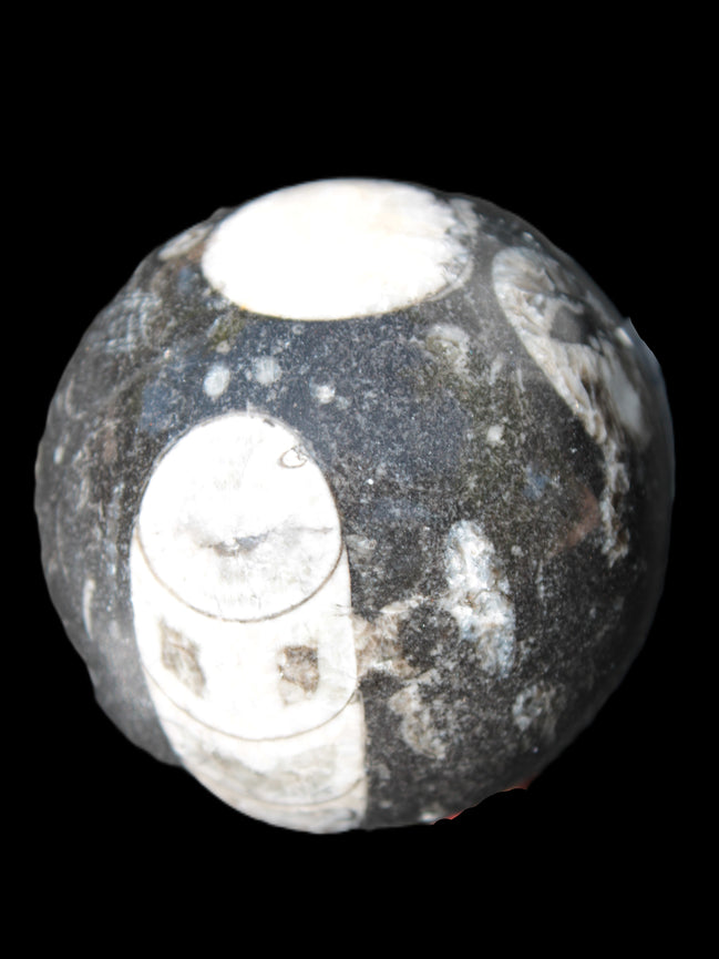 Orthoceras were Cephalopods, ancestors to modern-day squid and octopus. They are a long straight form of Ammonite fossil, mainly found and mined in Morocco. The fossil remains preserved in this stone originated there and were shaped into this sphere. Orthoceras fossils are among the earliest recognizable animals.
