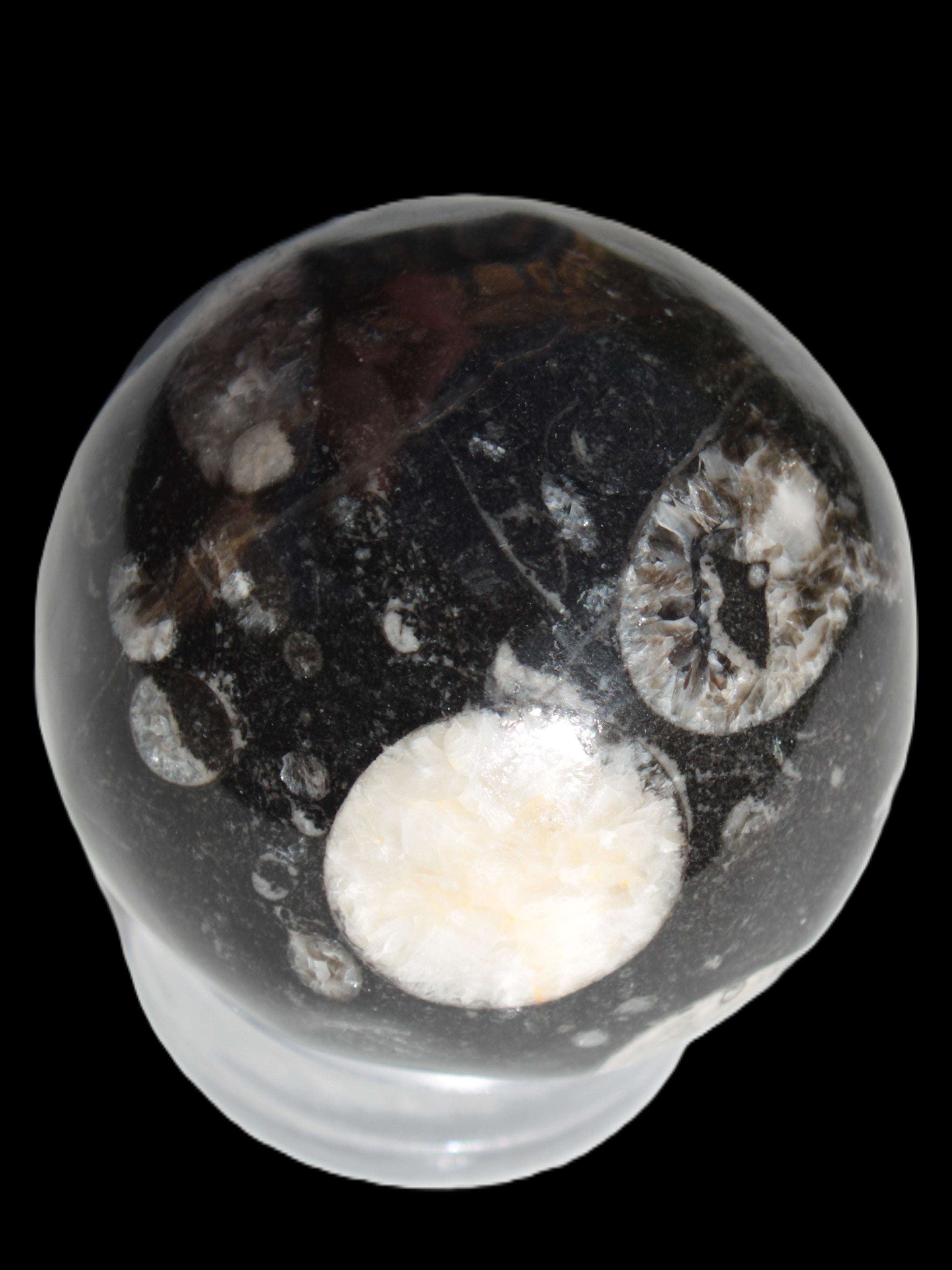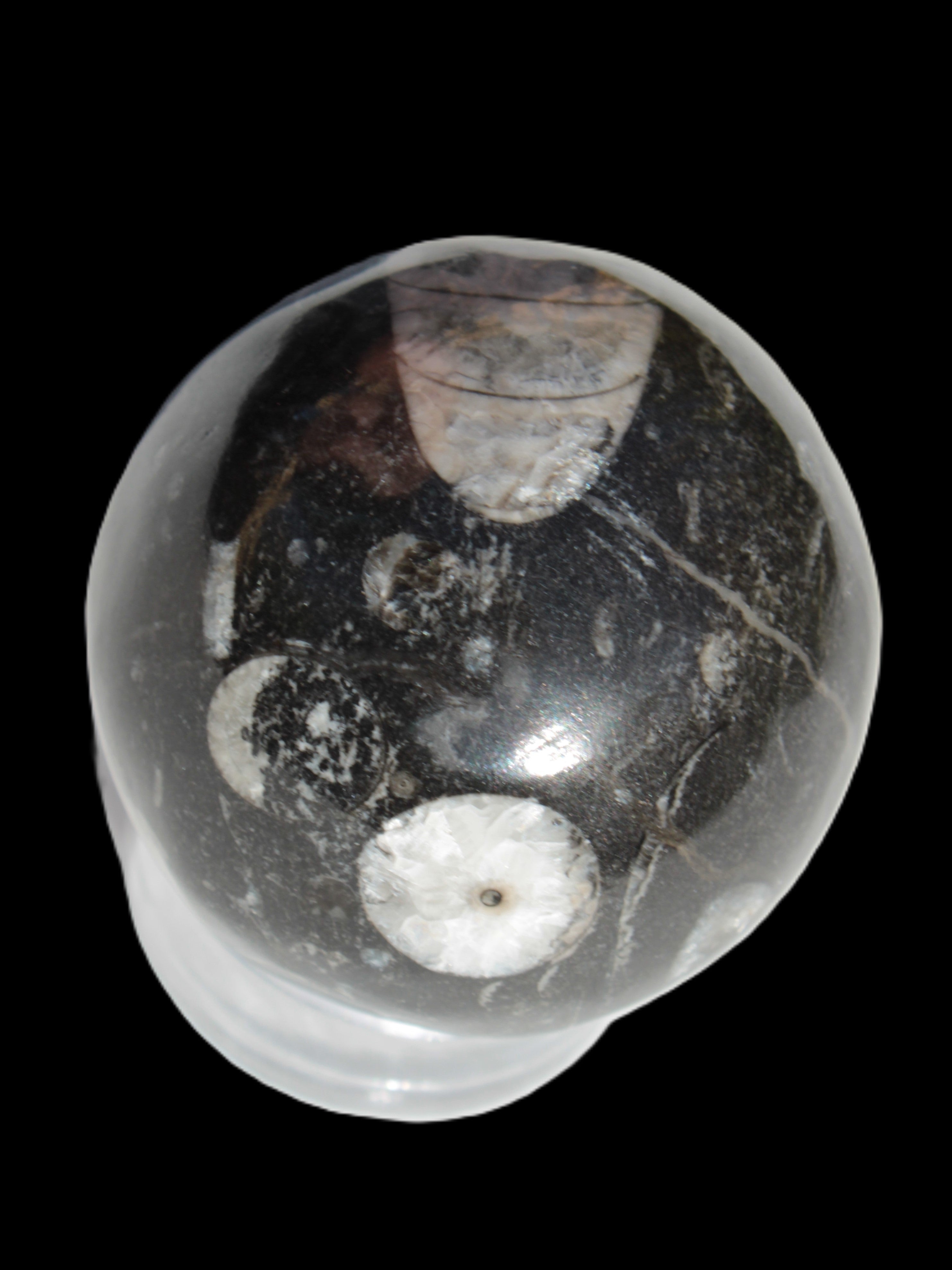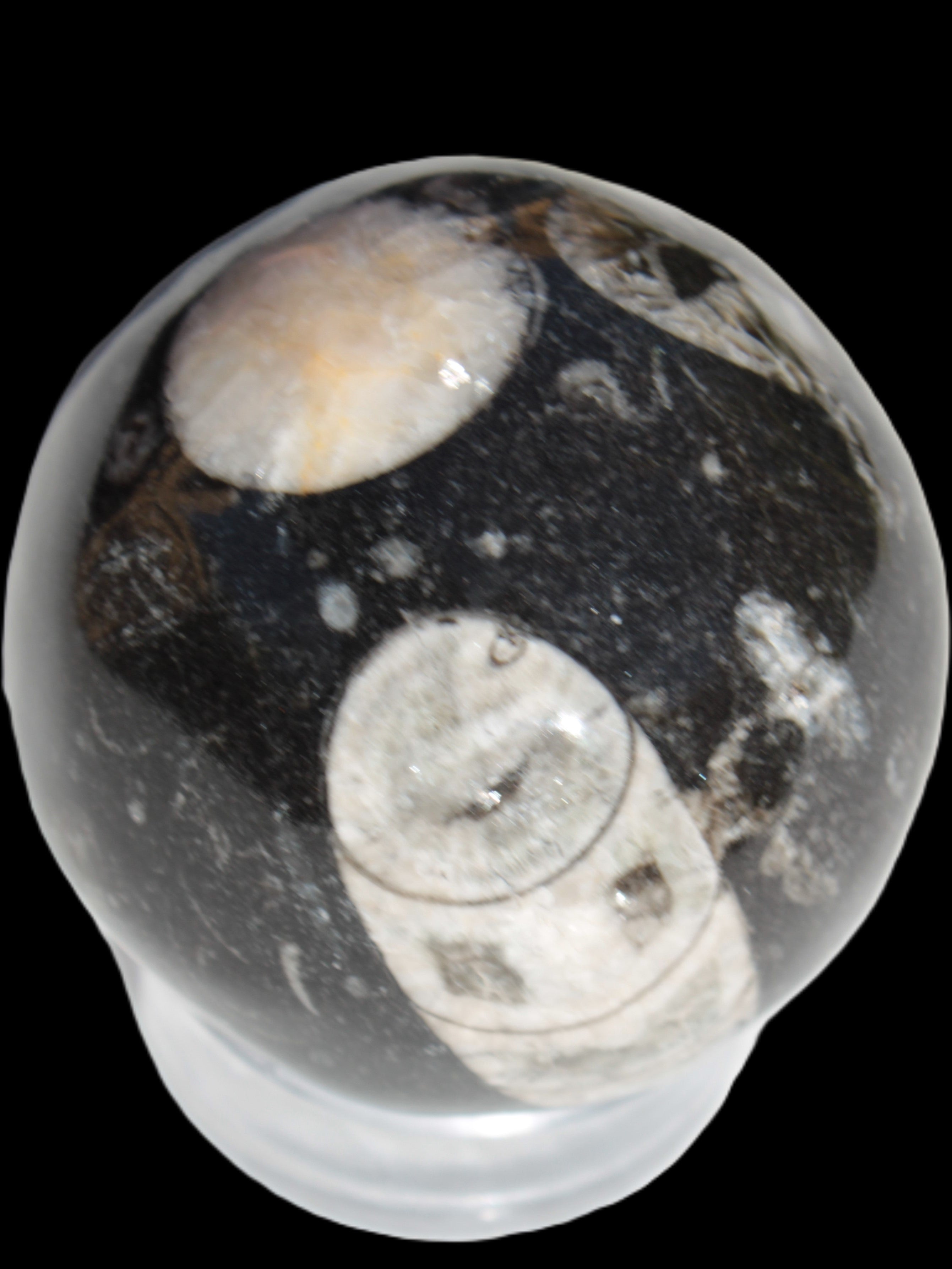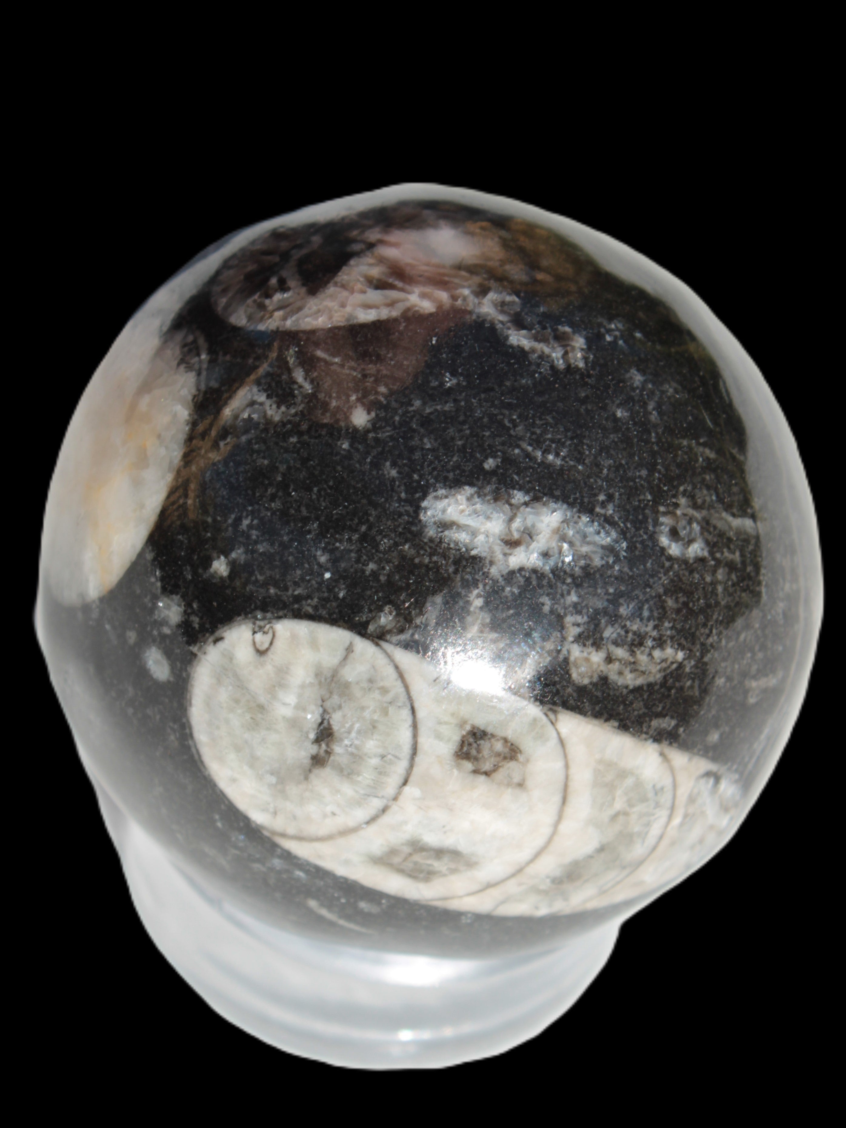 Orthoceras were Cephalopods, ancestors to modern-day squid and octopus. They are a long straight form of Ammonite fossil, mainly found and mined in Morocco. The fossil remains preserved in this stone originated there and were shaped into this sphere. Orthoceras fossils are among the earliest recognizable animals.