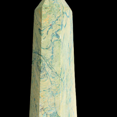 This Phoenix Stone obelisk weighs 1008g. Phoenix Stone is a rare stone first identified in Ajo, Arizona, USA. It is a hydrated potassium sodium copper aluminium hydroxide silicate mineral, formed from the oxidisation of secondary copper minerals. It forms as prismatic crystal tufts and is often found as inclusions in Quartz. It can be found together with other and rarer copper-based minerals. There may also be traces of Manganese, Calcium, and Iron Pyrite included. Phoenix Stone is a powerful stone of transformation and healing in all areas.