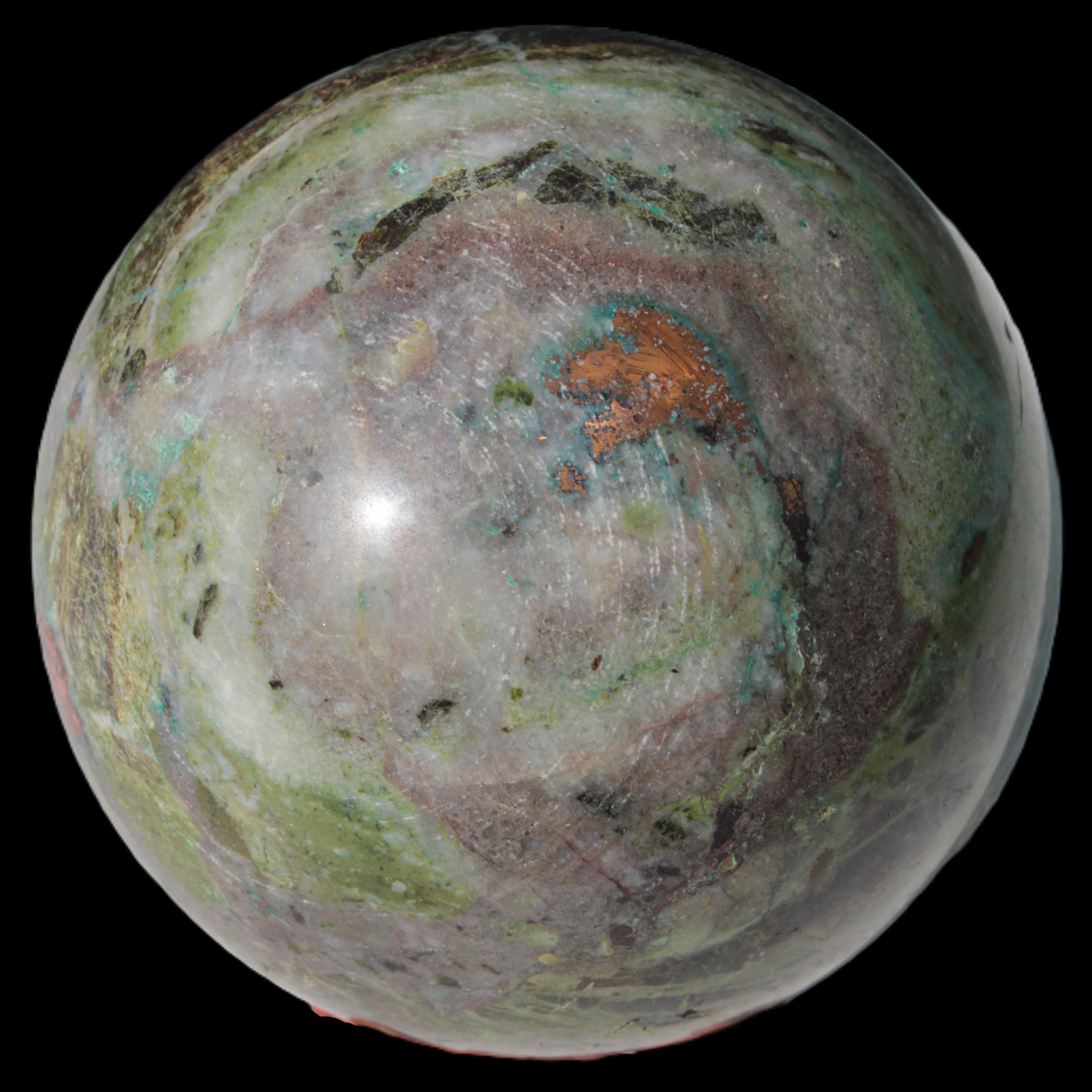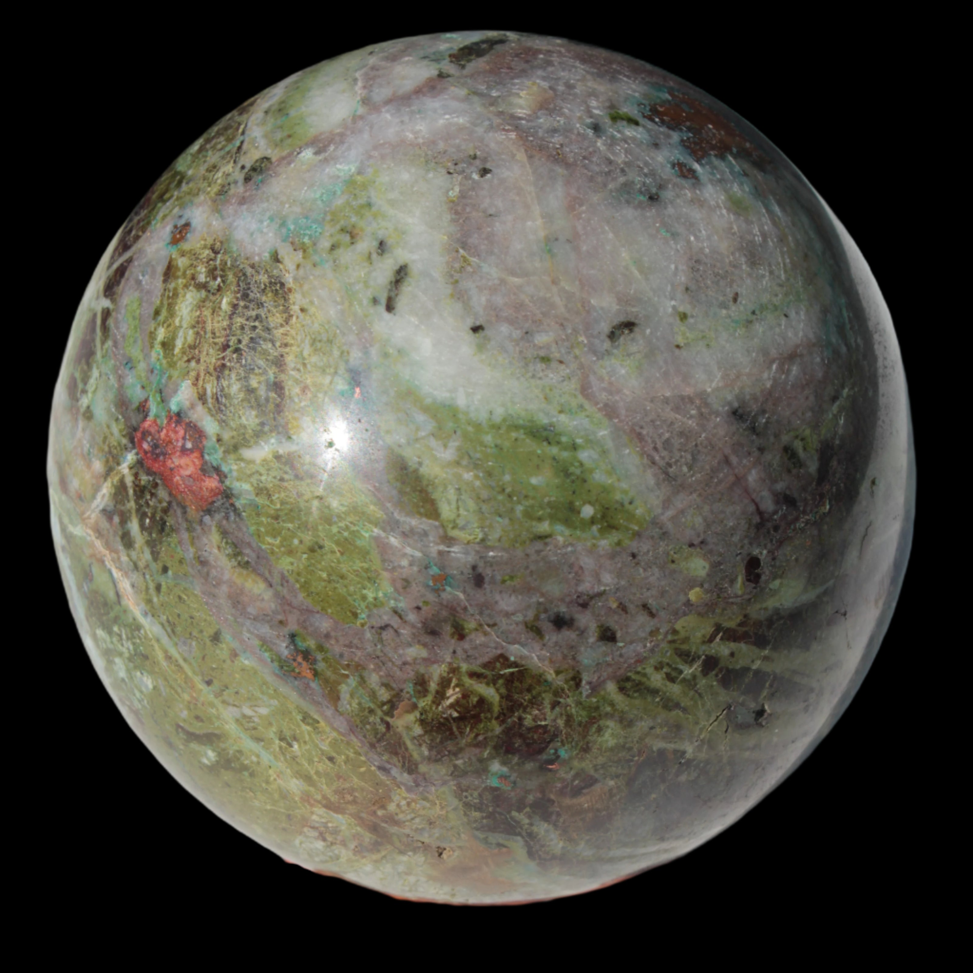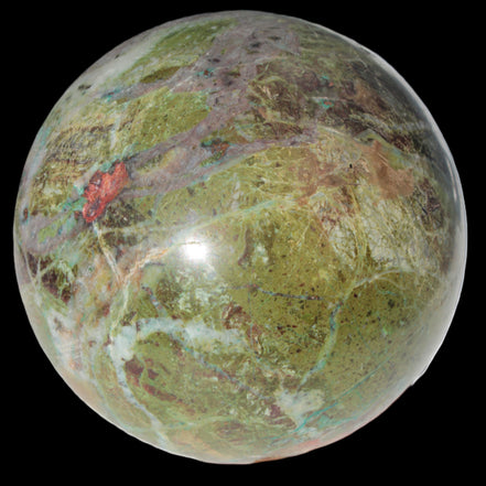 This Phoenix stone sphere 2430g is a large example of this rare and unusual stone. Phoenix Stone was first identified in Ajo, Arizona, USA. It is a hydrated potassium sodium copper aluminium hydroxide silicate mineral. It is formed from the oxidization of secondary copper minerals. It forms as prismatic crystal tufts and is often found as inclusions in Quartz. It can be found together with other and rarer copper-based minerals. There may also be traces of Manganese, Calcium, and Iron Pyrite included. Phoenix Stone is a powerful stone of transformation and healing in all areas.