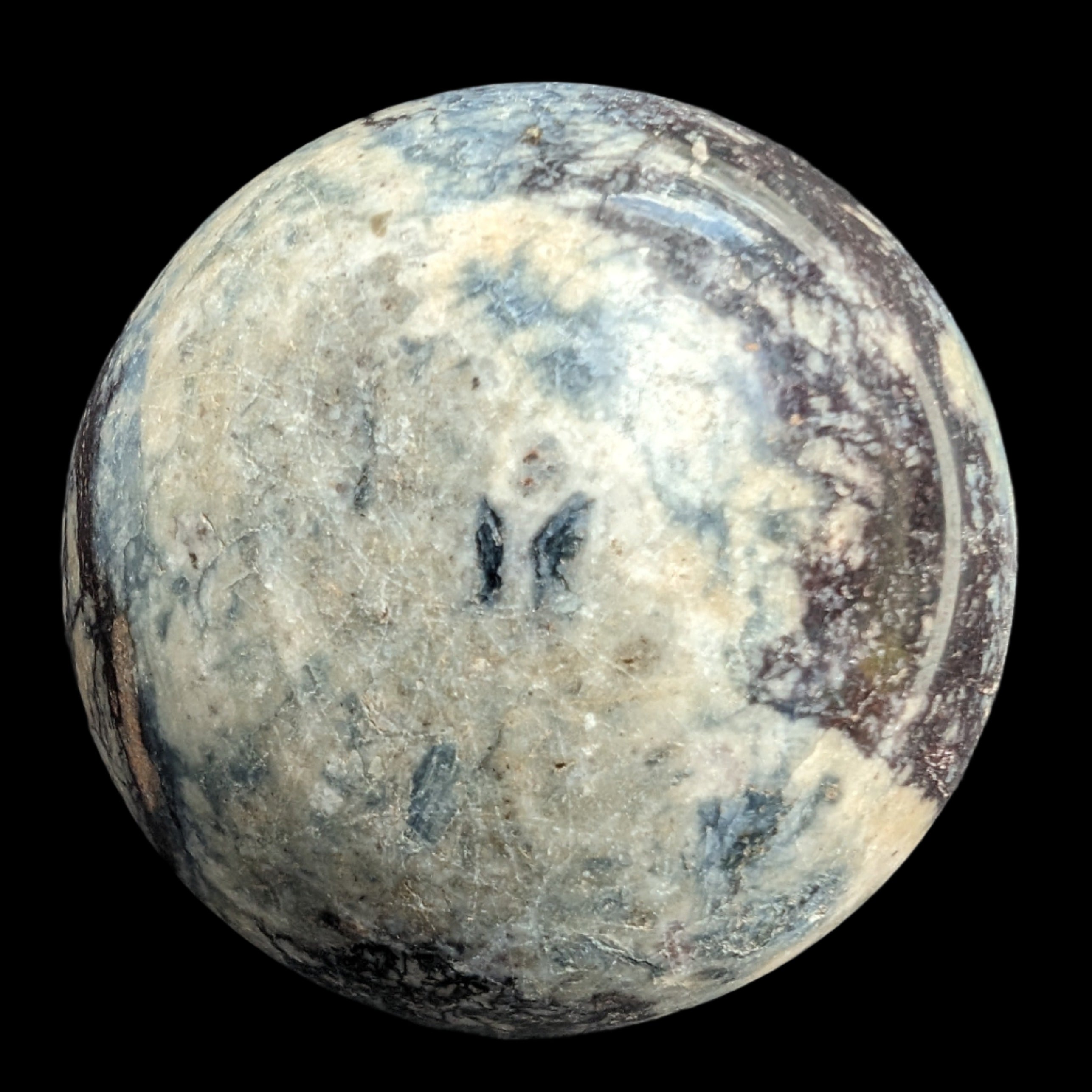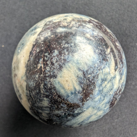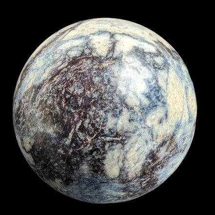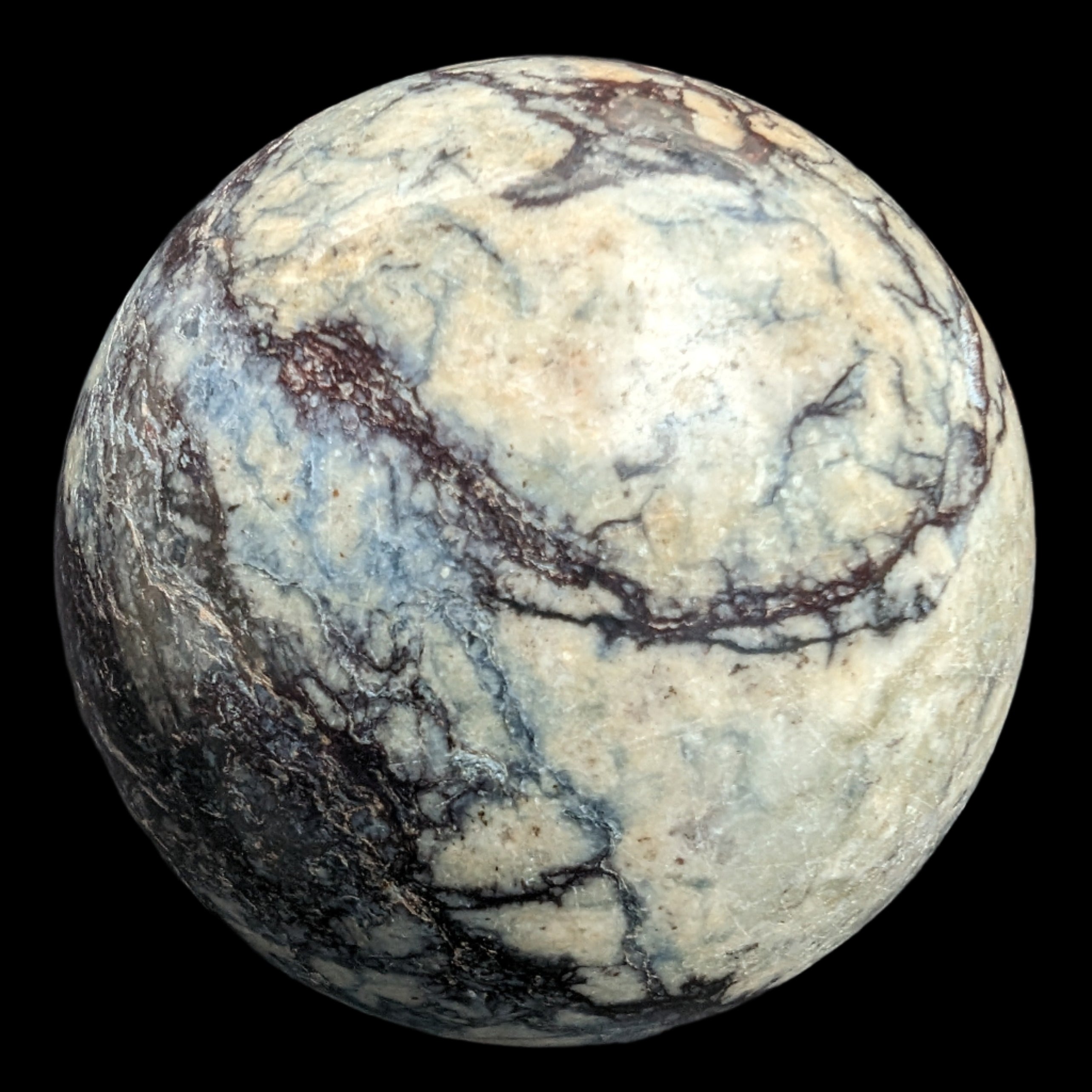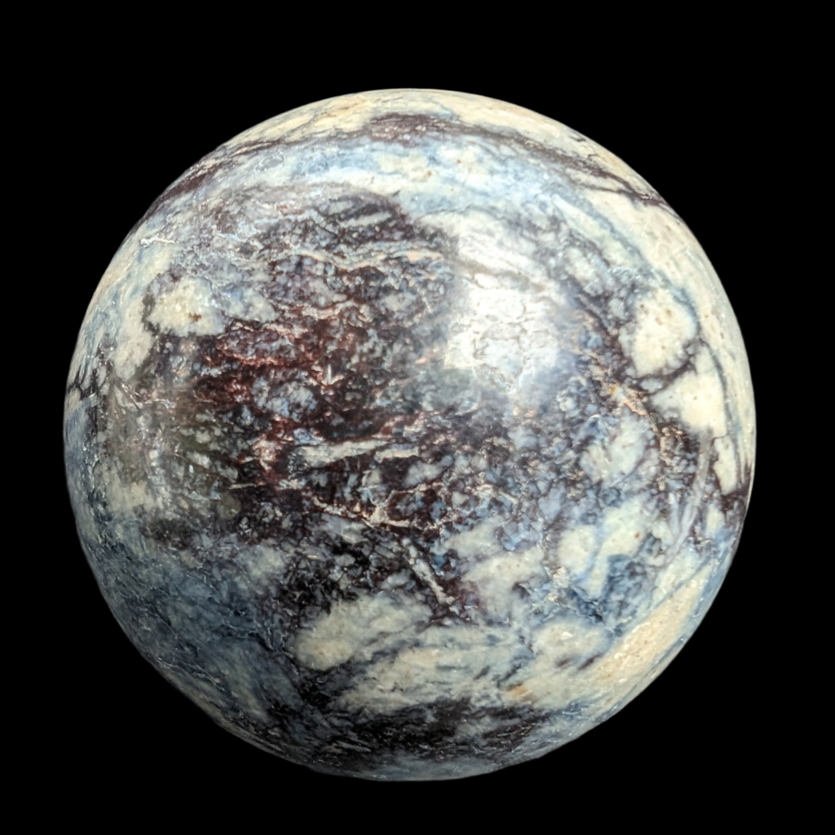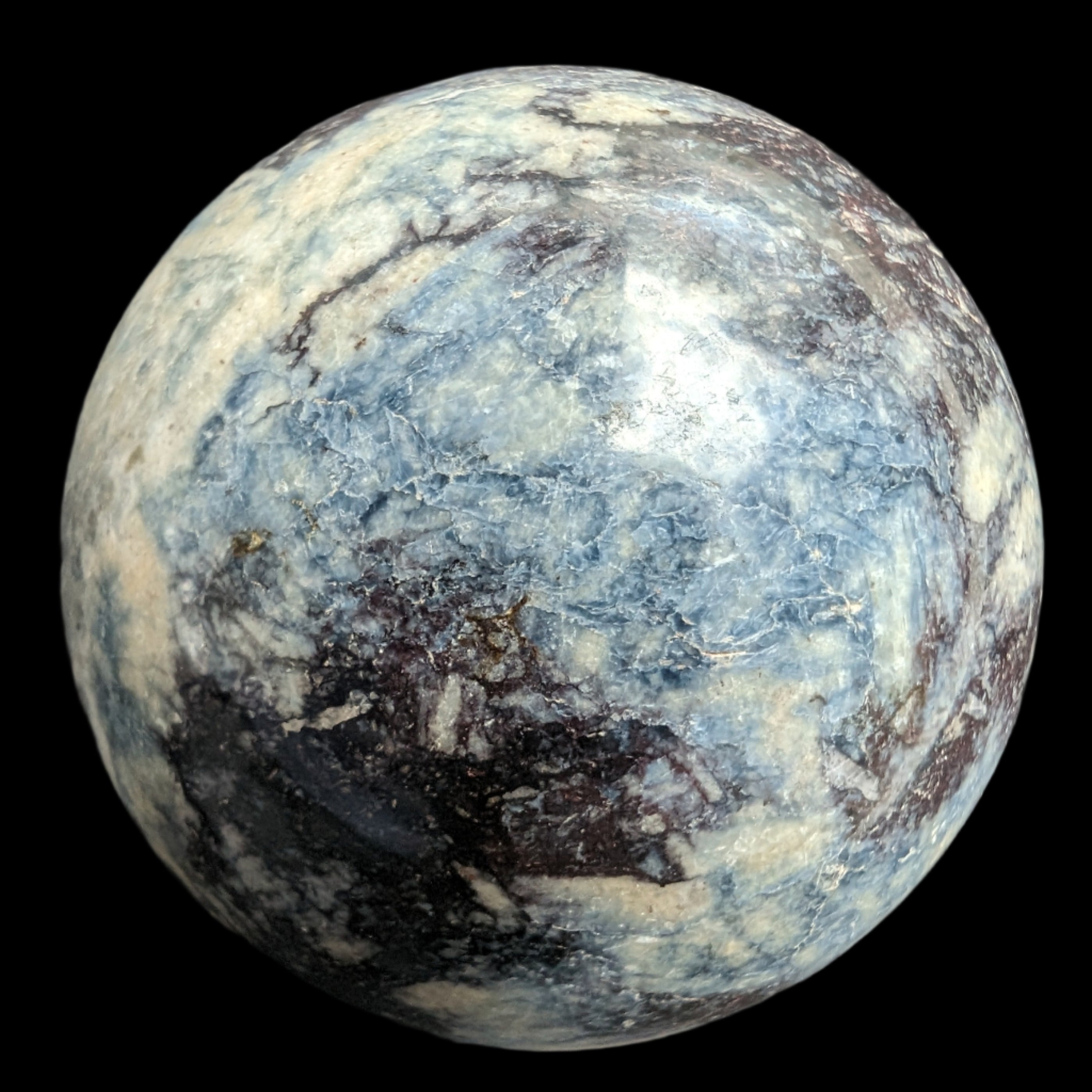 This Pietersite sphere weighs 209g. Pietersite is an extremely rare form of Chalcedony only found in Namibia. It has formed through the replacement of Asbestos in the crevices of beds of Jasper. It features embedded and altered amphibole-mineral fibres. These altered fibres can have blue-gray, brown and yellow colours. The fibres cause a chatoyancy similar to that of Tiger's Eye (which is not a chalcedony).