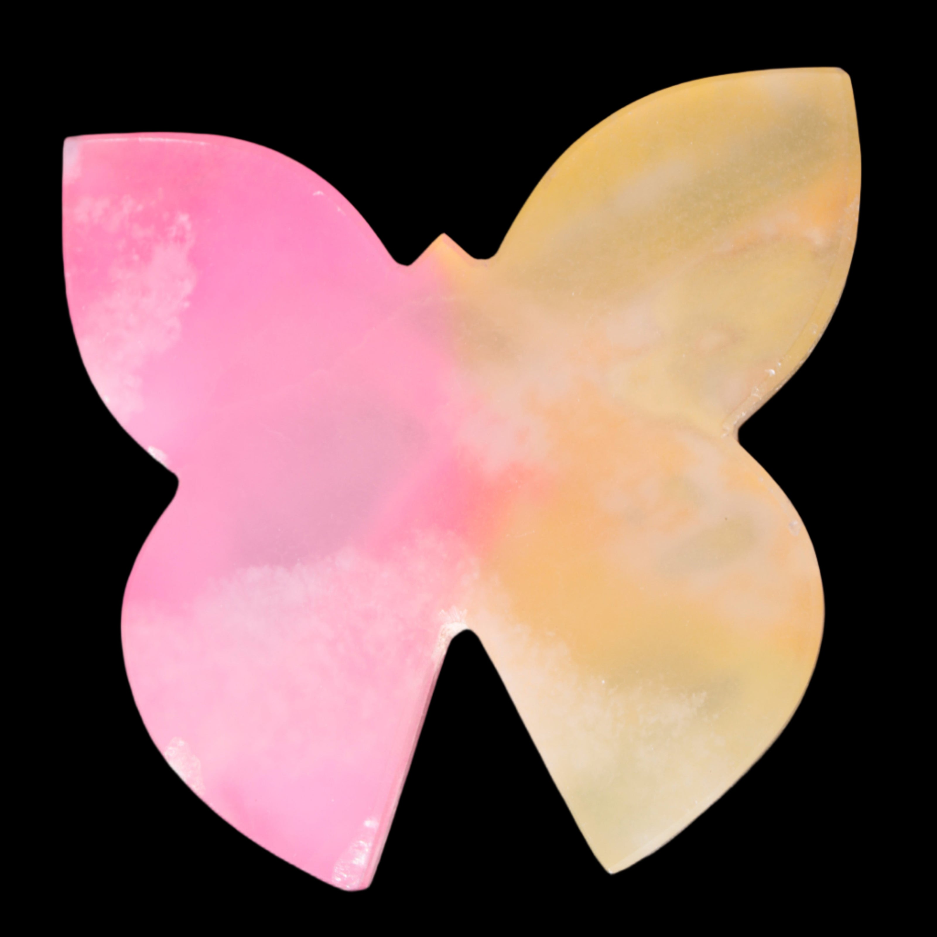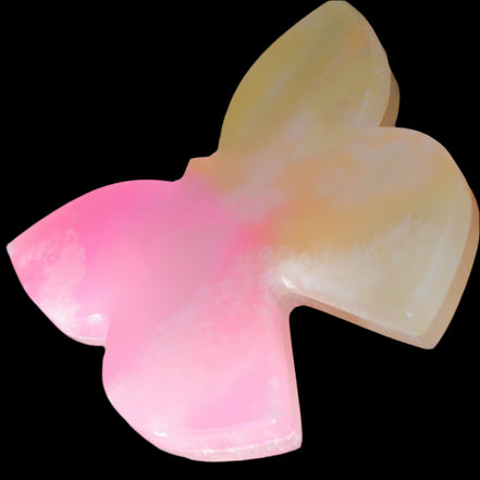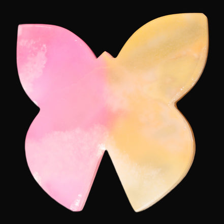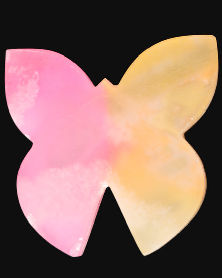 Pink and yellow Butterfly hand-carved in dyed Calcite from Pakistan 106*15*106mm 276g in sunshine - Rocks and Things Store