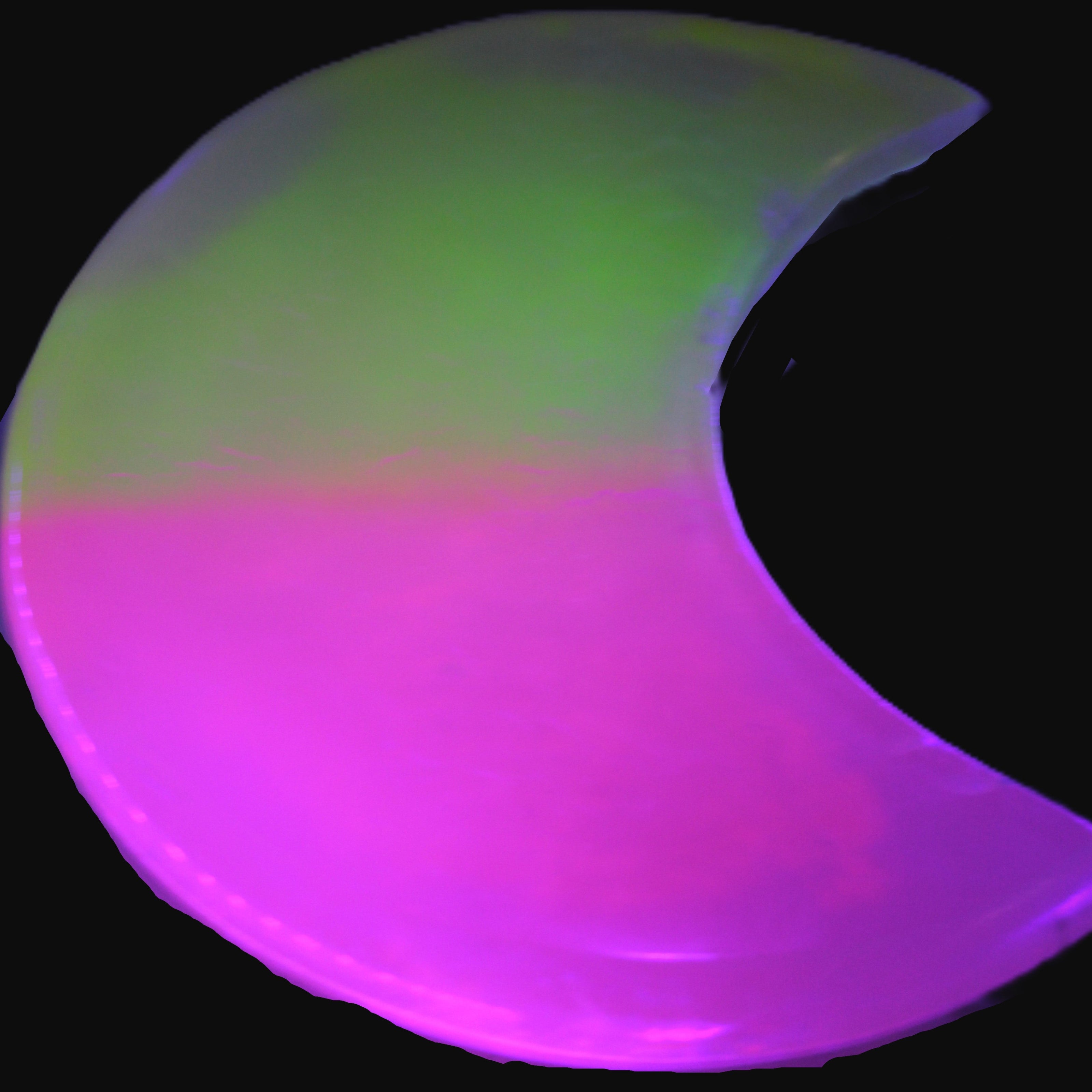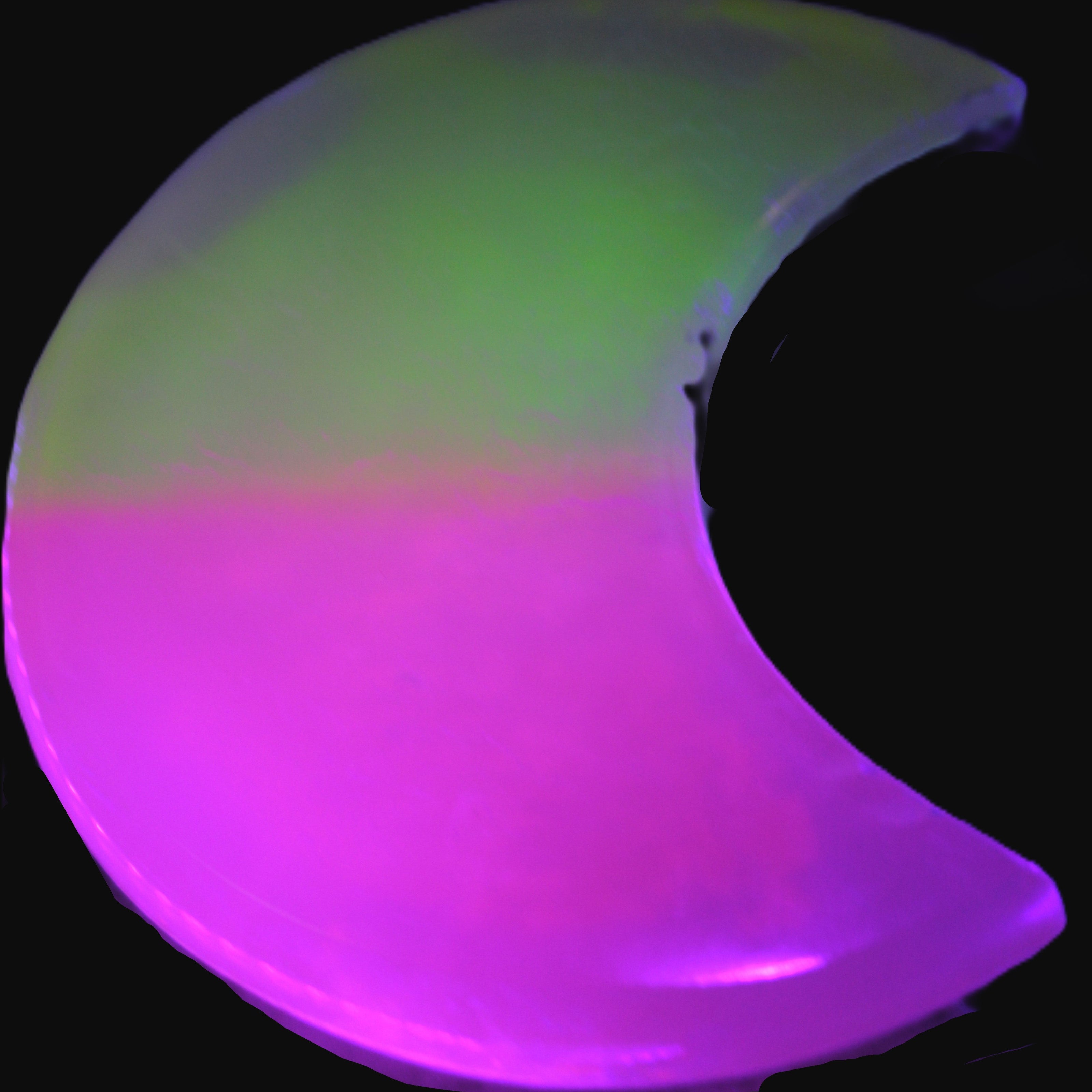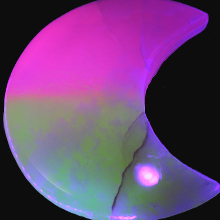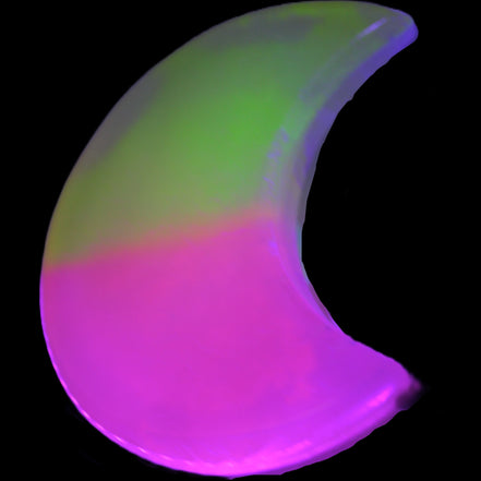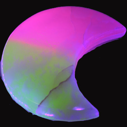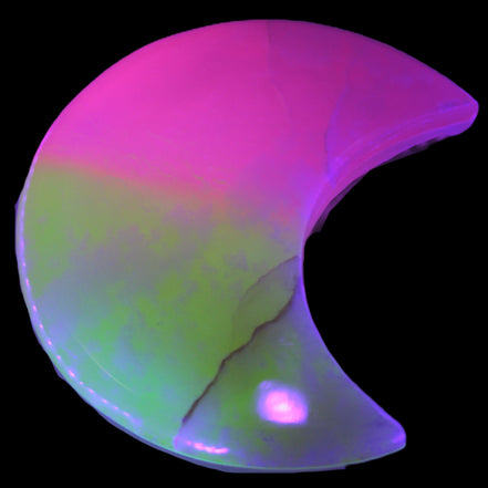 This Calcite Pink and Yellow dyed crescent moon 90*100*14mm weighs 201g. Lawrence Handicrafts fashioned locally found stone in Pakistan into this Calcite Pink and Yellow dyed crescent moon. It is formed by two pieces of natural Calcite, dyed and glued together. The Calcite and the glue are both UV reactive. UV light gives an extra UV glow to the pink and yellow.