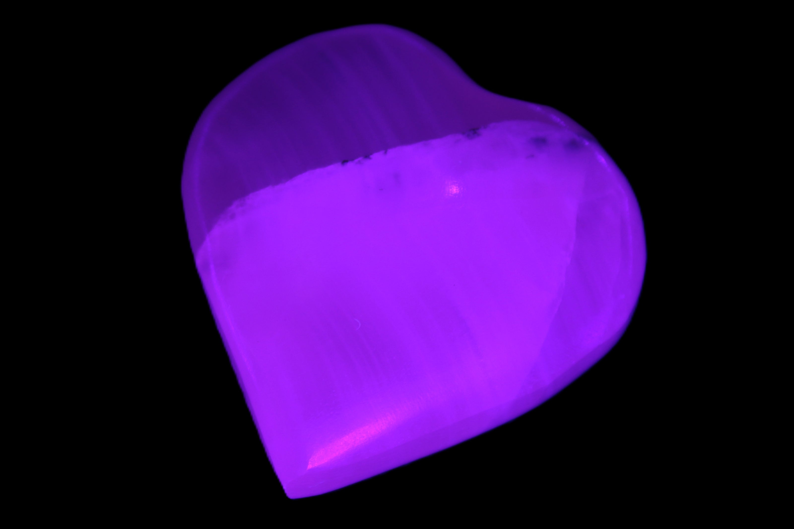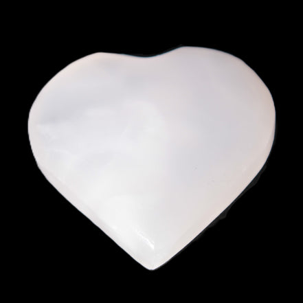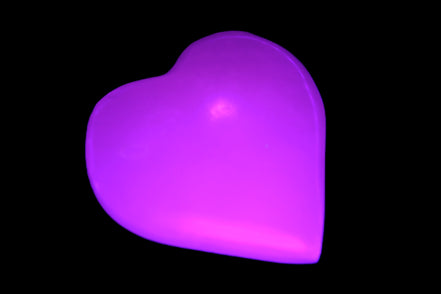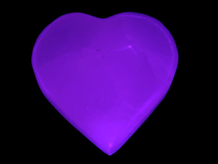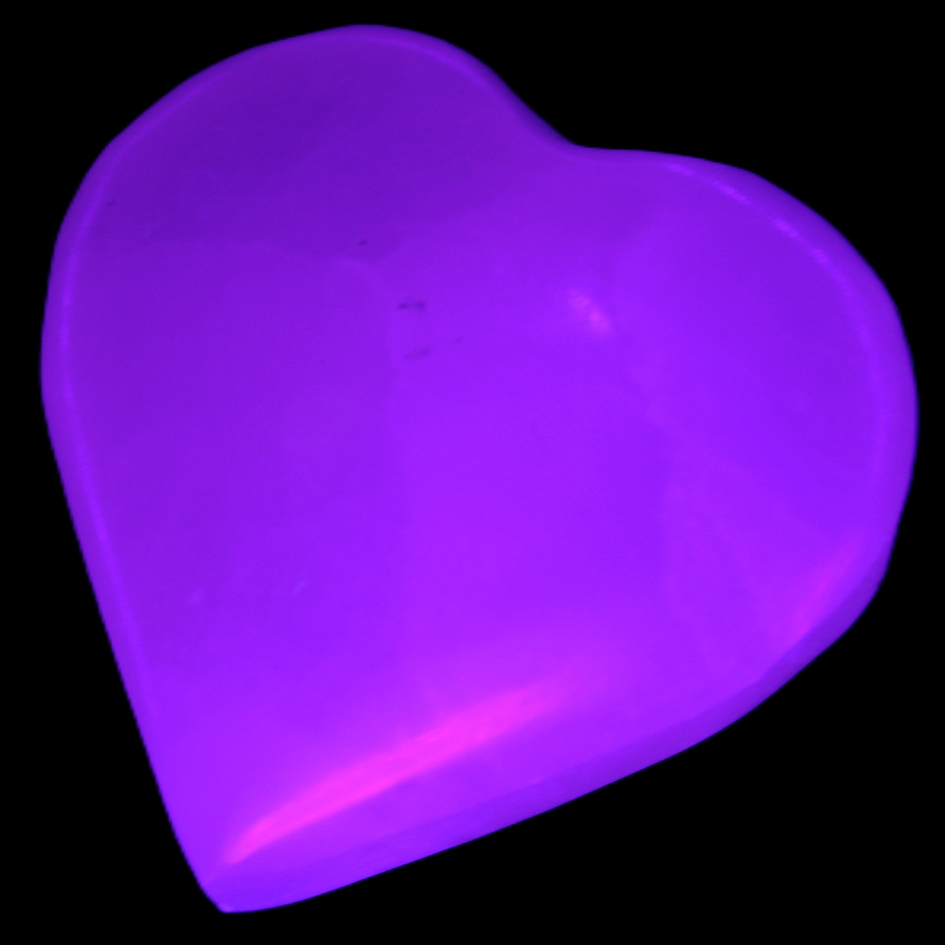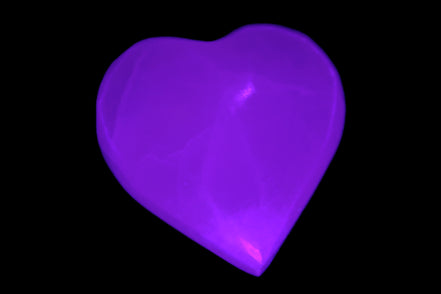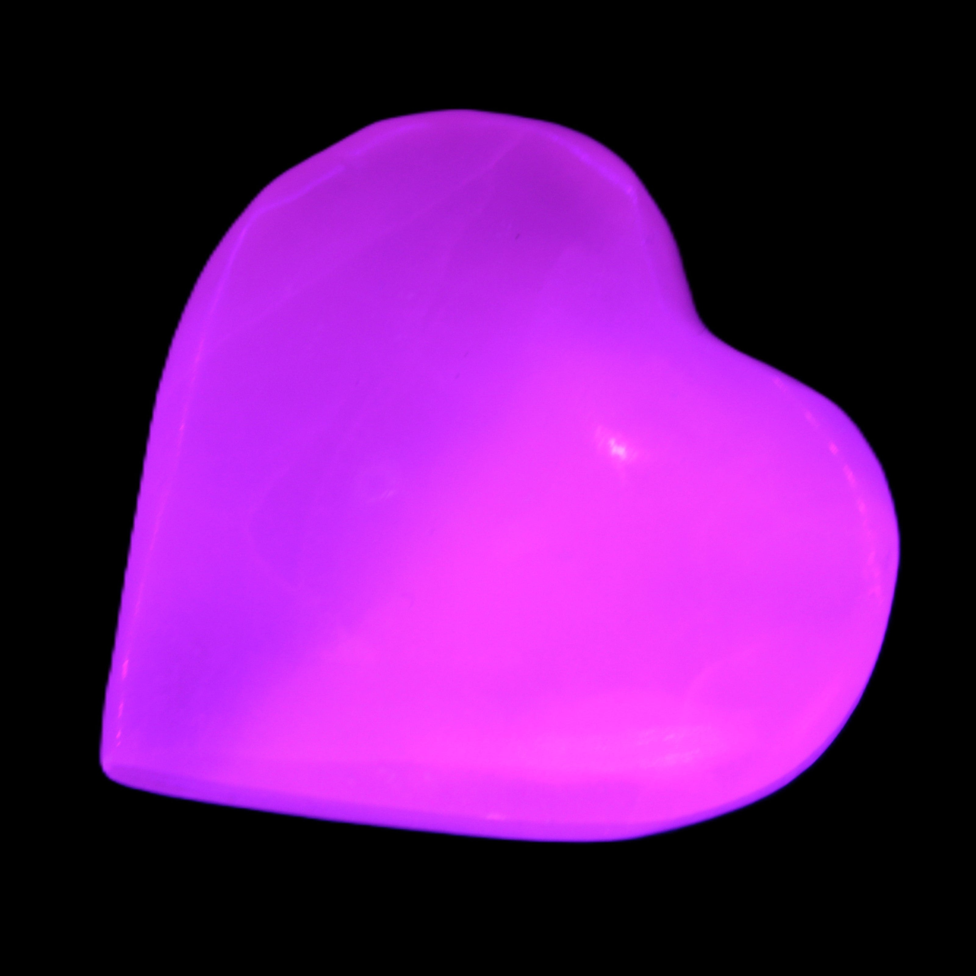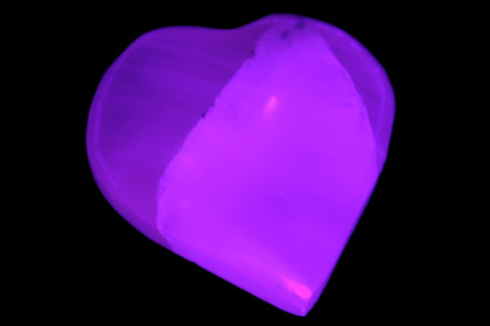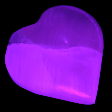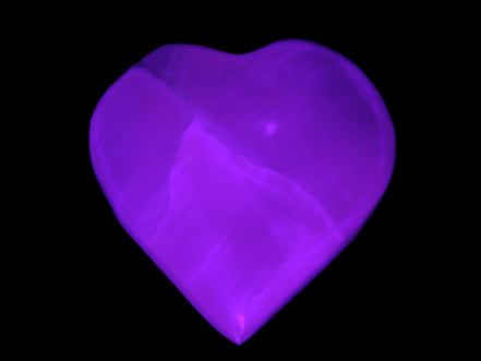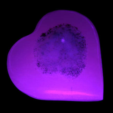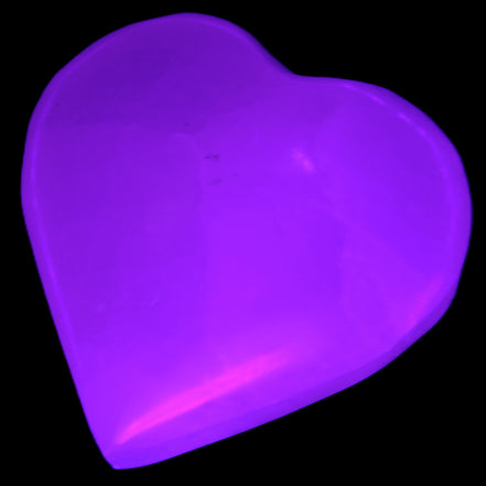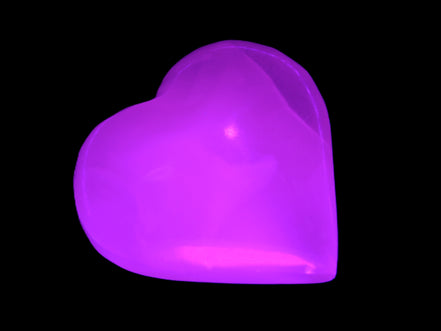 This Pink Mangano Calcite heart 41-44mm selection weighs 44-49g. They were shaped by Lawrence Handicrafts in Karachi, Pakistan. Each is a hot pink heart under ultra-violet light. They were crafted exclusively for Rocks and Things from local stone found only in Pakistan. Mangano Calcite is a calcium carbonate mineral with a minimum of 30 per cent manganese carbonate present. Mangano Calcite glows hot pink under UV light due to the presence of manganese. The calcium and manganese carbonates can be banded. Mangano helps reveal your true self. Mangano Calcite can help bring inner peace, through a process of self-discovery. Each heart is between 41-44mm wide.