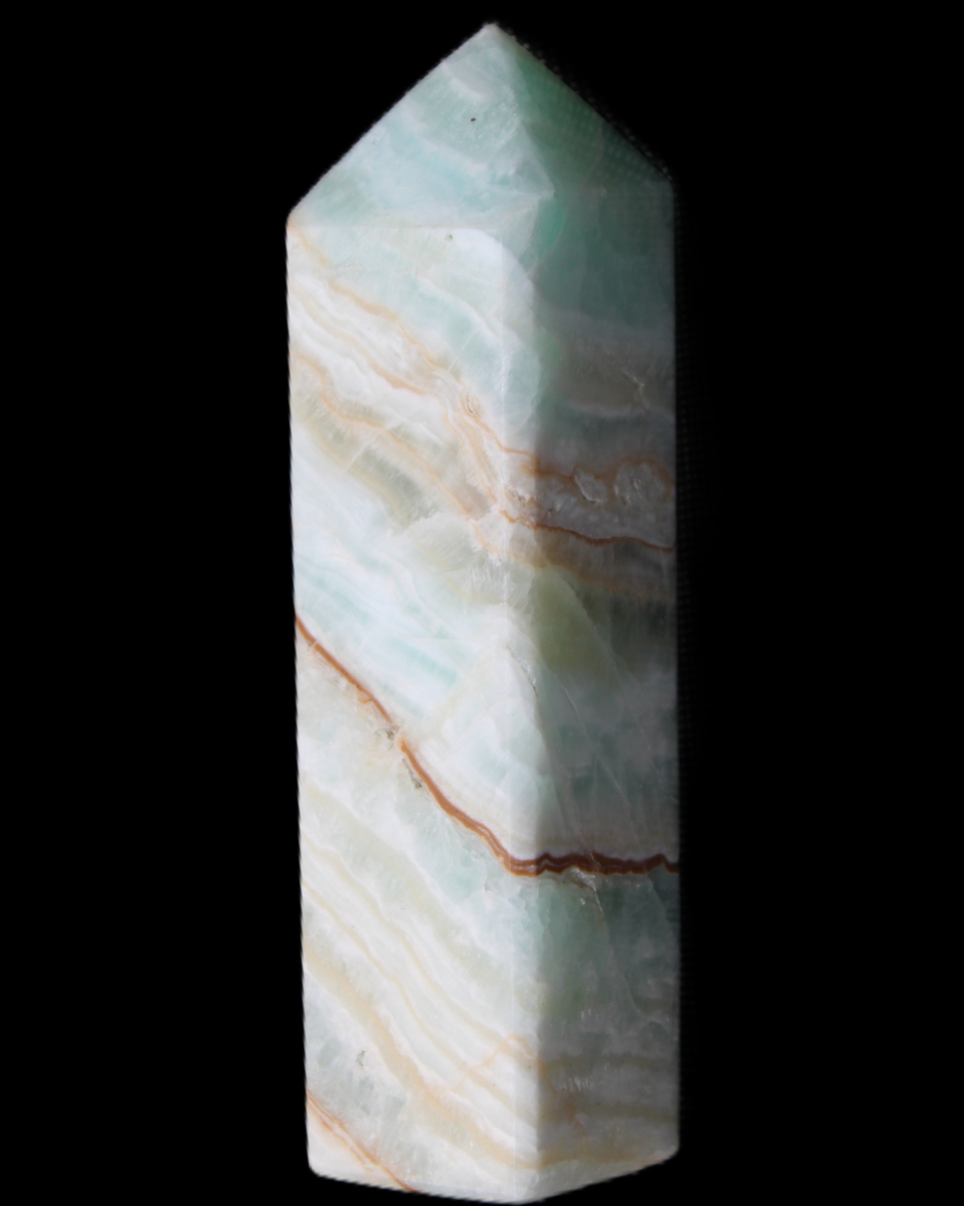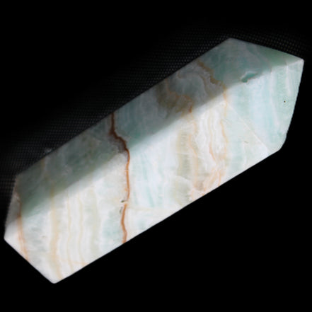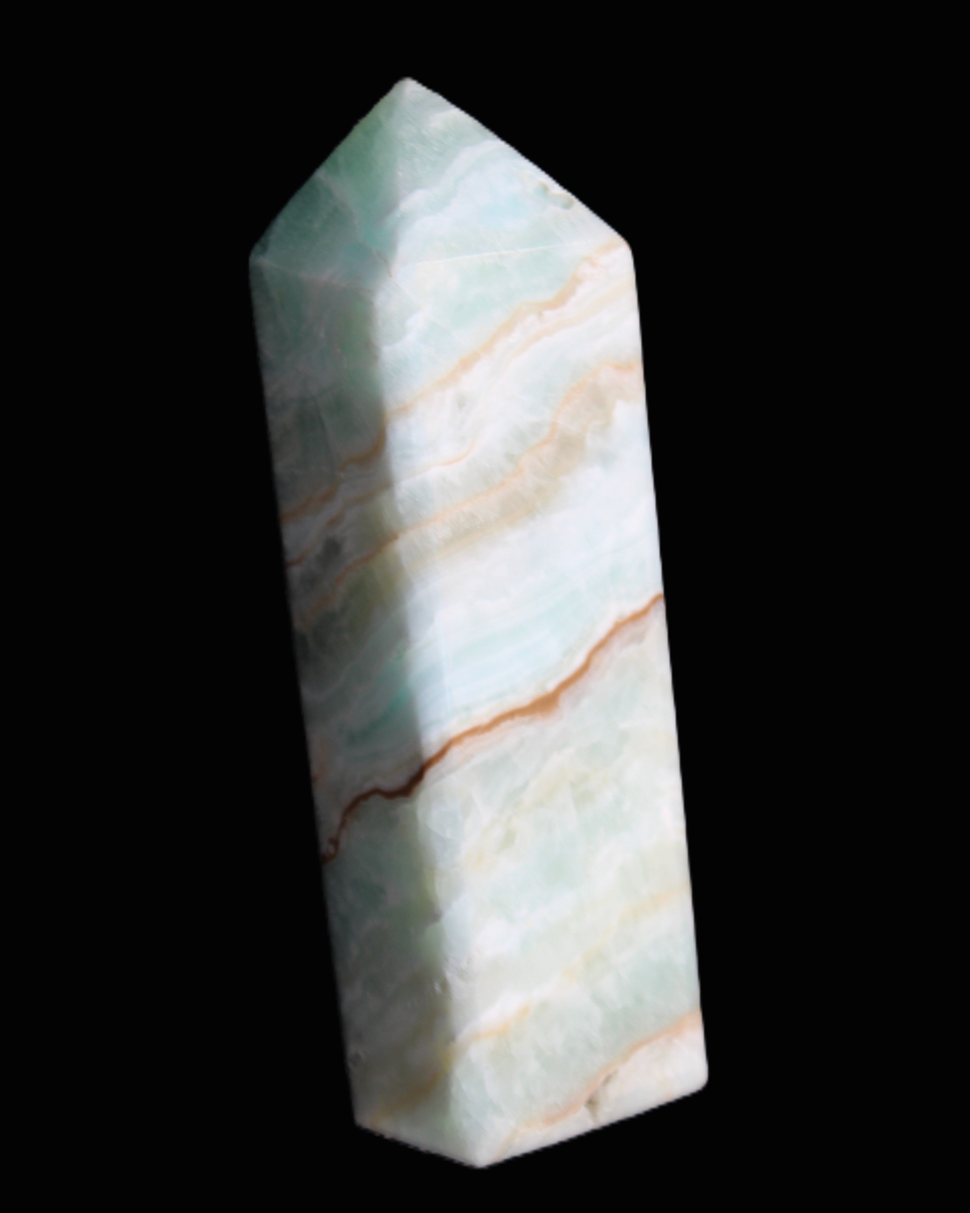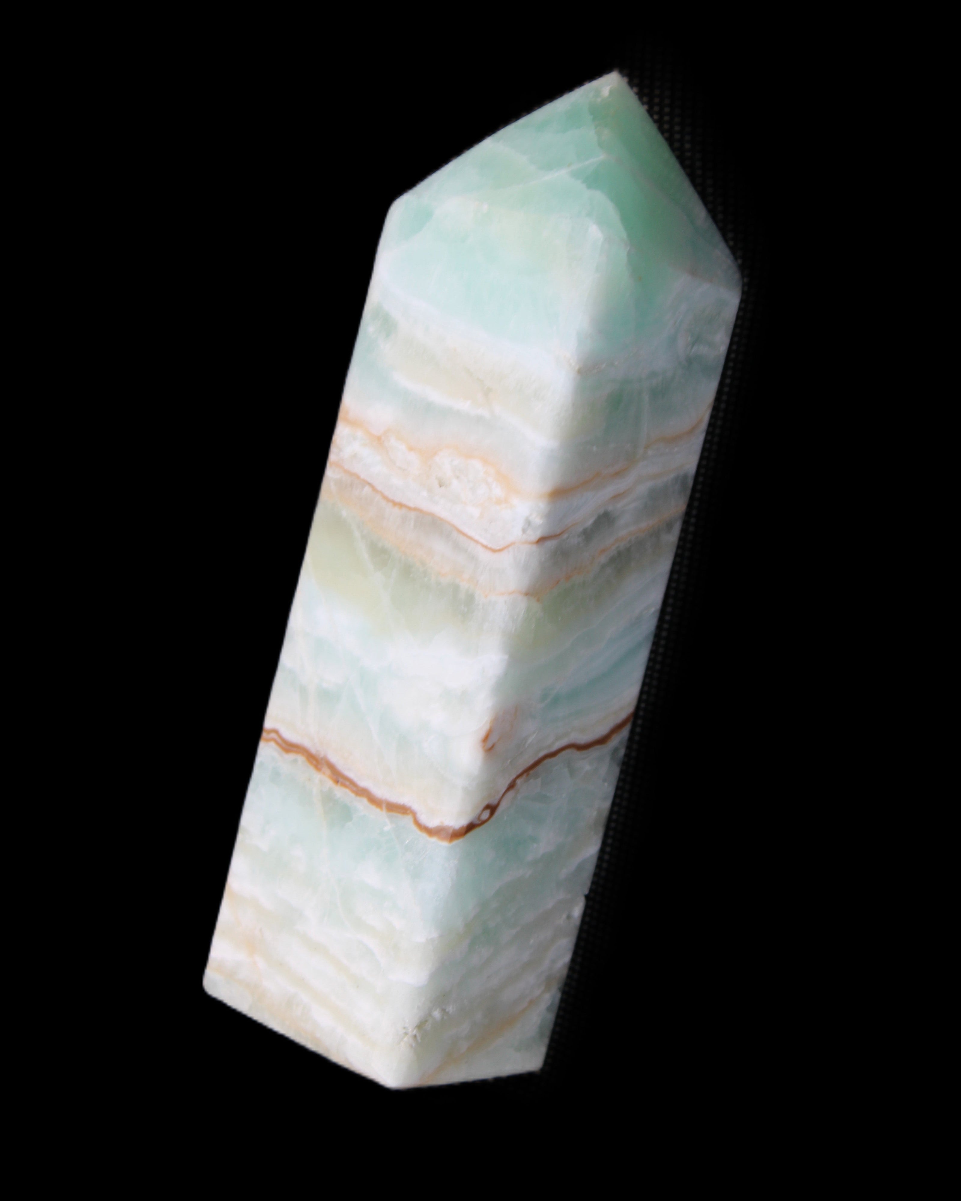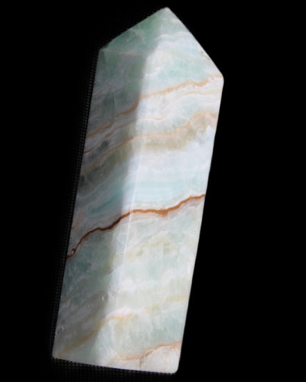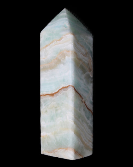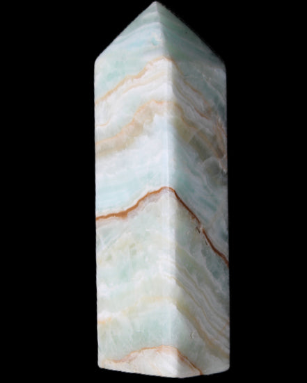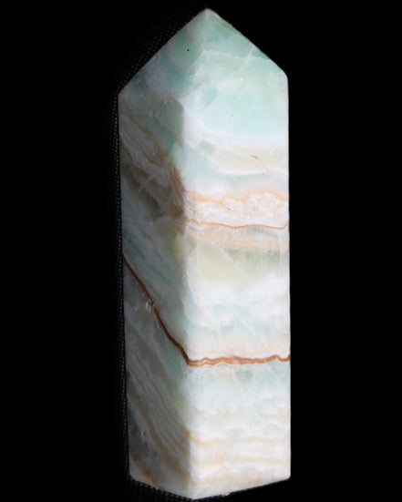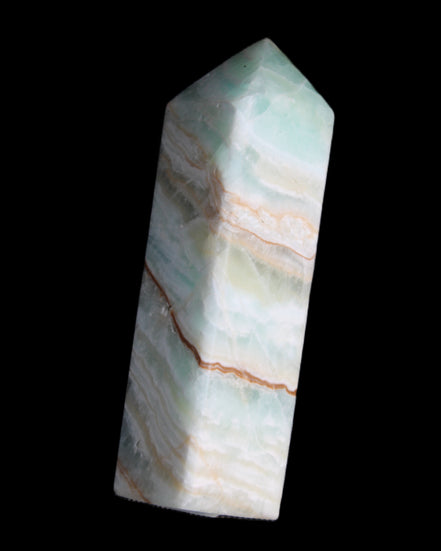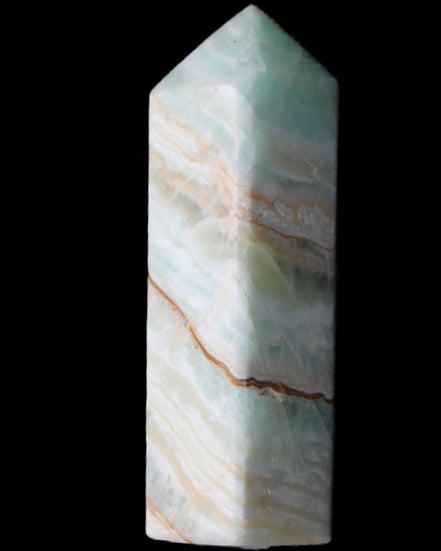 This Pistachio calcite obelisk 120mm weighs 300g. Pistachio is a rarer variety of Caribbean Calcite and is actually Aragonite. It is found in Pakistan.