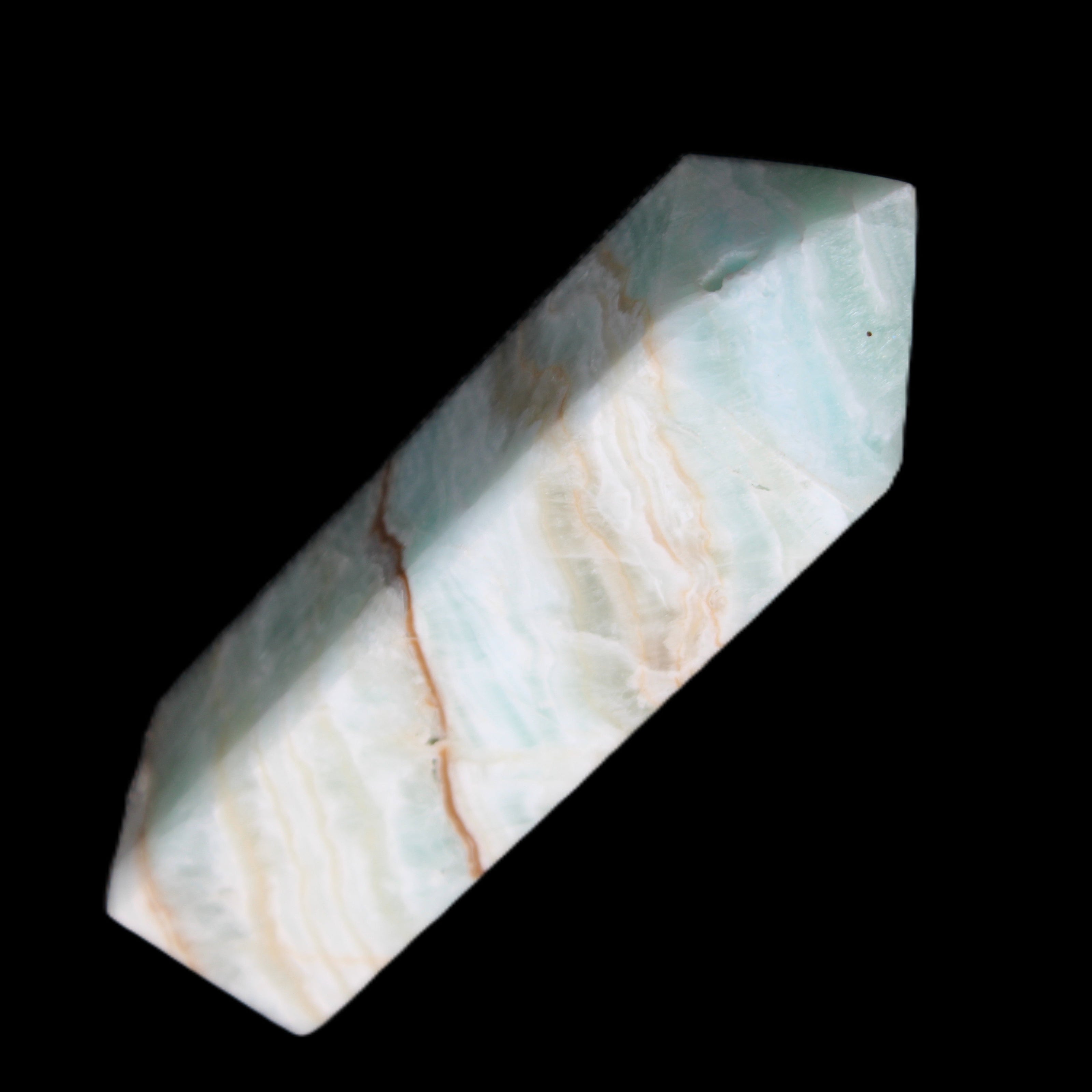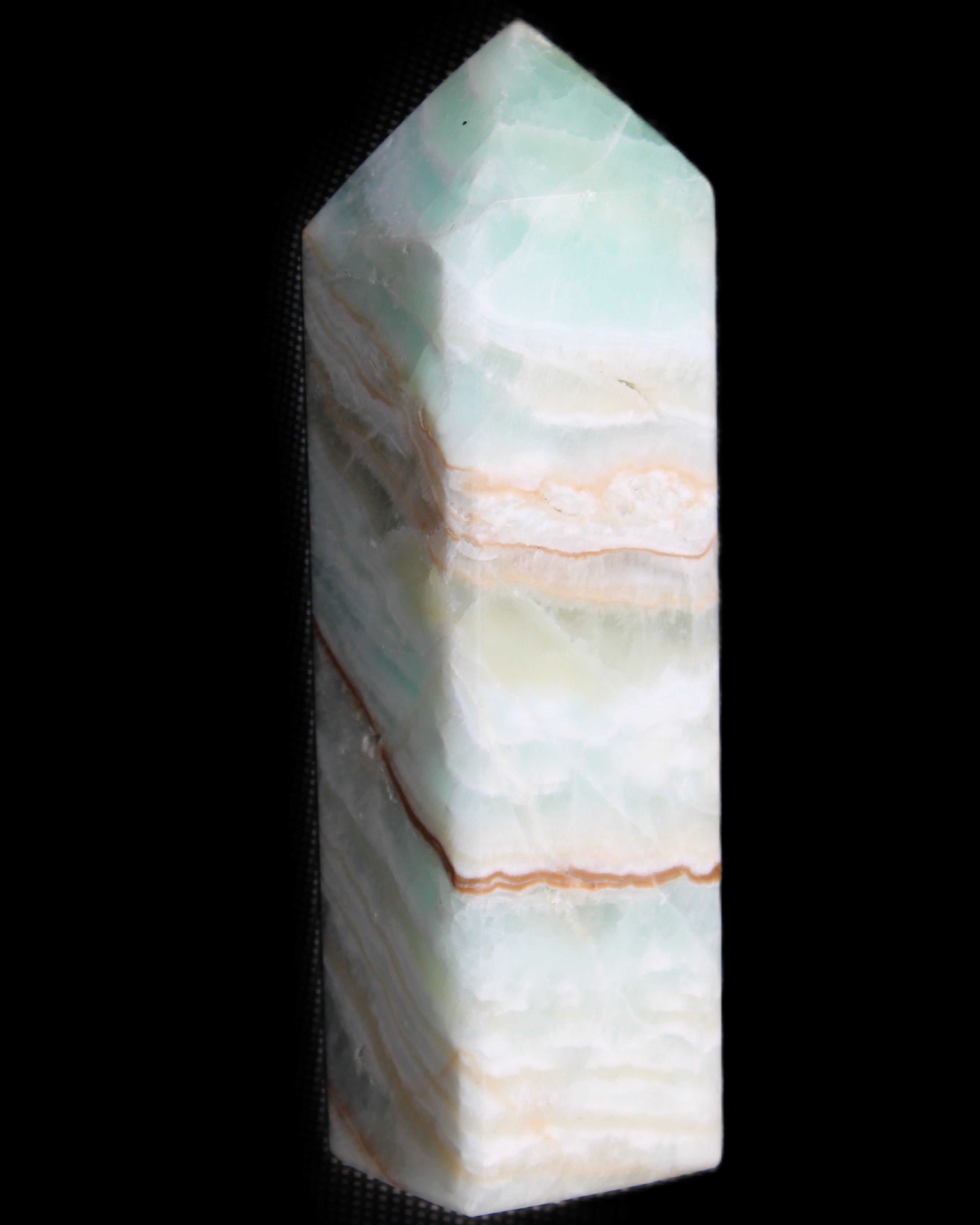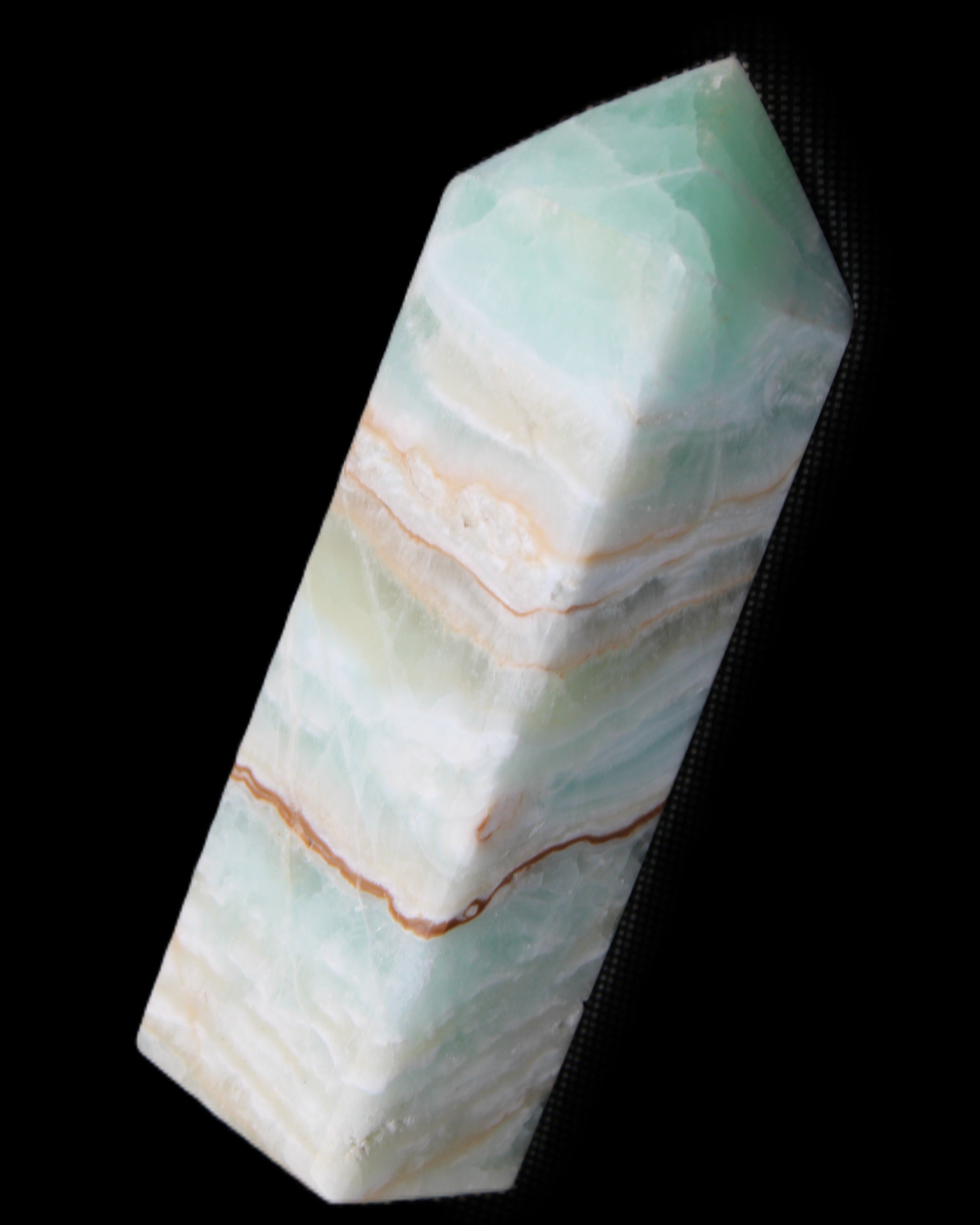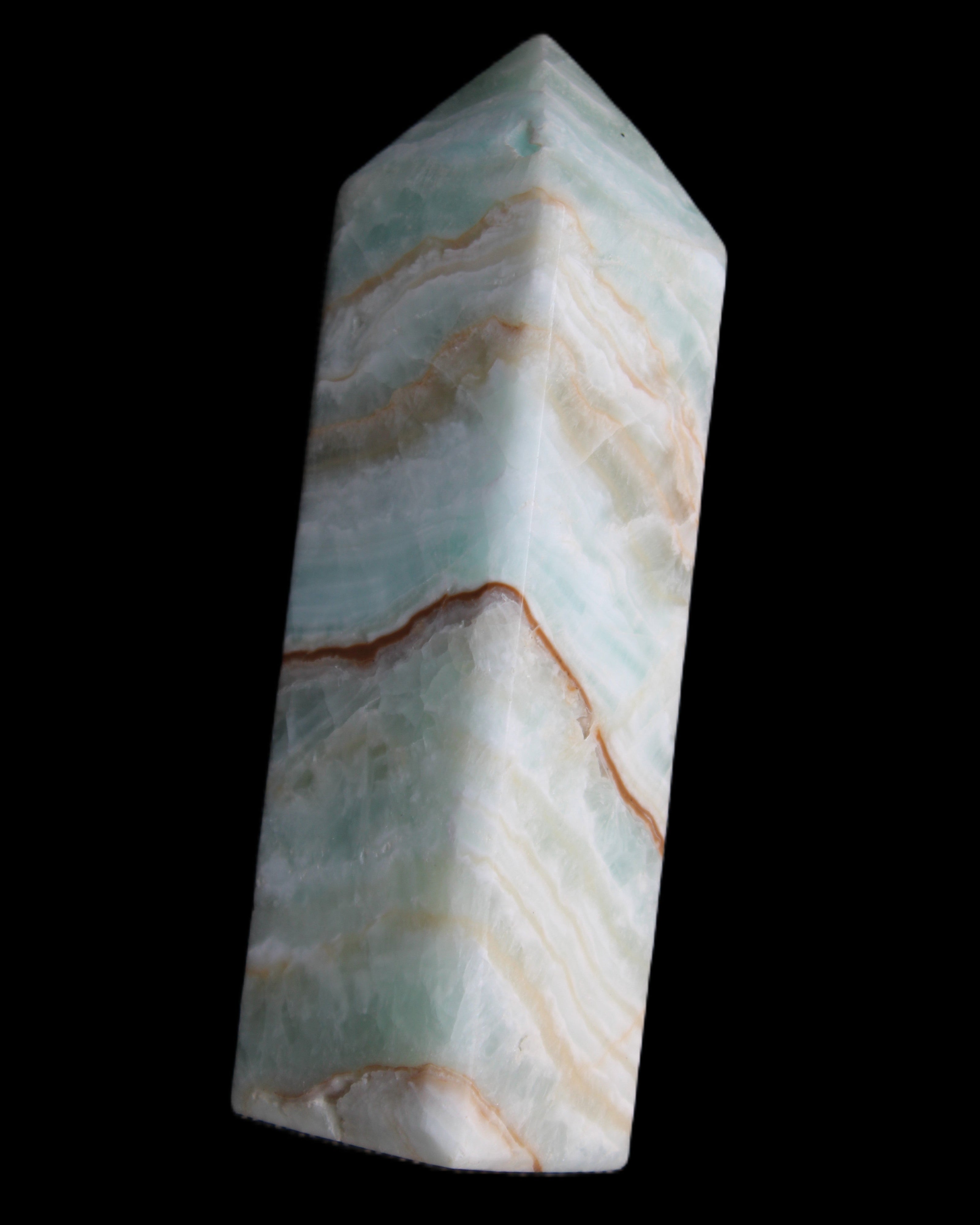 This Pistachio calcite obelisk 120mm weighs 300g. Pistachio is a rarer variety of Caribbean Calcite and is actually Aragonite. It is found in Pakistan.