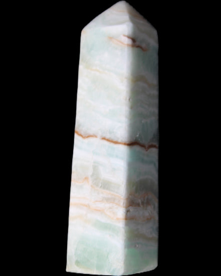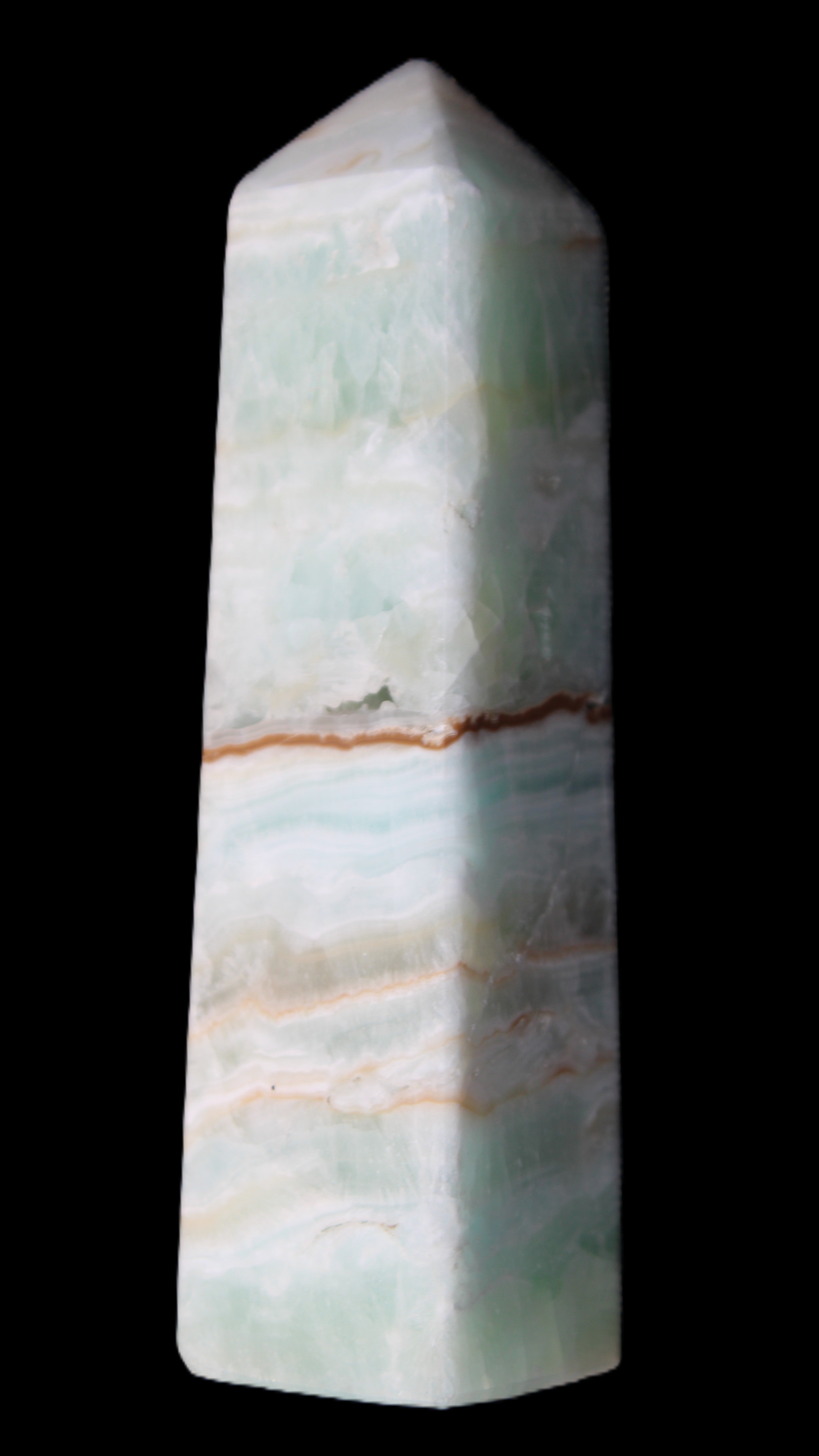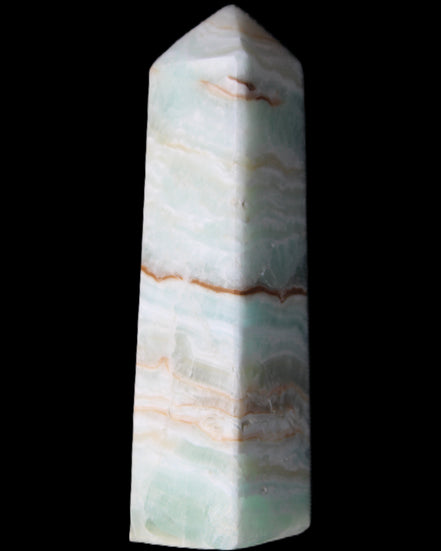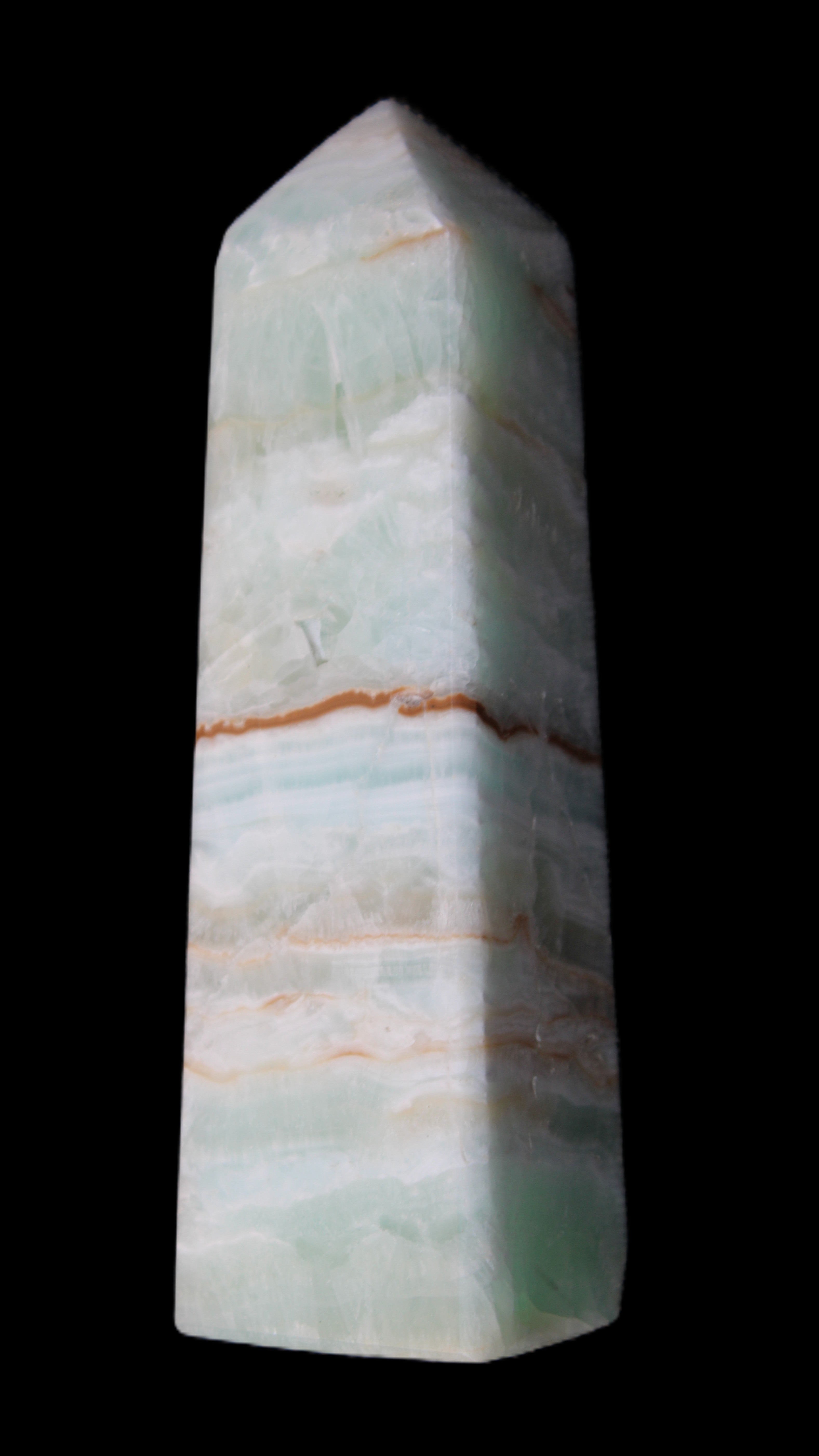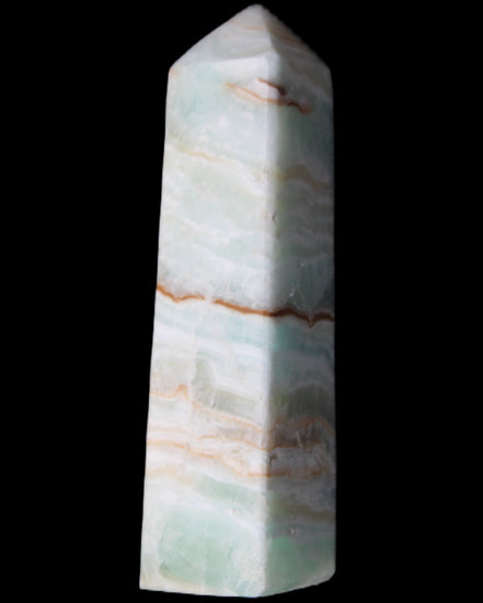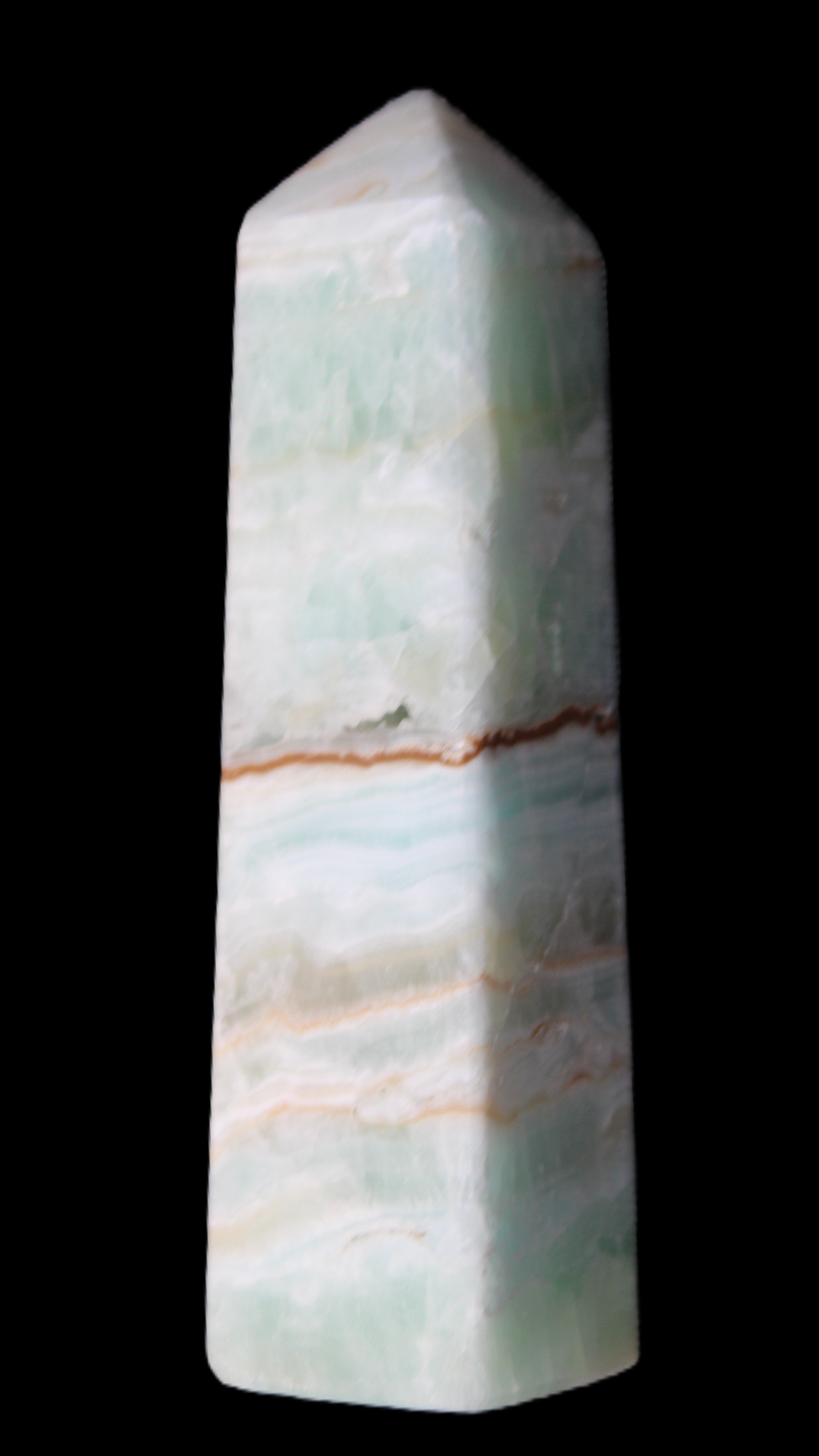 This Pistachio calcite obelisk 133mm weighs 290g. Pistachio is a rarer variety of Caribbean Calcite and is actually Aragonite. It is found in Pakistan.