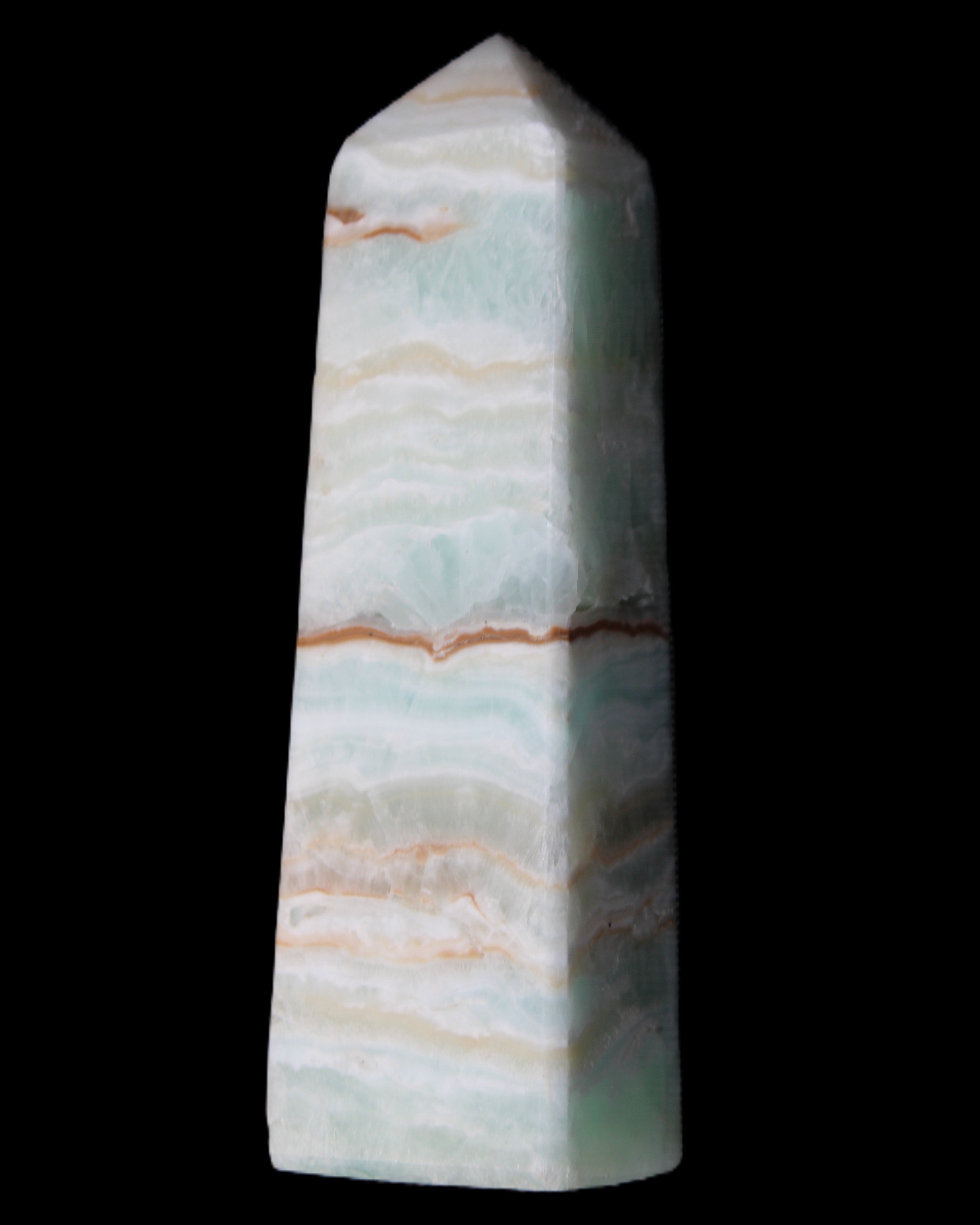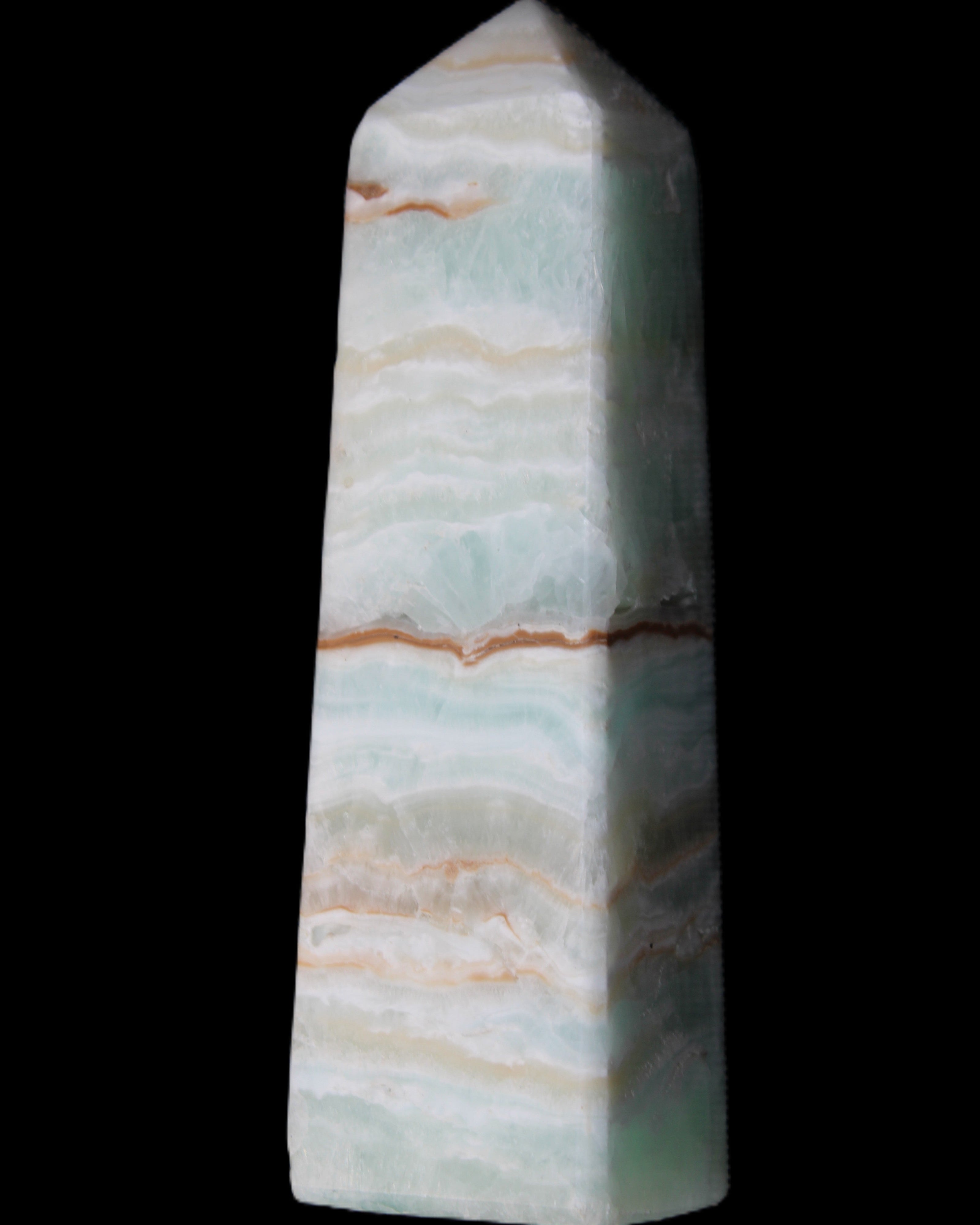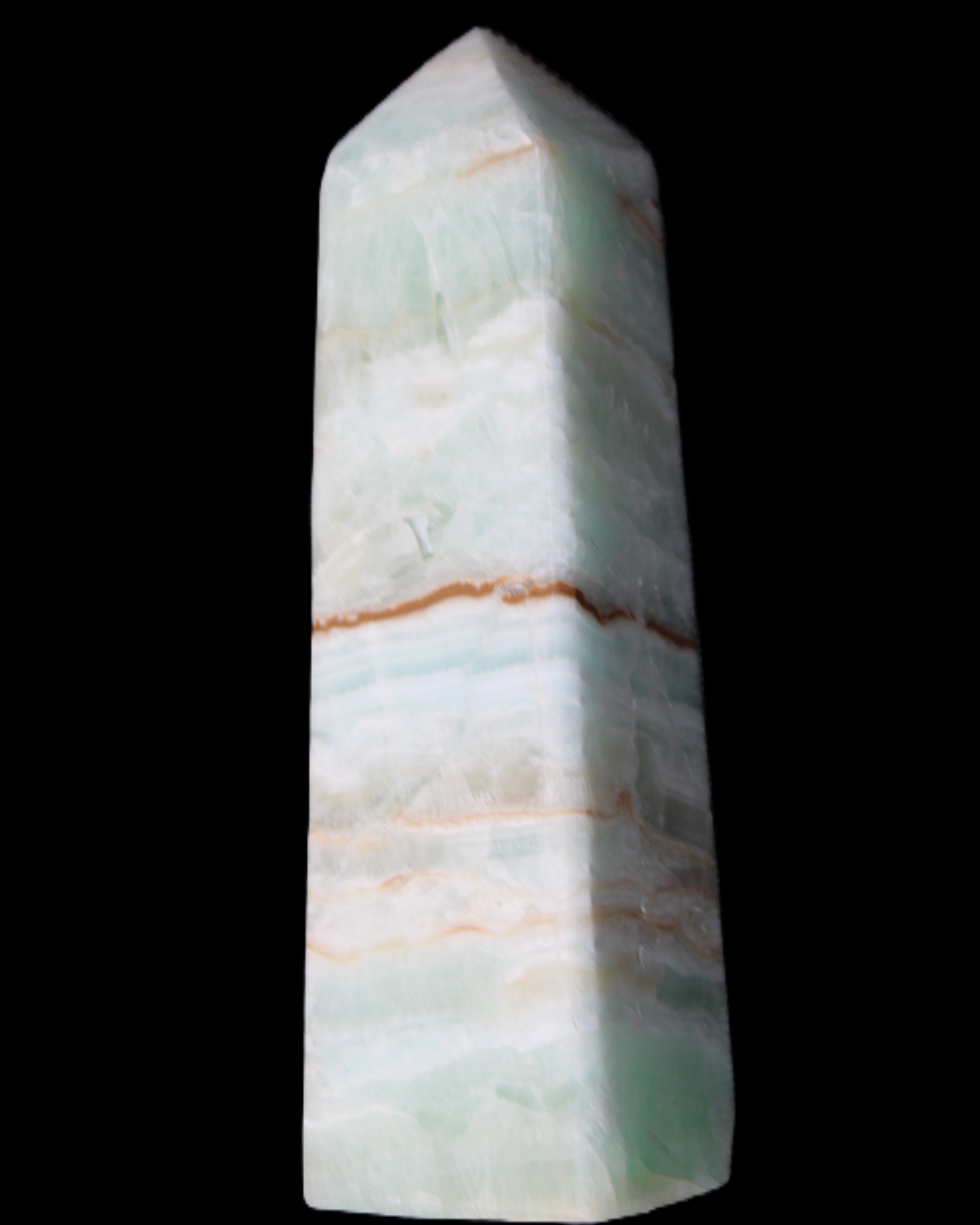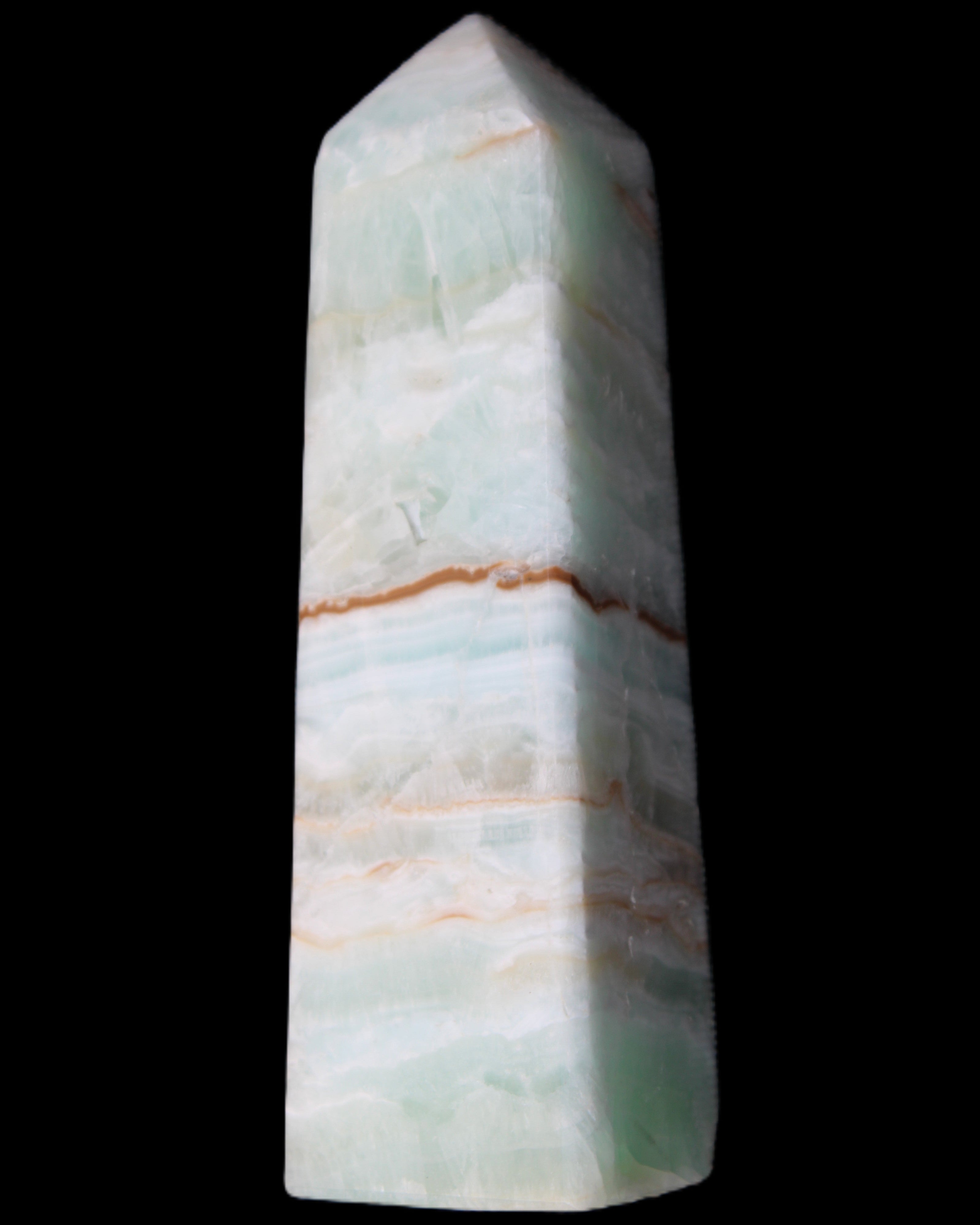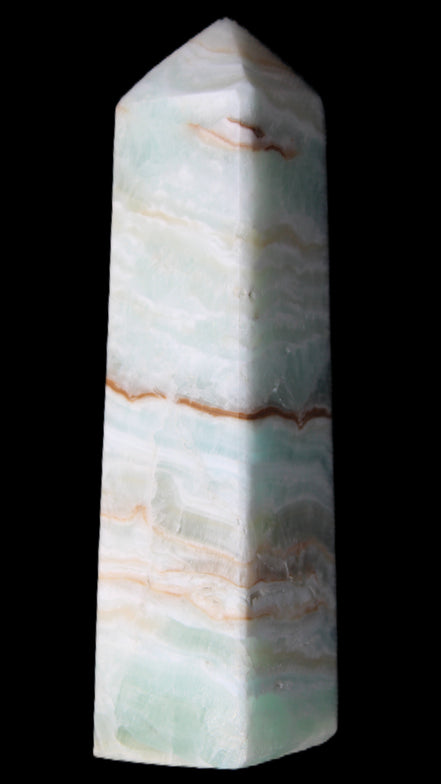This Pistachio calcite obelisk 133mm weighs 290g. Pistachio is a rarer variety of Caribbean Calcite and is actually Aragonite. It is found in Pakistan.