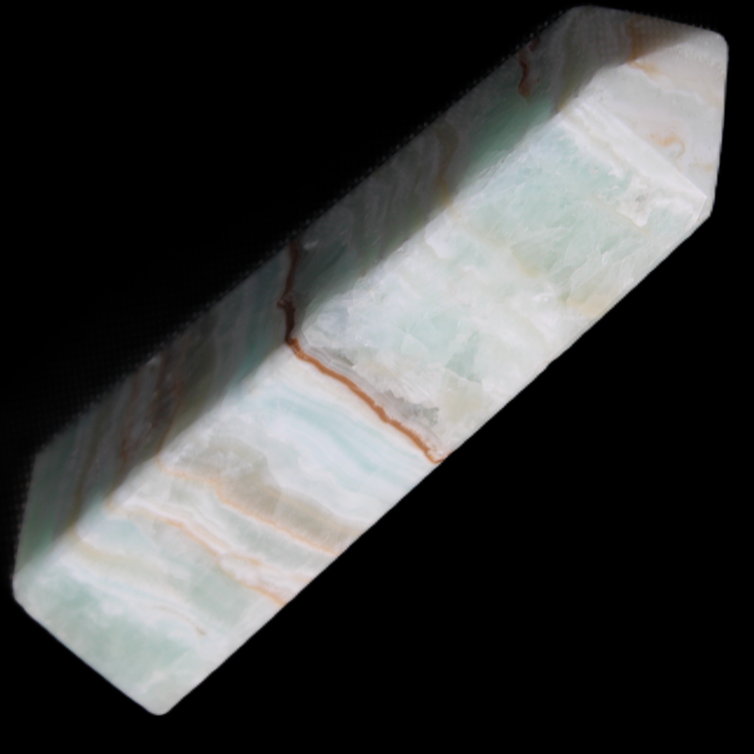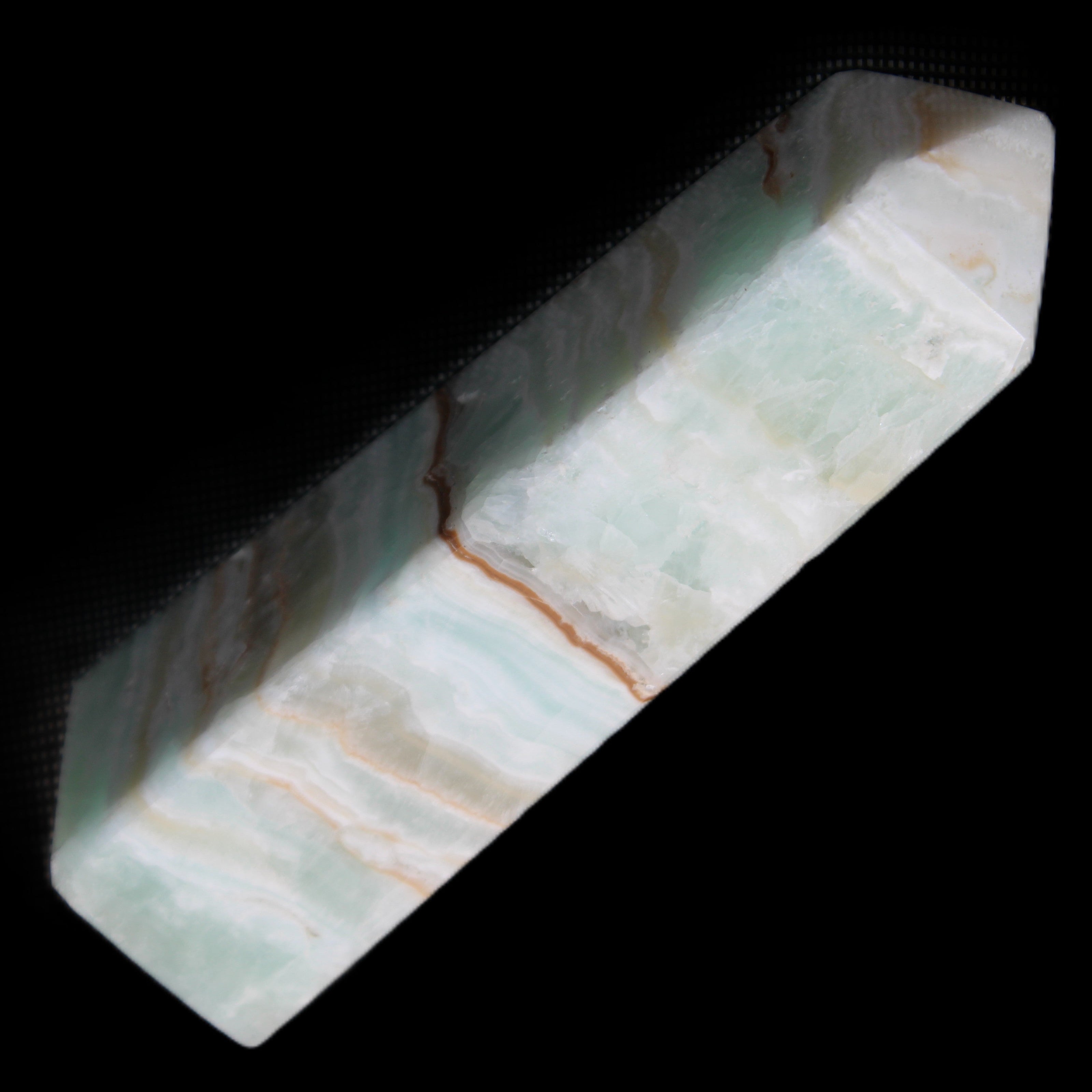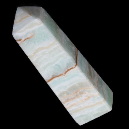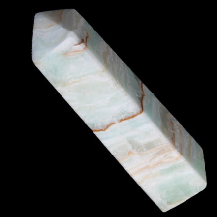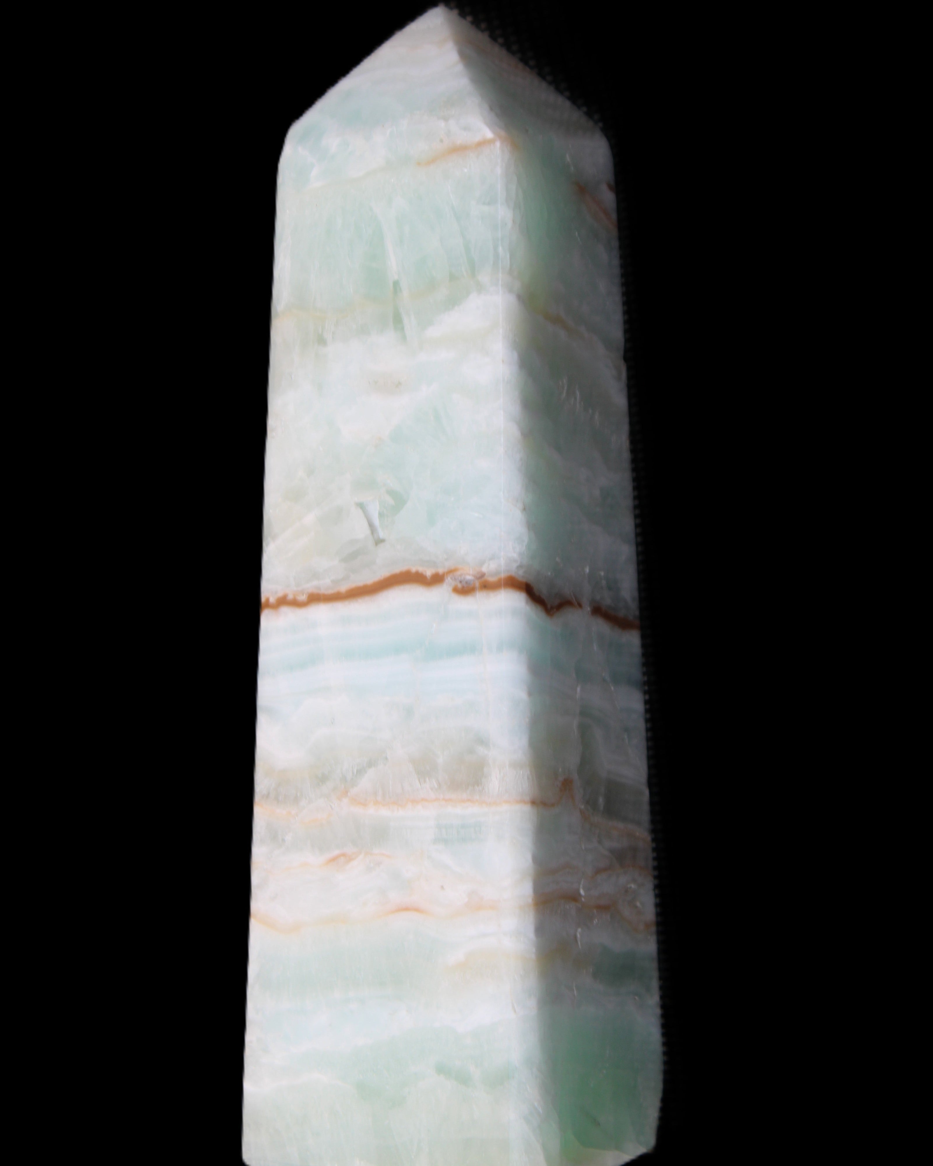 This Pistachio calcite obelisk 133mm weighs 290g. Pistachio is a rarer variety of Caribbean Calcite and is actually Aragonite. It is found in Pakistan.