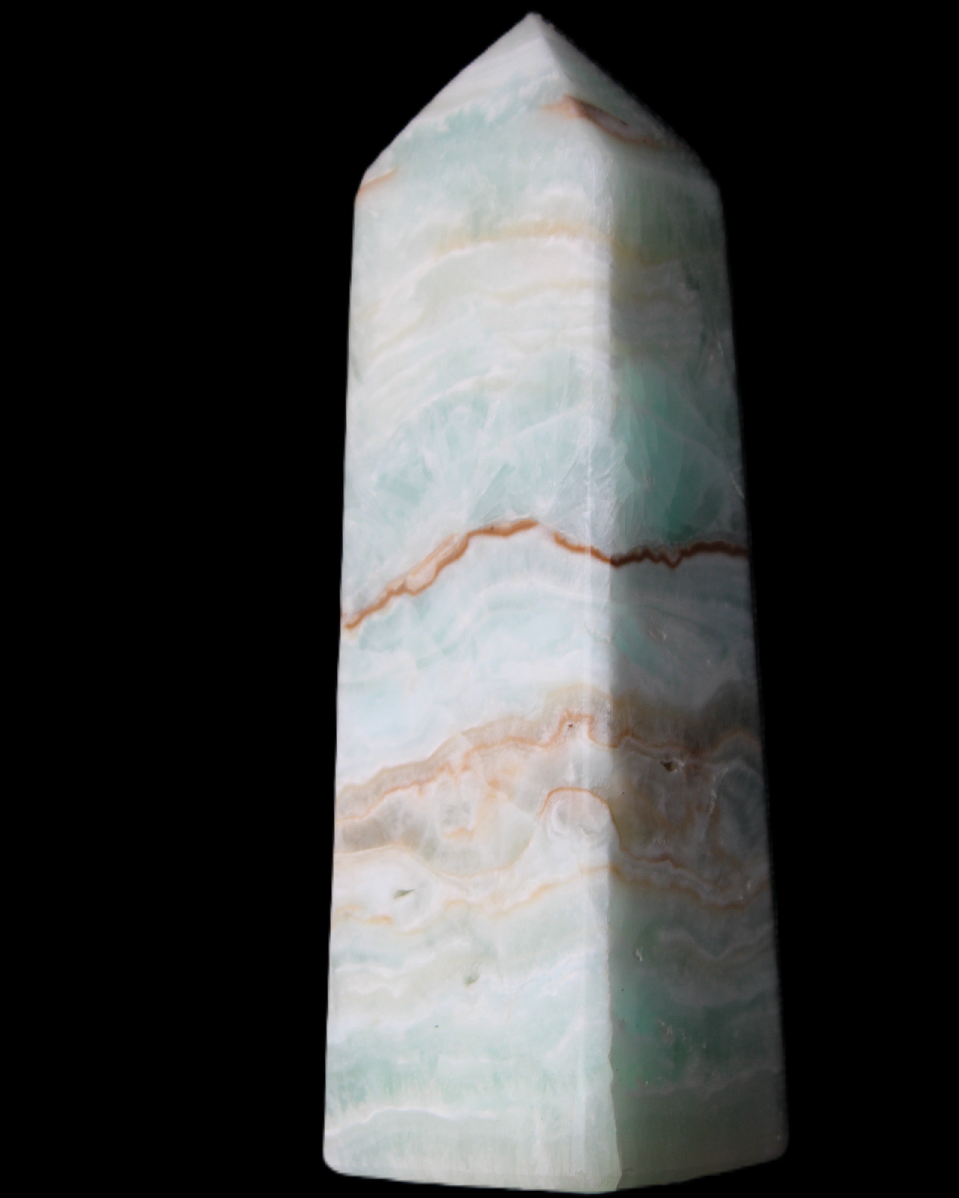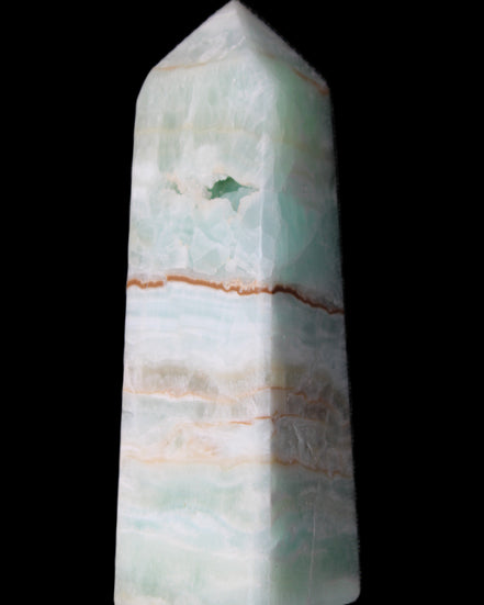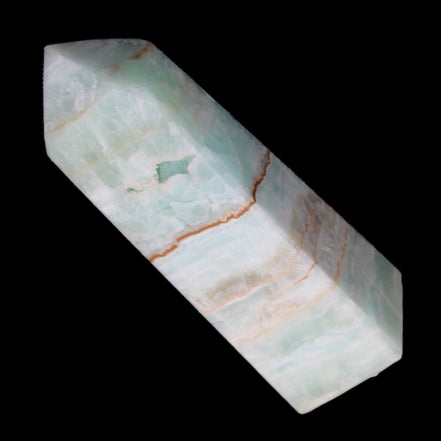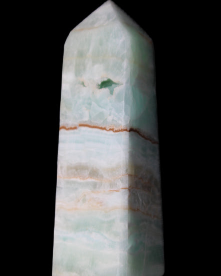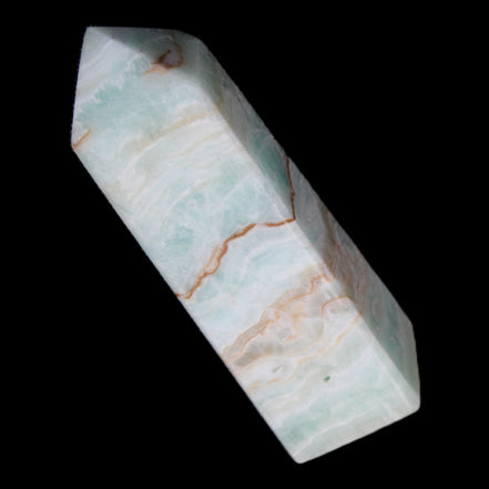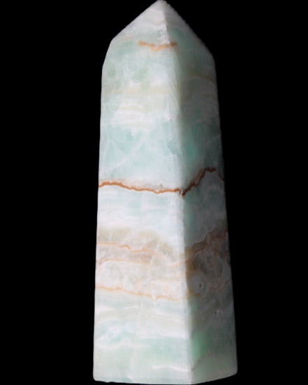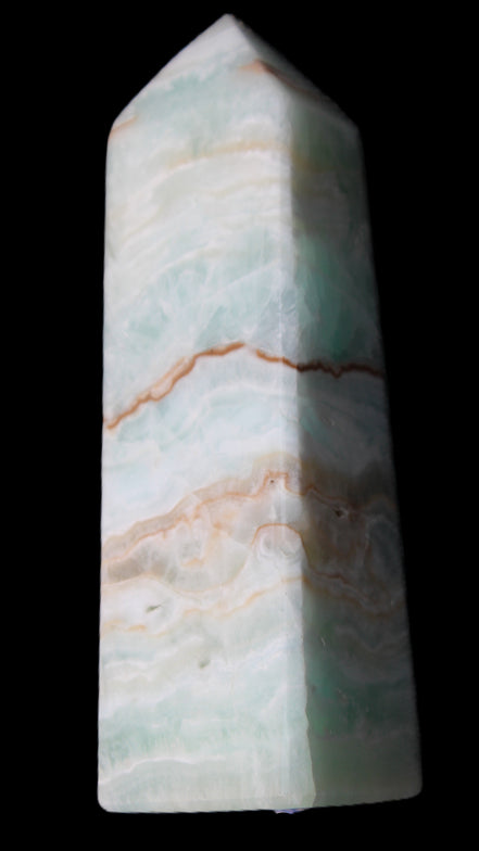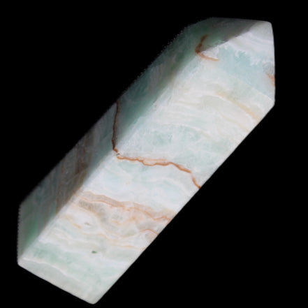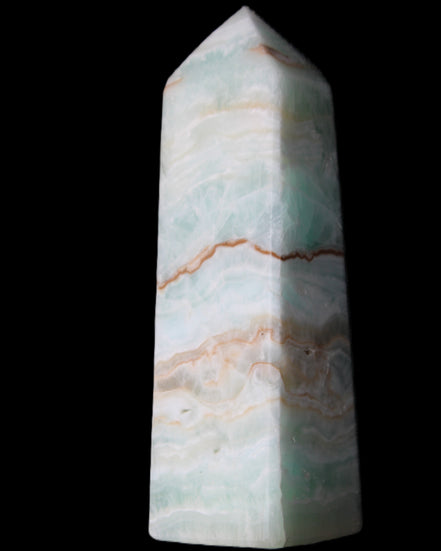This Pistachio calcite obelisk 122mm weighs 328g. Pistachio is a rarer variety of Caribbean Calcite and is actually Aragonite. It is found in Pakistan.