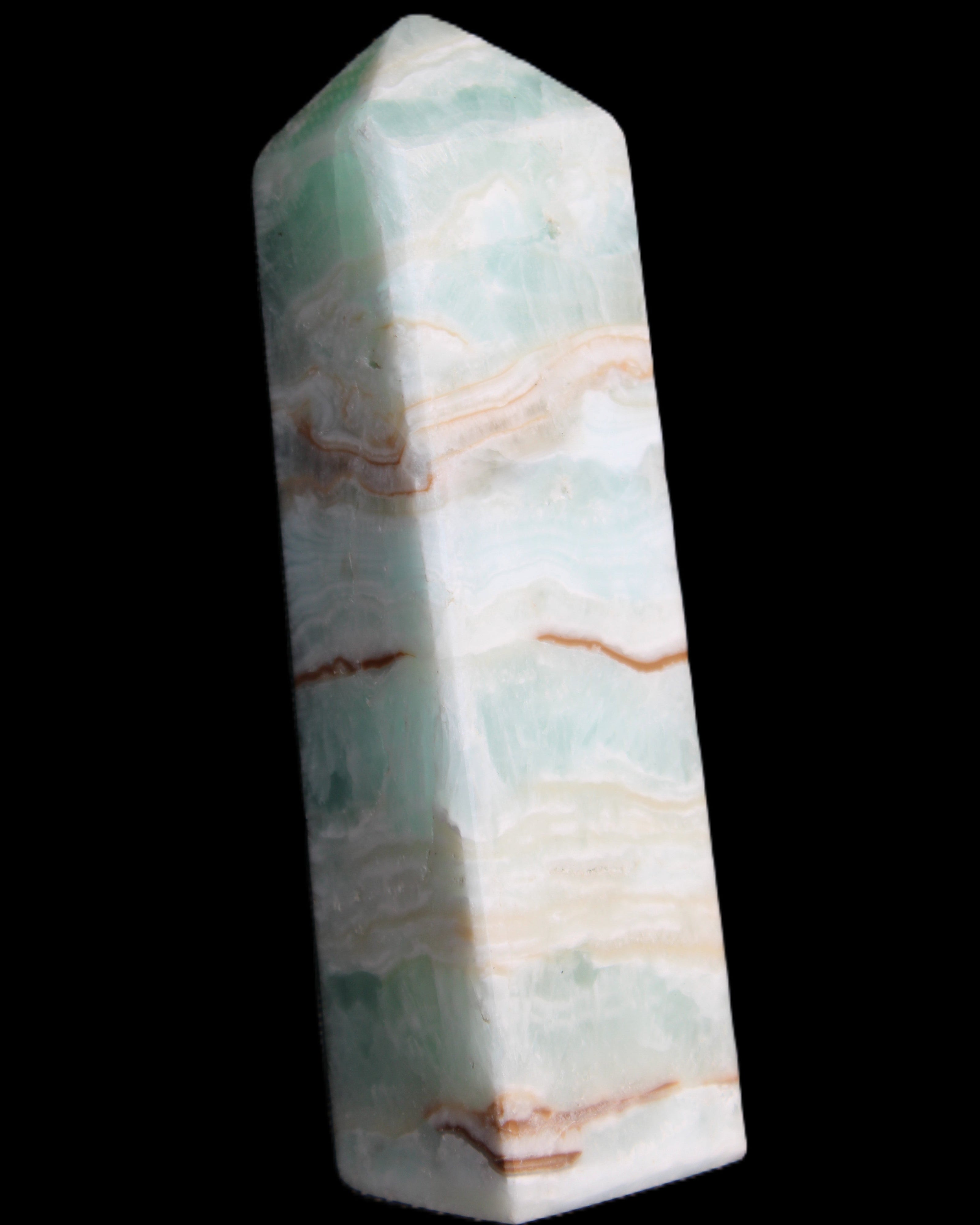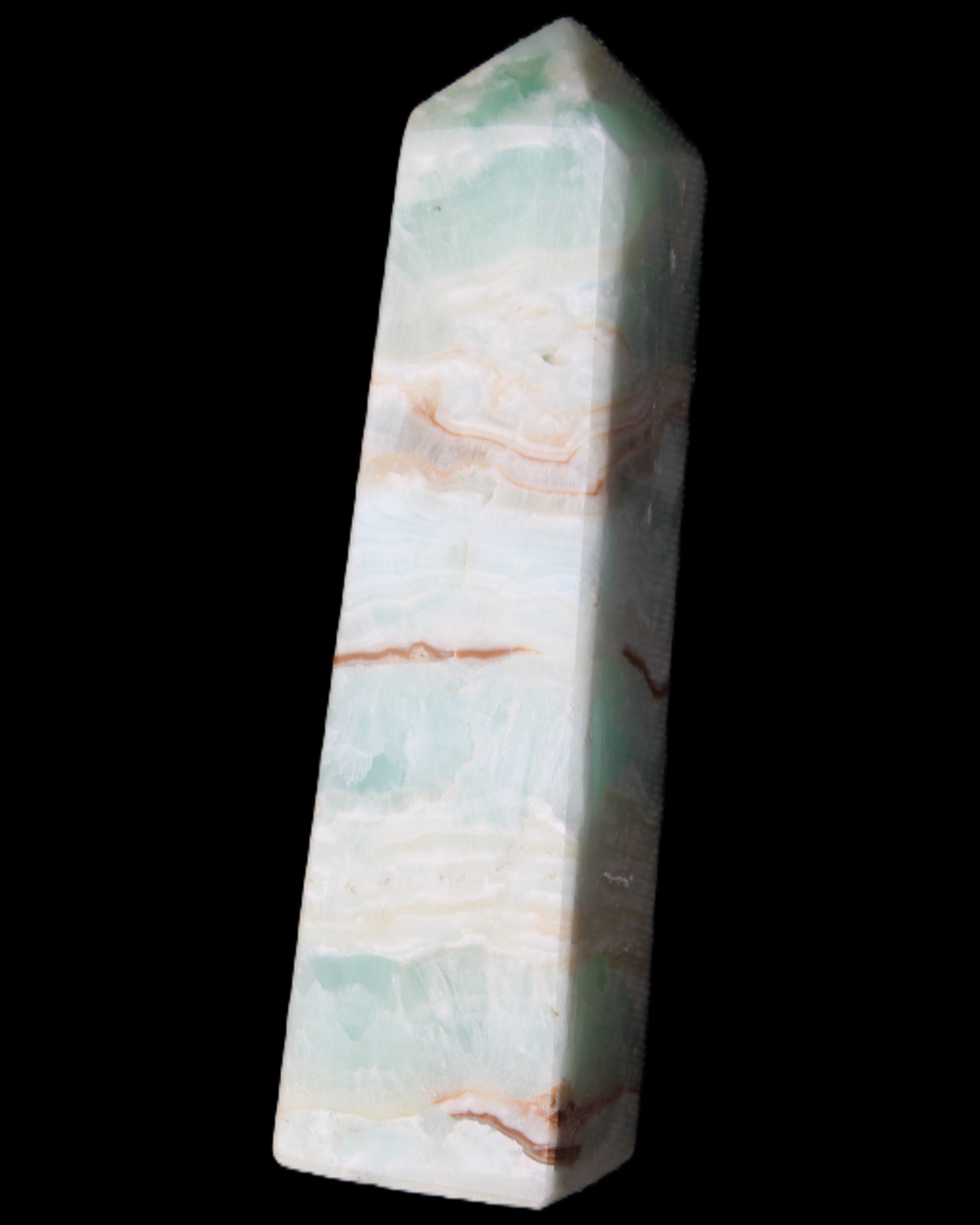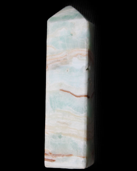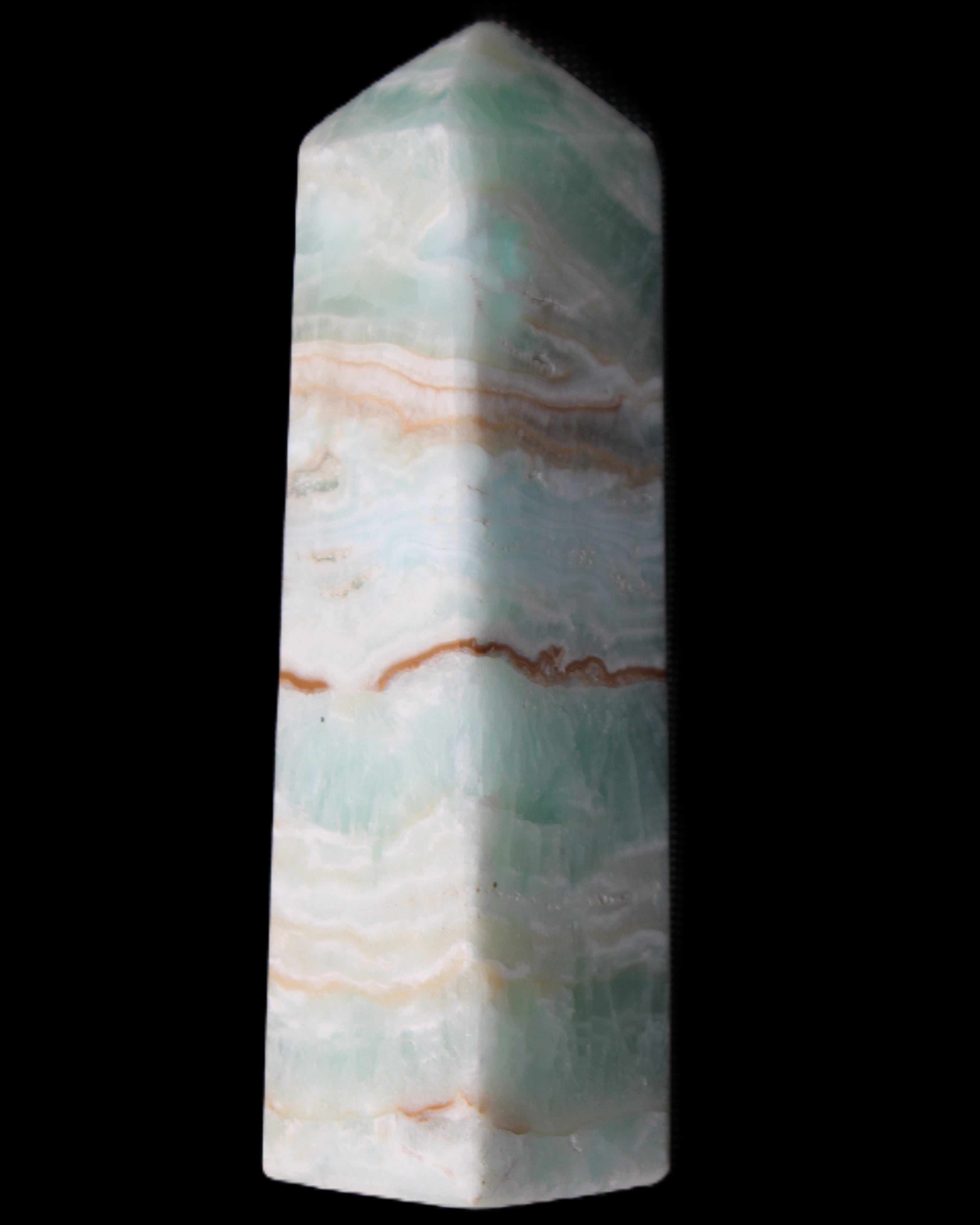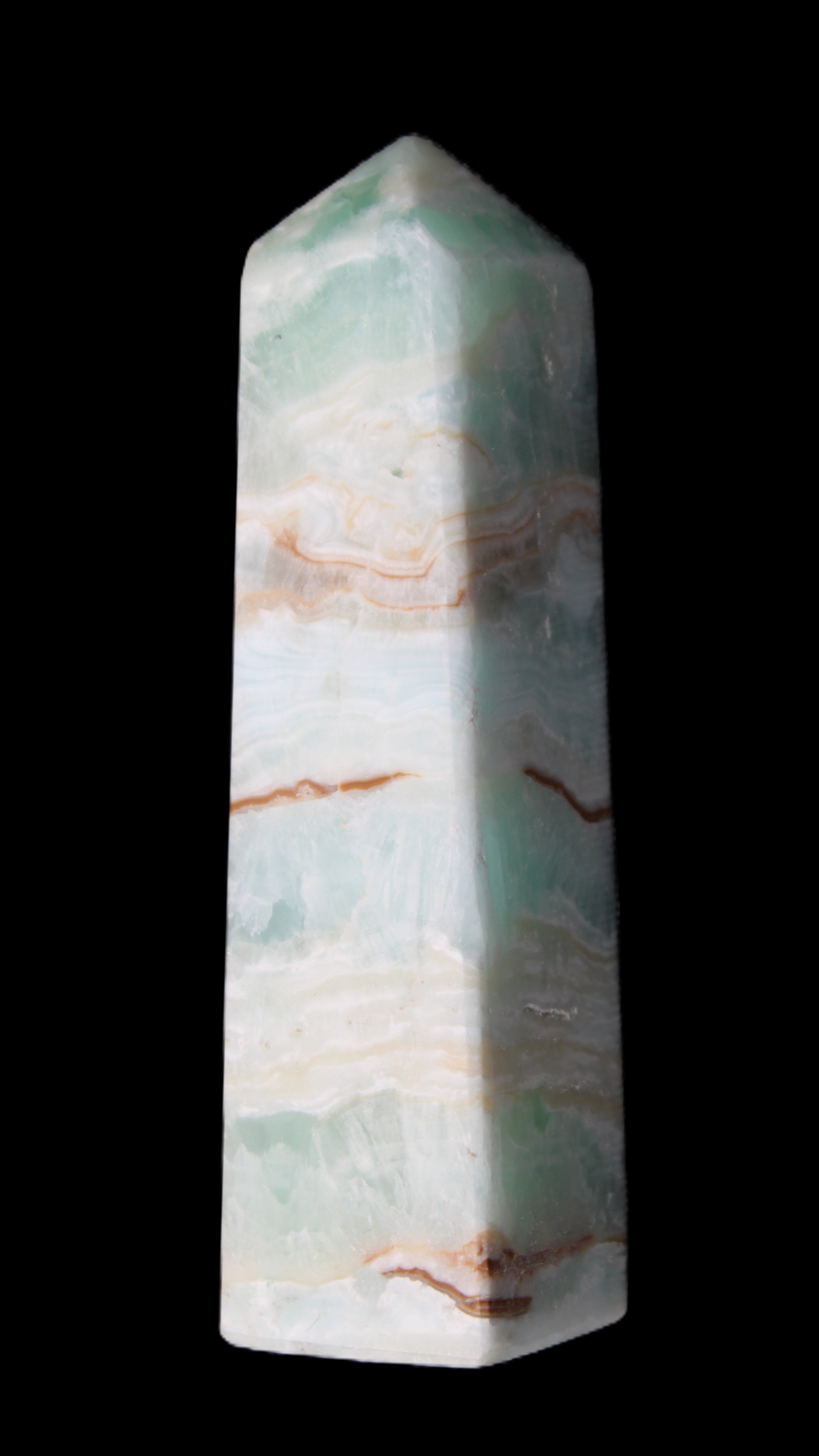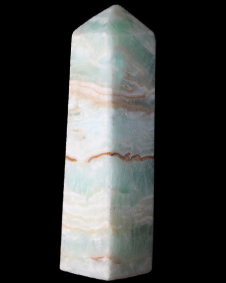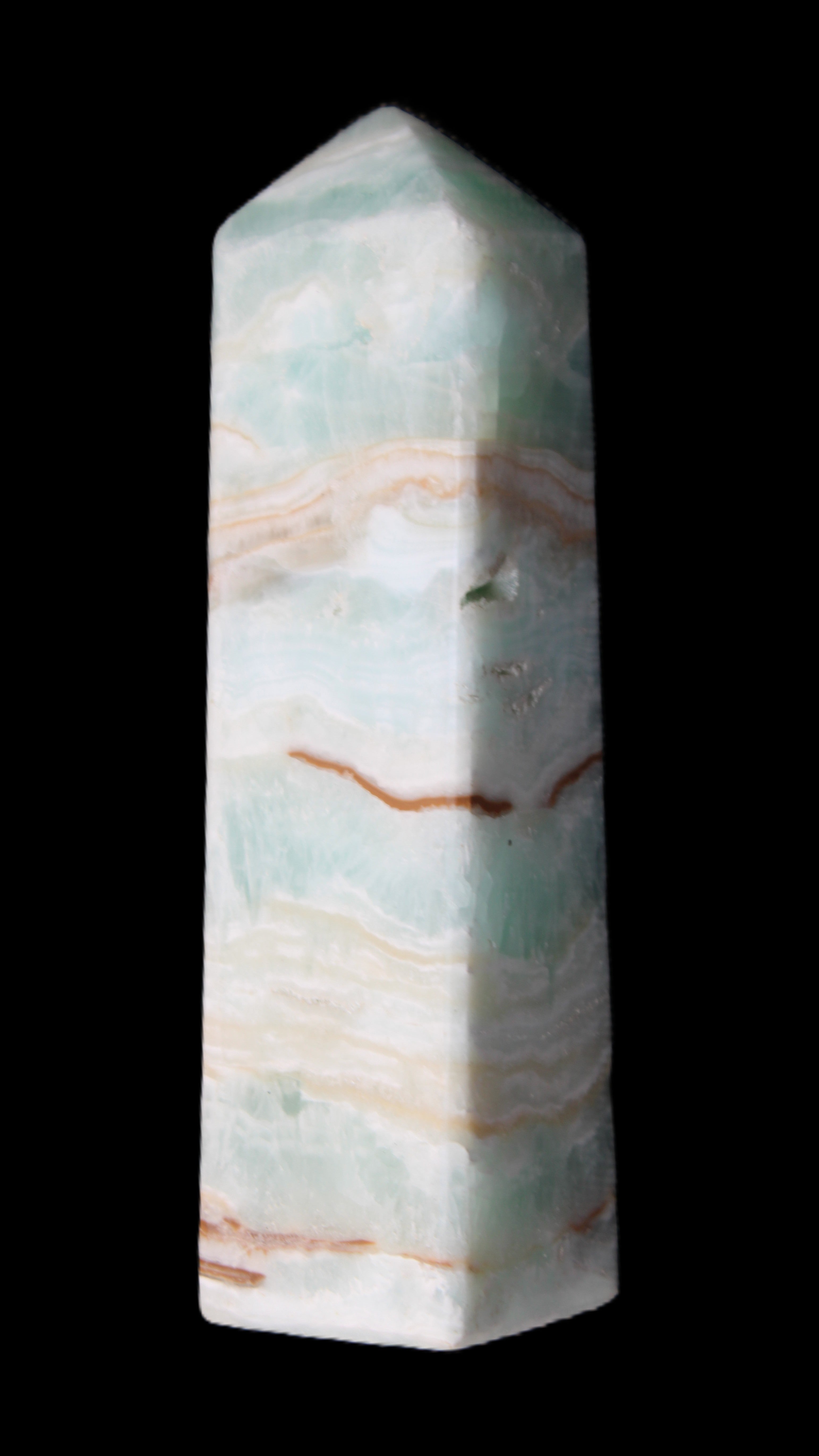 This Pistachio calcite obelisk 130mm weighs 332g. Pistachio is a rarer variety of Caribbean Calcite and is actually Aragonite. It is found in Pakistan.