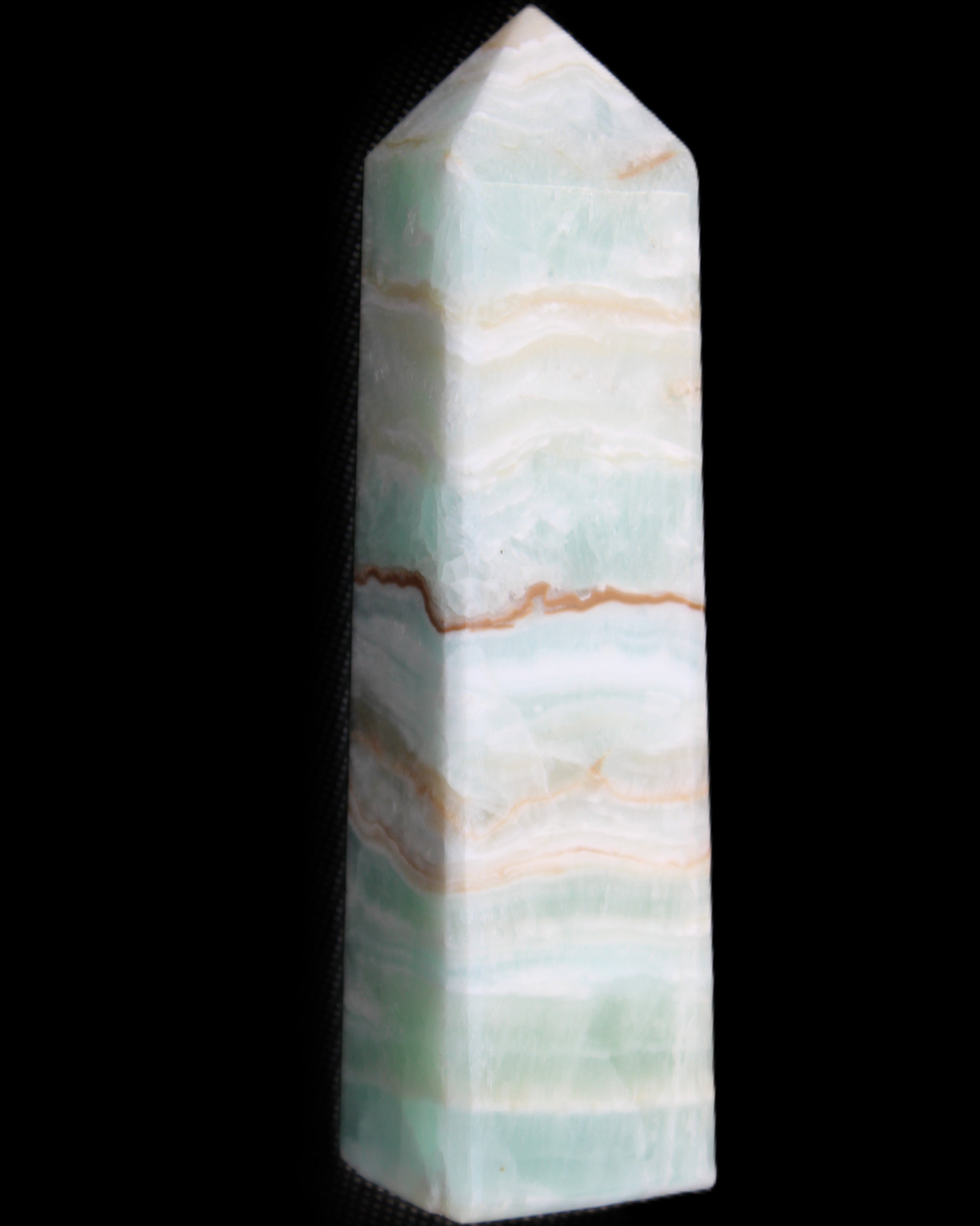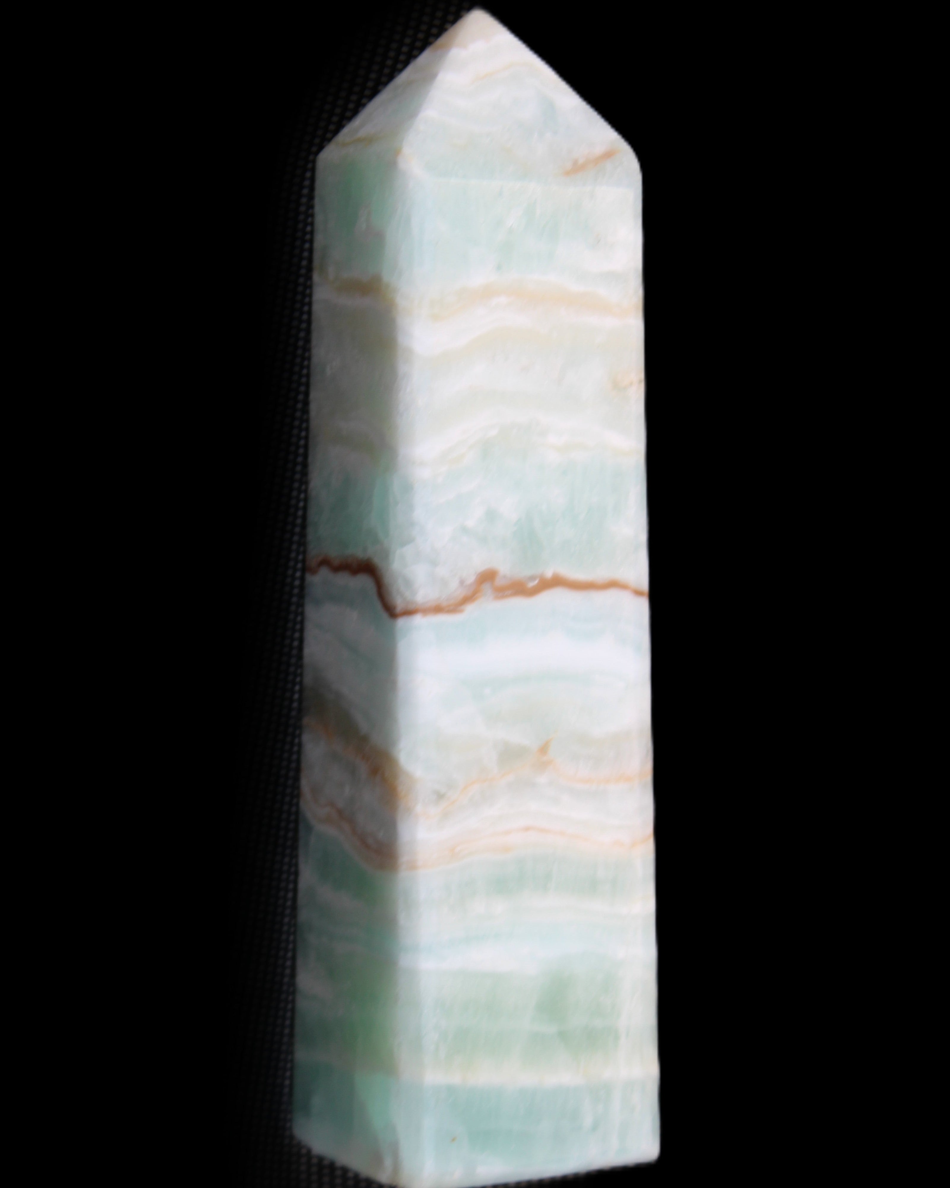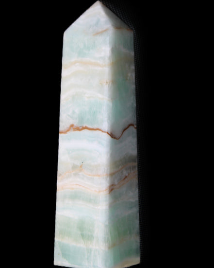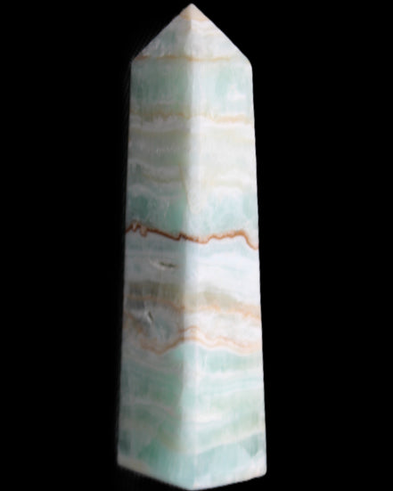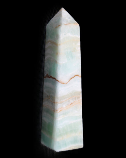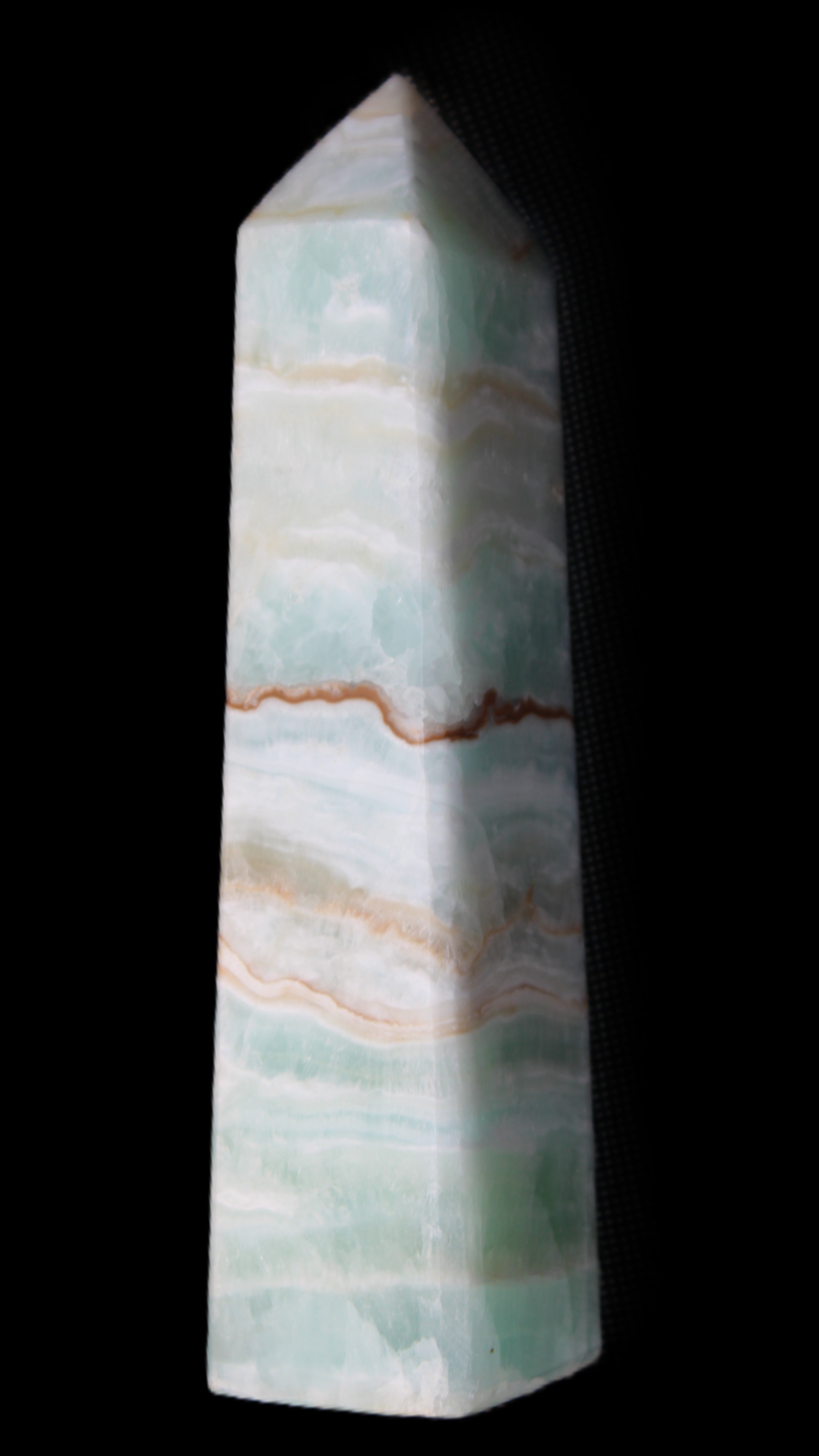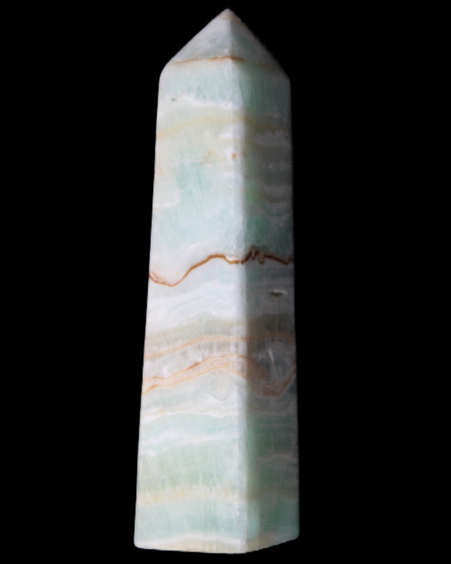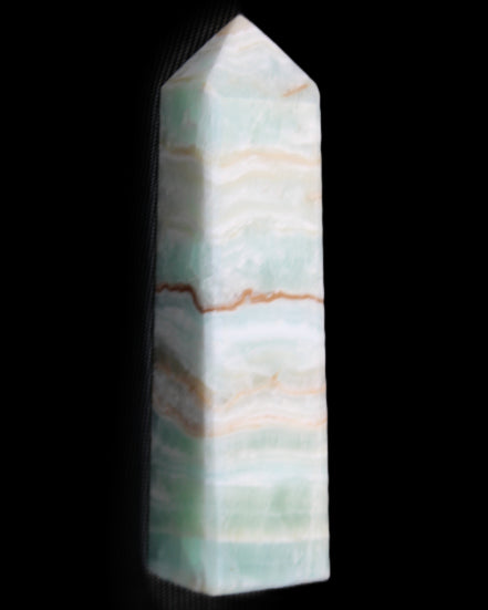 This Pistachio calcite obelisk 132mm weighs 304g. Pistachio is a rarer variety of Caribbean Calcite and is actually Aragonite. It is found in Pakistan.