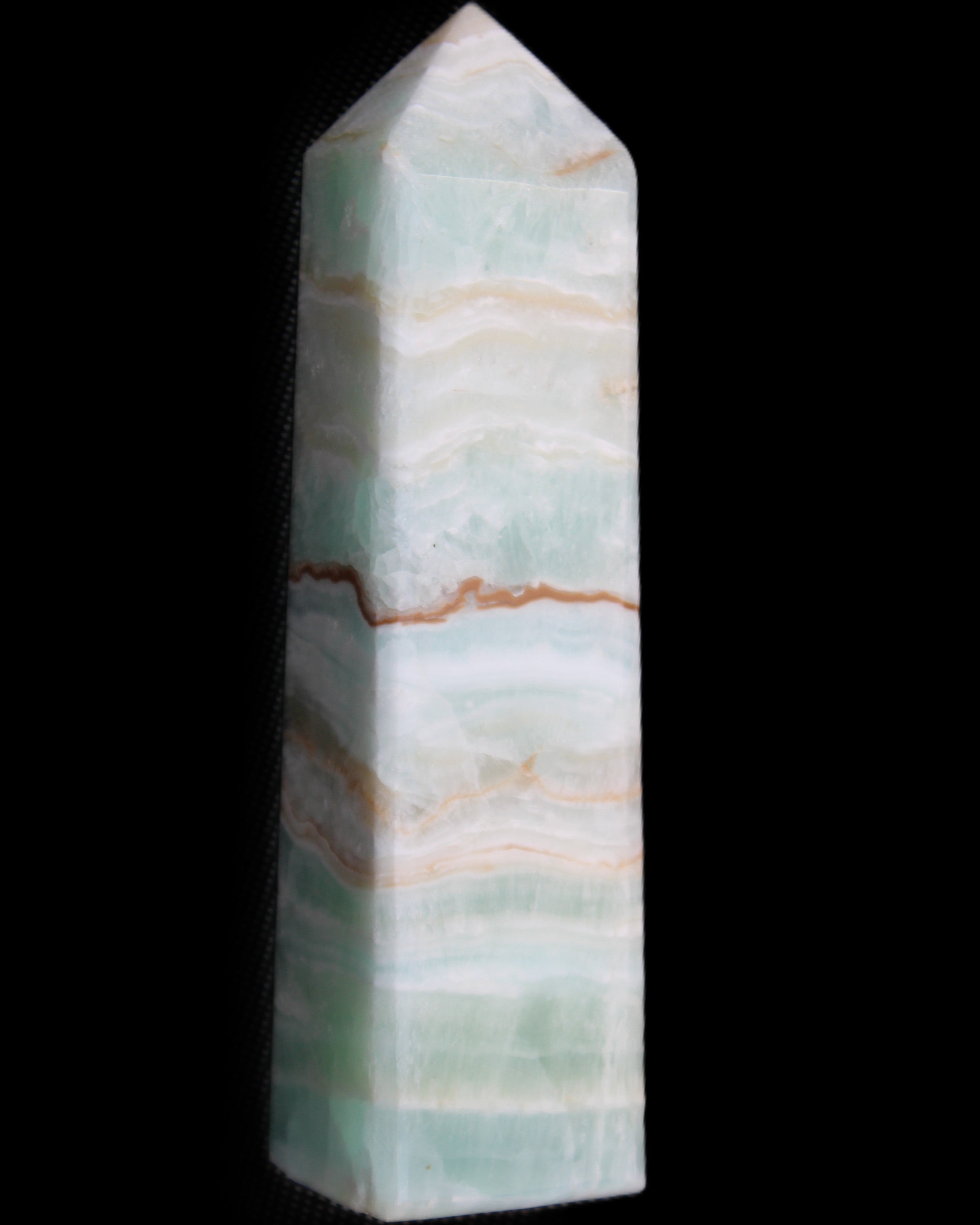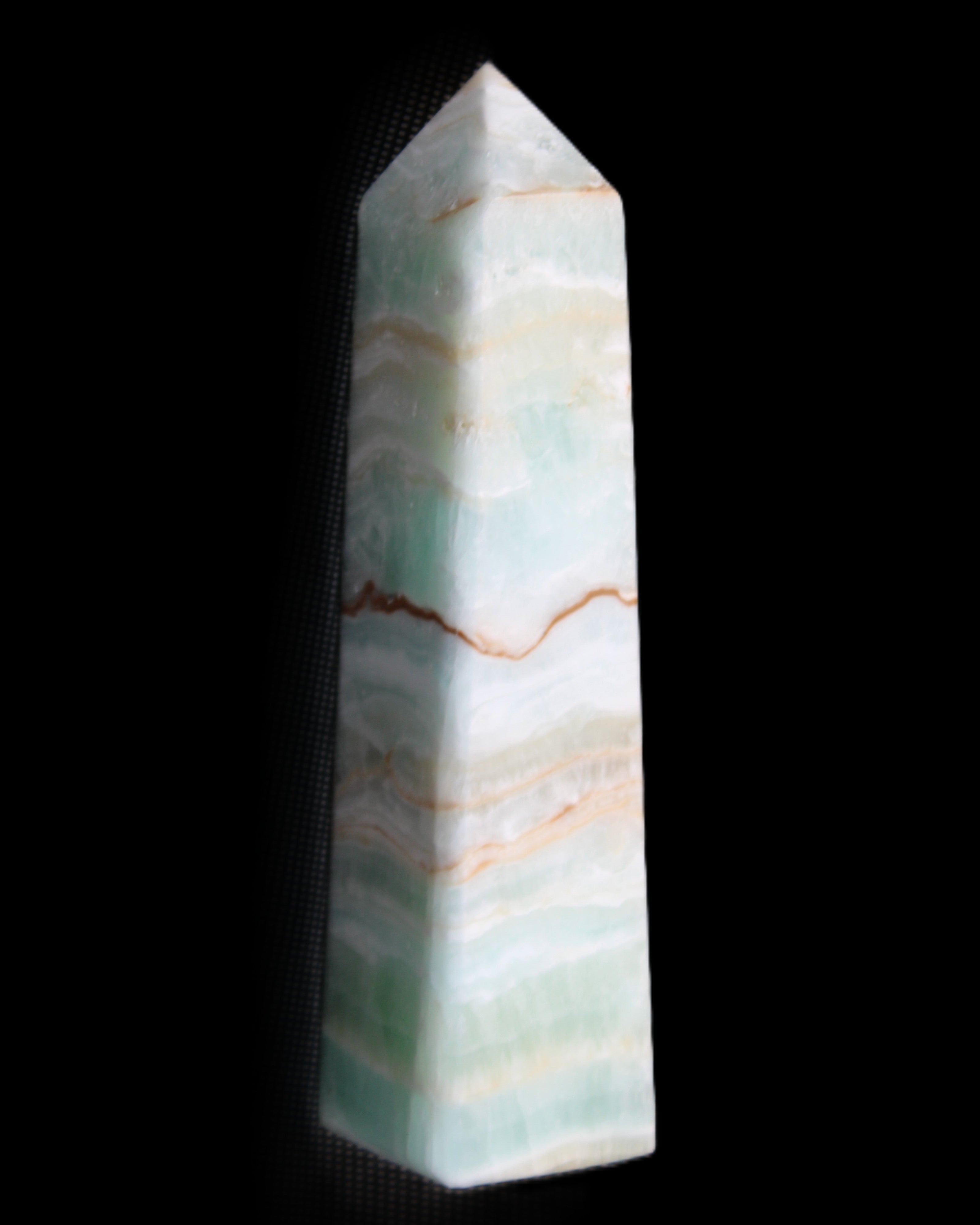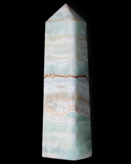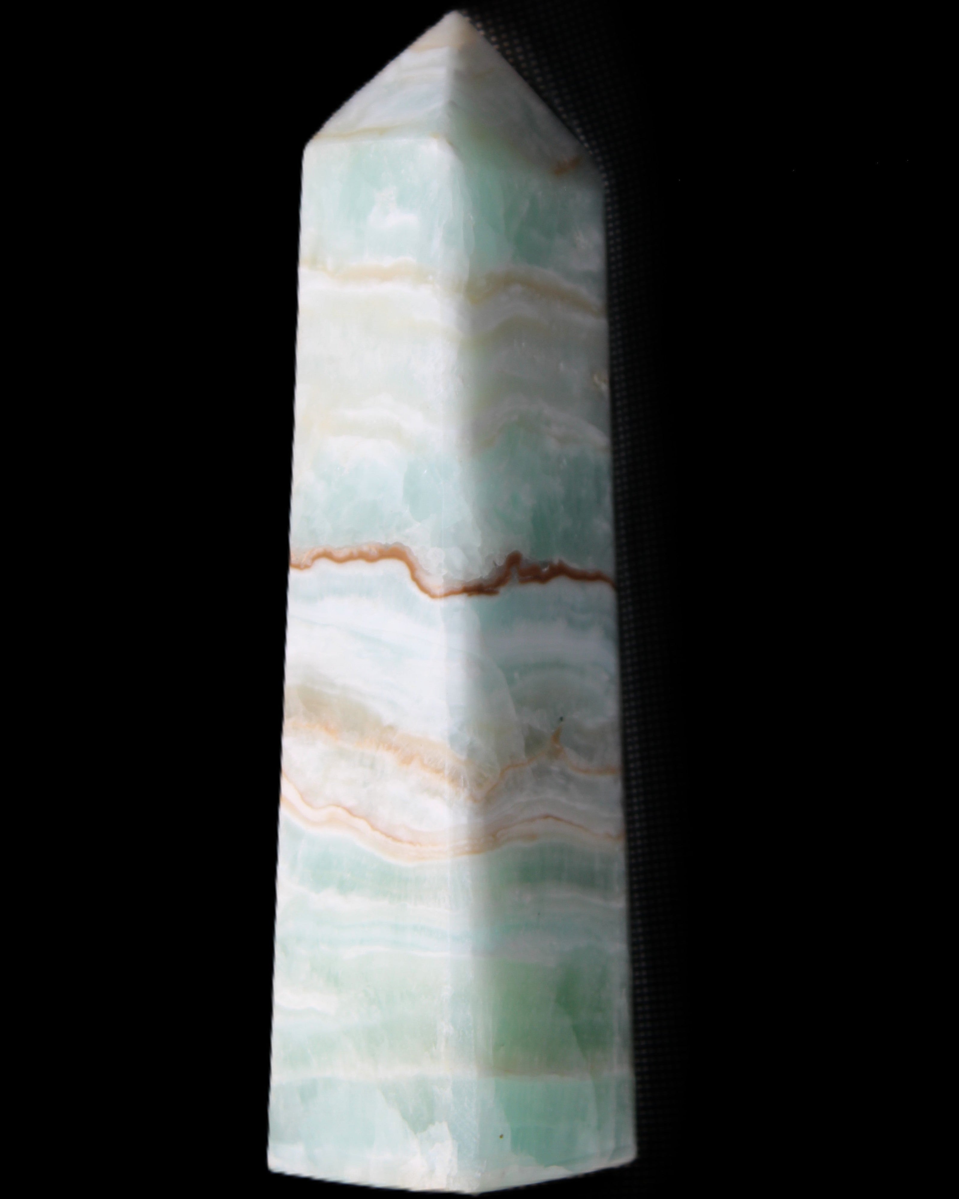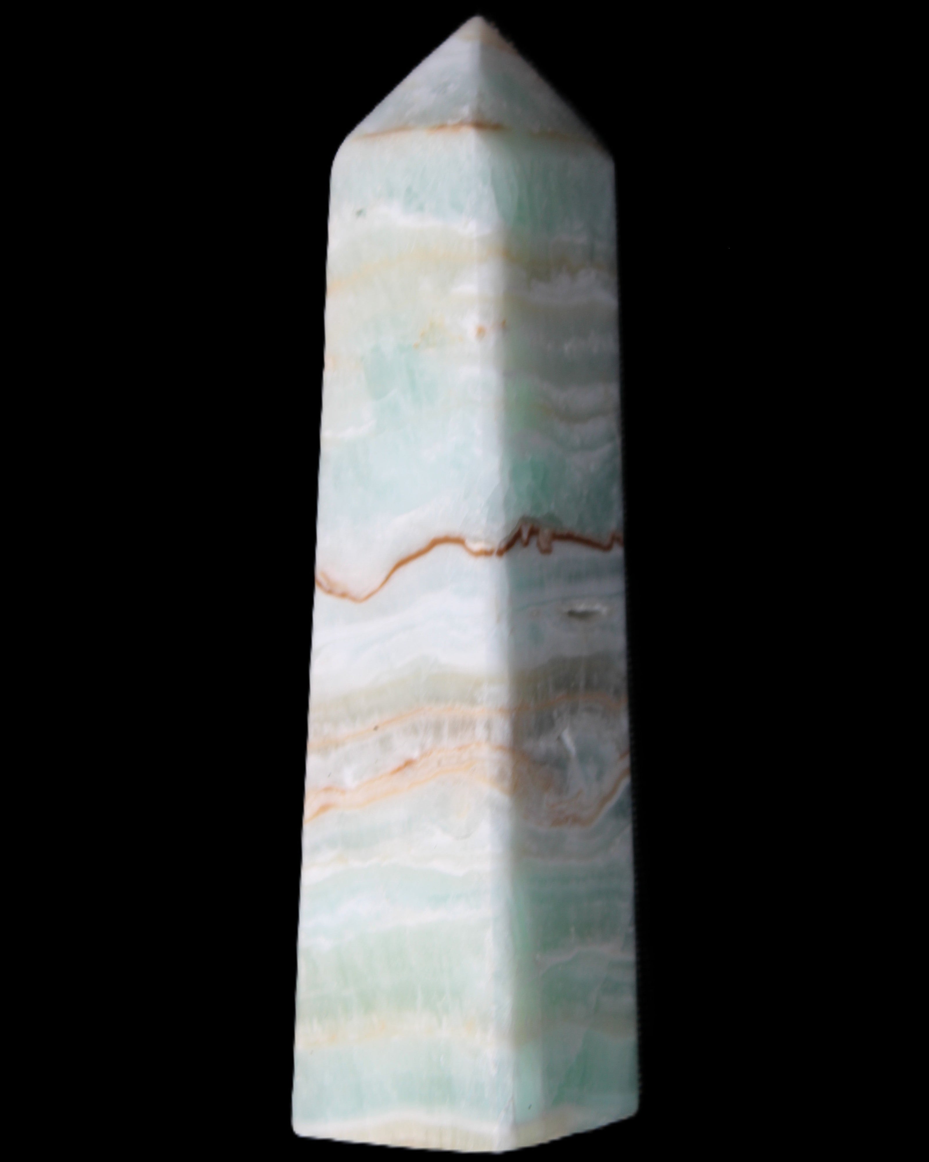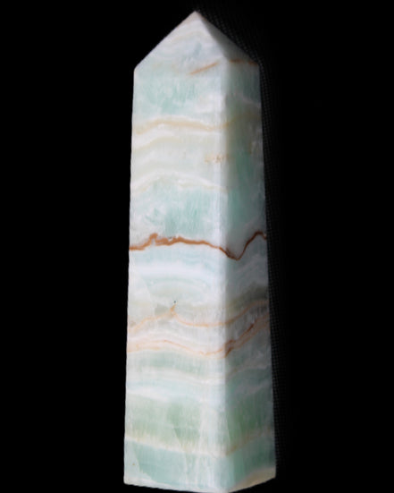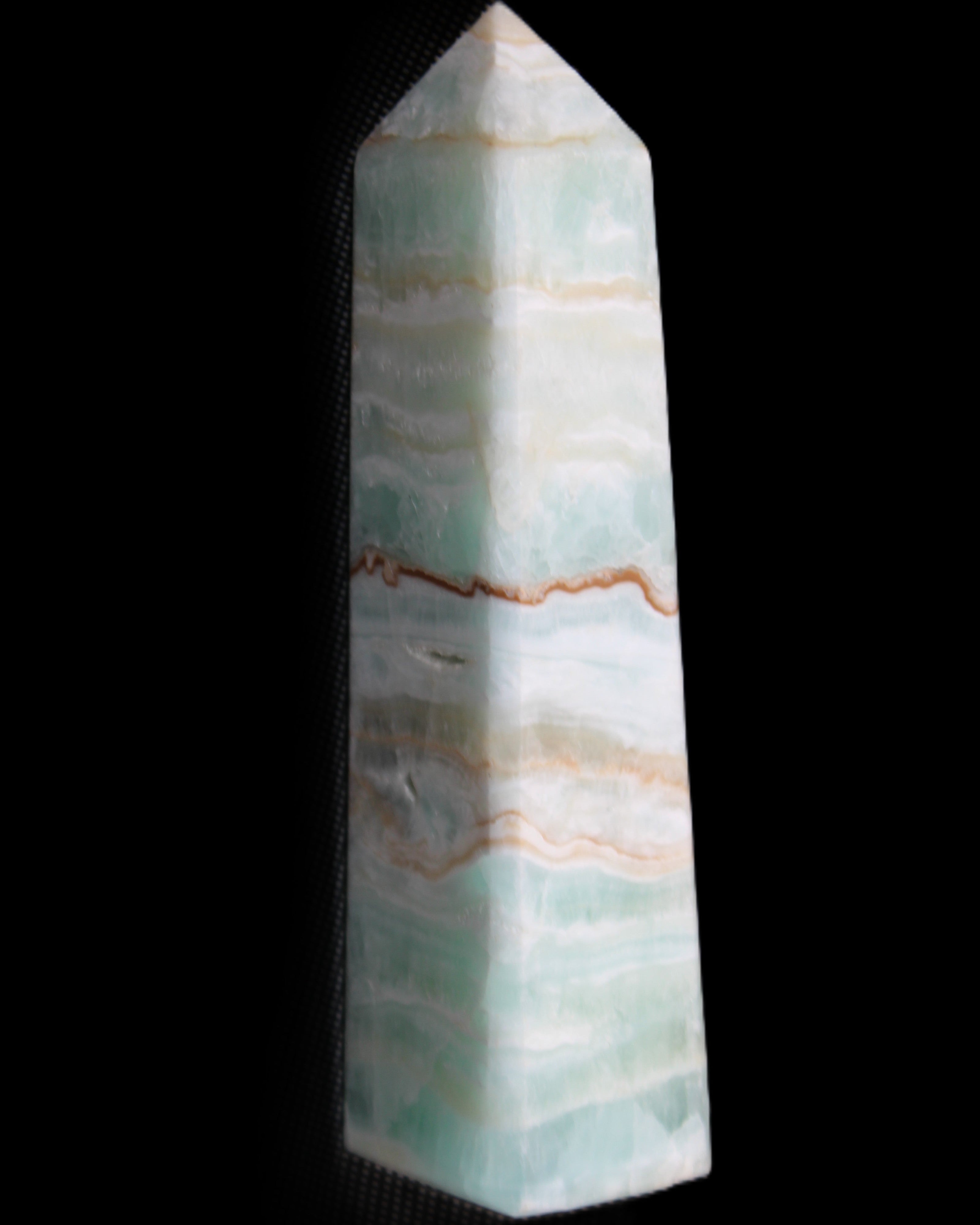 This Pistachio calcite obelisk 132mm weighs 304g. Pistachio is a rarer variety of Caribbean Calcite and is actually Aragonite. It is found in Pakistan.