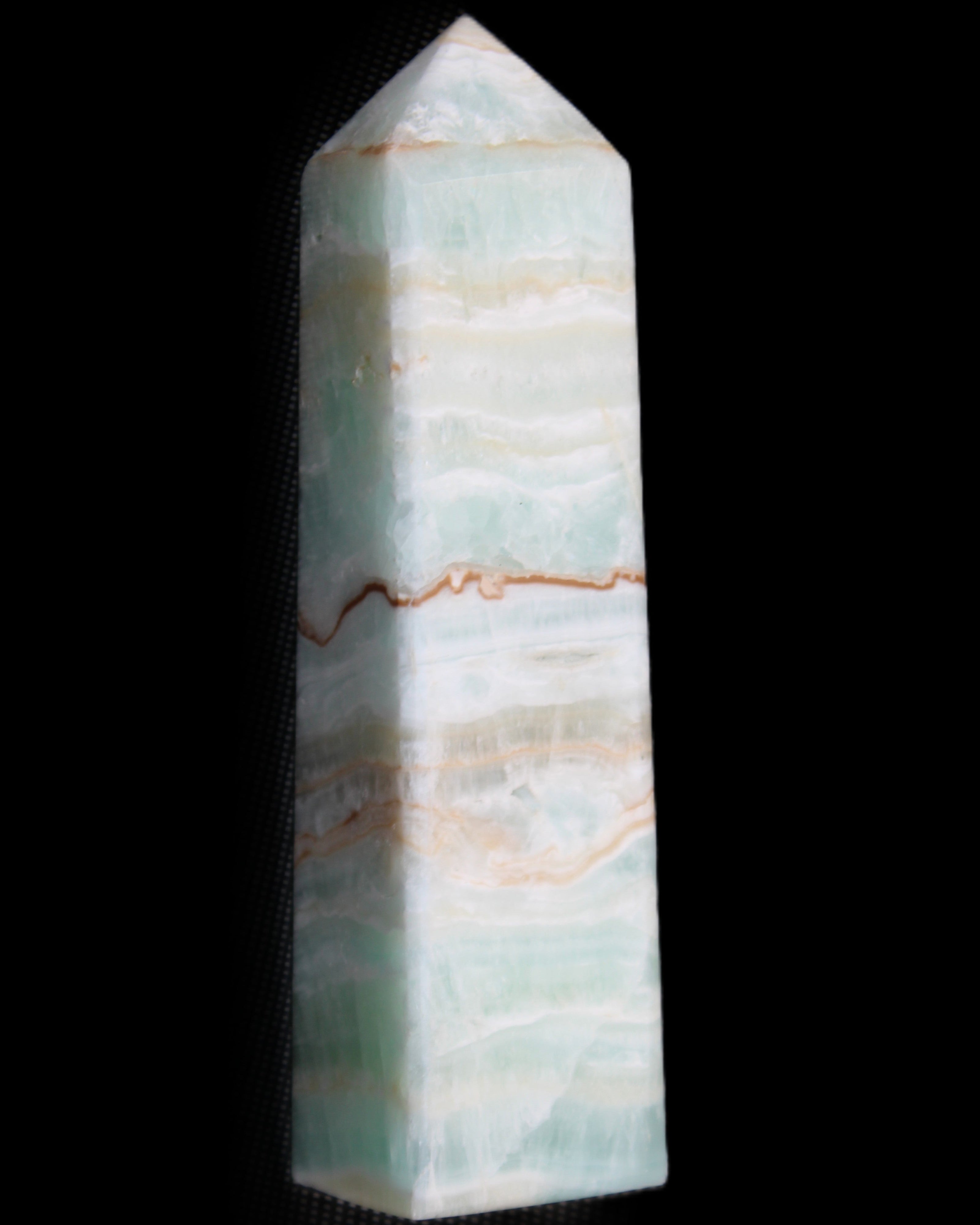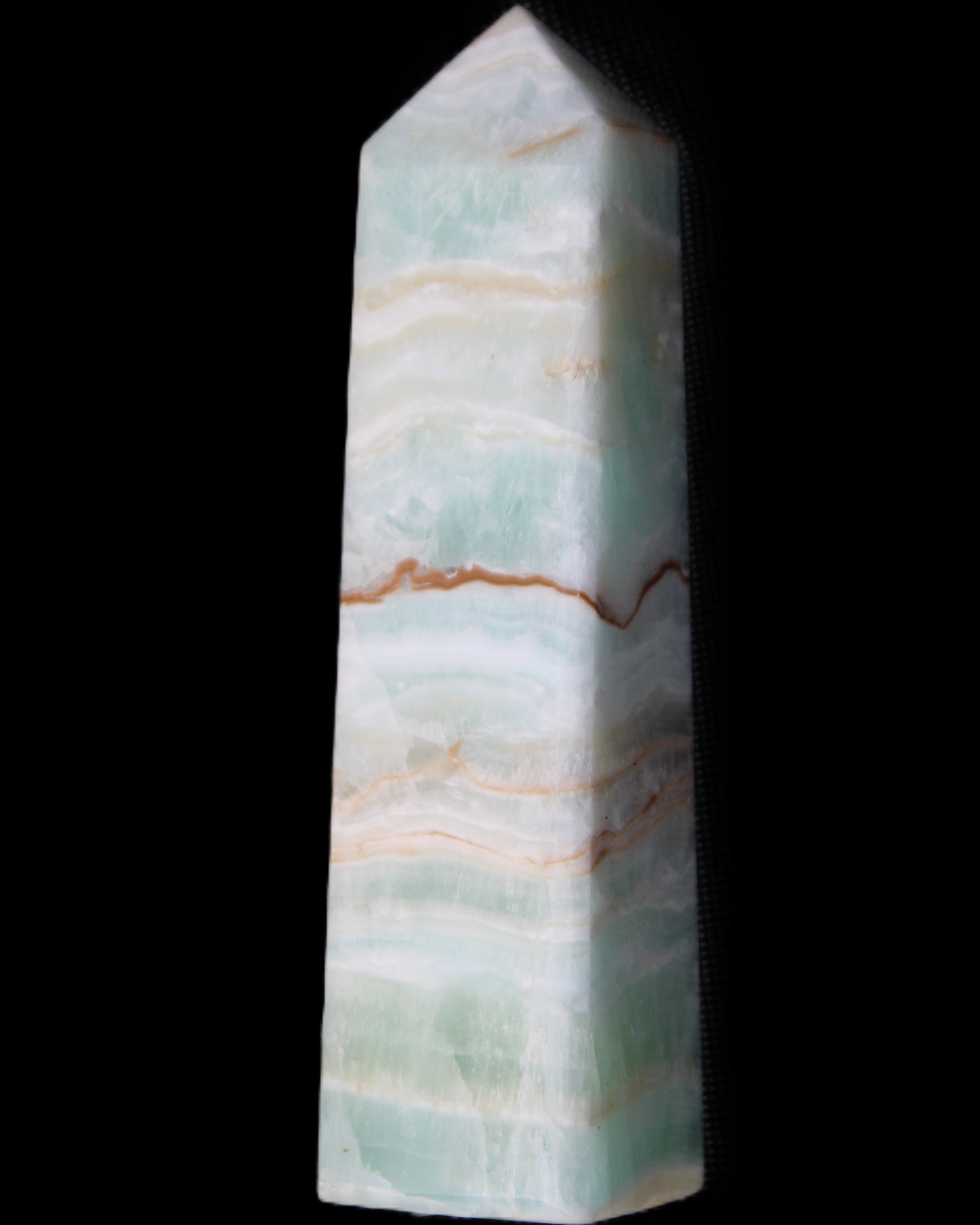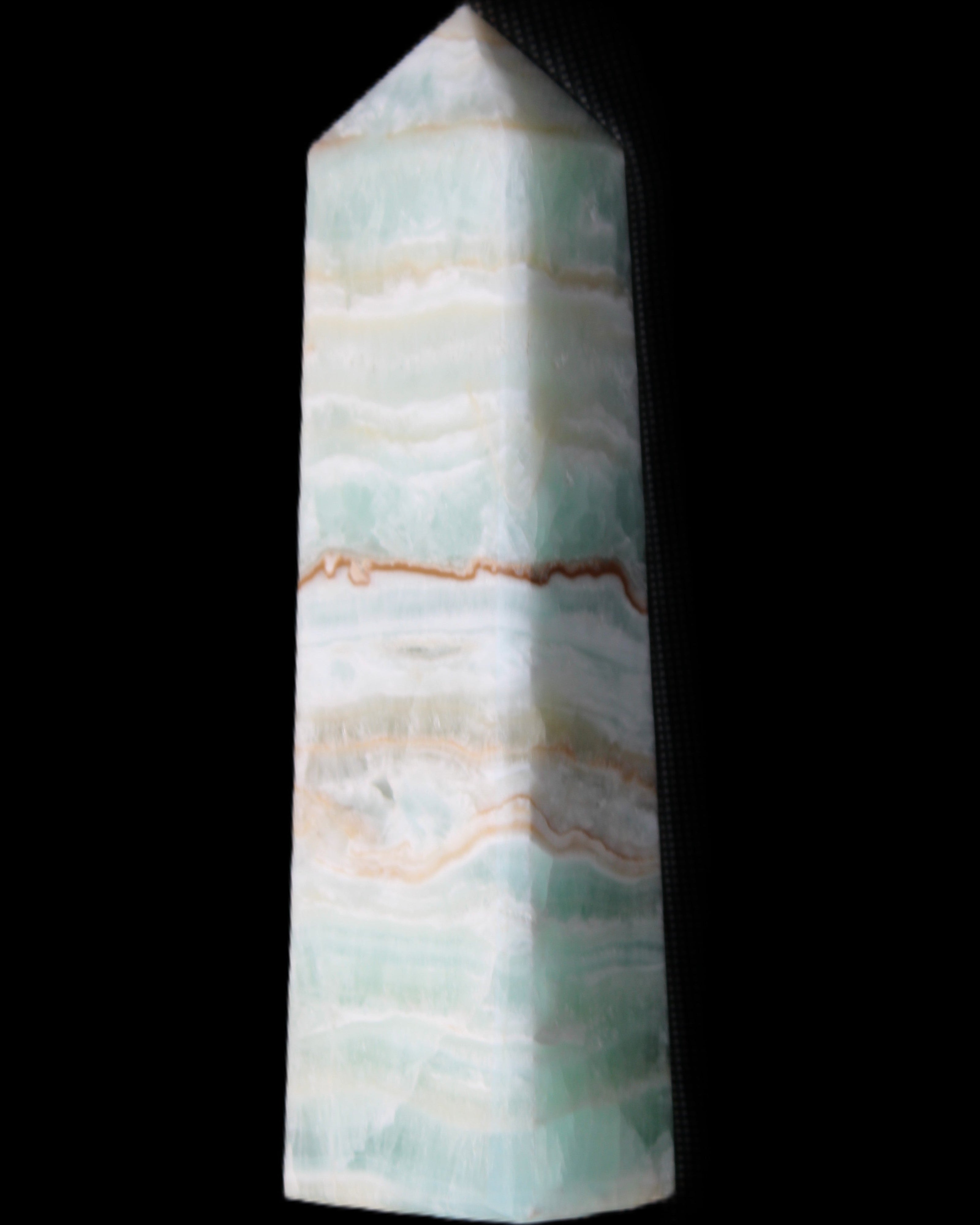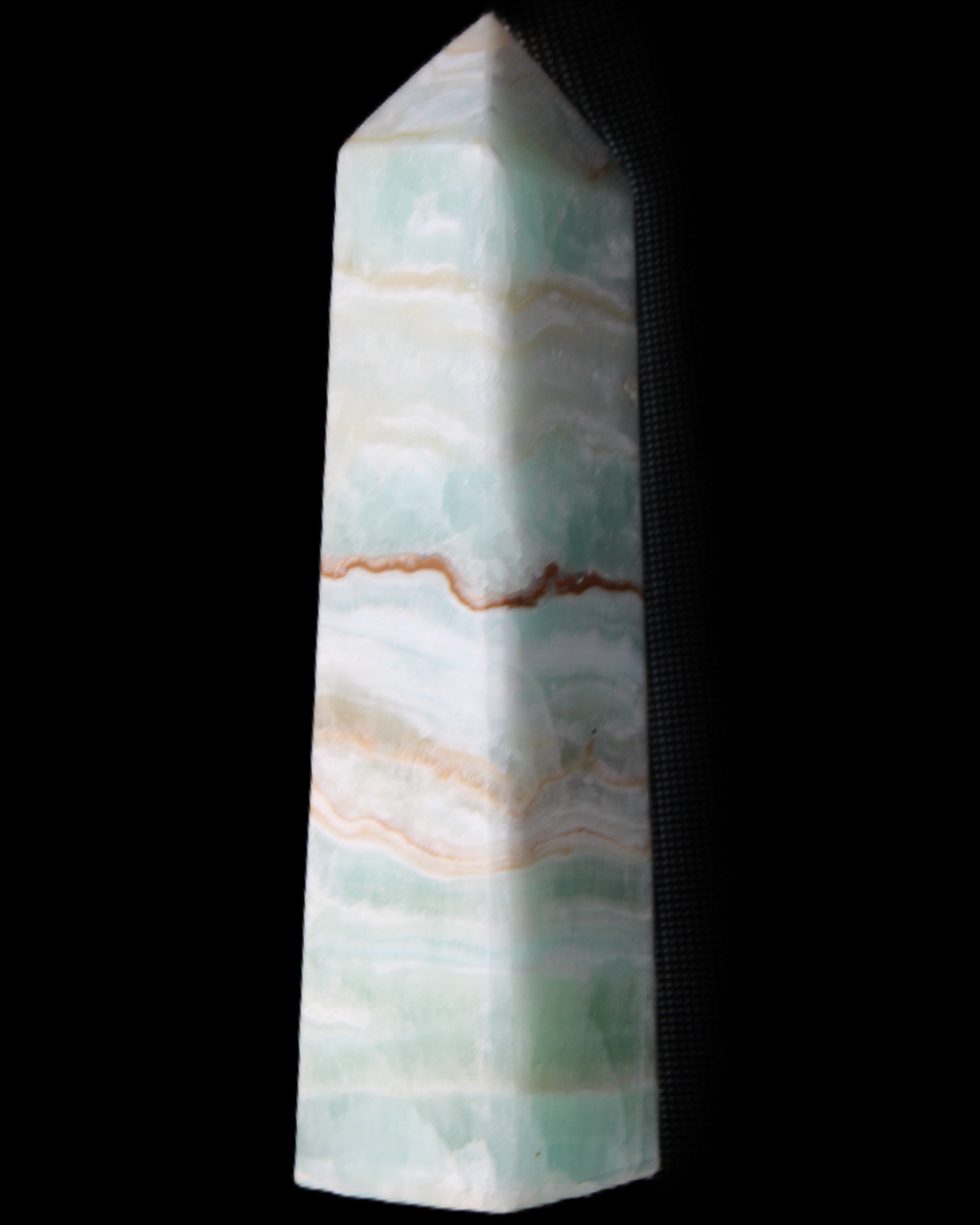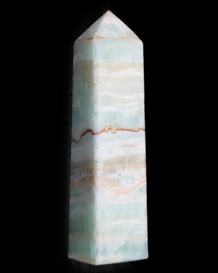 This Pistachio calcite obelisk 132mm weighs 304g. Pistachio is a rarer variety of Caribbean Calcite and is actually Aragonite. It is found in Pakistan.