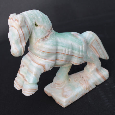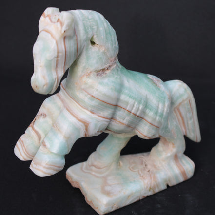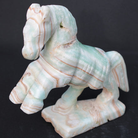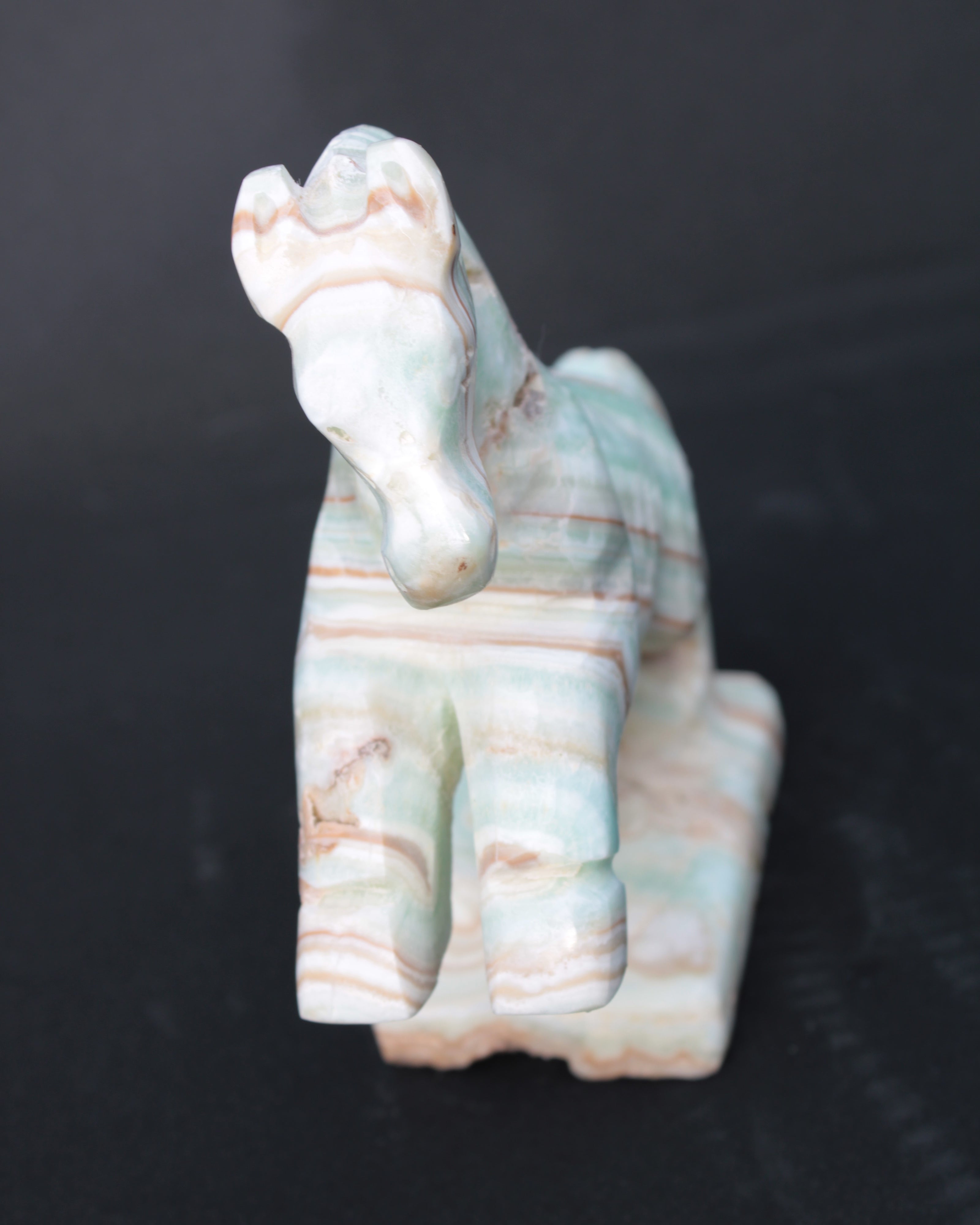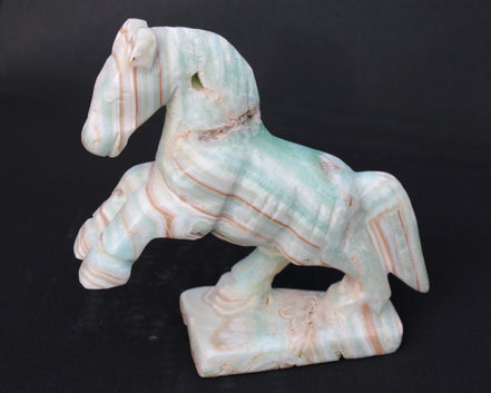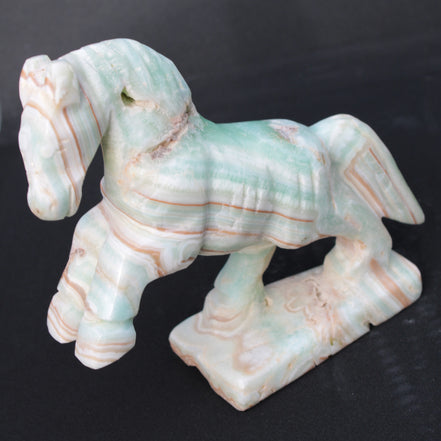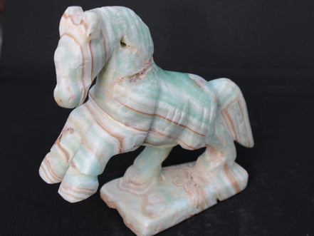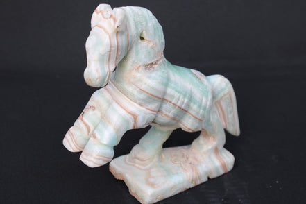 This large Pistachio Caribbean Calcite hand-carved prancing horse 165*55*156mm weighs 947g. It has been beautifully hand-carved by Lawrence Riaz in the Pistachio variety of Caribbean Calcite. Aragonite is good for self-confidence. It is a powerful stone with strong energies for chakra activation and alignment. It restores balance and raises vibrations to a higher spiritual level.