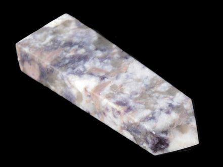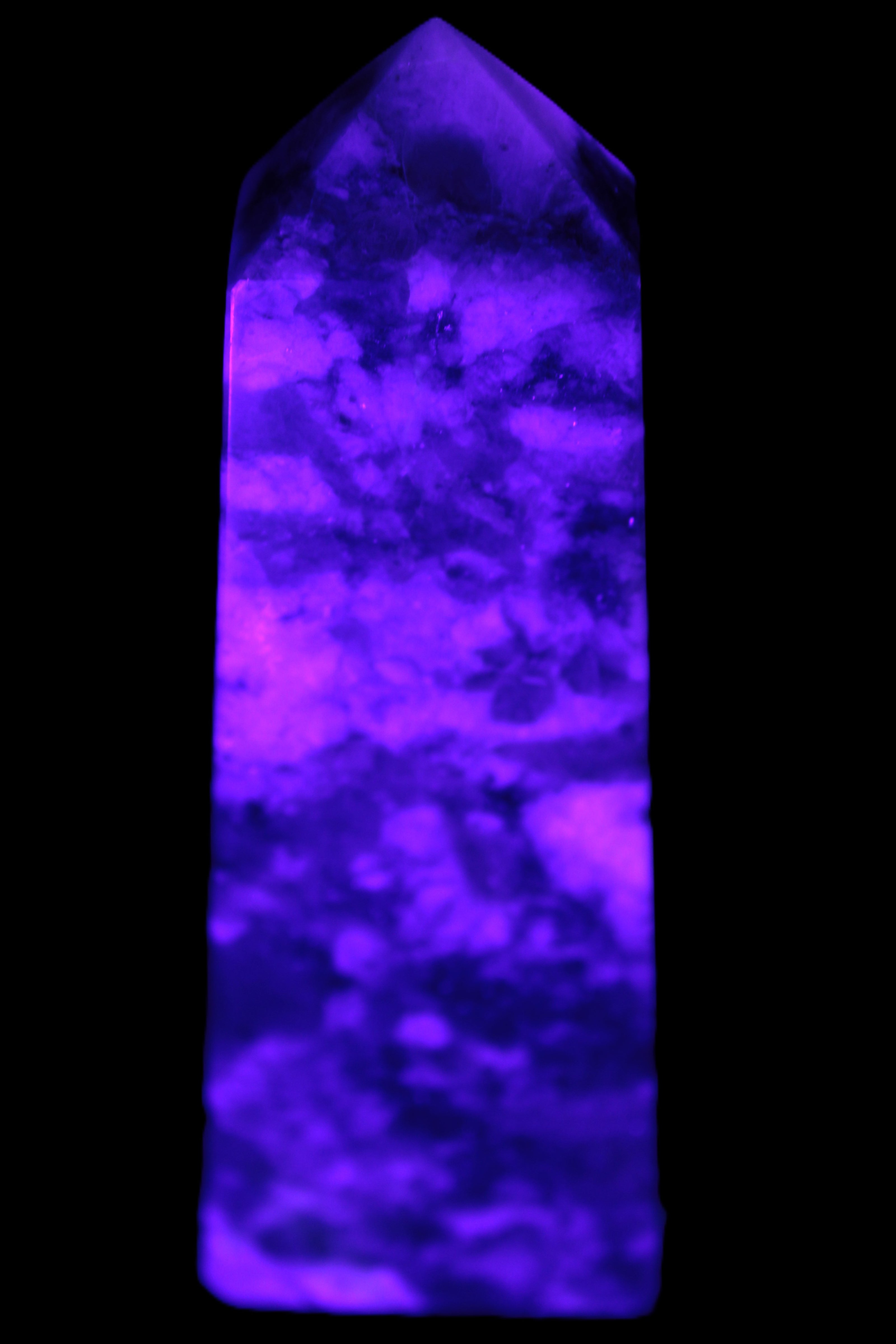 I have called this item Plum Blossom Tourmaline Quartz obelisk because of the striking Elbaite Tourmaline colours and patterns. These in their Quartz setting make me think of flower blossoms and plums, so Plum Blossom.  This is a beautiful stone in natural light and UV. It is UV reactive, with greens appearing under shorter wavelength UV (365 nm). It is loaded with Pink Tourmaline and Mica, including Lepidolite. The source rock seems to be a lithium rich pegmatite, perhaps from Brazil or Pakistan.