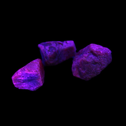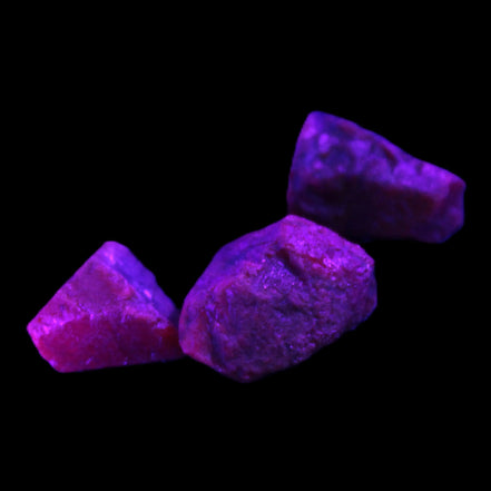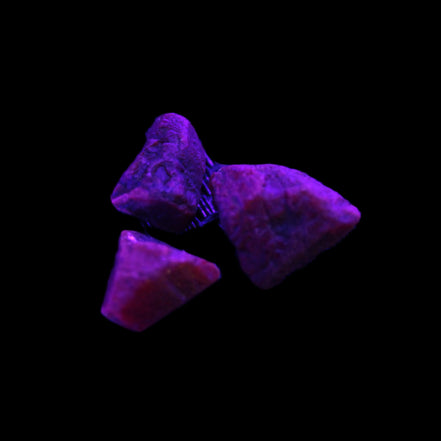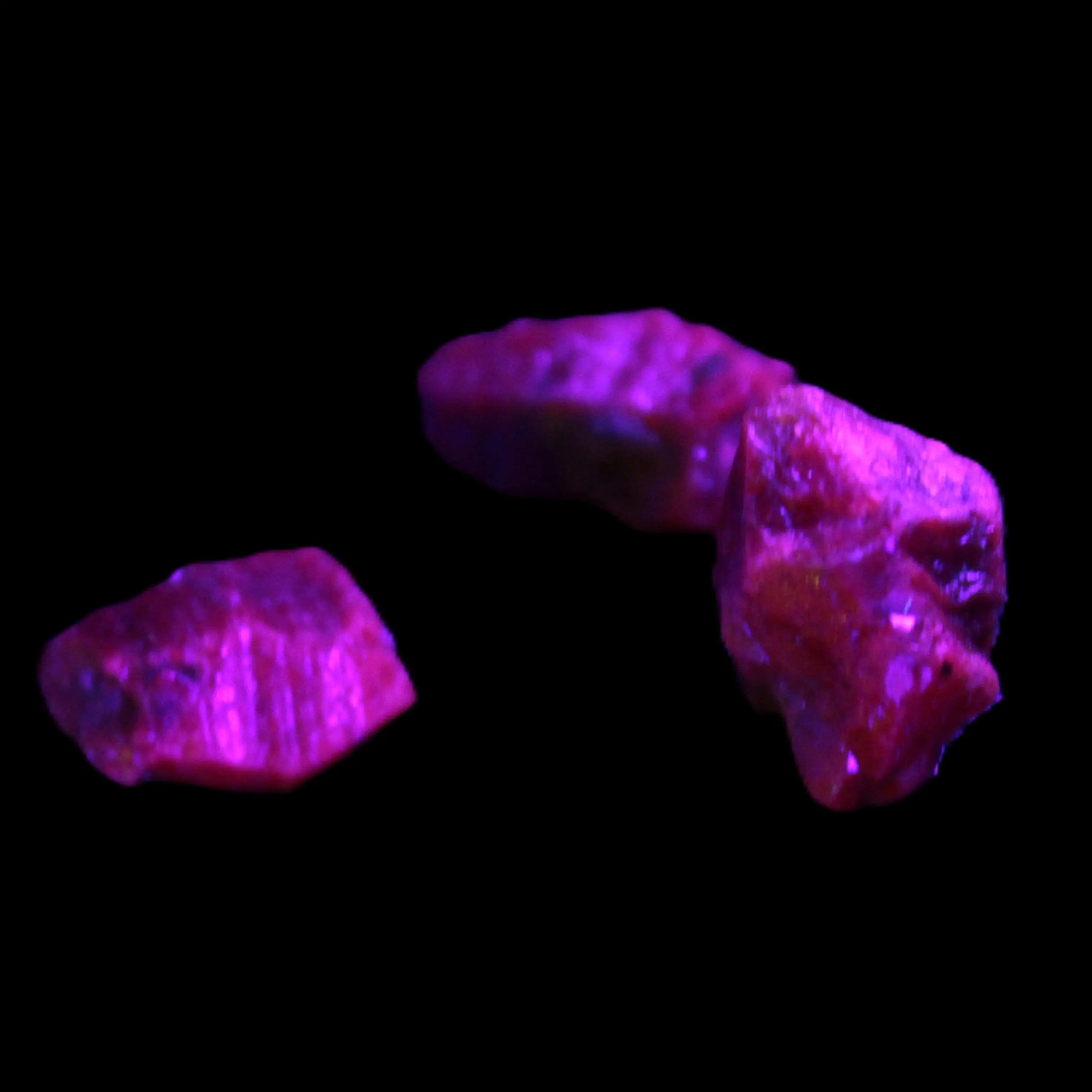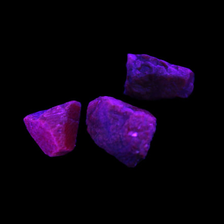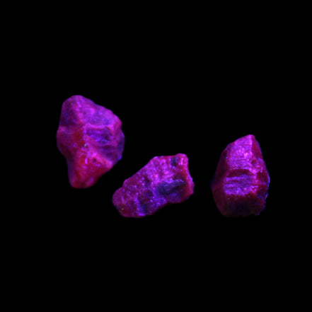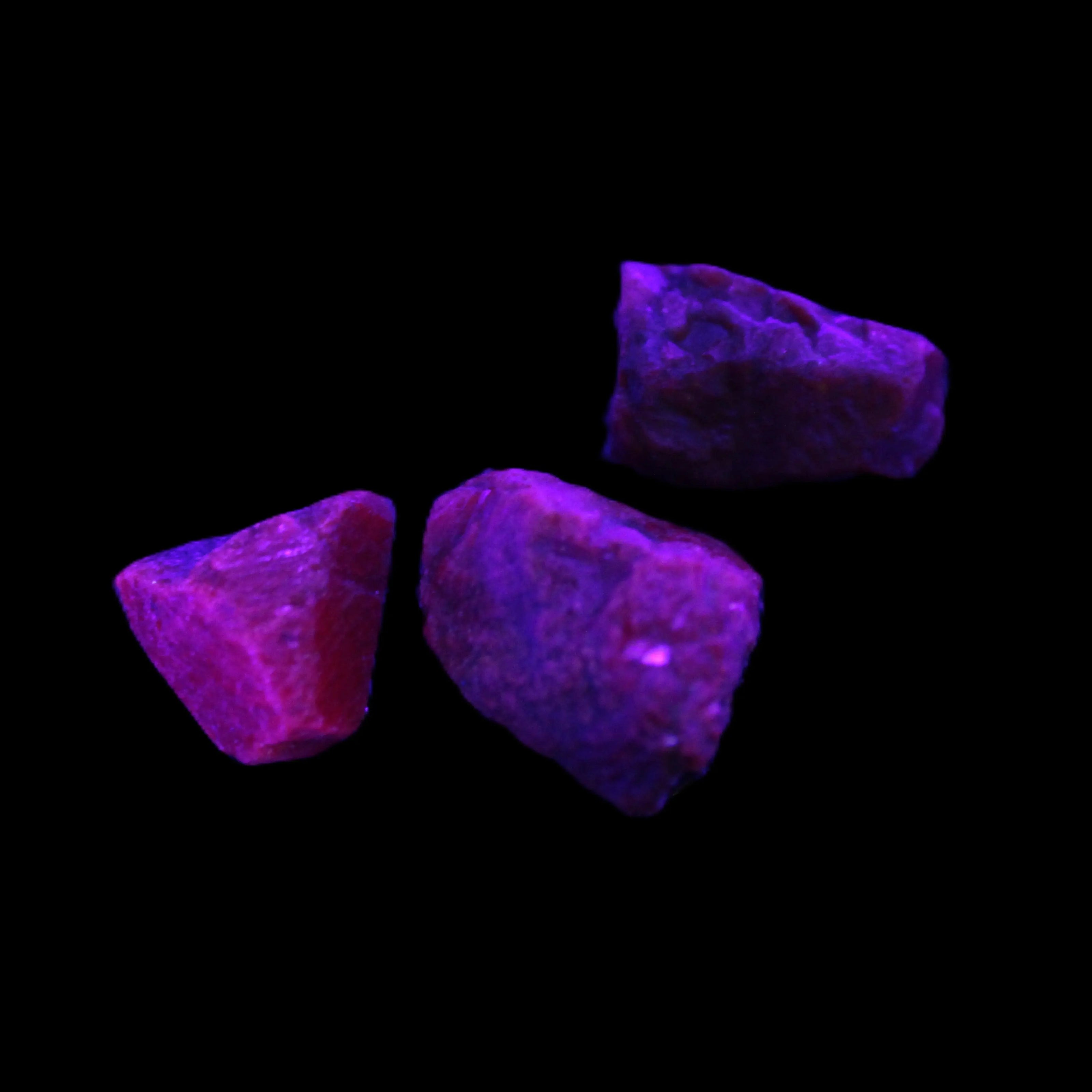 This item is a selection of Purple Red Corundum Ruby 3 crystals 1-2g. Ruby has been revered in many cultures throughout history. It is a widespread talisman for passion, protection and prosperity. It symbolises the Sun and its glowing hue suggest an inextinguishable flame within the stone. Natural ruby crystals such as these react strongly to UV light and glow an even brighter red.