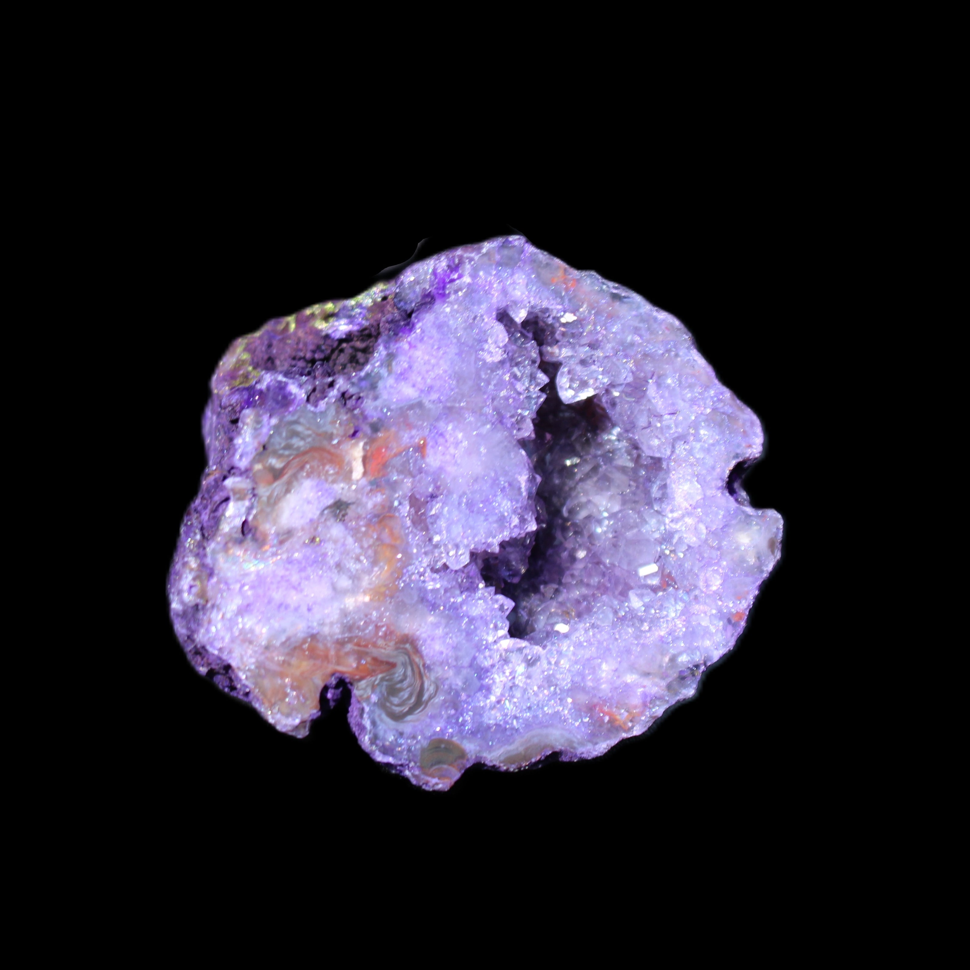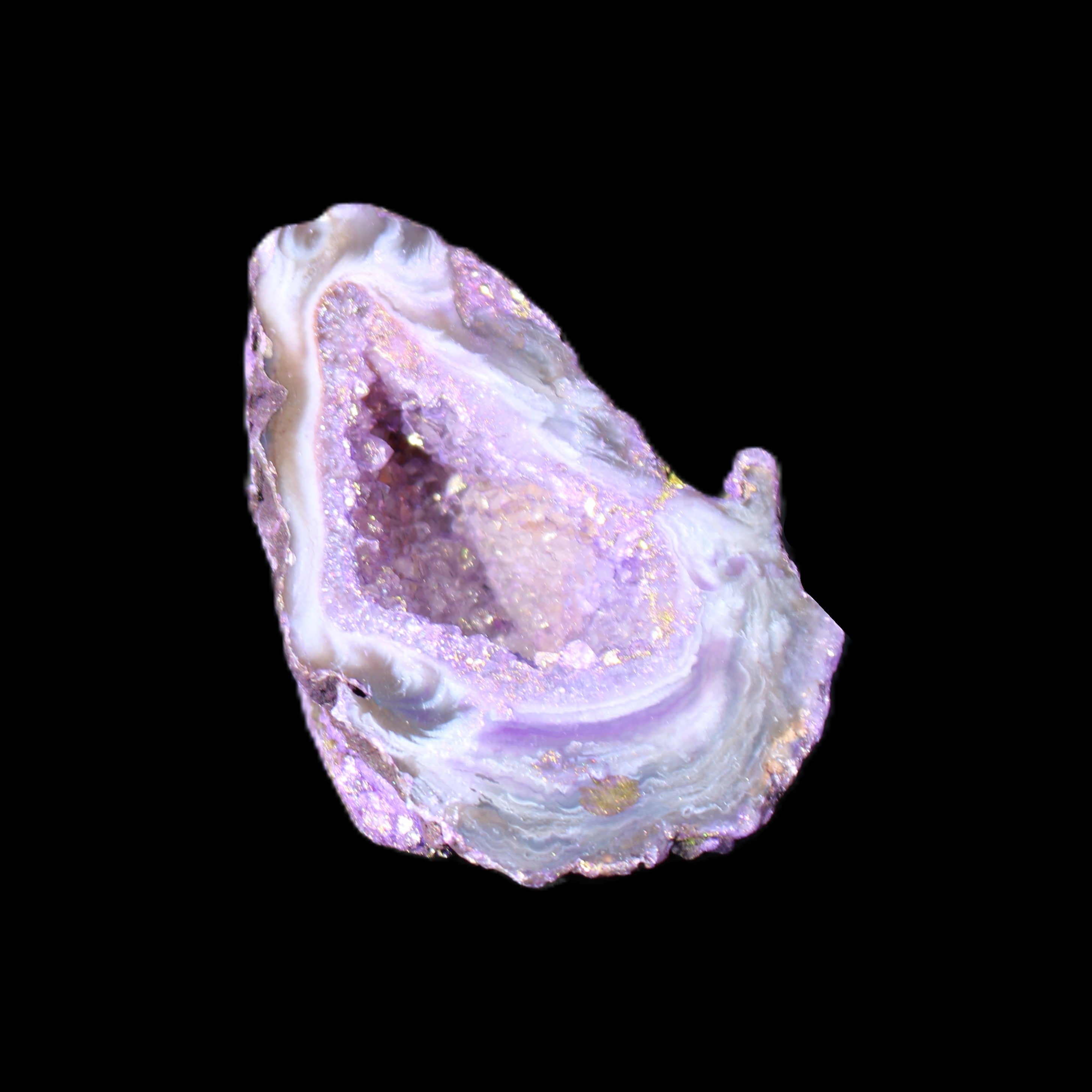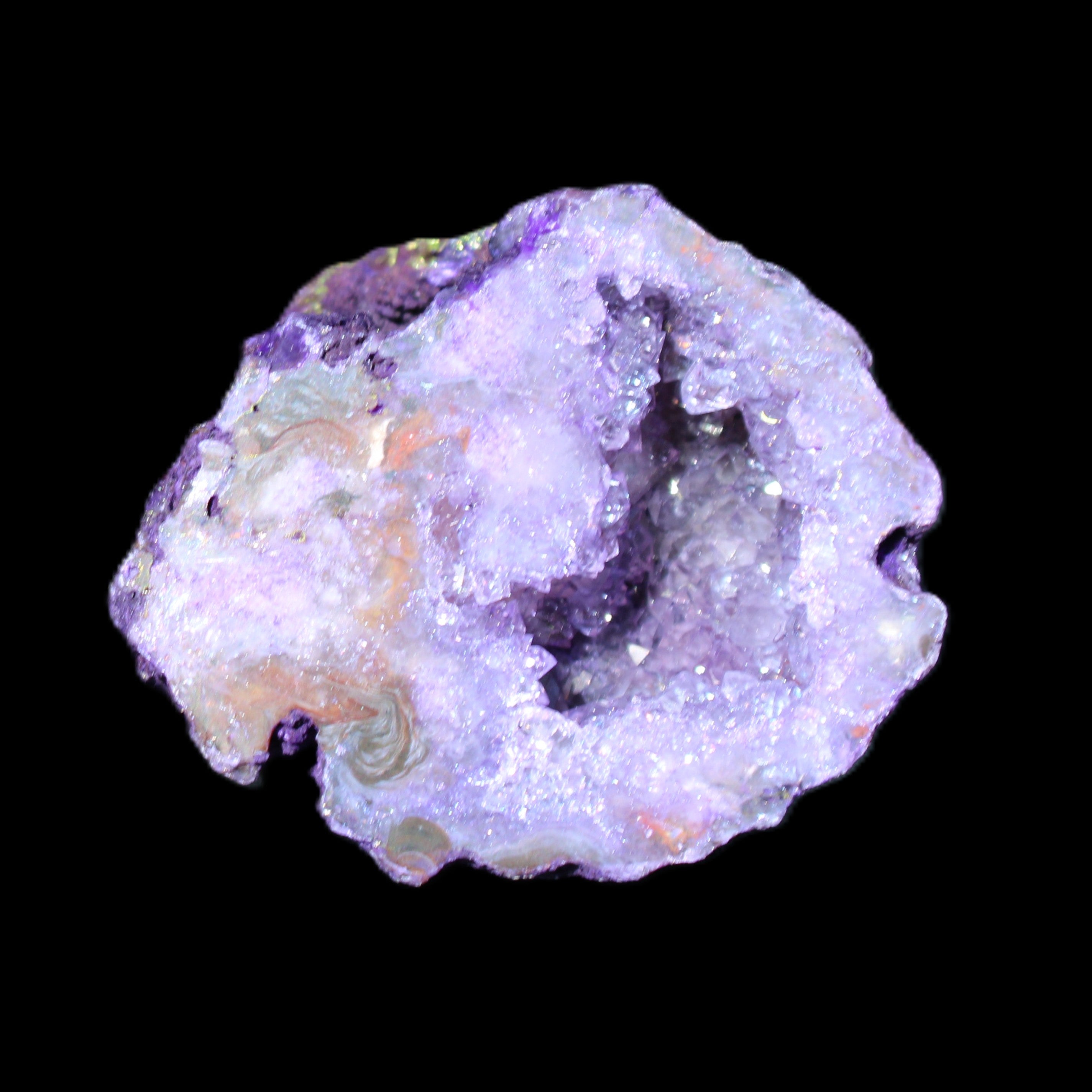 Geodes grow within a host formation from solution. When opened there is a hollow surrounded by crystals pointing inward. Agate and other members of the quartz family commonly form geodes. A geode amplifies softens and diffuses the healing energy of the crystal, letting it flow out slowly. This strengthened and softened healing energy is good for protection and spiritual growth. This is also useful for addressing addictive or overindulgent behaviour.