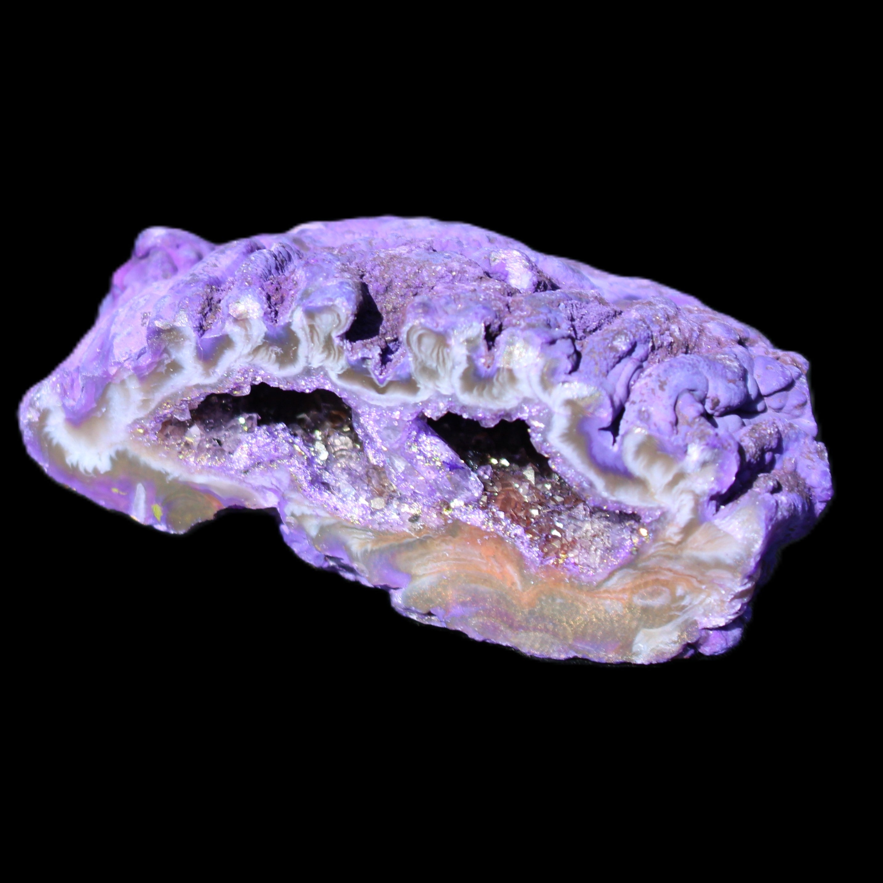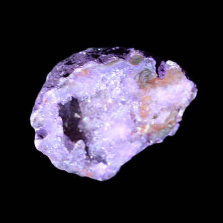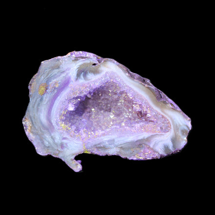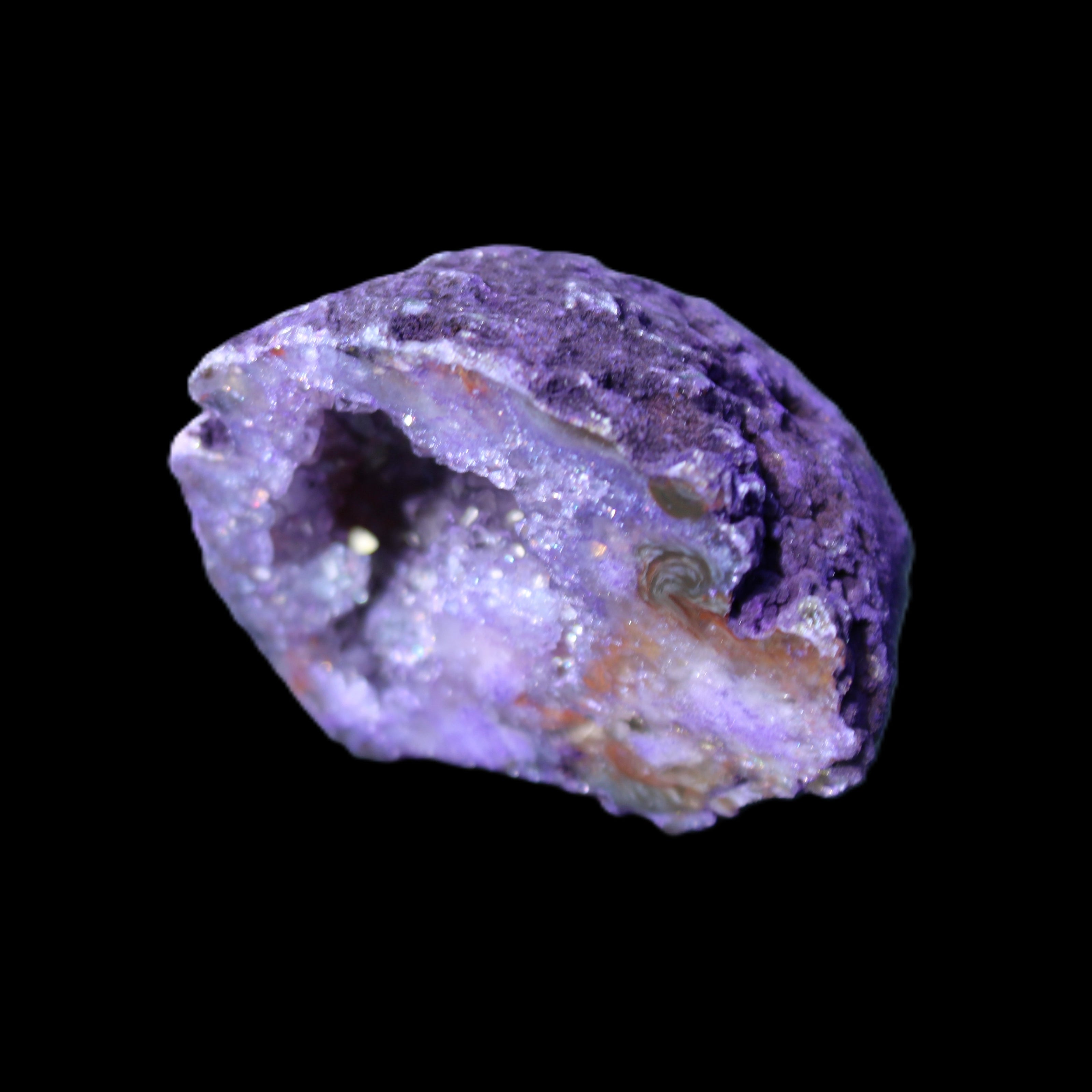 Geodes grow within a host formation from solution. When opened there is a hollow surrounded by crystals pointing inward. Agate and other members of the quartz family commonly form geodes. A geode amplifies softens and diffuses the healing energy of the crystal, letting it flow out slowly. This strengthened and softened healing energy is good for protection and spiritual growth. This is also useful for addressing addictive or overindulgent behaviour.