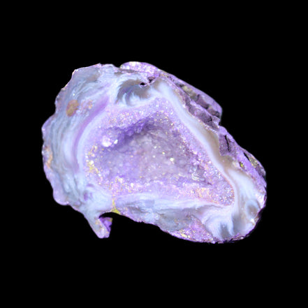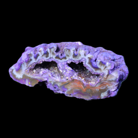 This colourful Purplish Electroplated Agate Quartz geodes range weighs 38-69g. These sparkling natural geodes have been electroplated with a thin metal coating to give them a flashy purple and gold look.