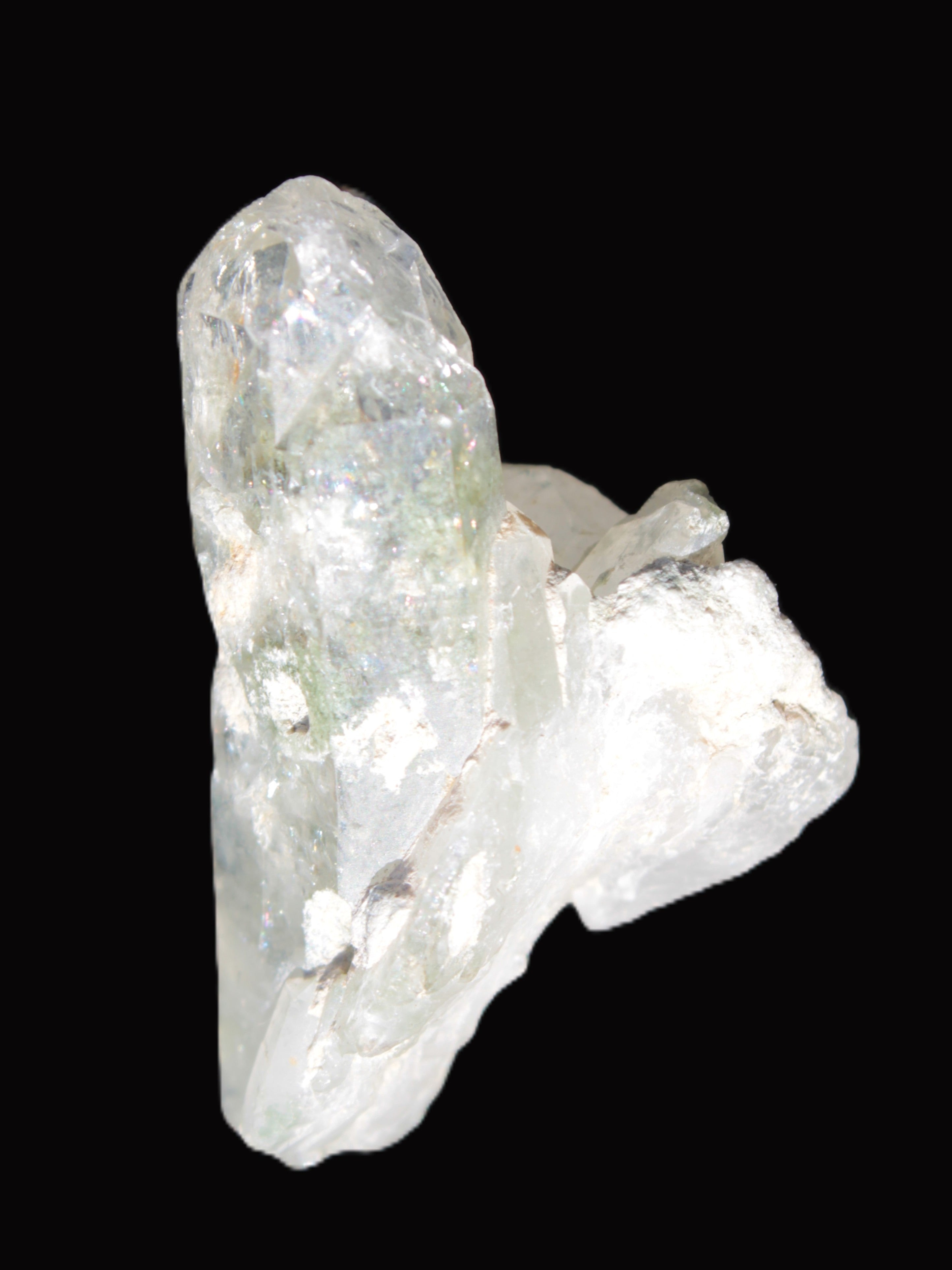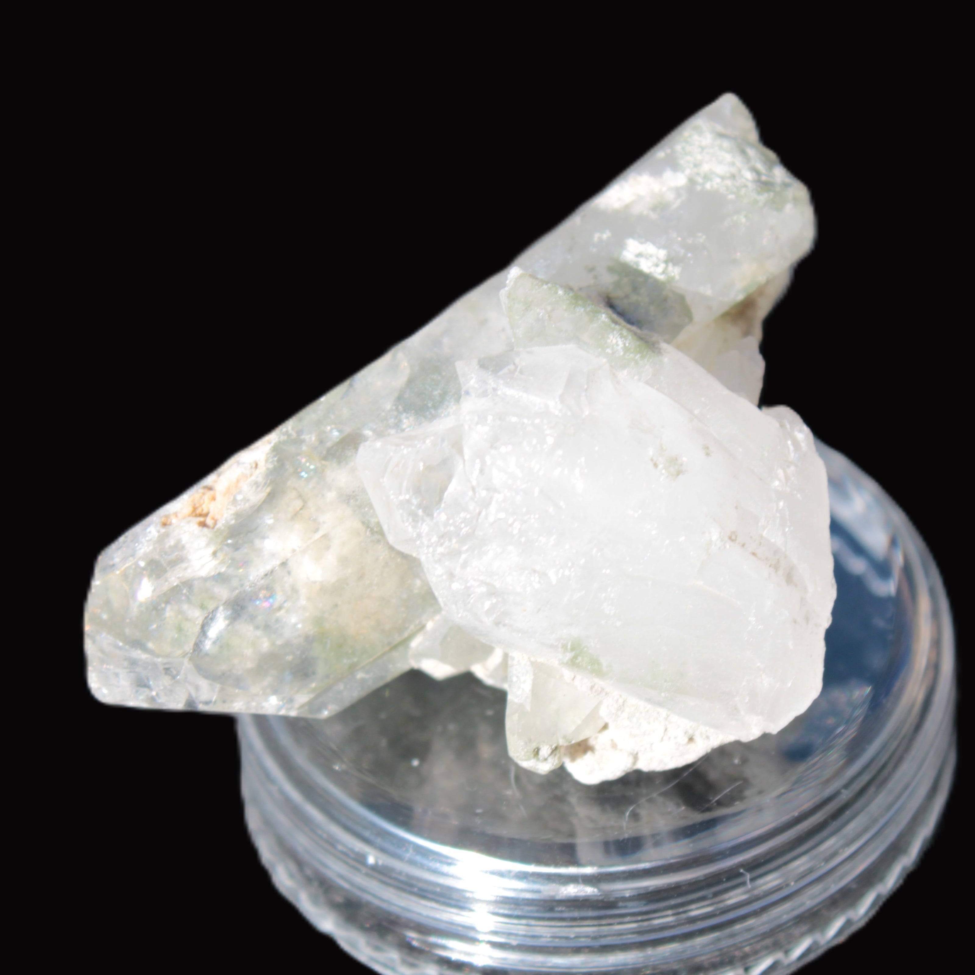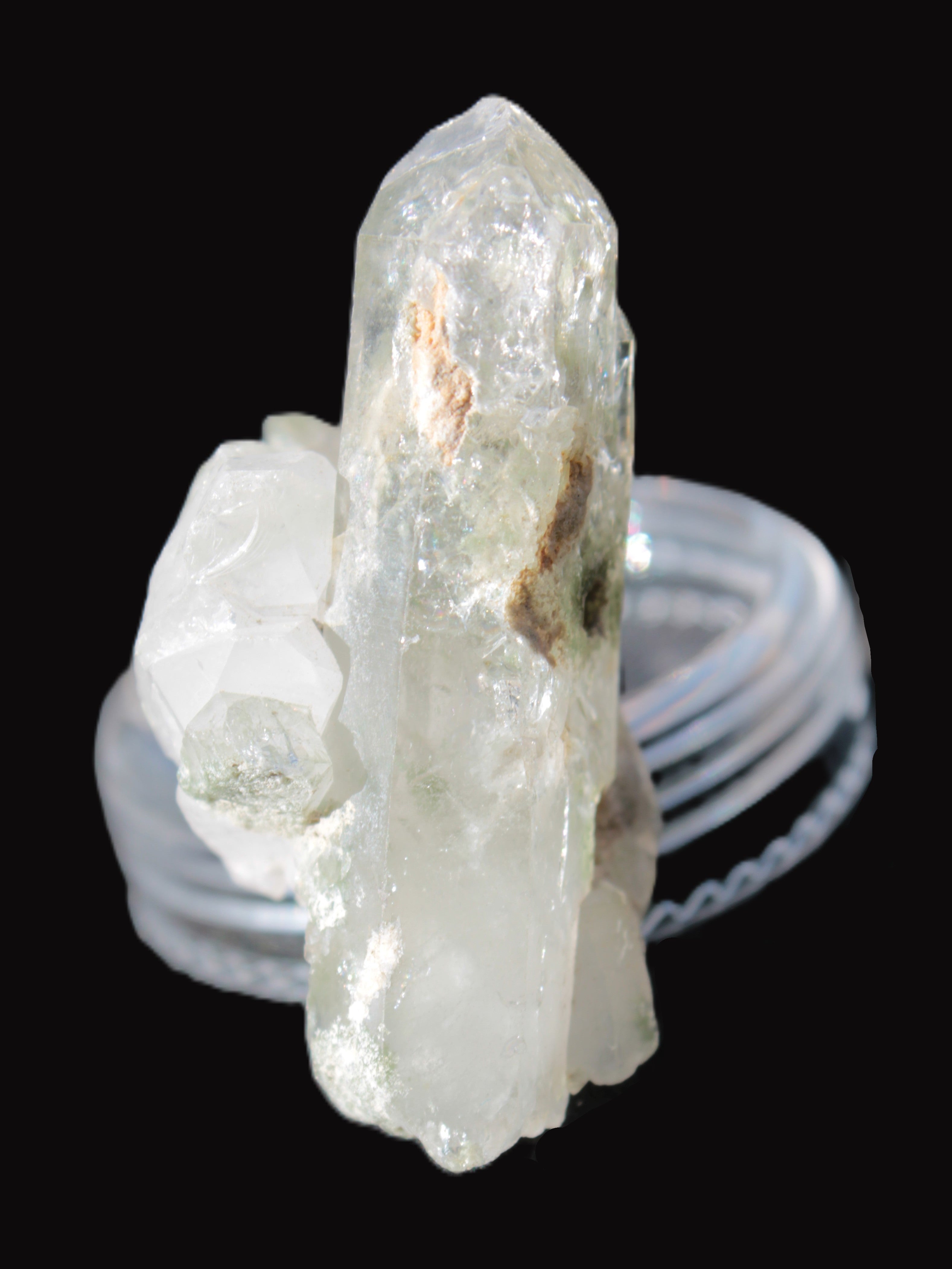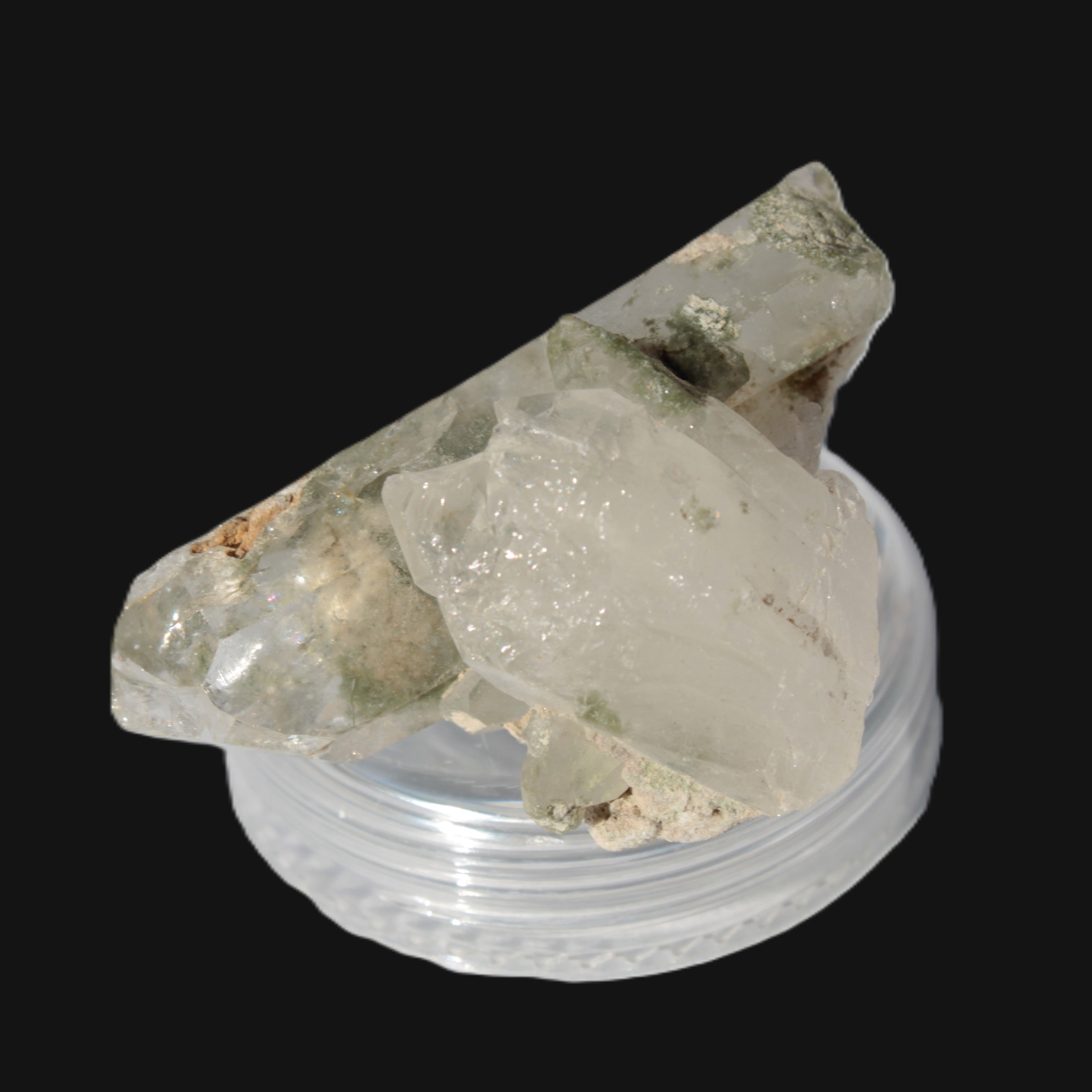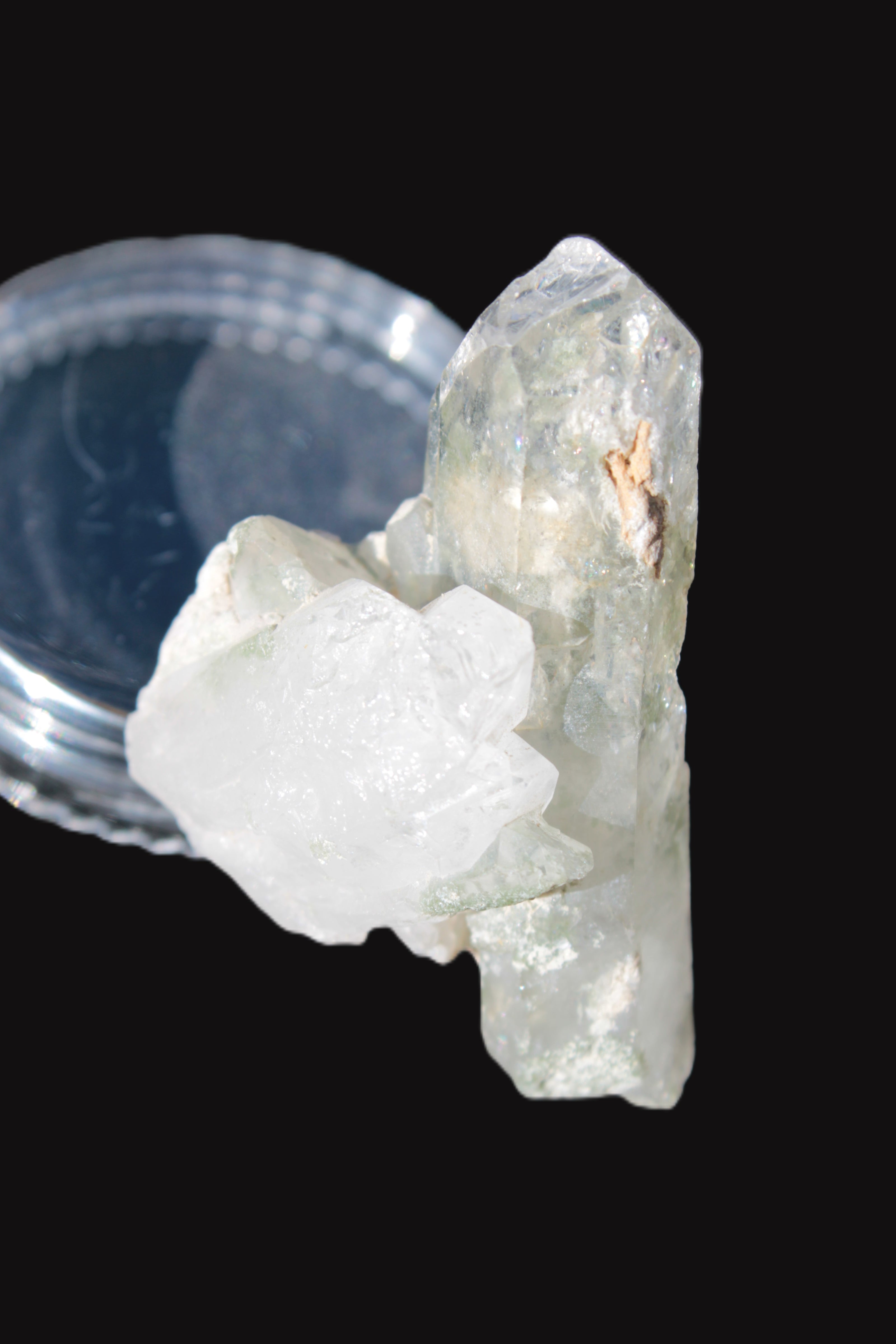 This is a complex crystal cluster Clear Quartz/Calcite formation. They are crossed. The Quartz crystal has a complex tip with windows and unusual faces and windows. The Chlorite accompanying the Clear Quartz amplifies its cleansing and purifying healing properties.