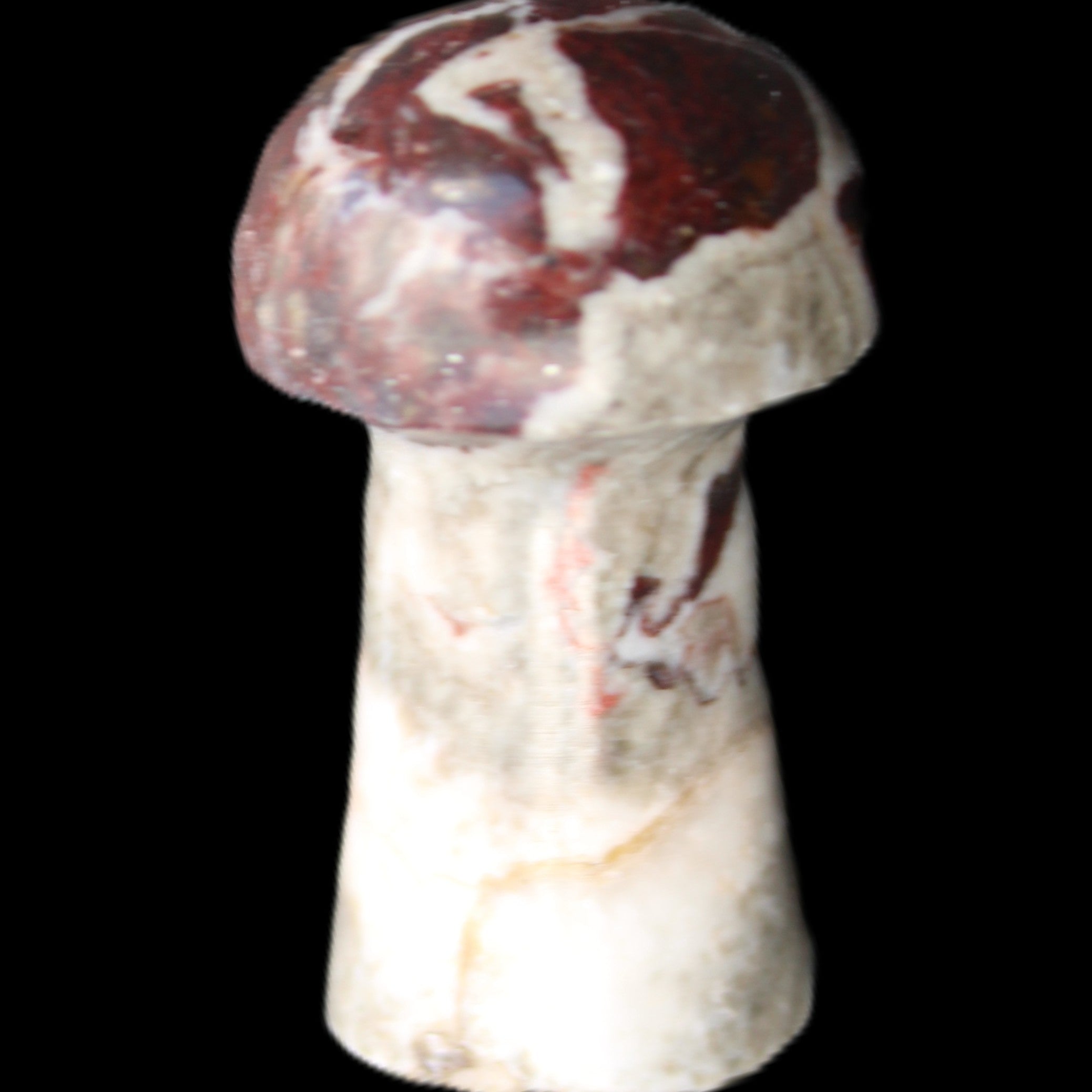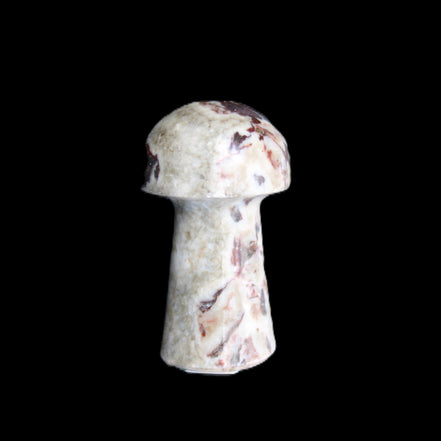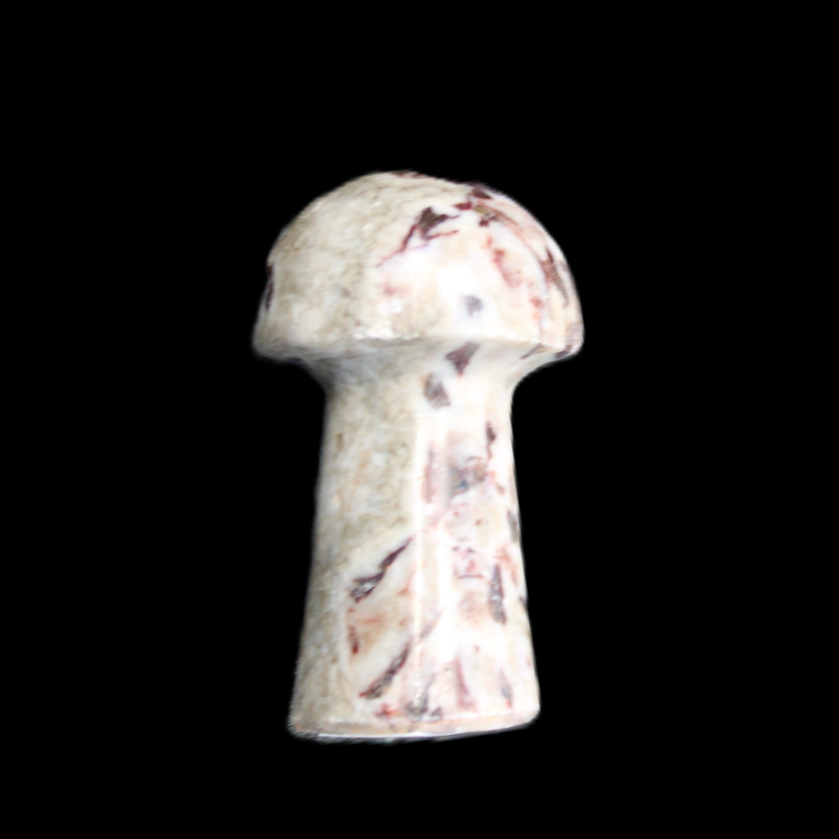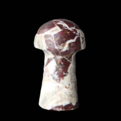 This Red and White Jasper Marble mushroom 30-36mm selection weighs 14-19g. This stone is sometimes called Red and White Jasper. The term jasper is most usually used for silicate minerals. This stone however is a marble. This mineral is metamorphised limestone, originally formed from the preserved remains of organic life. Why this stone is called jasper is its unusual striking patterning and color, found in Pakistan.