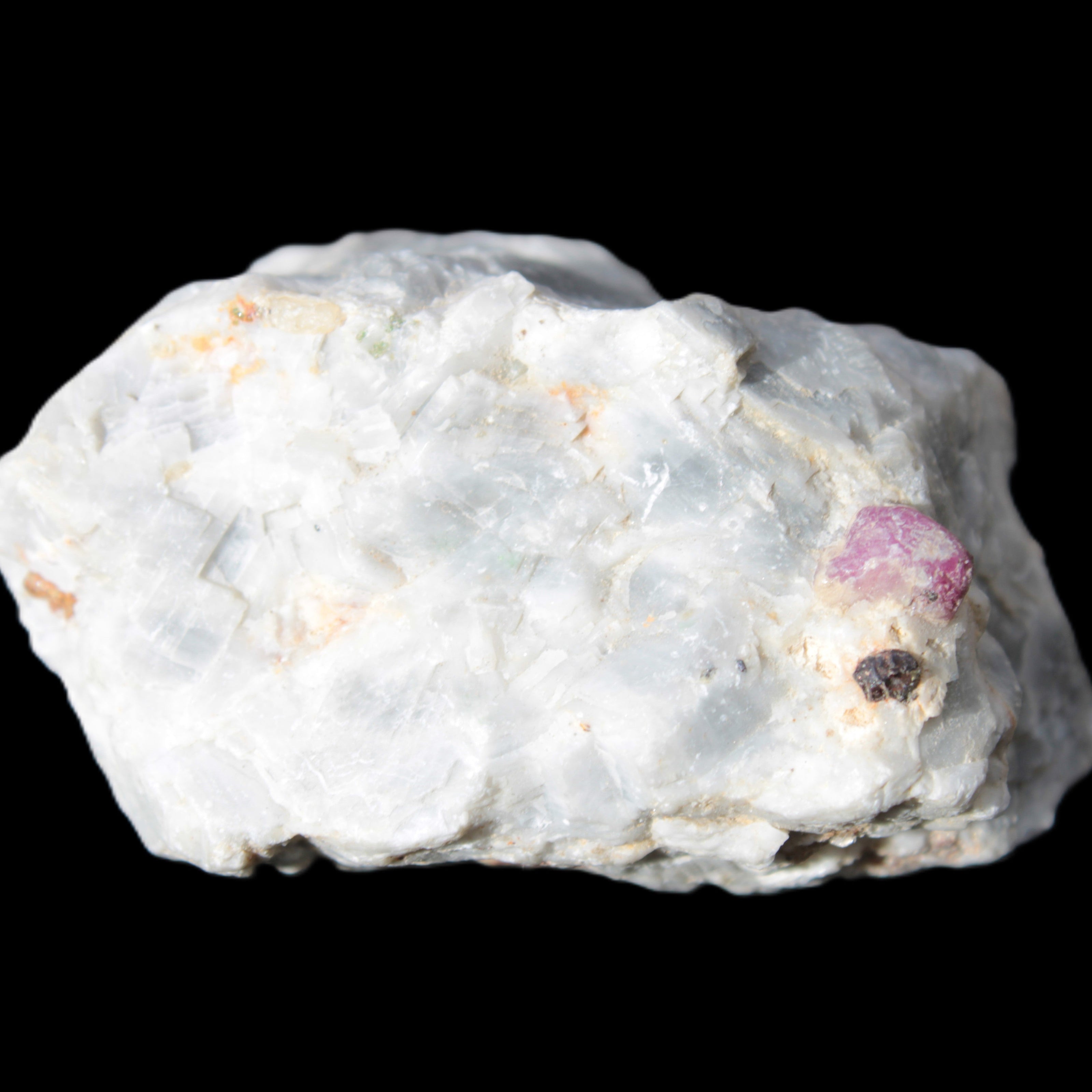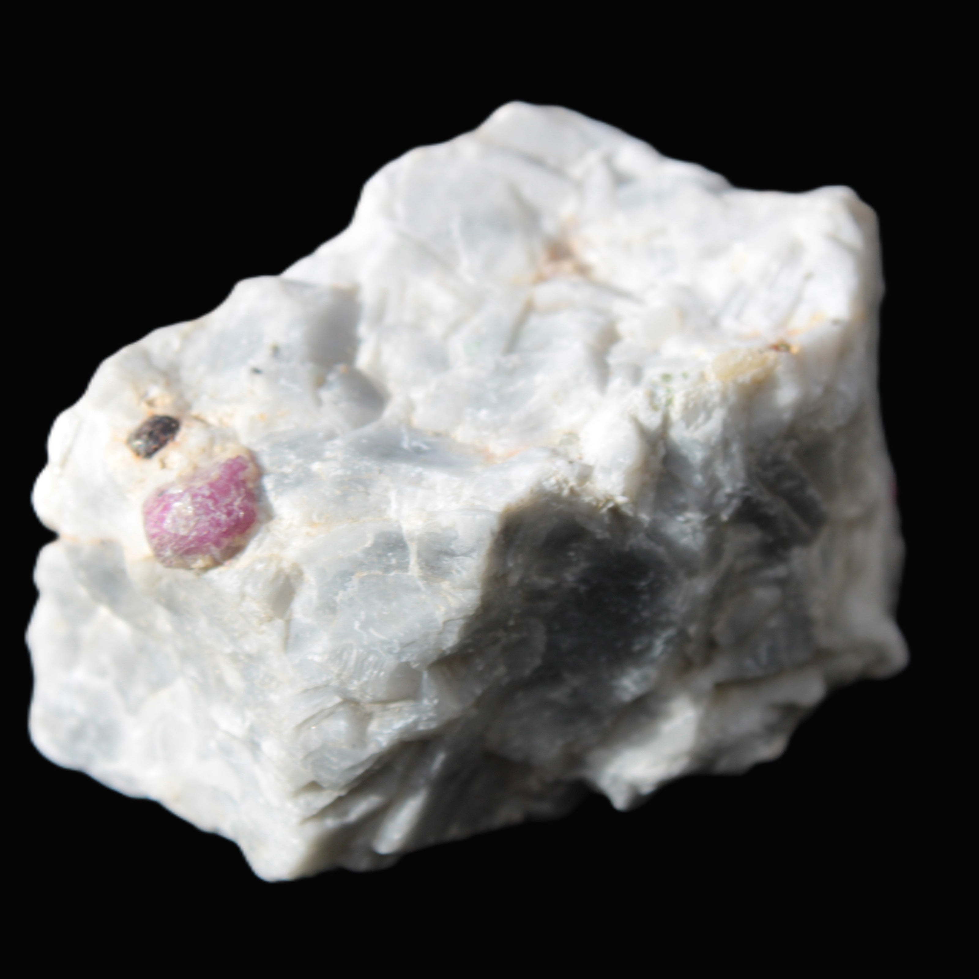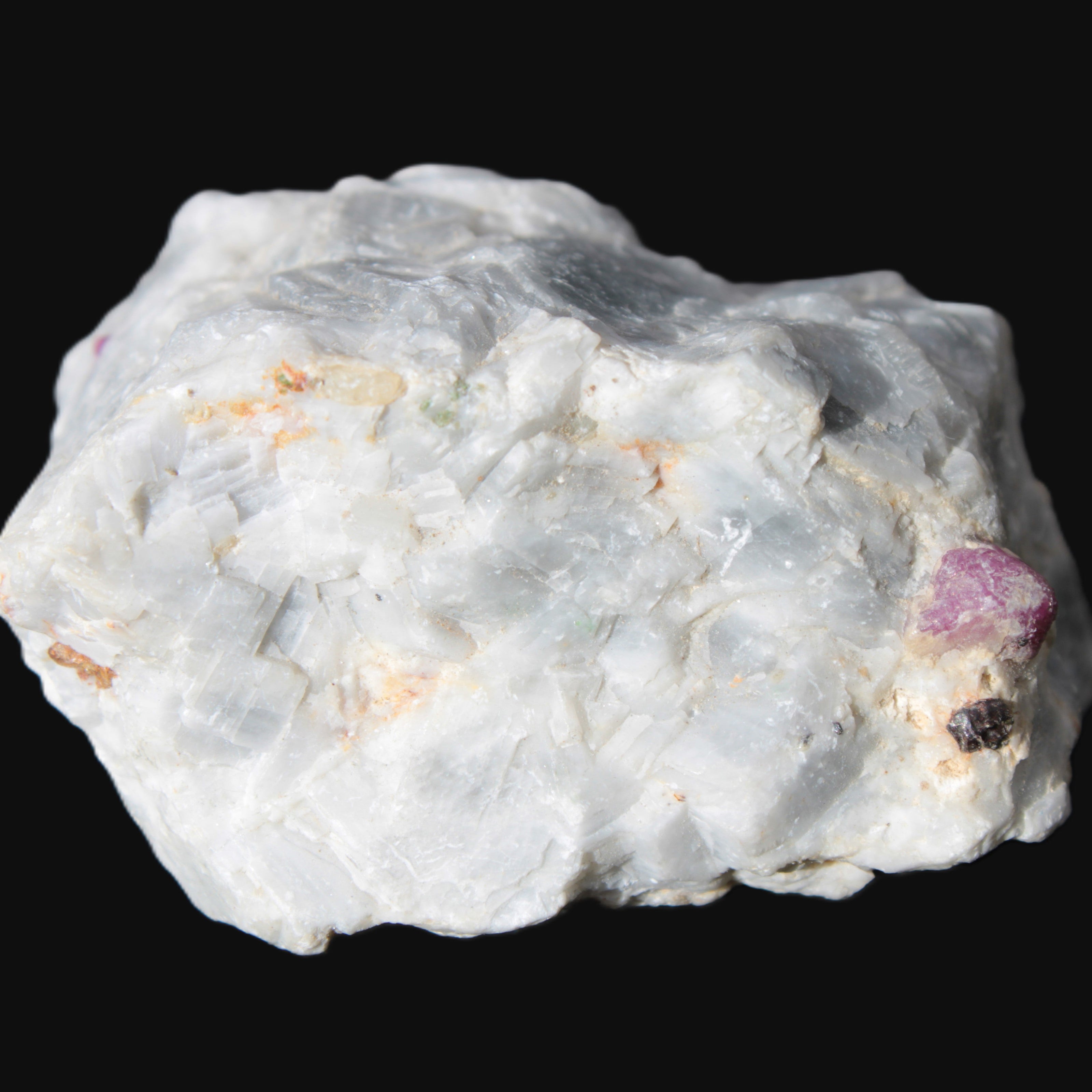 This great specimen contains small Ruby, Muscovite and other crystals in a matrix made up of white Marble and grey Dolomite. It was obtained in Afghanistan by Lawrence Handicrafts for Rocks and Things. Ruby is the crystal for strength. Ruby is revered in many cultures throughout history. Ruby has been a talisman of passion, protection and prosperity. It symbolises the Sun and its glowing hue suggest an inextinguishable flame within the stone.
