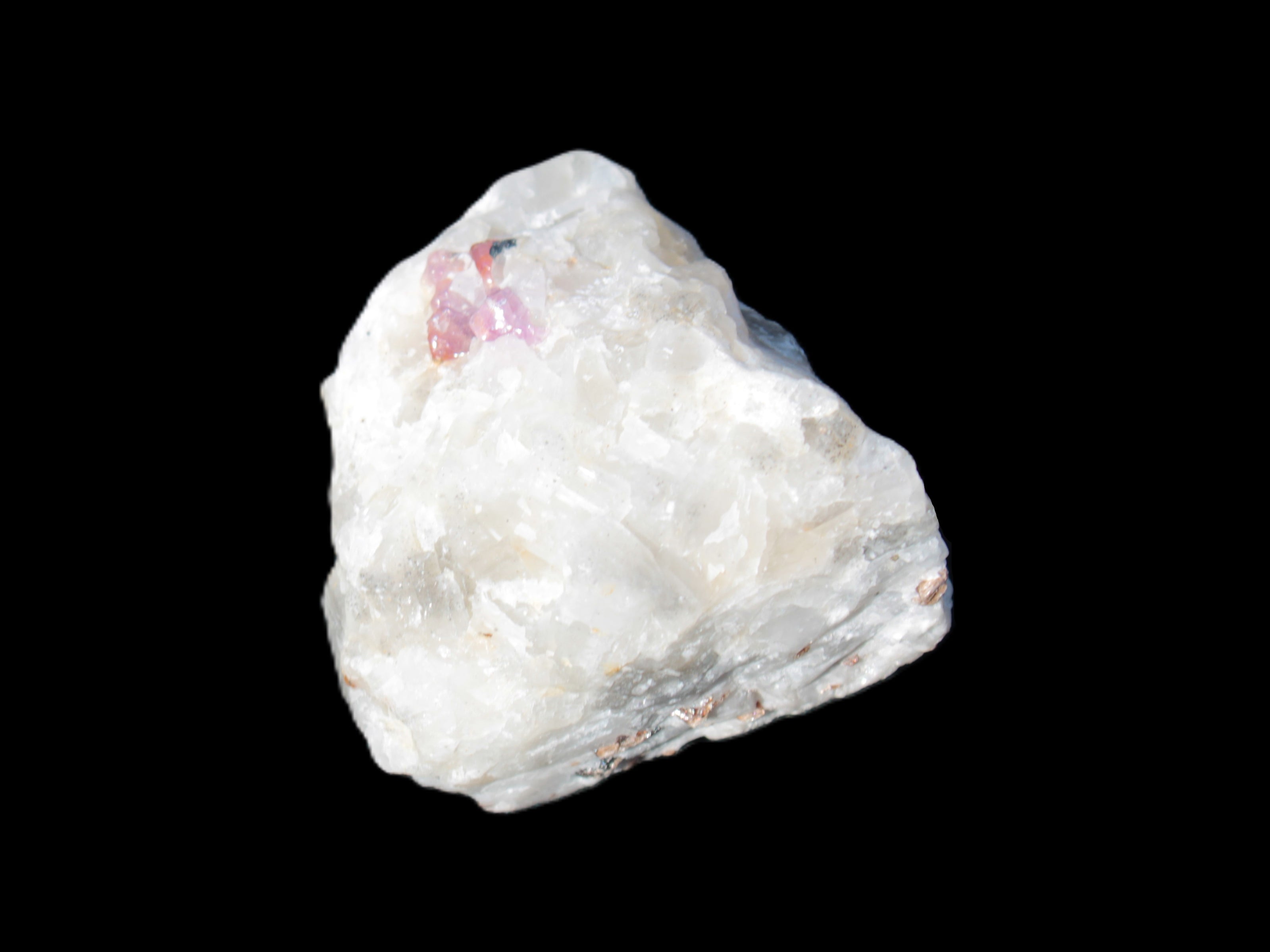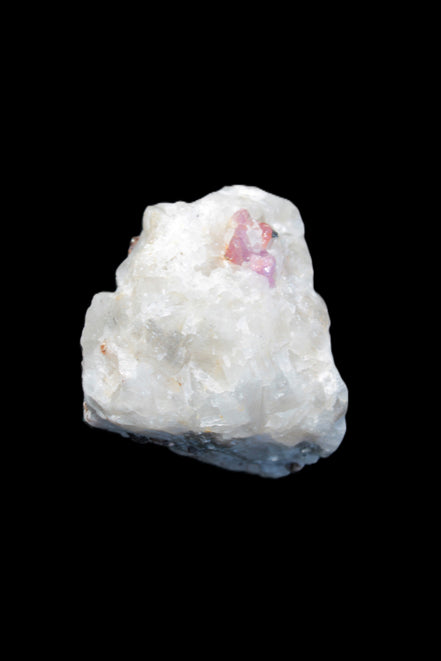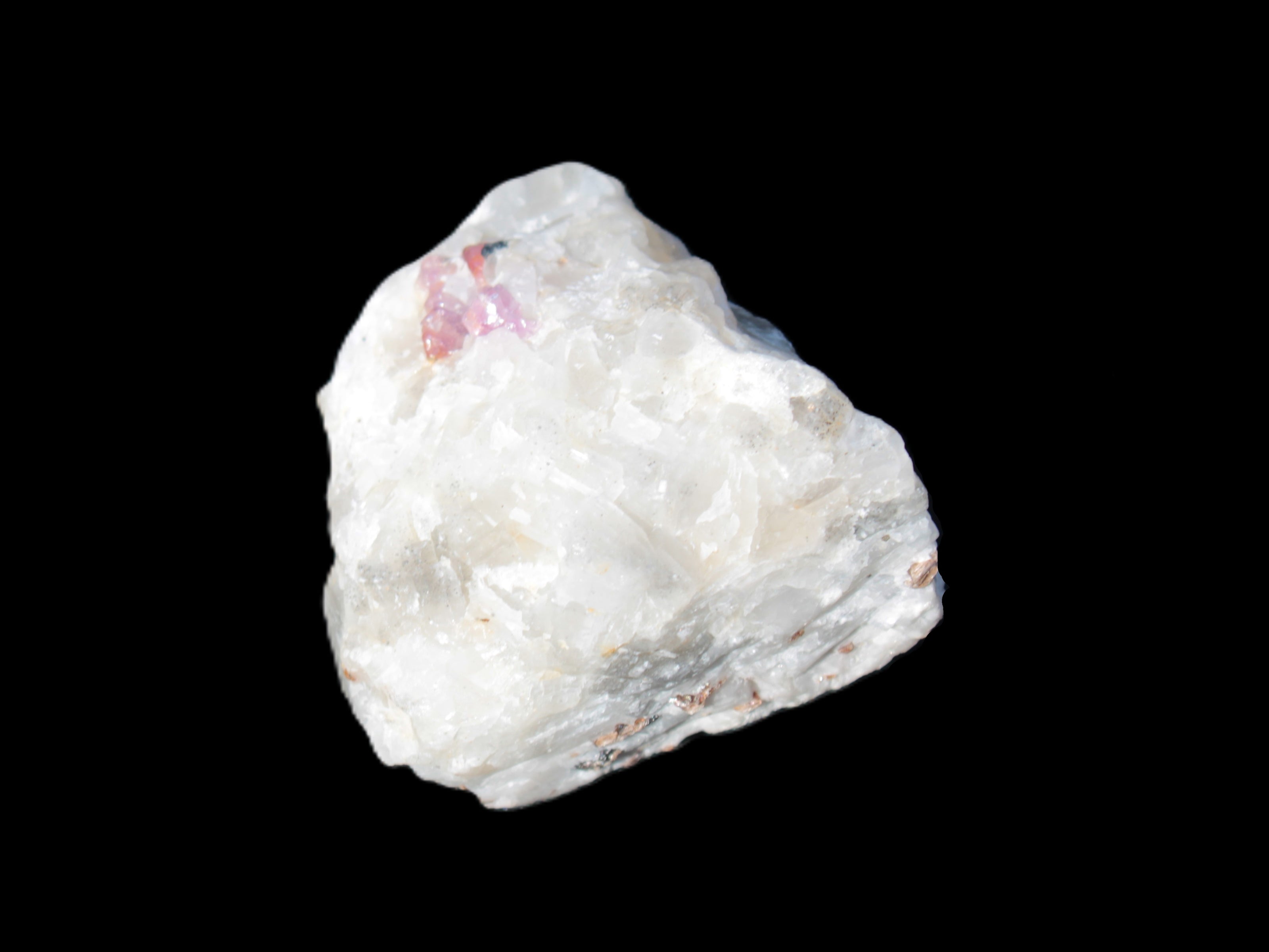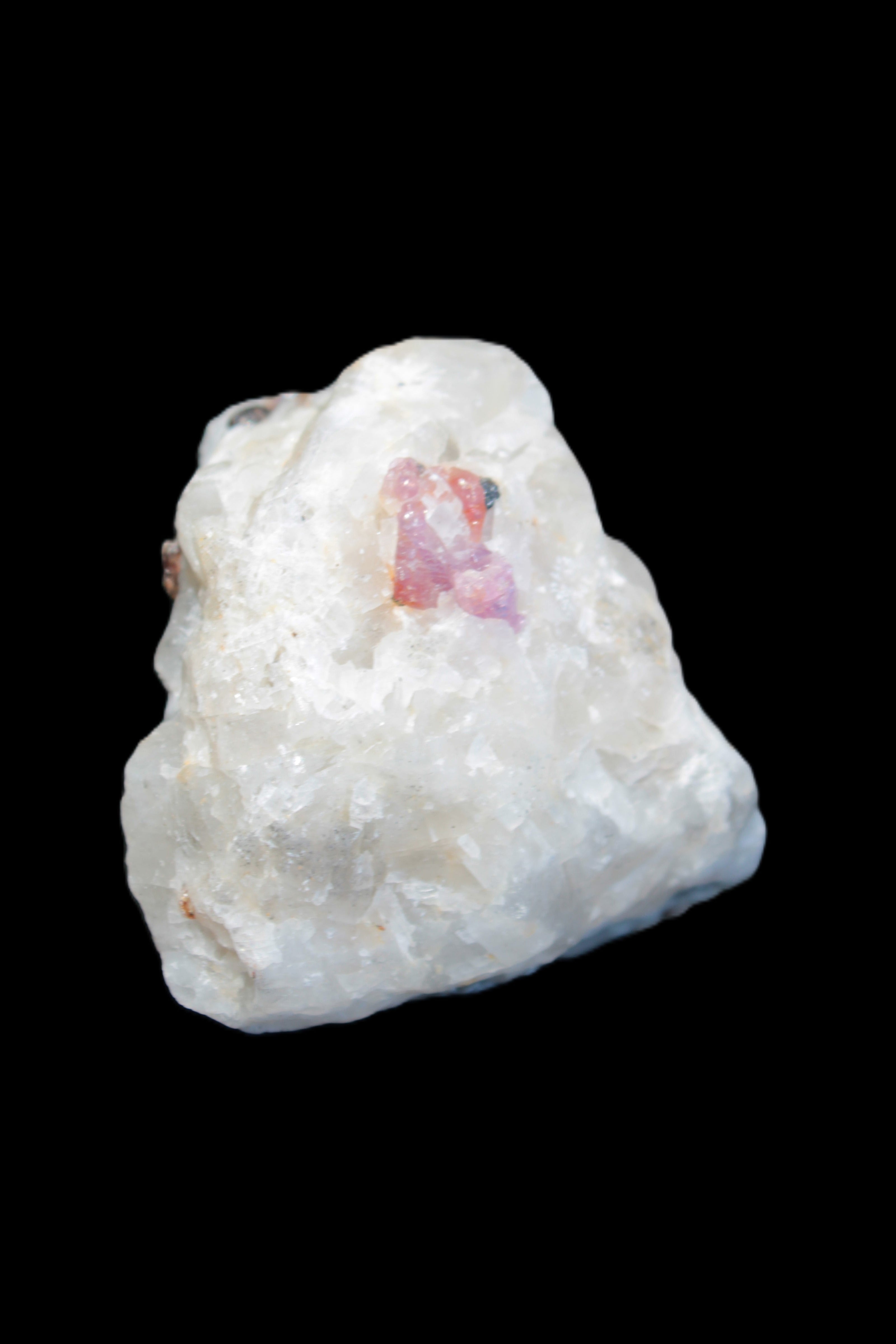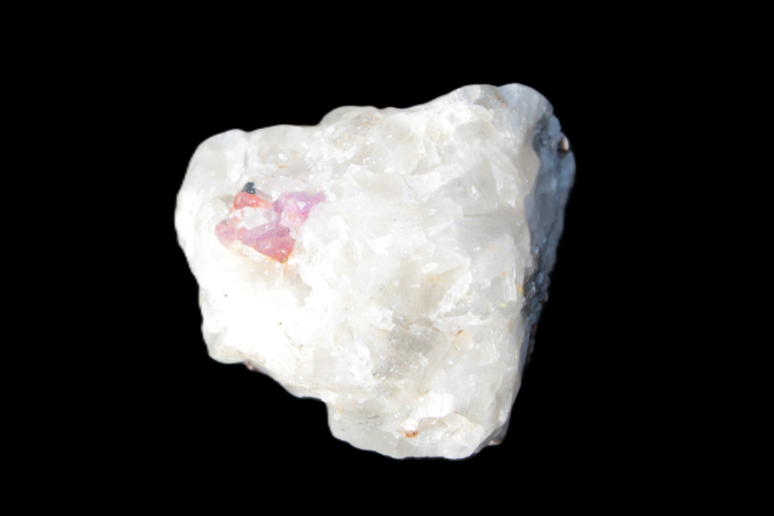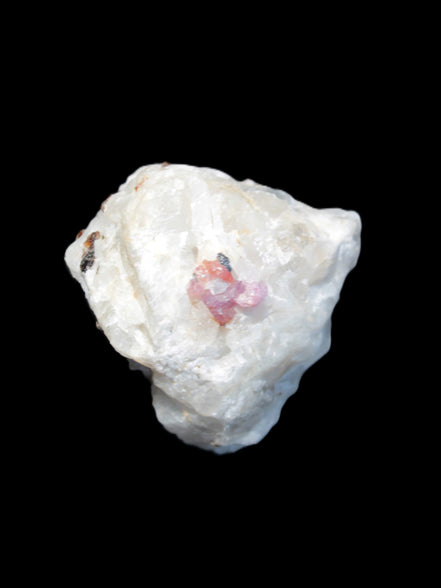 This specimen is a metamorphic rock that has resulted from plate tectonics and a nearby igneous intrusion. The original limestone sedimentary rock had Magnesium rich layers or sections. The variable heat, pressure and supply of elements resulted in the formation of different rarer crystals in a marble/dolomite matrix. This specimen has Ruby and Phlogopite crystals.