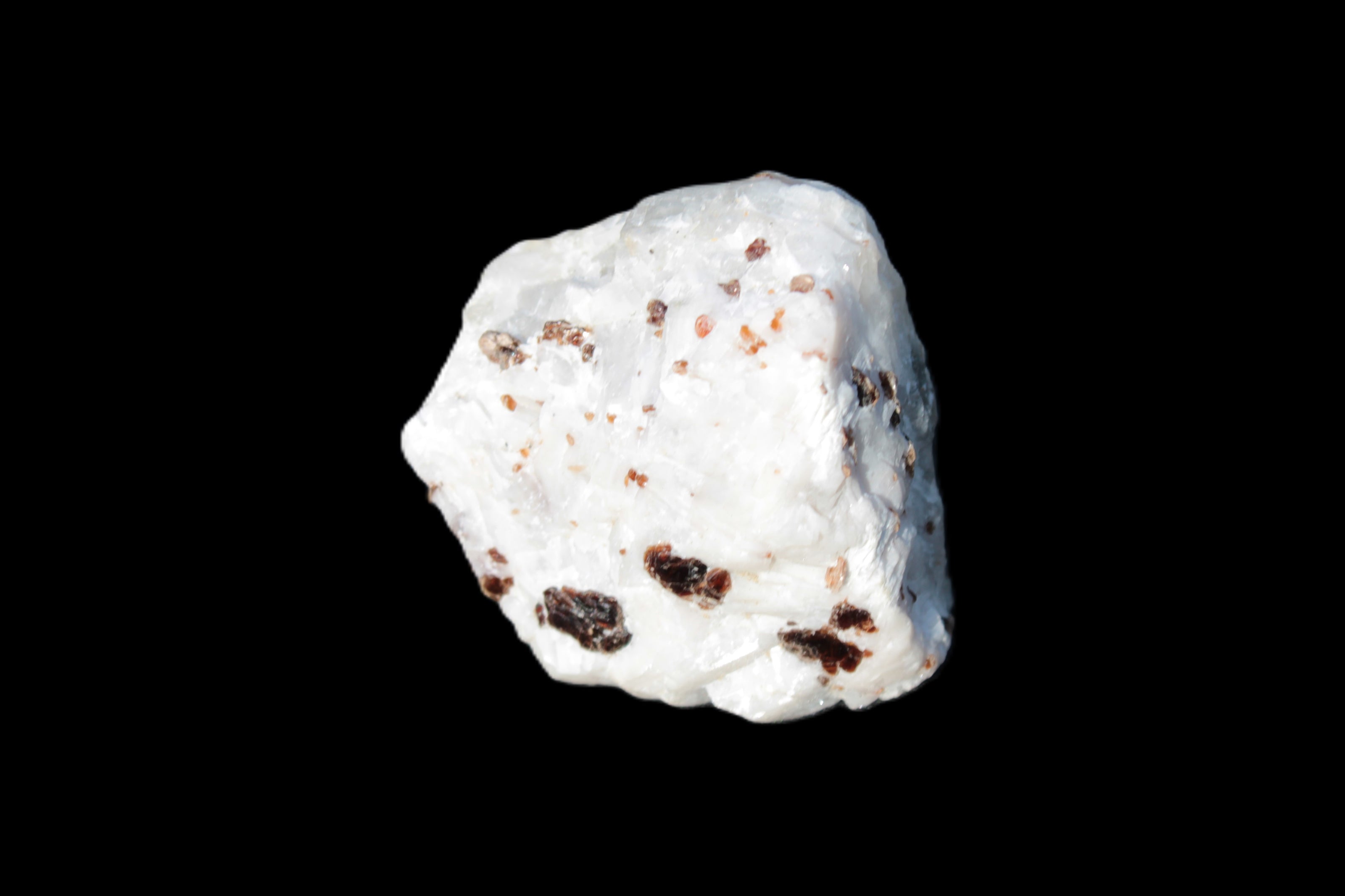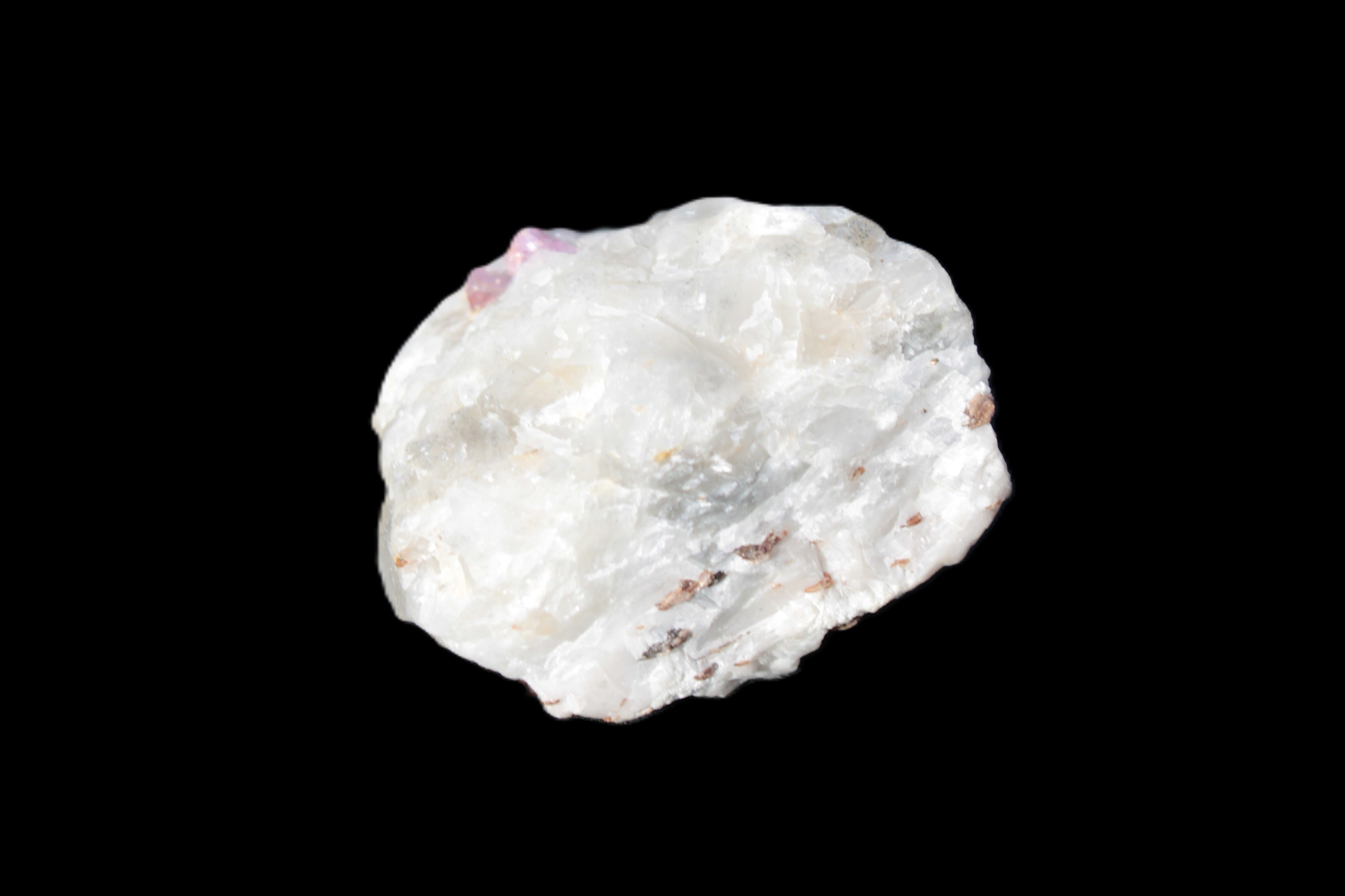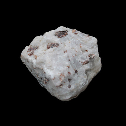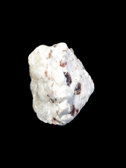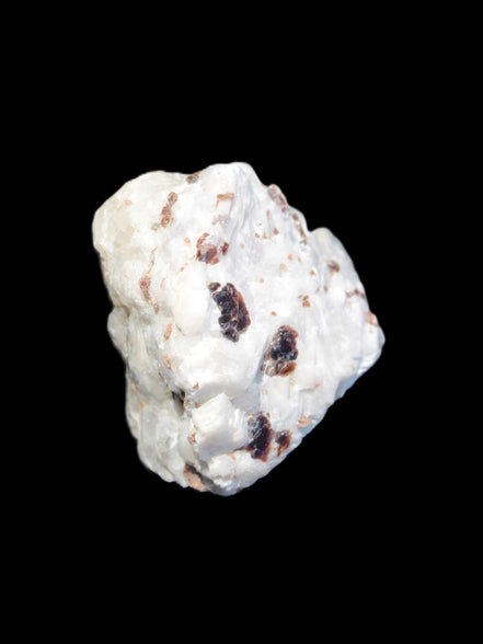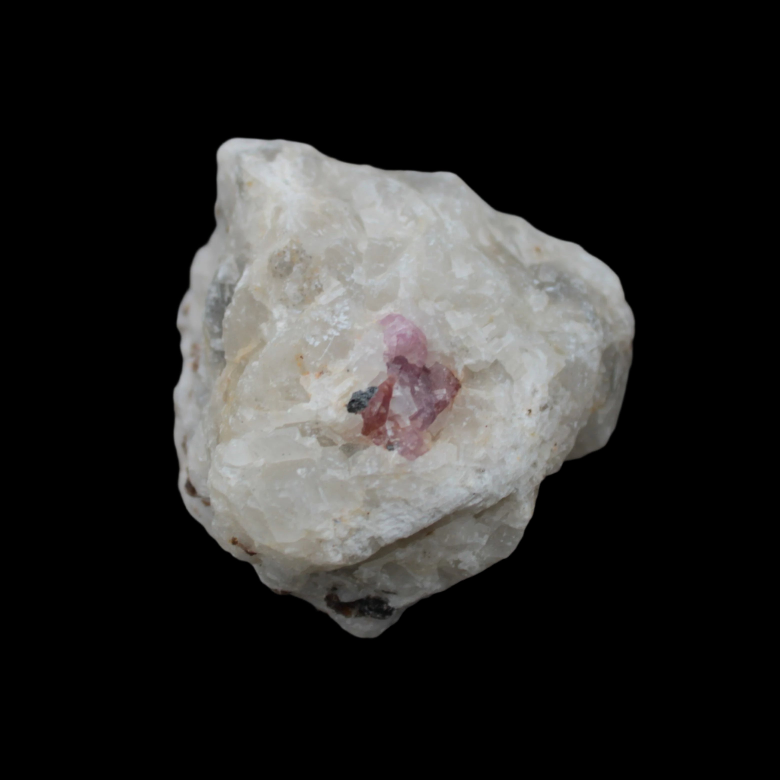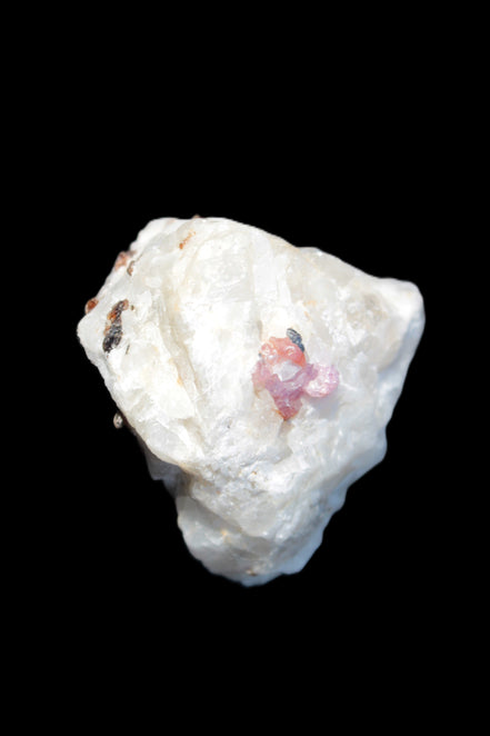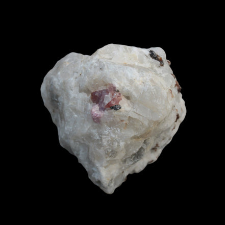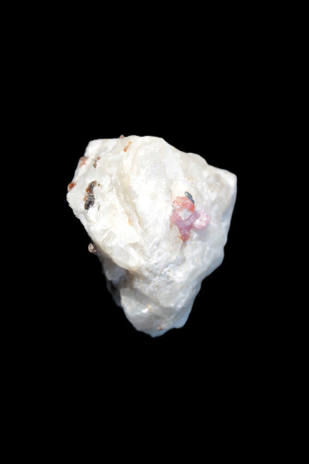This specimen is a metamorphic rock that has resulted from plate tectonics and a nearby igneous intrusion. The original limestone sedimentary rock had Magnesium rich layers or sections. The variable heat, pressure and supply of elements resulted in the formation of different rarer crystals in a marble/dolomite matrix. This specimen has Ruby and Phlogopite crystals.