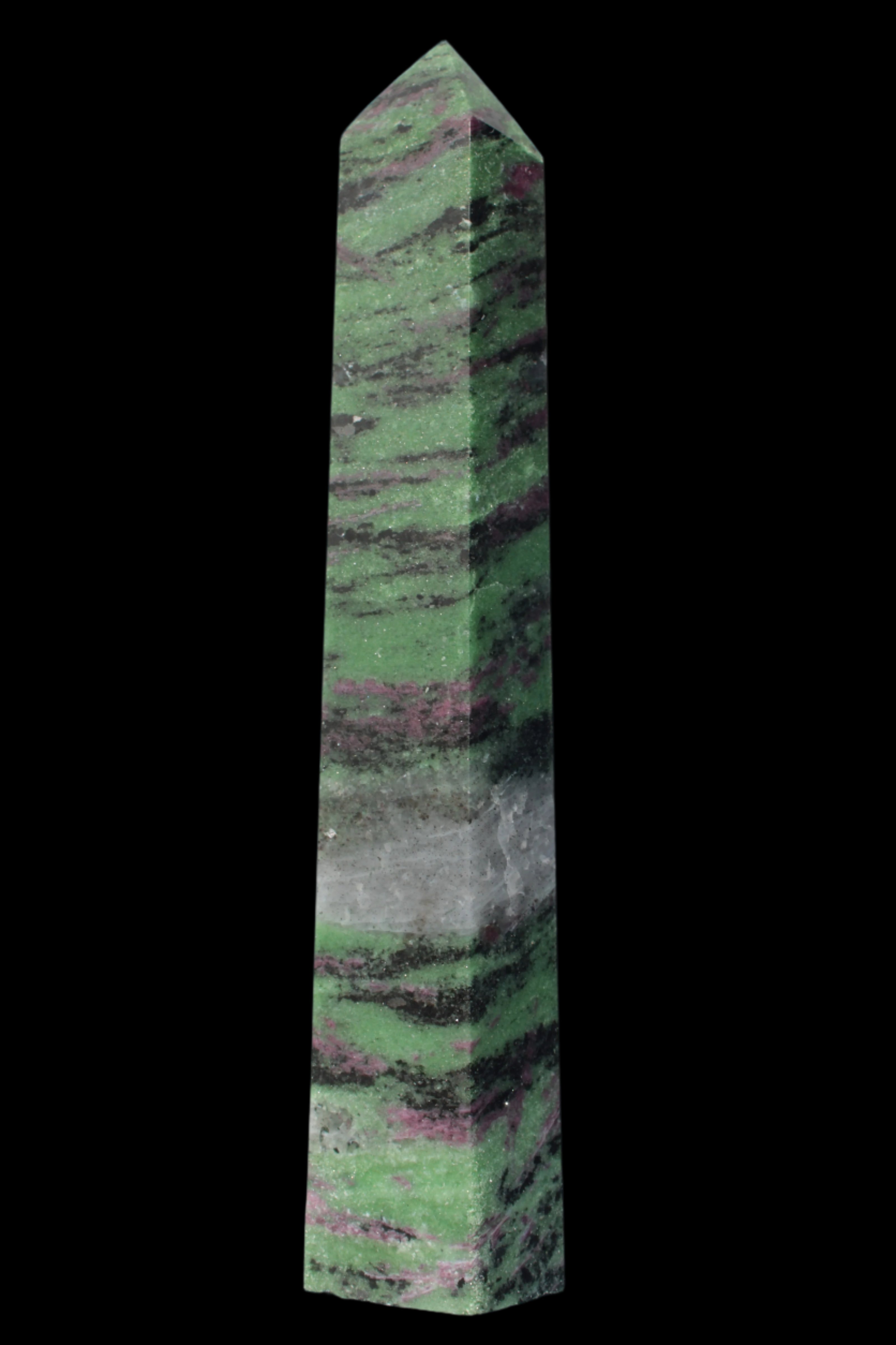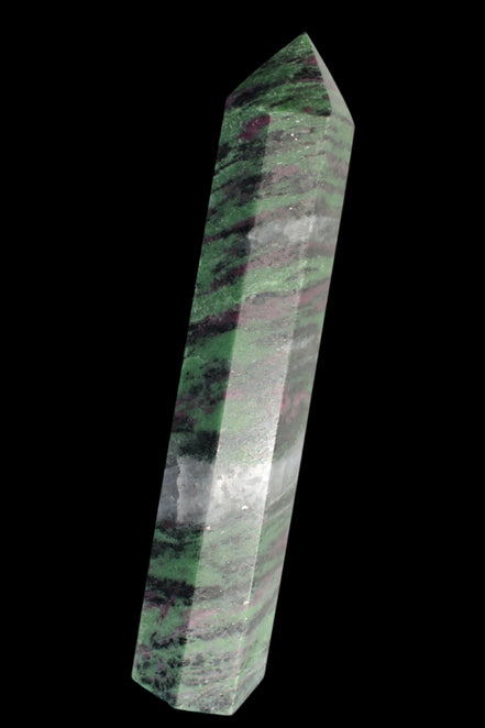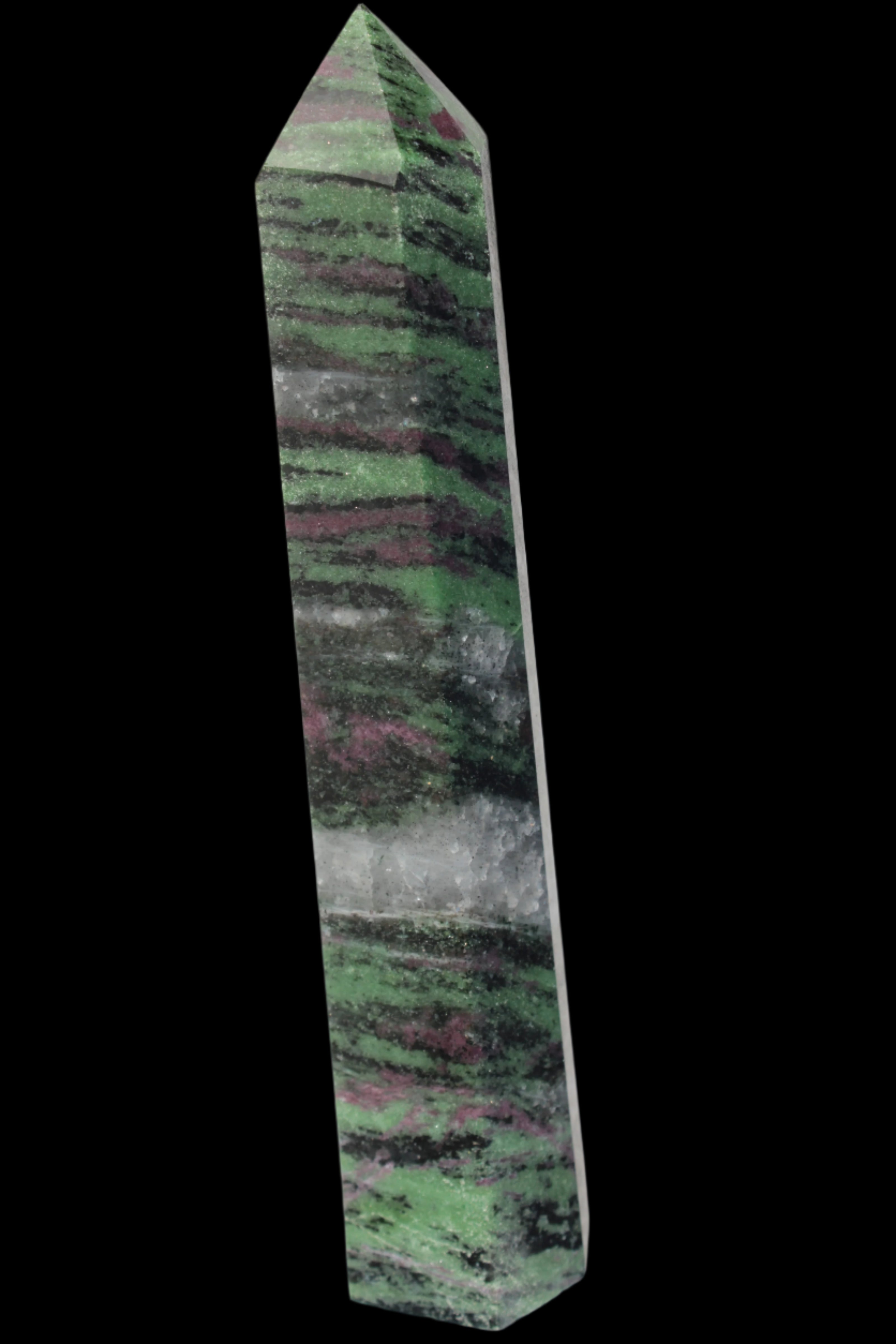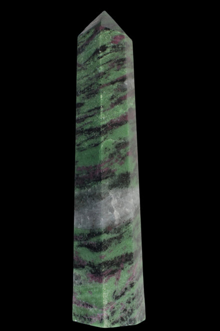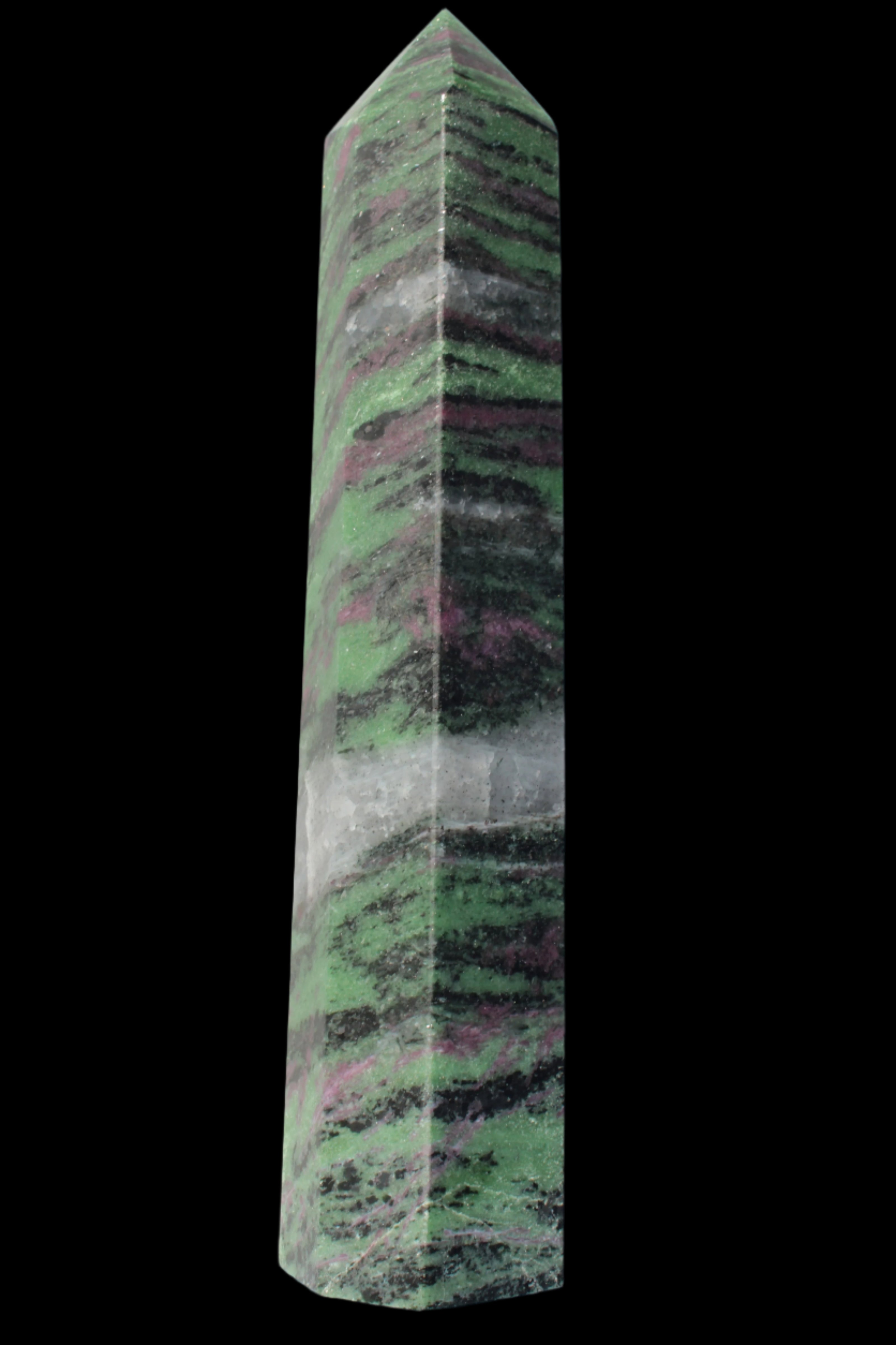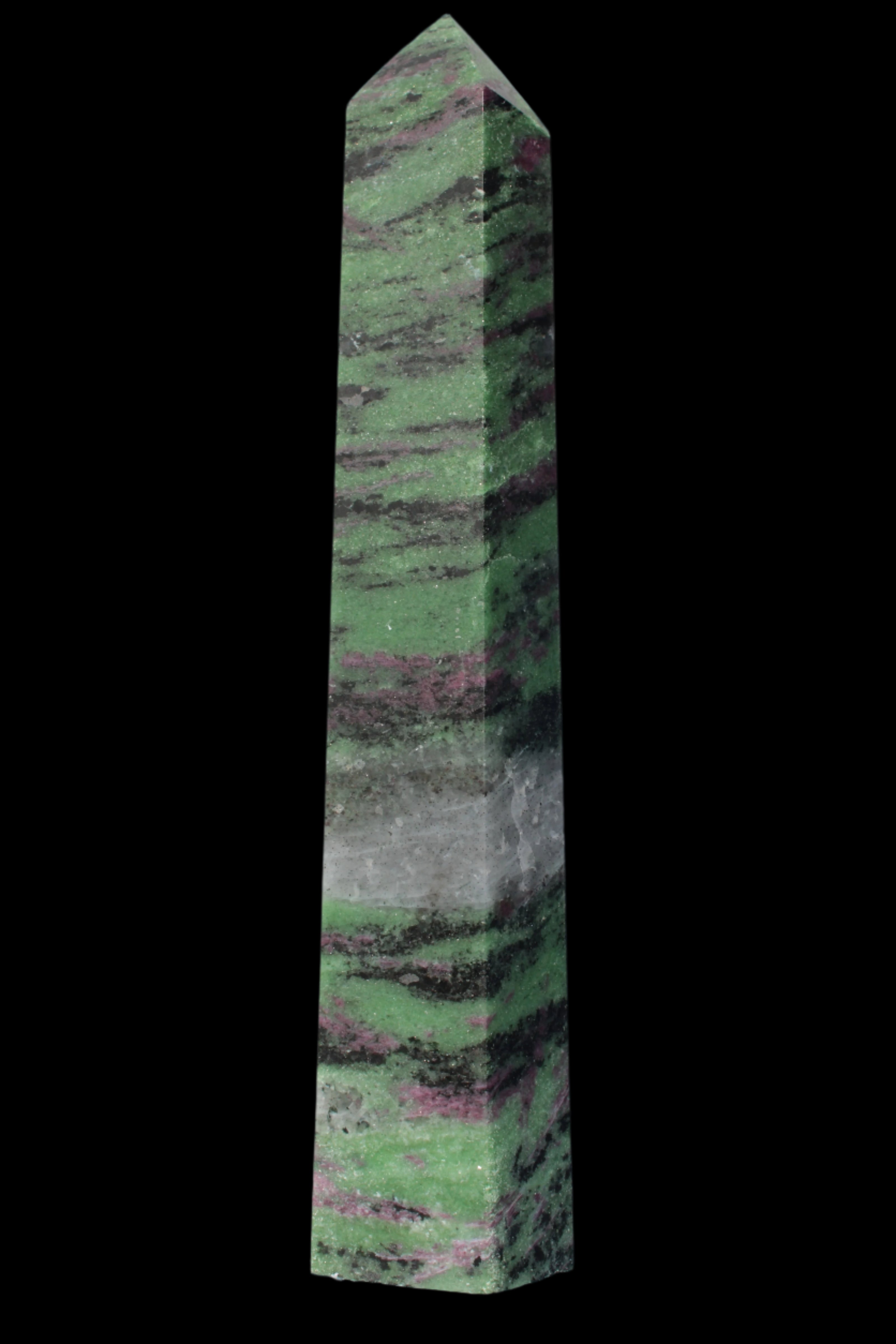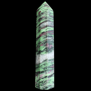 This Ruby Zoisite obelisk weighs 574g. This large, long obelisk is a beautiful example of this rarer calcium aluminium silicate hydroxide mineral. Zoisite is its own group of minerals. Zoisite is usually found combined with other minerals, most commonly with Ruby, found abundantly in this obelisk, along with quartz. It is formed from the metamorphosis of alkaline igneous rocks. Zoisites can be found in a green and black striped or spotted pattern.  The presence of chromium and vanadium is what gives it the green colour.