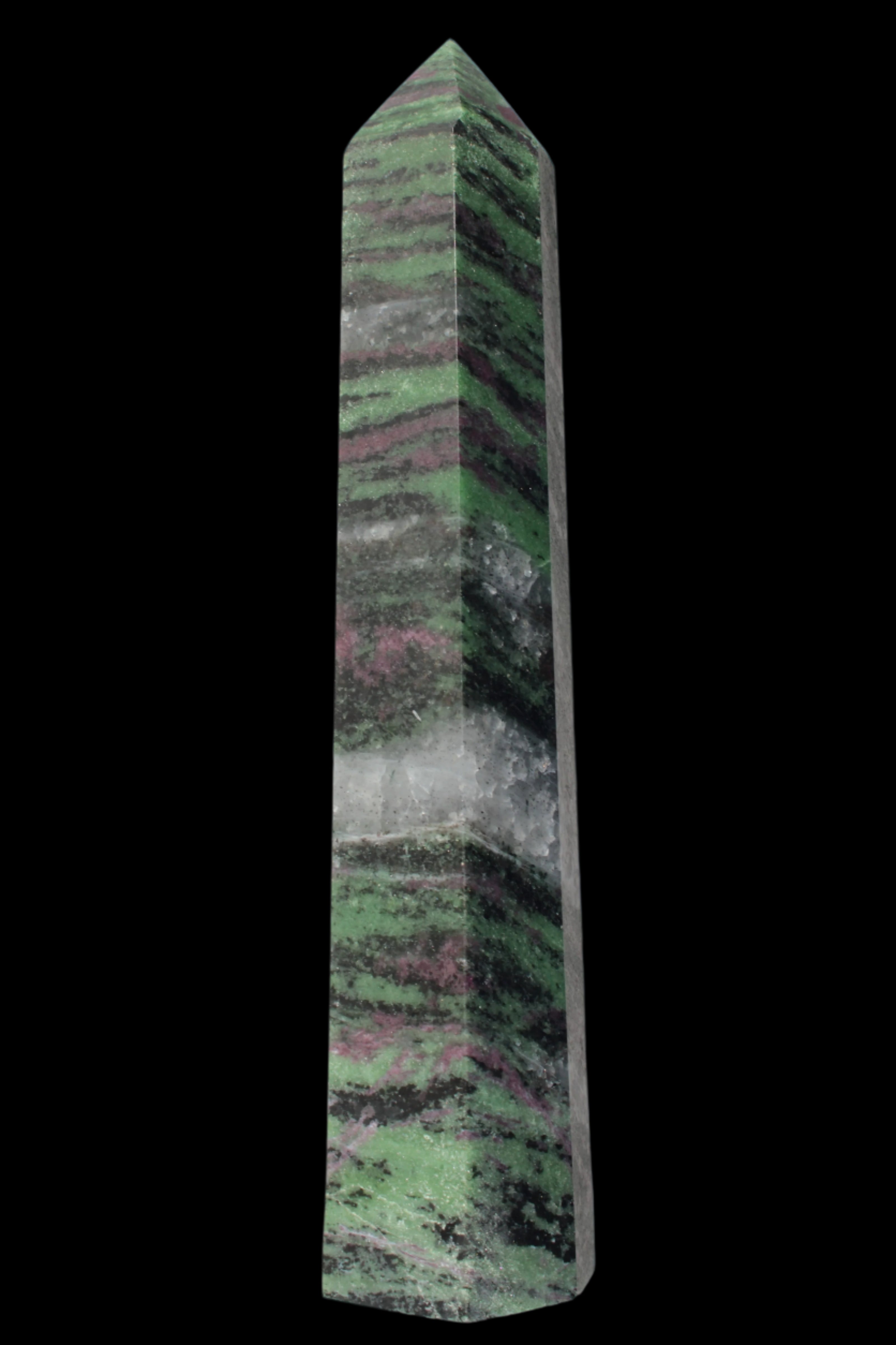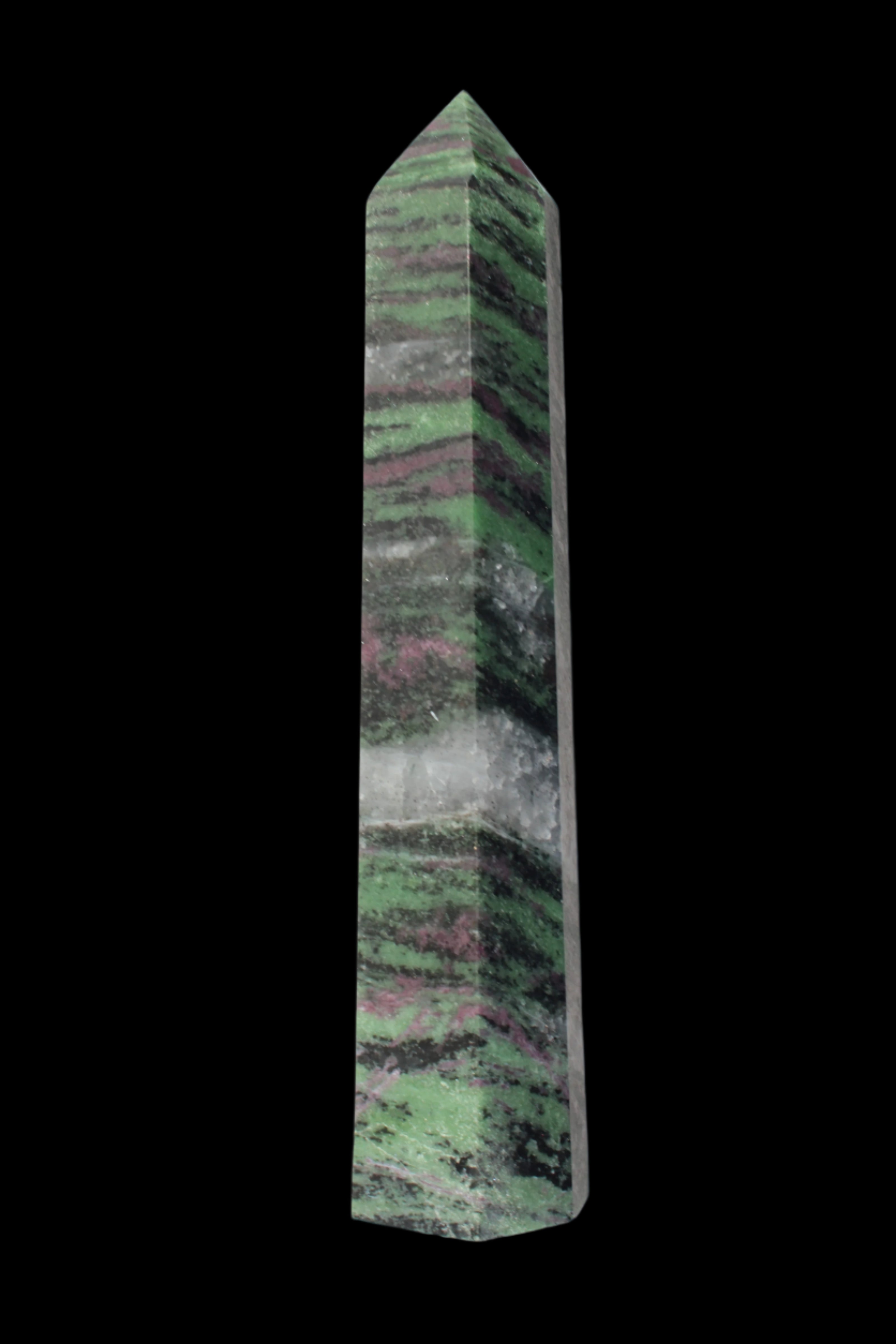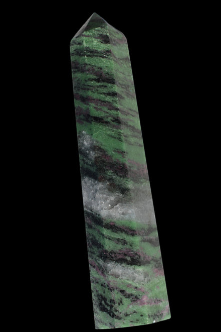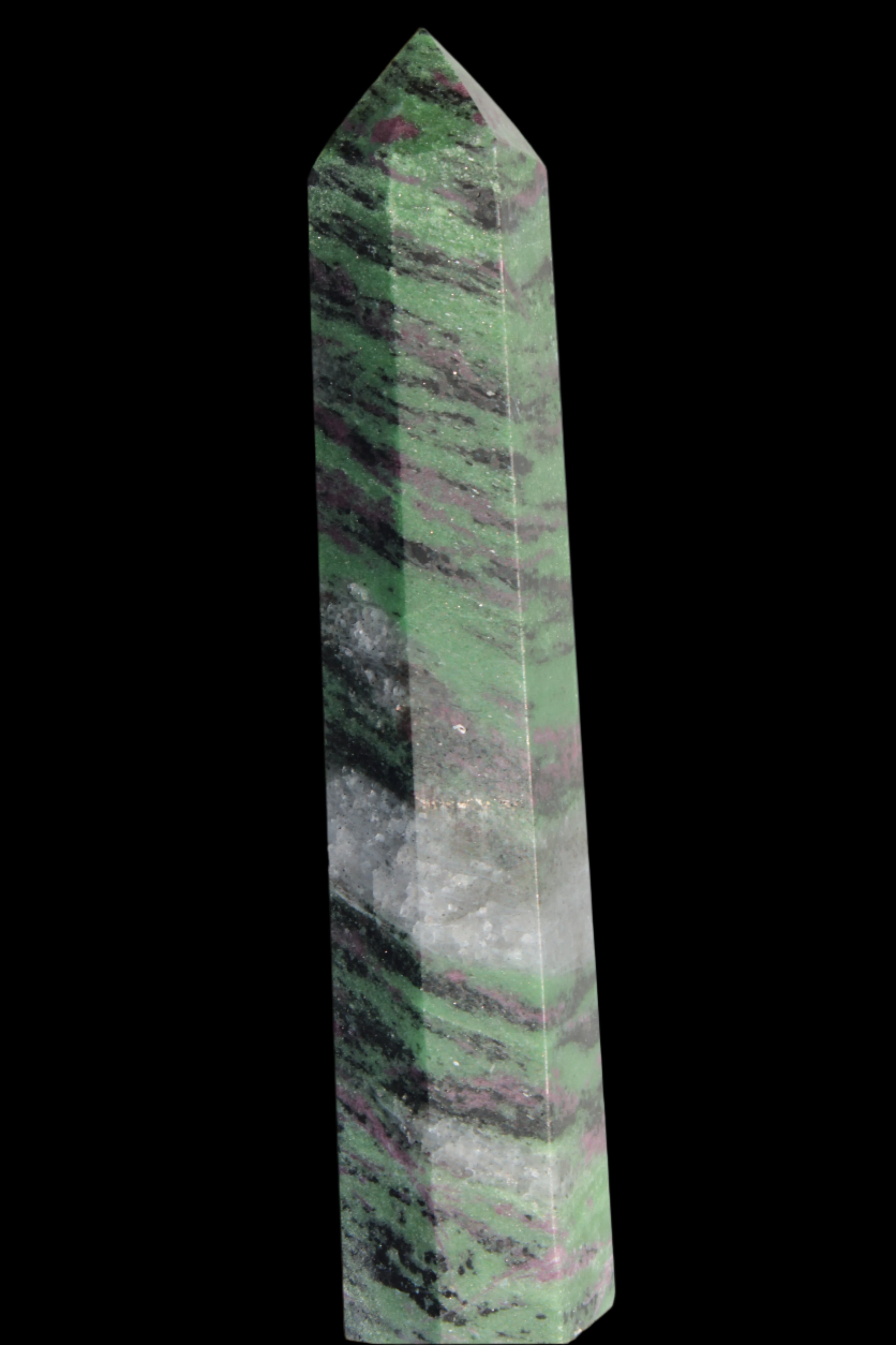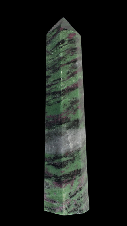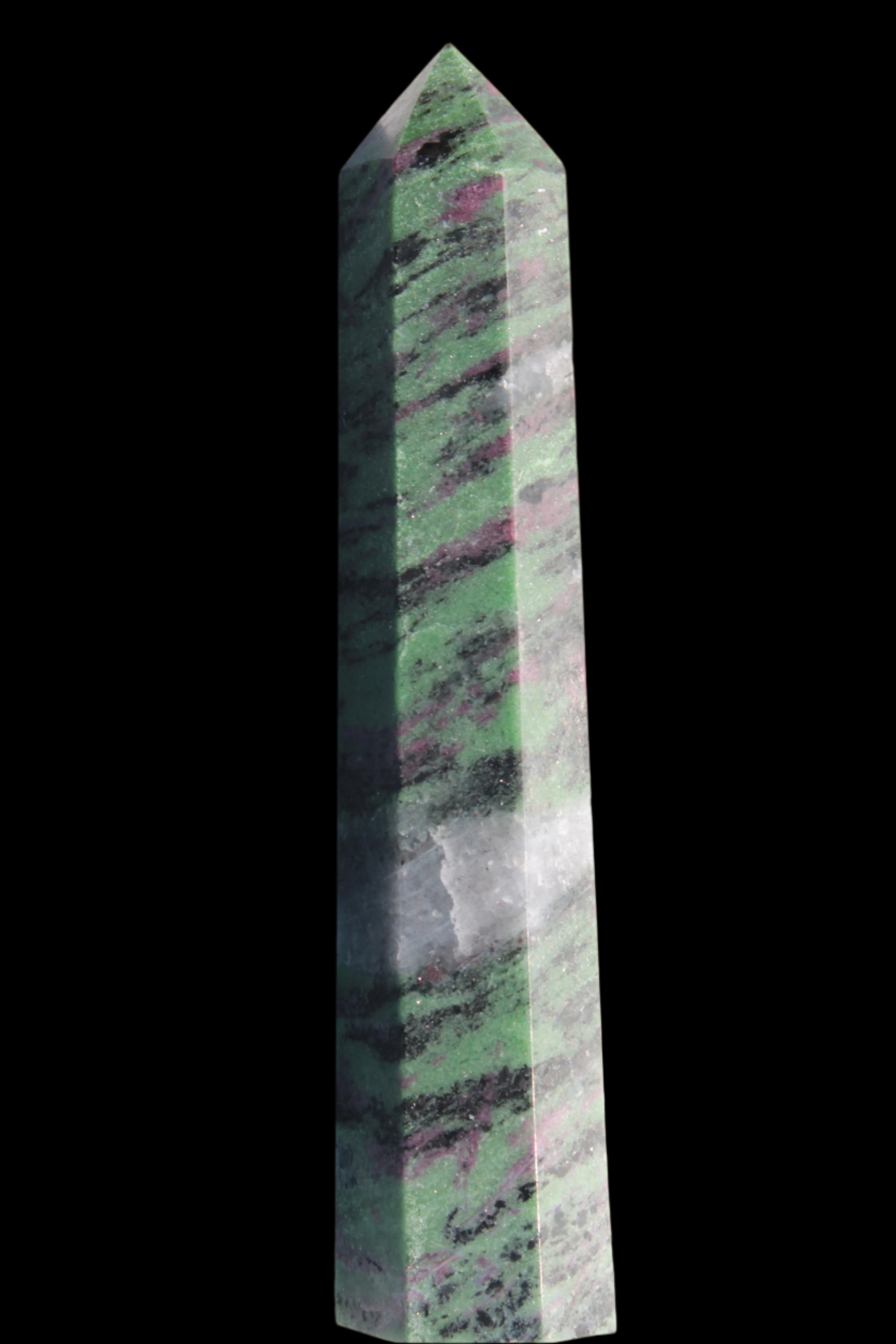 This Ruby Zoisite obelisk weighs 574g. This large, long obelisk is a beautiful example of this rarer calcium aluminium silicate hydroxide mineral. Zoisite is its own group of minerals. Zoisite is usually found combined with other minerals, most commonly with Ruby, found abundantly in this obelisk, along with quartz. It is formed from the metamorphosis of alkaline igneous rocks. Zoisites can be found in a green and black striped or spotted pattern.  The presence of chromium and vanadium is what gives it the green colour.