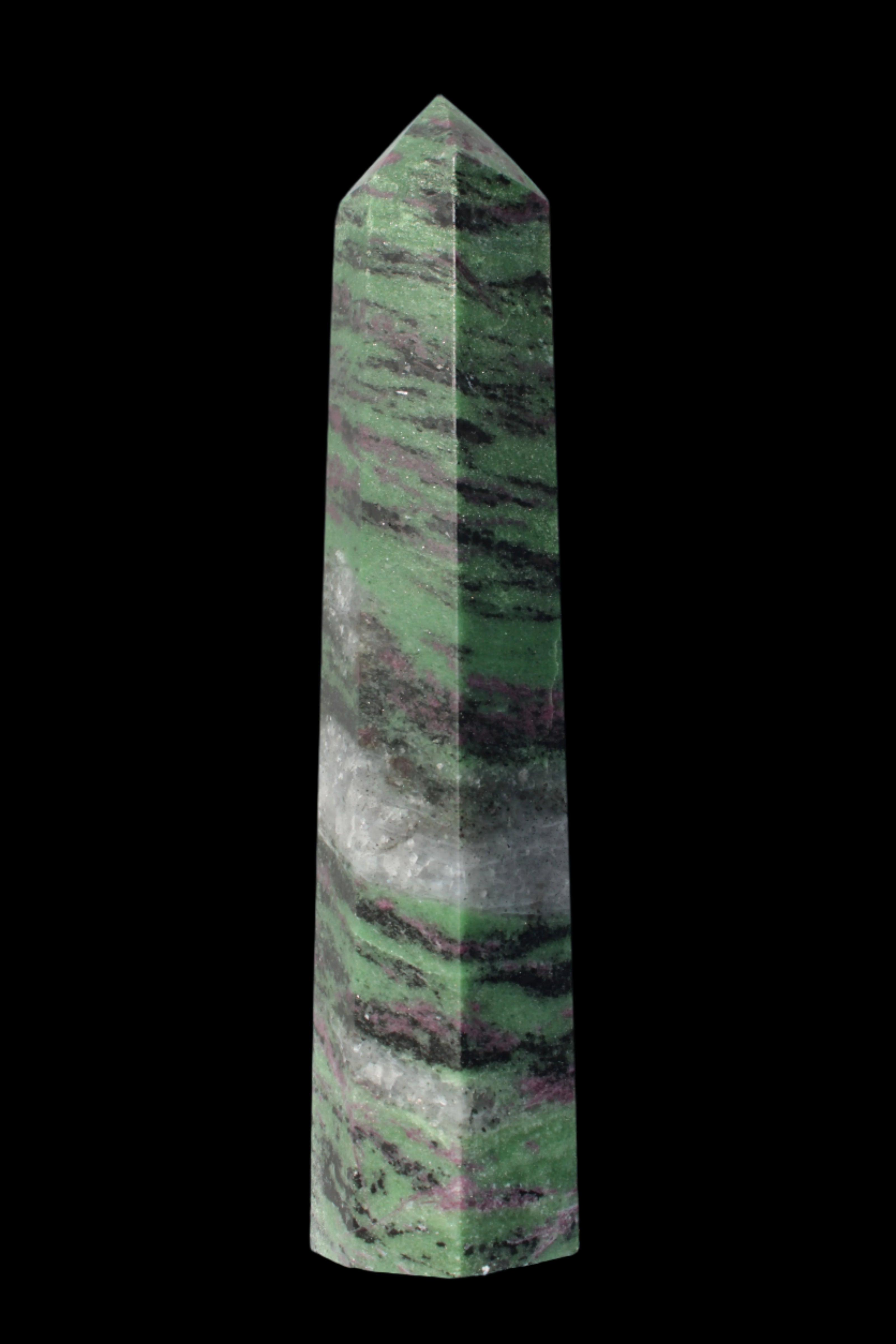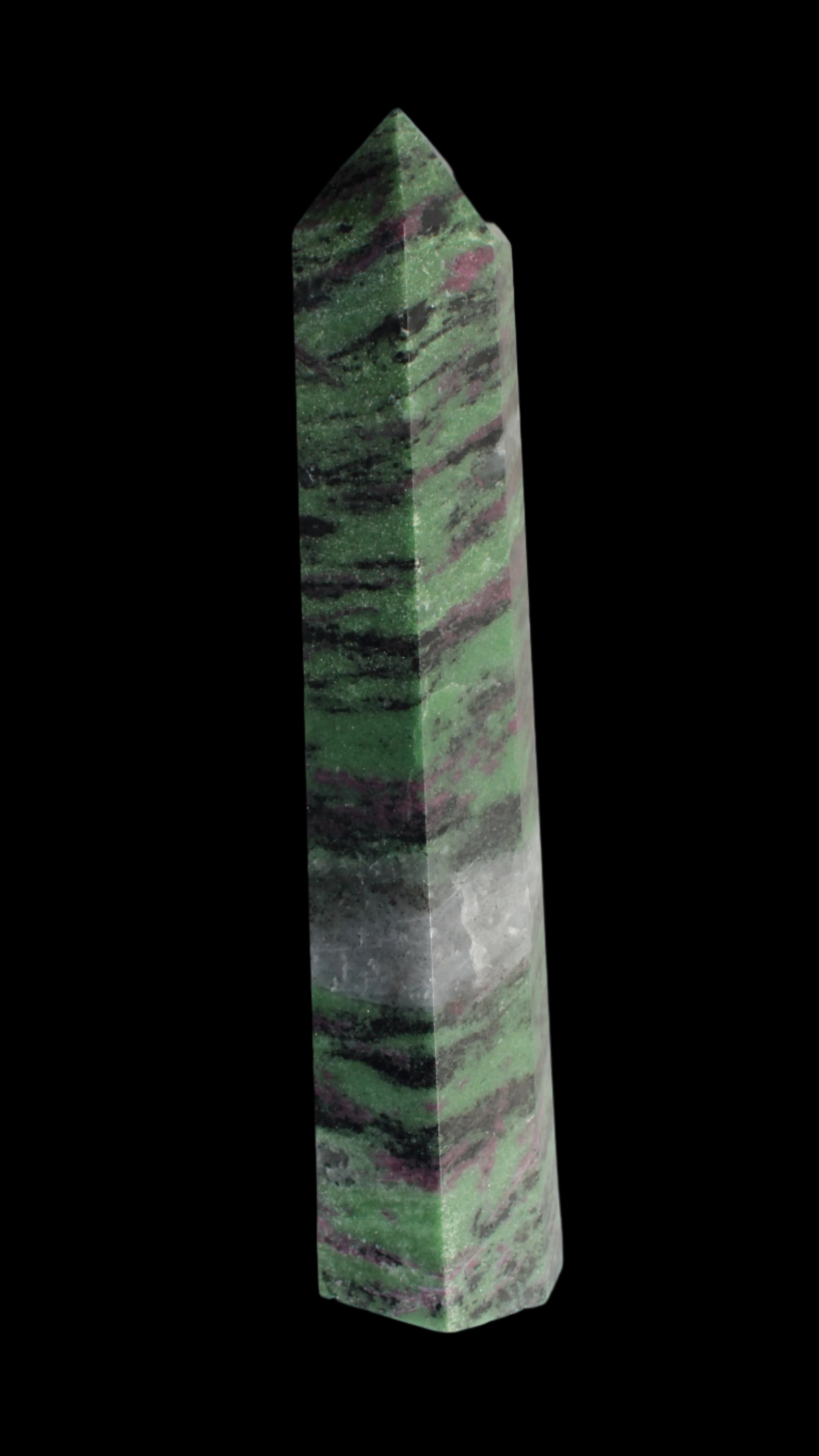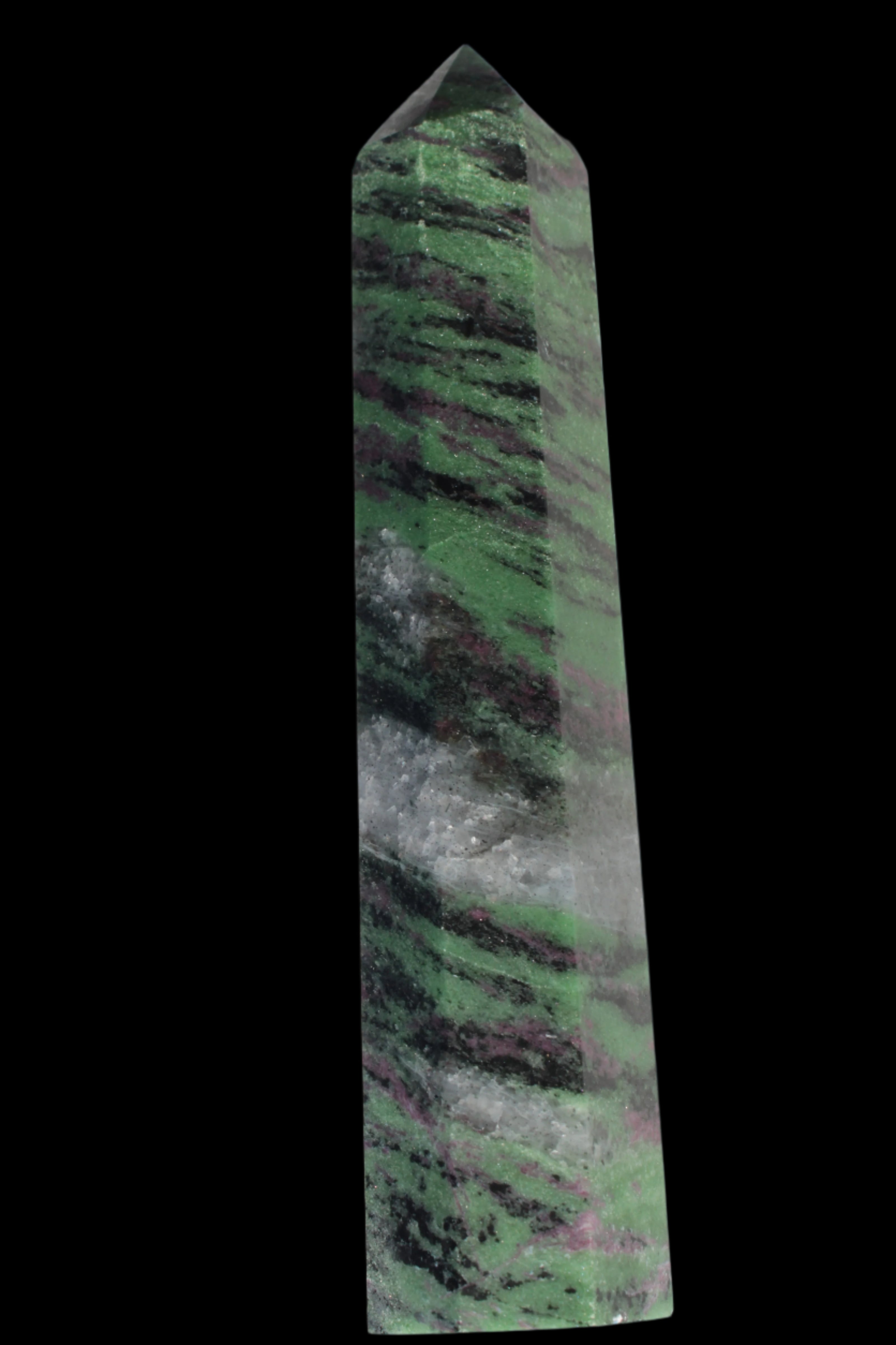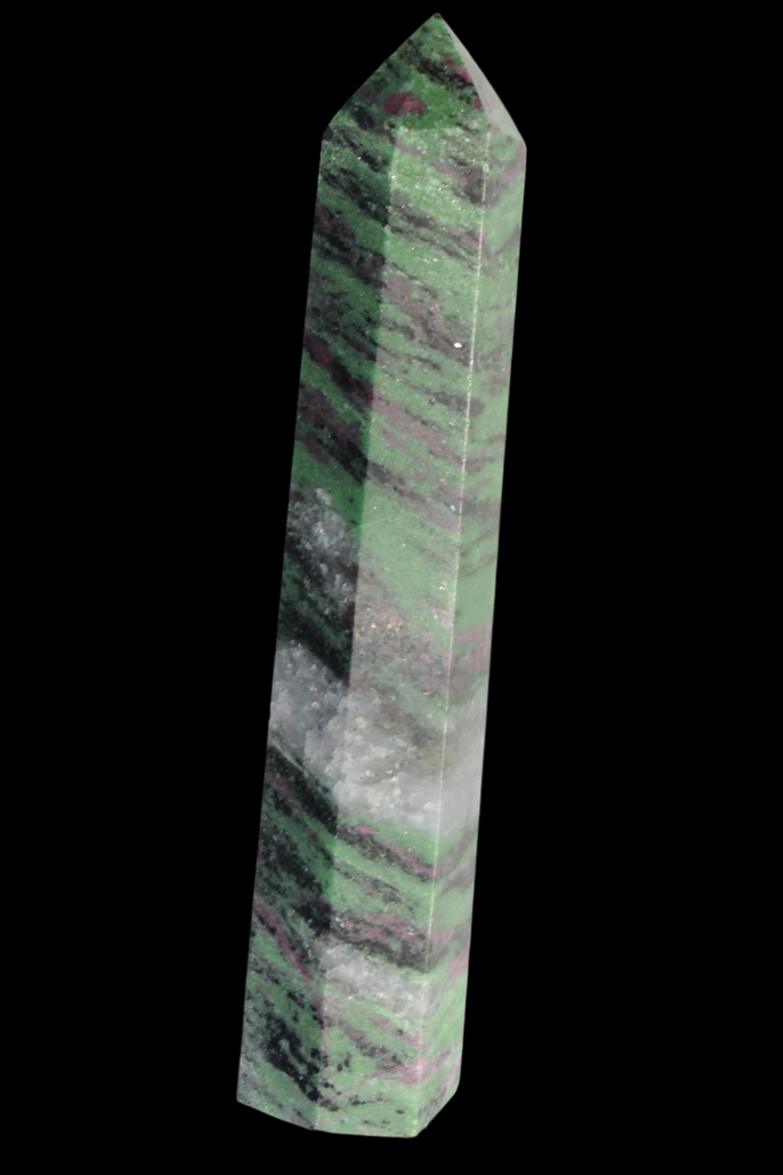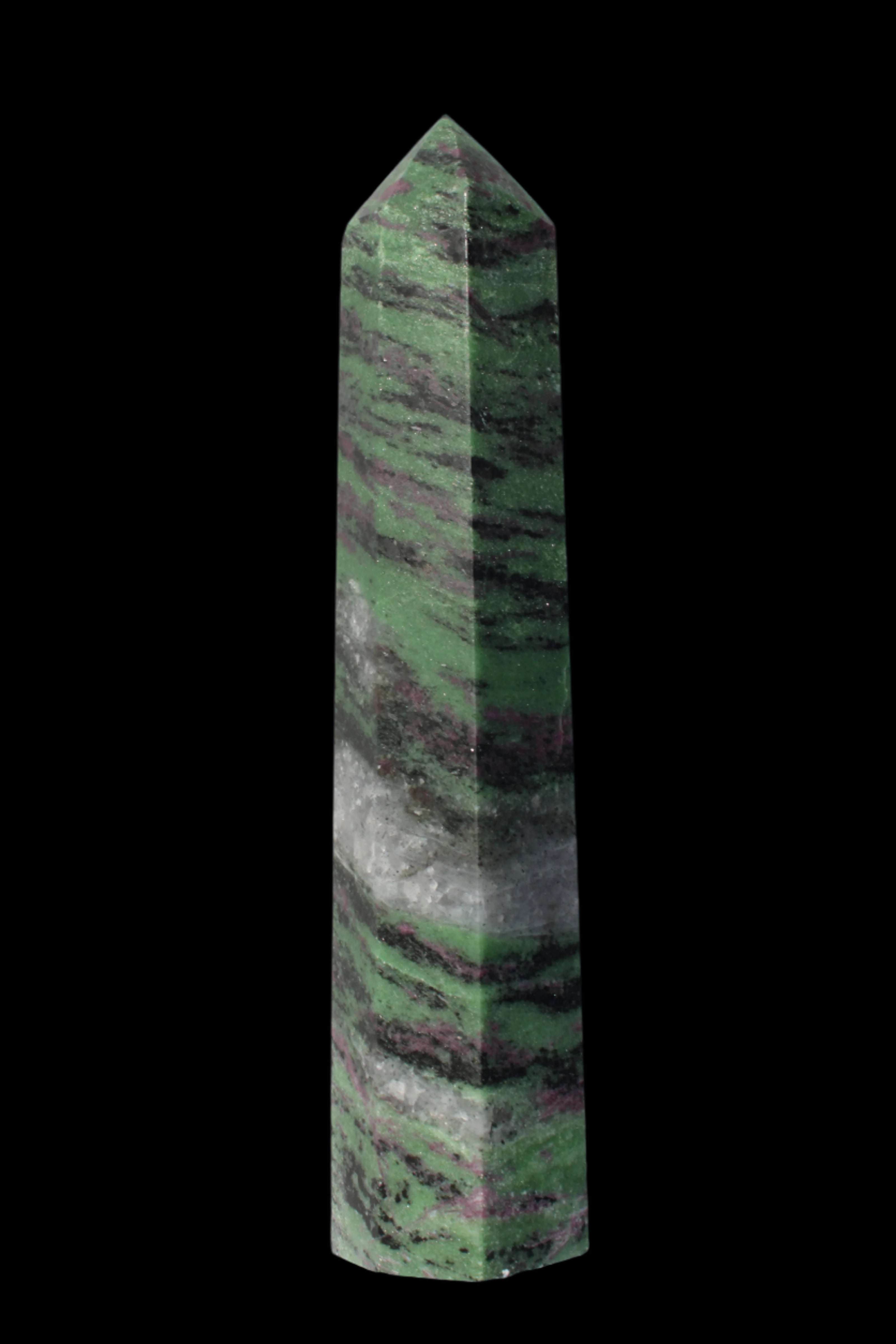 This Ruby Zoisite obelisk weighs 574g. This large, long obelisk is a beautiful example of this rarer calcium aluminium silicate hydroxide mineral. Zoisite is its own group of minerals. Zoisite is usually found combined with other minerals, most commonly with Ruby, found abundantly in this obelisk, along with quartz. It is formed from the metamorphosis of alkaline igneous rocks. Zoisites can be found in a green and black striped or spotted pattern.  The presence of chromium and vanadium is what gives it the green colour.