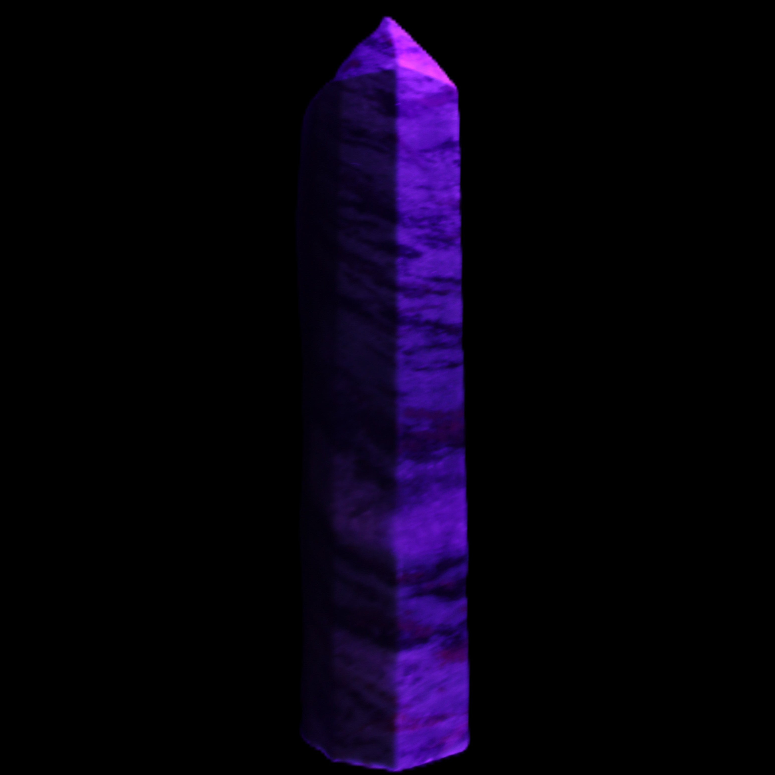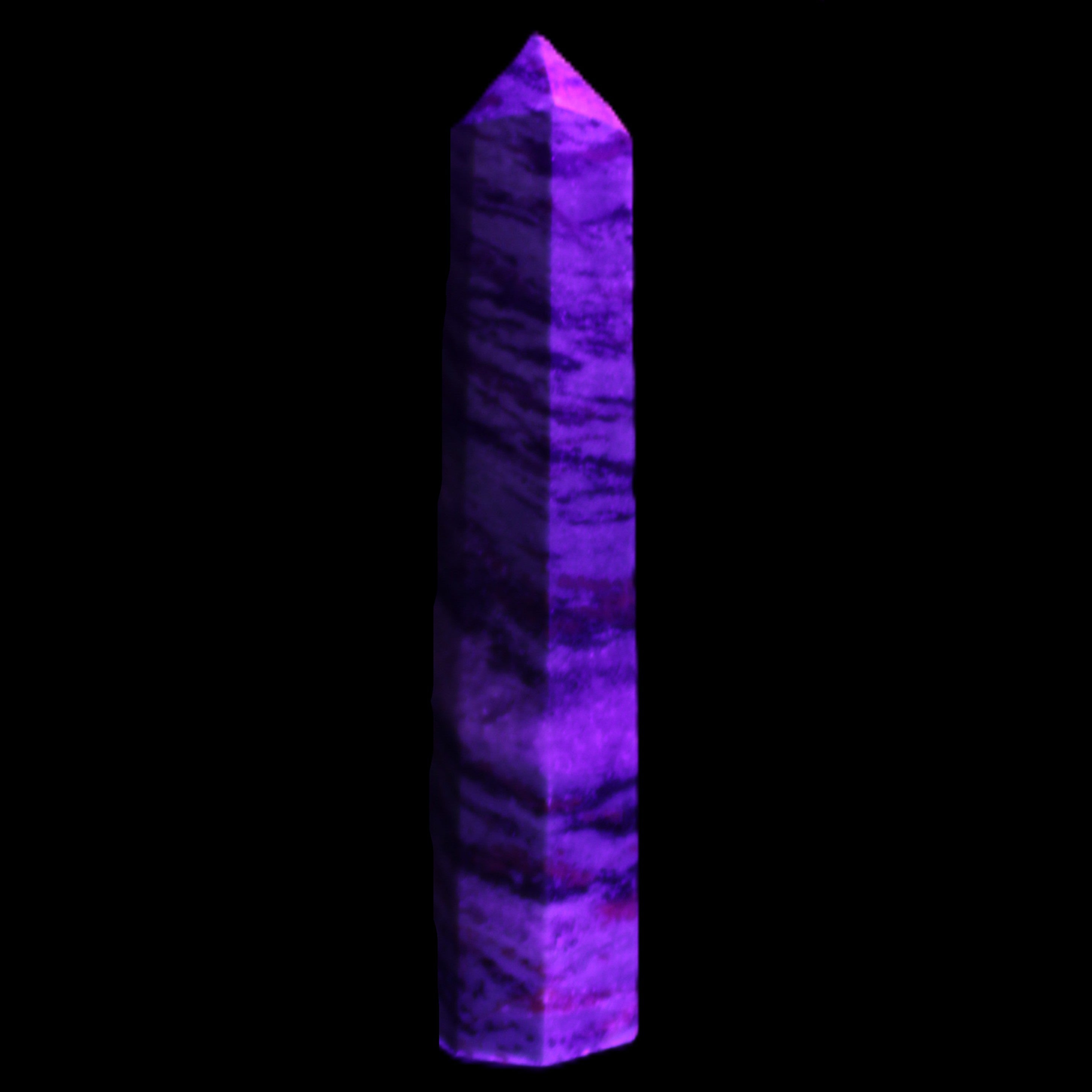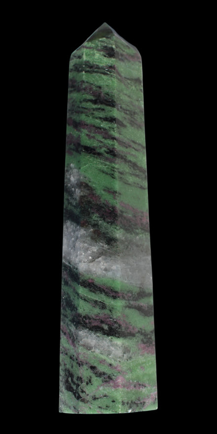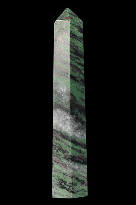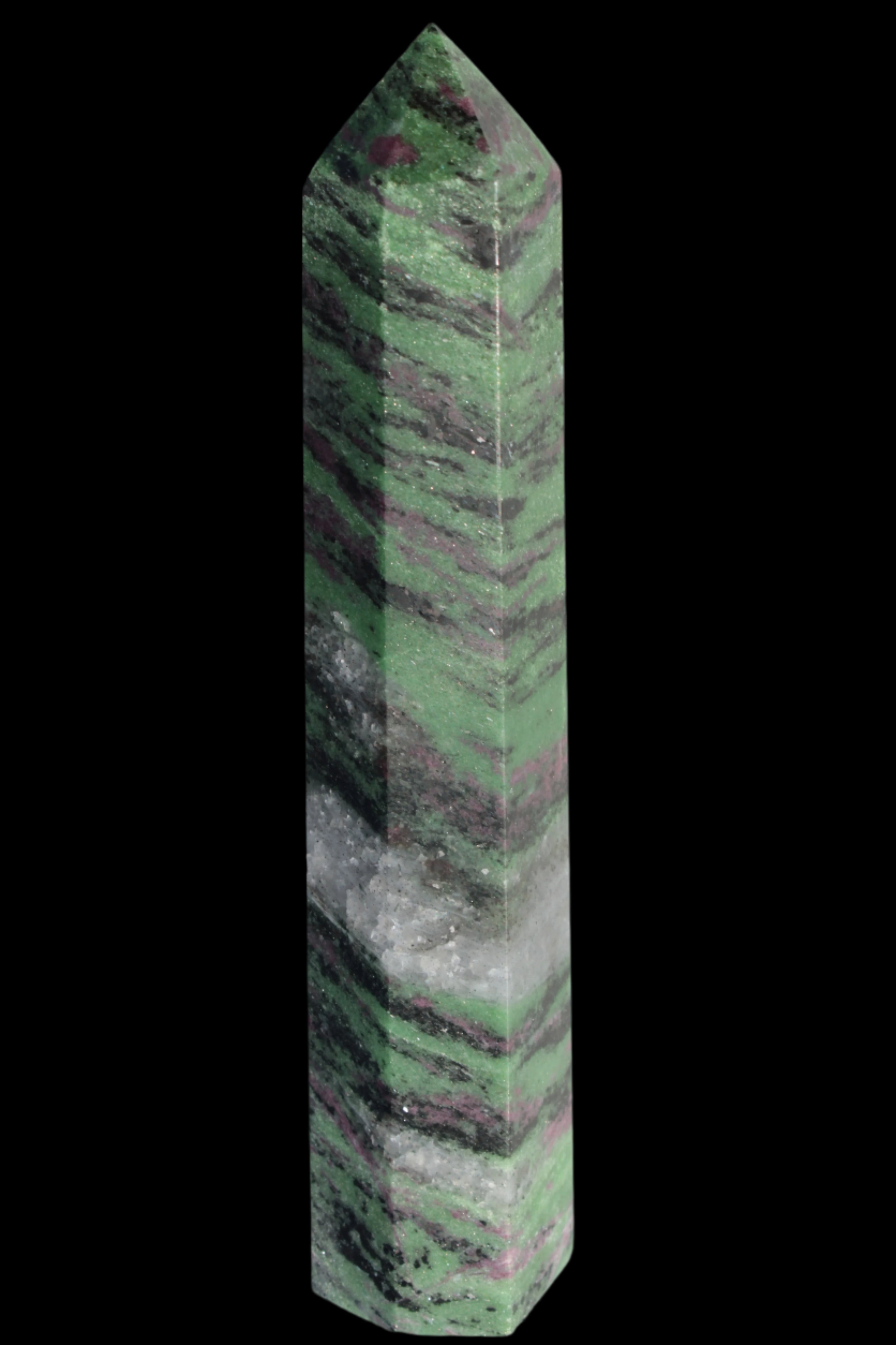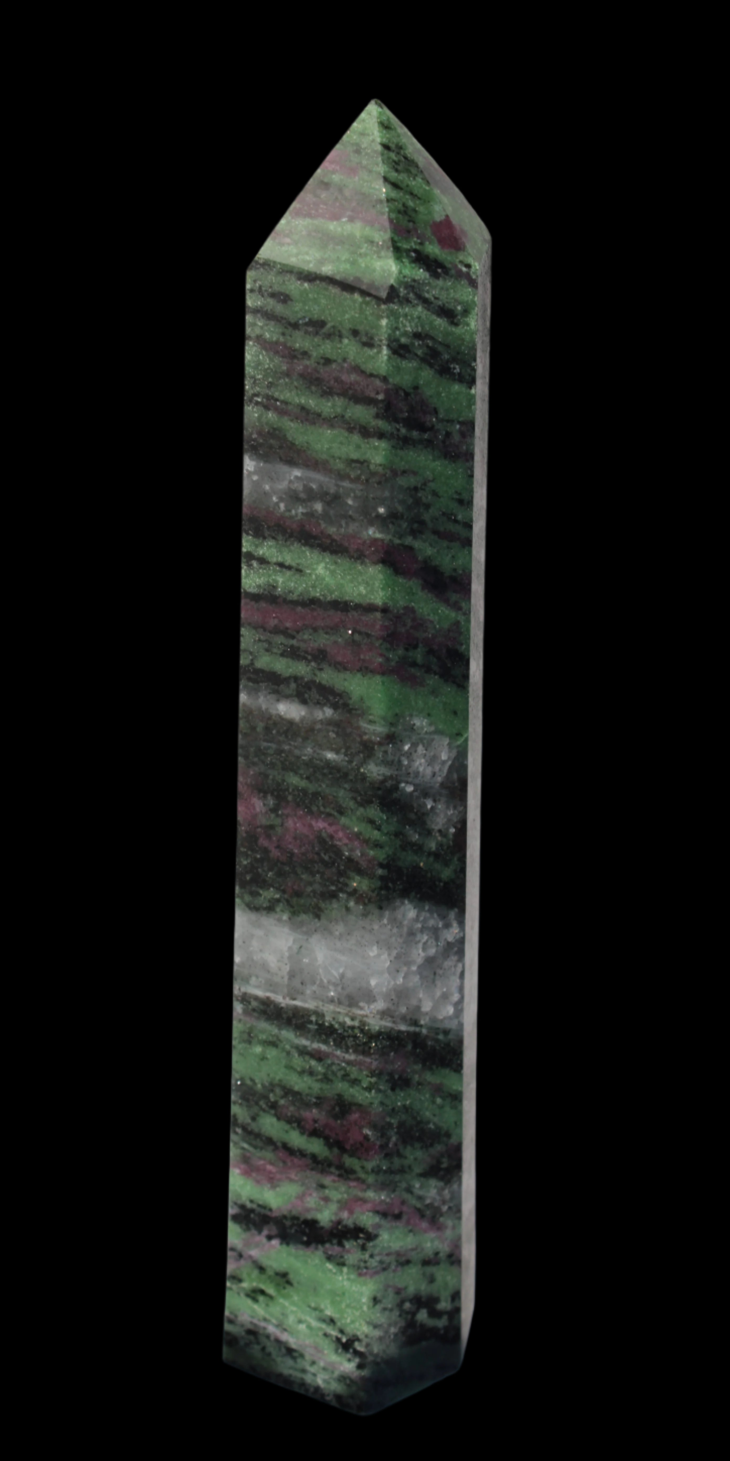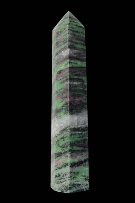 This Ruby Zoisite obelisk weighs 574g. This large, long obelisk is a beautiful example of this rarer calcium aluminium silicate hydroxide mineral. Zoisite is its own group of minerals. Zoisite is usually found combined with other minerals, most commonly with Ruby, found abundantly in this obelisk, along with quartz. It is formed from the metamorphosis of alkaline igneous rocks. Zoisites can be found in a green and black striped or spotted pattern.  The presence of chromium and vanadium is what gives it the green colour.