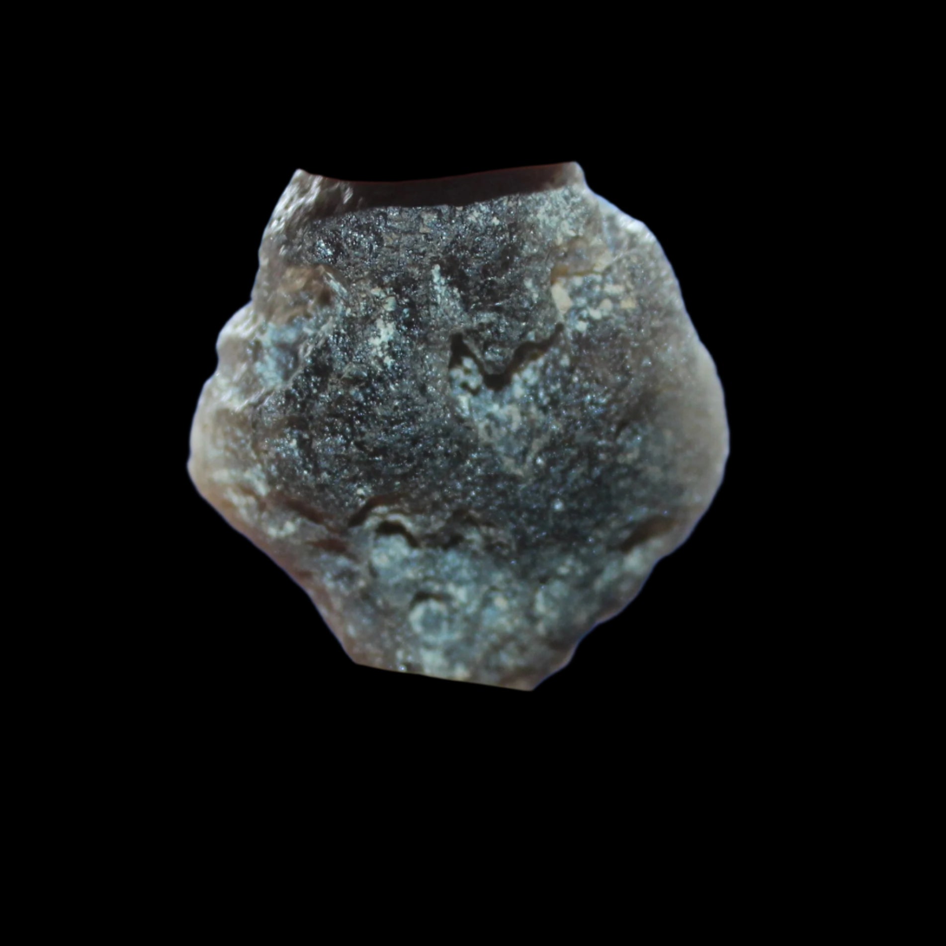 This Saffordite Tektite from Arizona weighs 8.8g. Tektites can have a similar appearance to obsidian, but have a different chemical composition. Obsidian usually contains a significant proportion of water, while Tektites lack it entirely. This difference results from their formation arising from a meteor impact on our planet Earth. This collision creates extremely high temperatures, evaporating any water present.