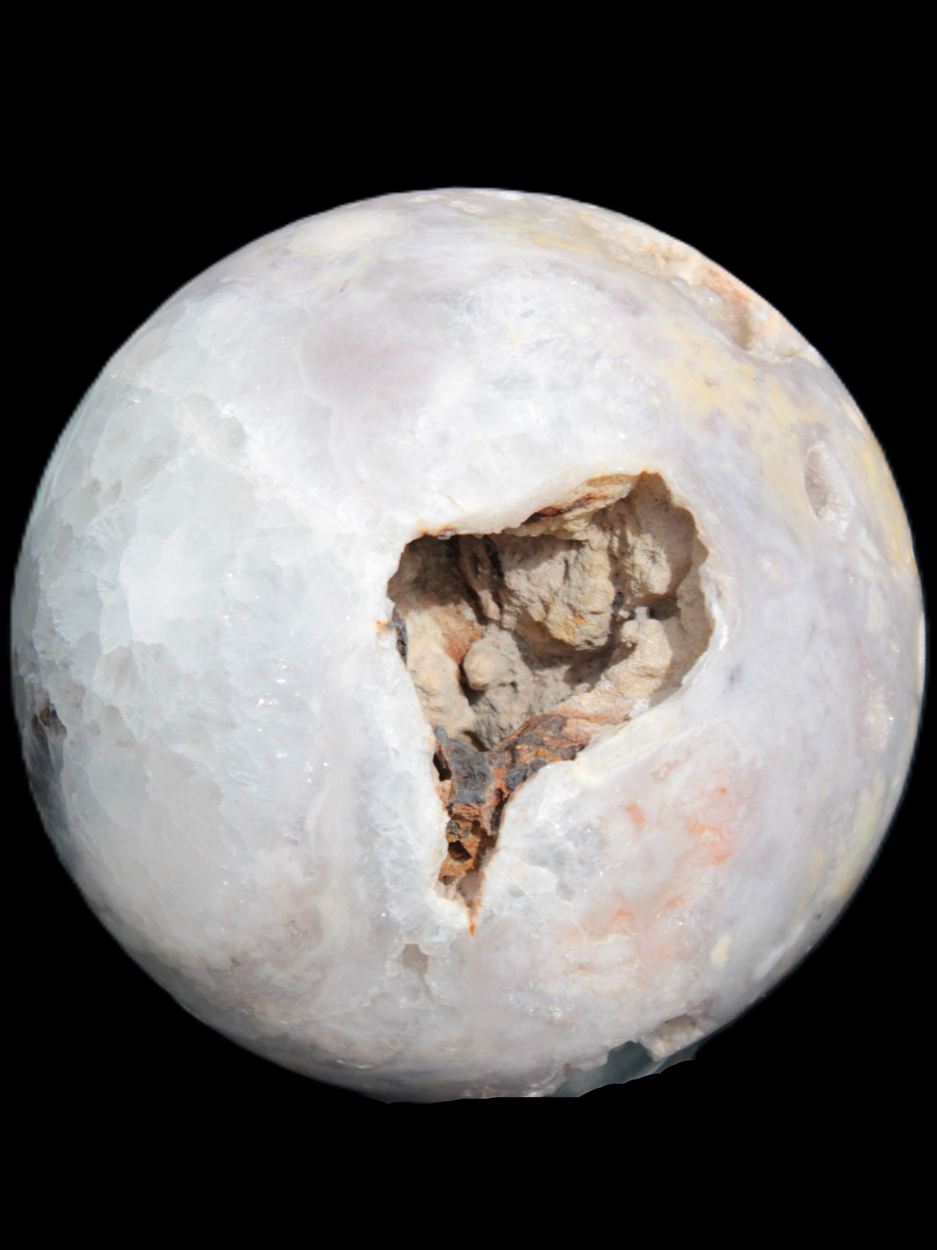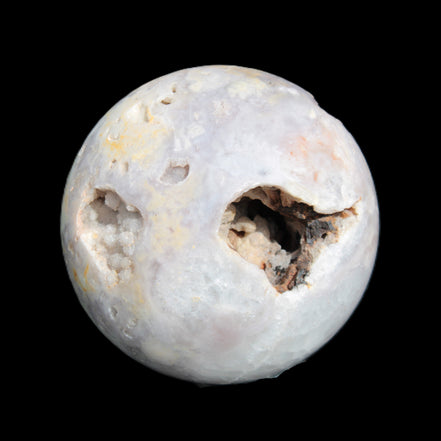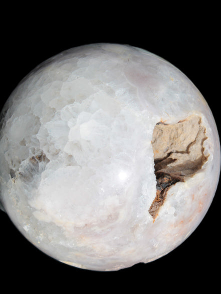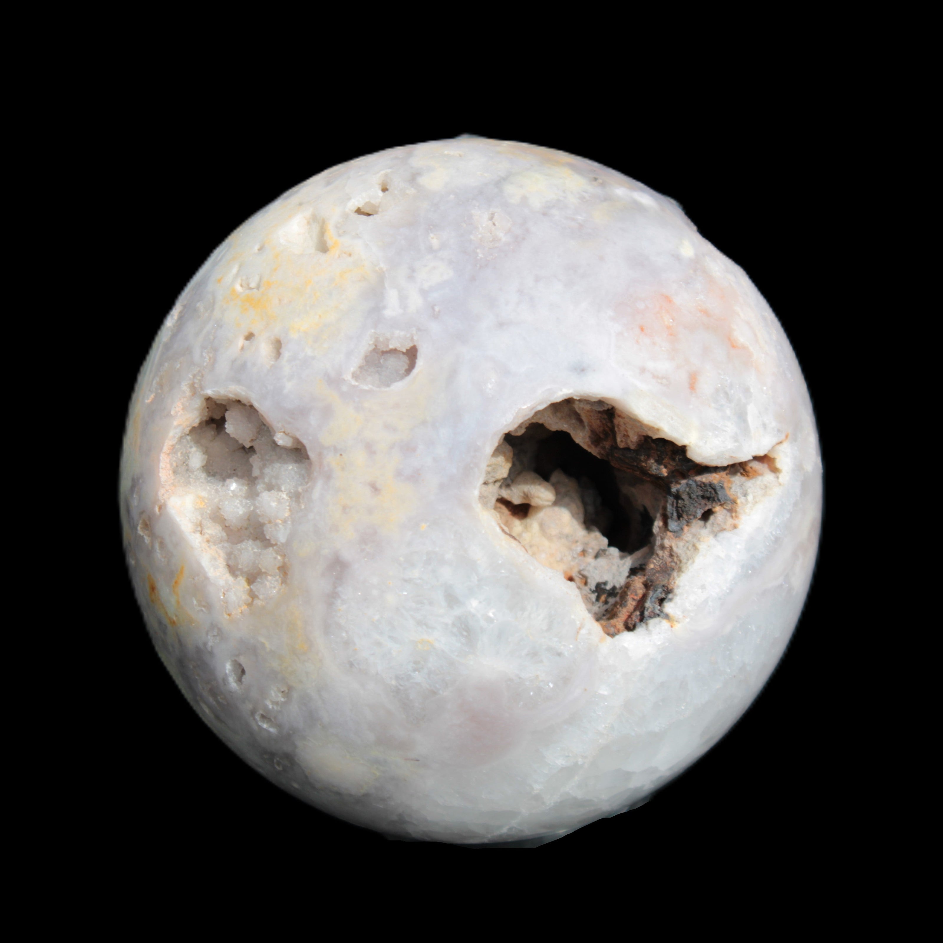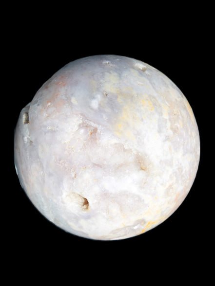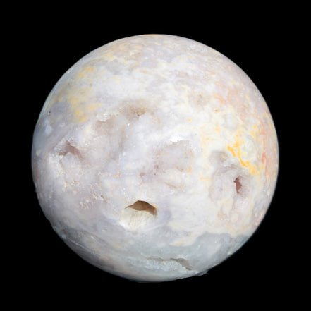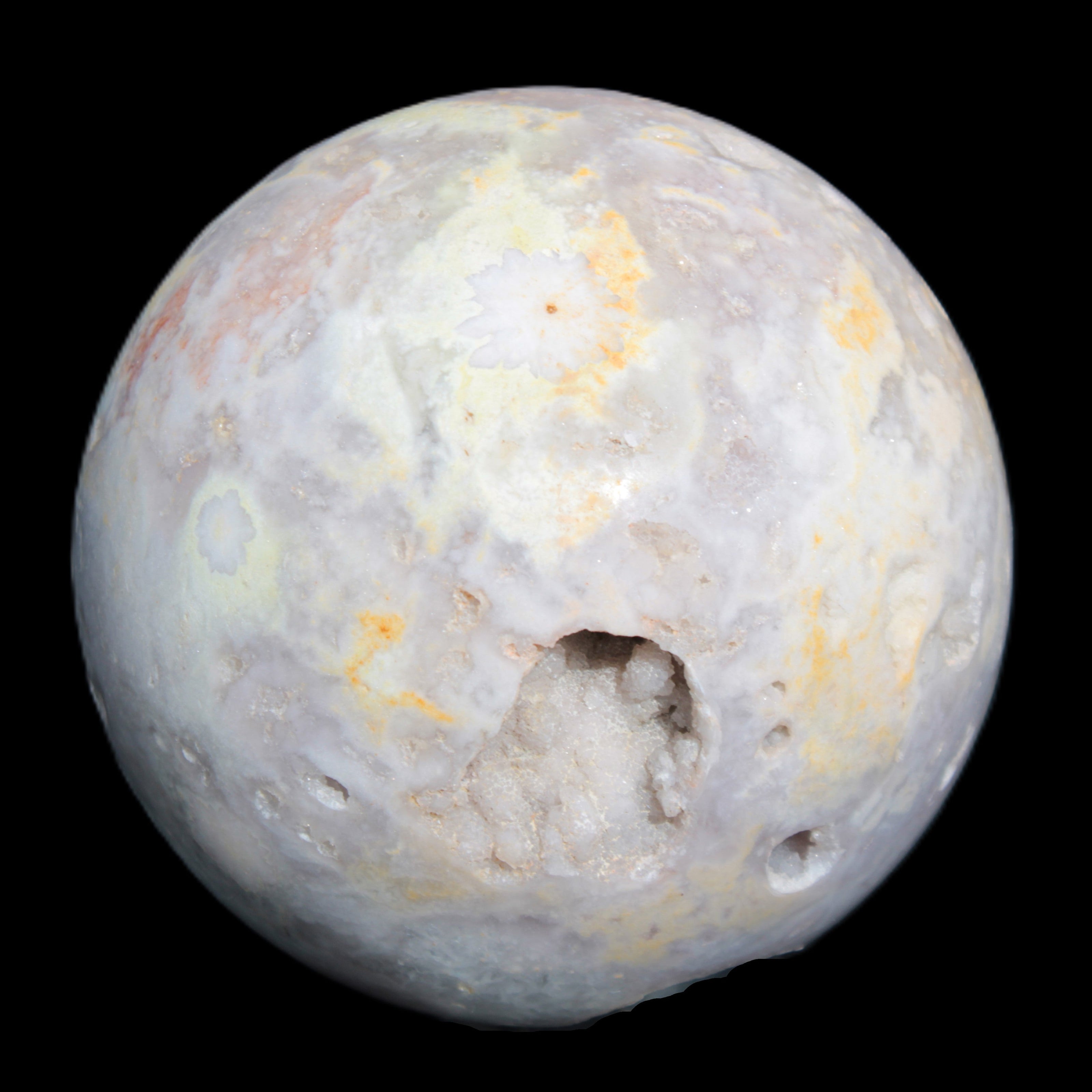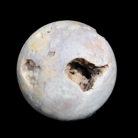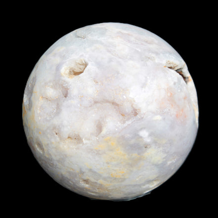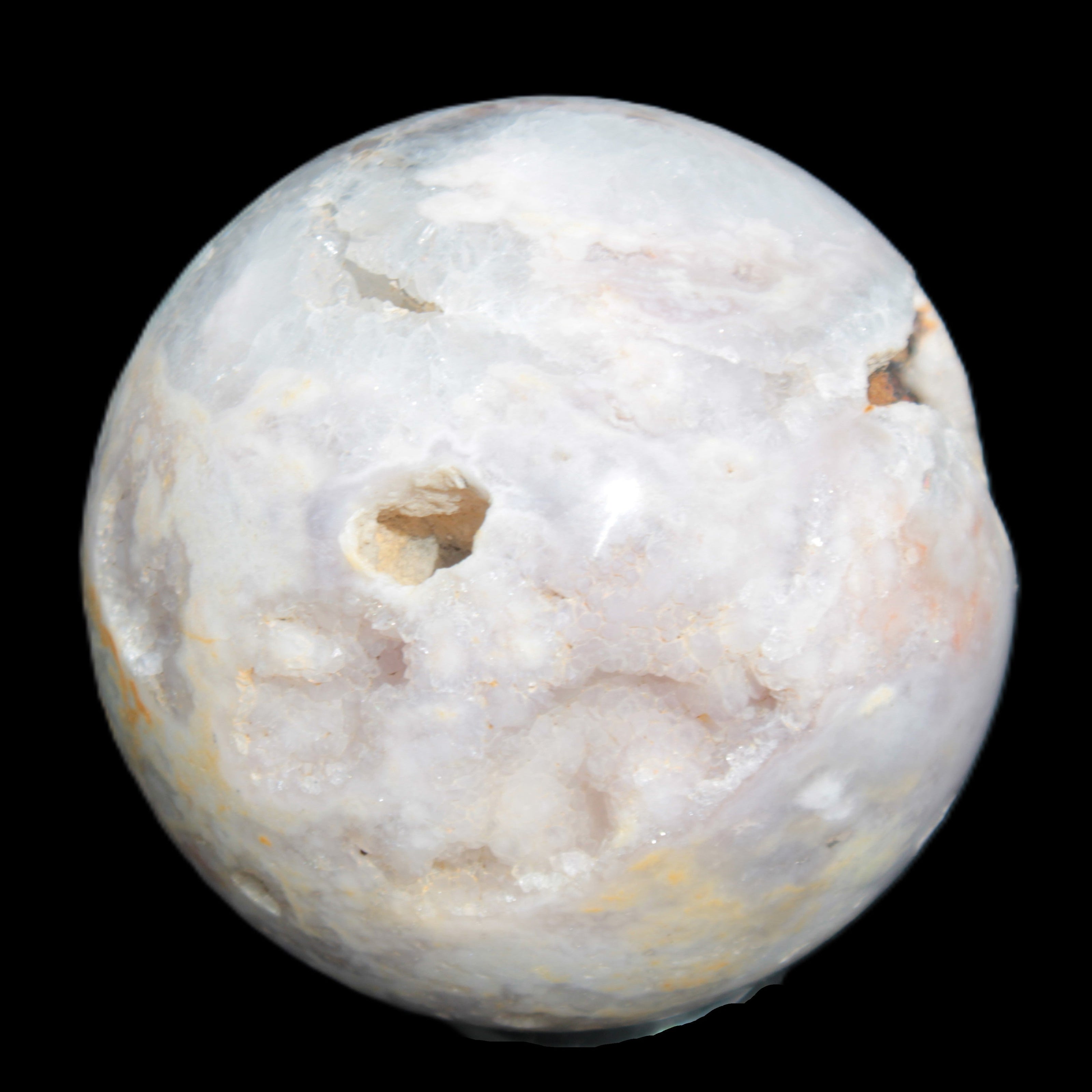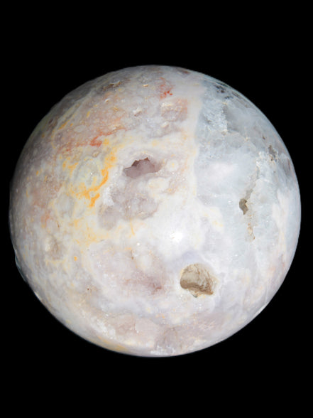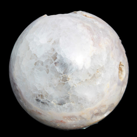 This Sakura Agate sphere 97mm weighs 1062g. This lovely sphere has many drusy and larger crystal geode caves. It also features soft pastel colors and the suggestion of crystal flowers. This look, reminiscent of cherry blossoms, gives this beautiful stone its name. When fully developed into these petal shapes this stone is known as Cherry Blossom Agate. The word Sakura is derived from the Japanese word for cherry blossoms, celebrated in Japanese culture for their beauty and symbolism.