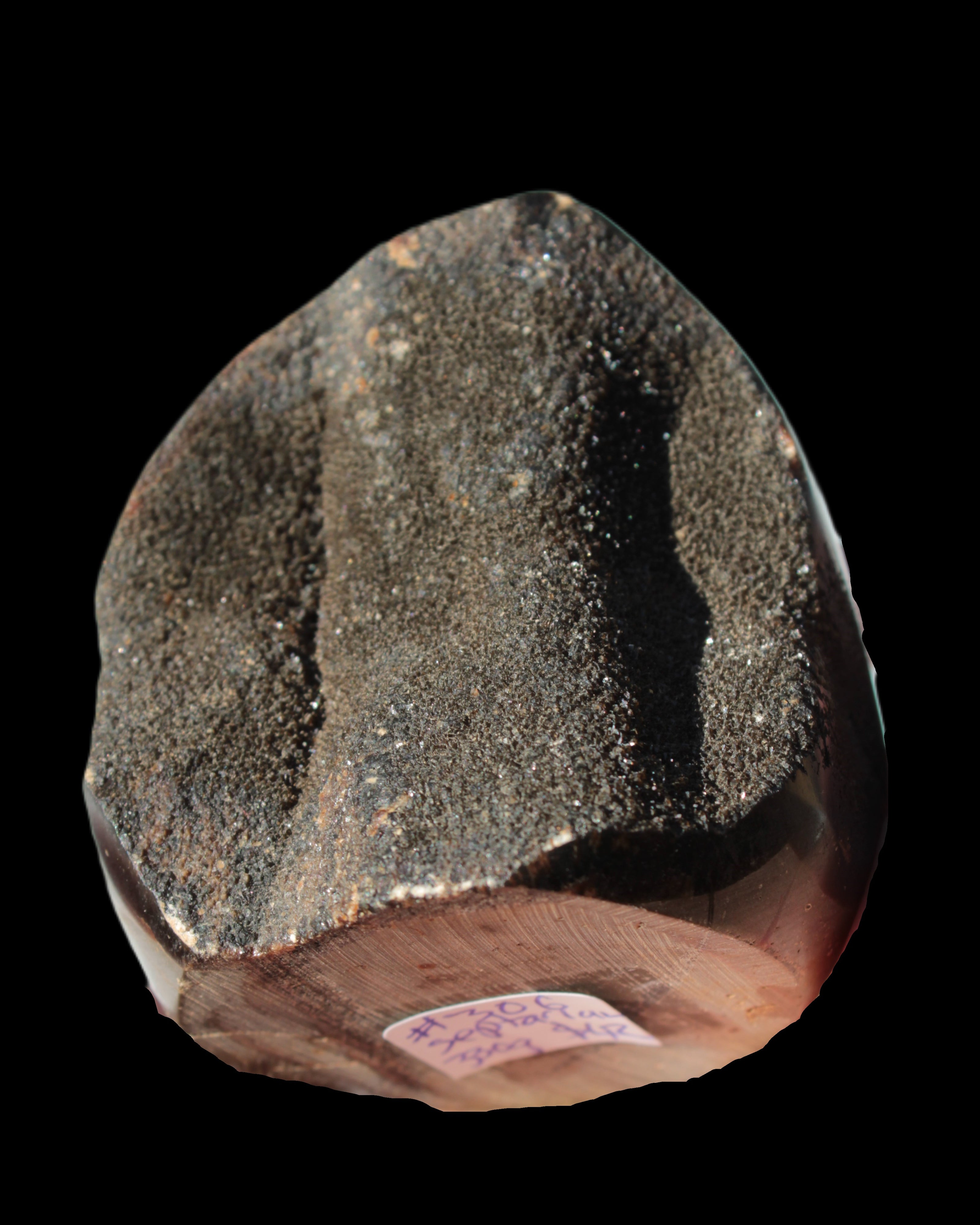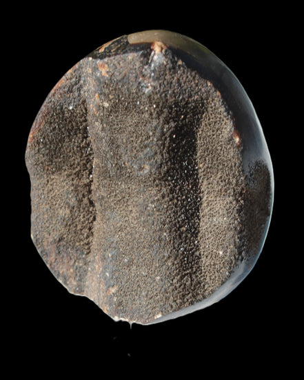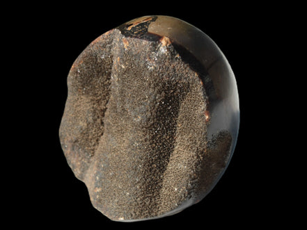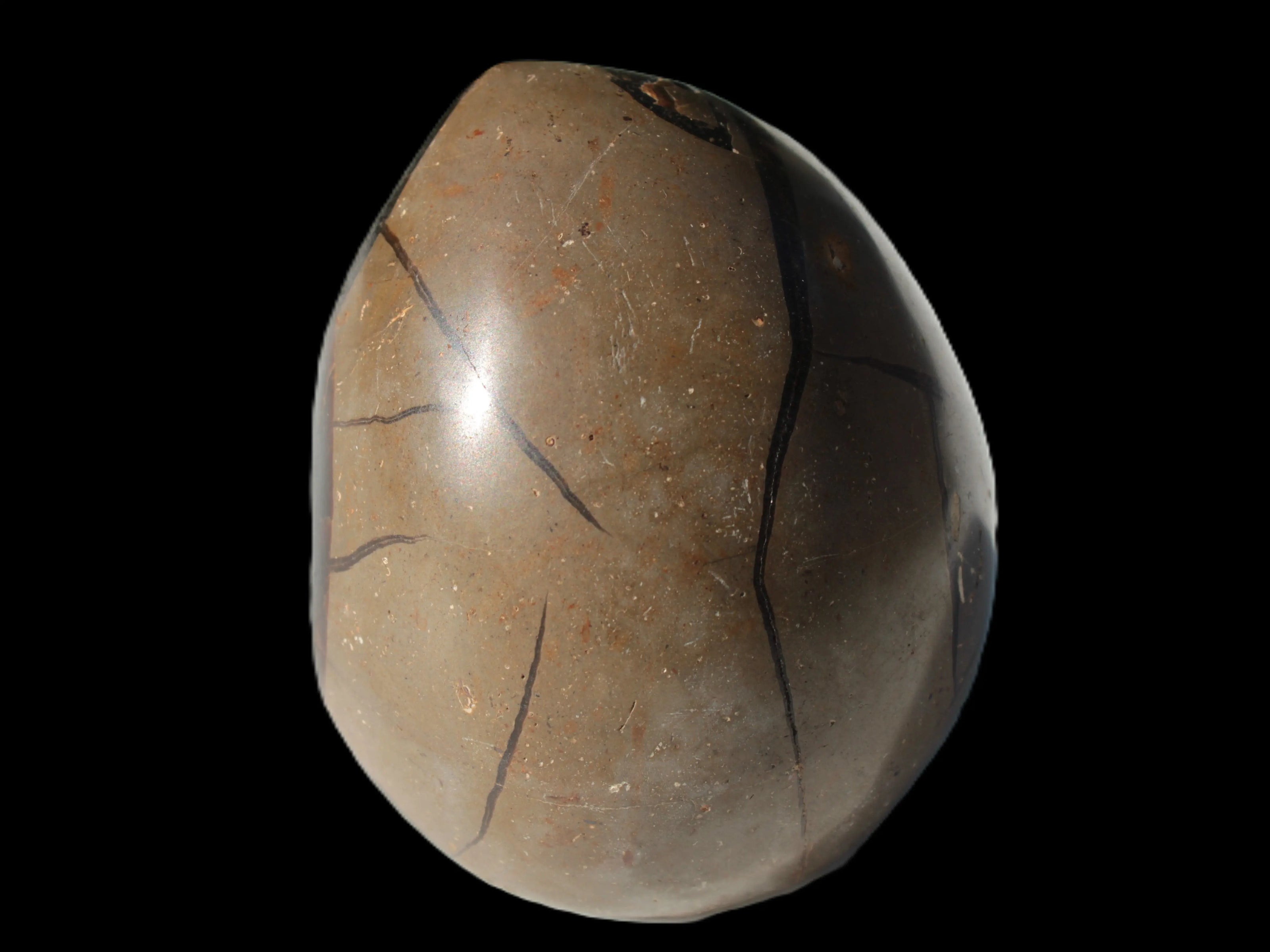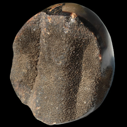 This Septarian Dragon Stone egg weighs 330g. It is black on the inside of the geode.  Septarian Dragon Stone is unique in that it resulted from volcanic eruptions on the sea floor and reactions with the shells of massed dead sea life. The altered sediment then formed mud balls which dried out into complex concretions.