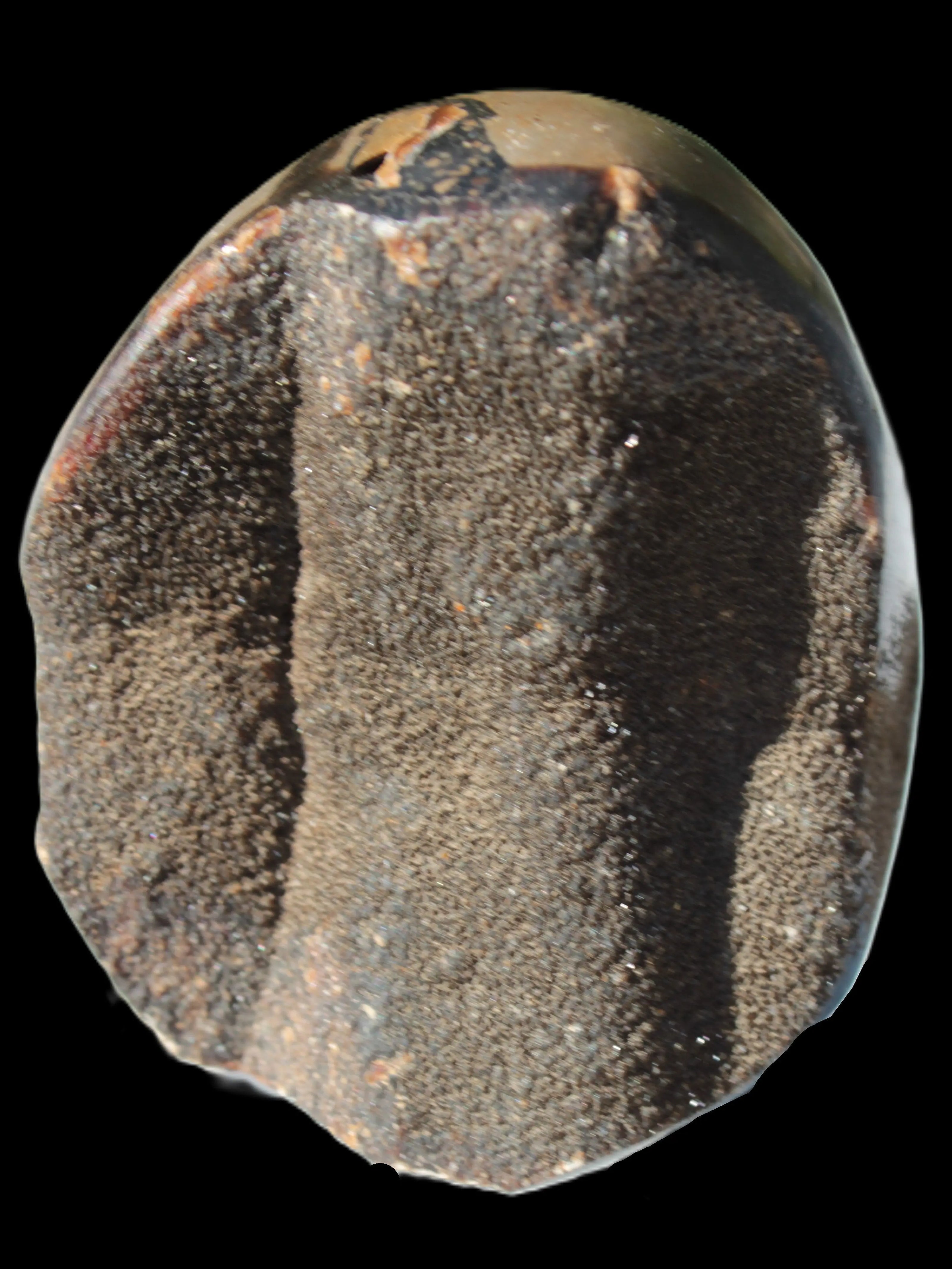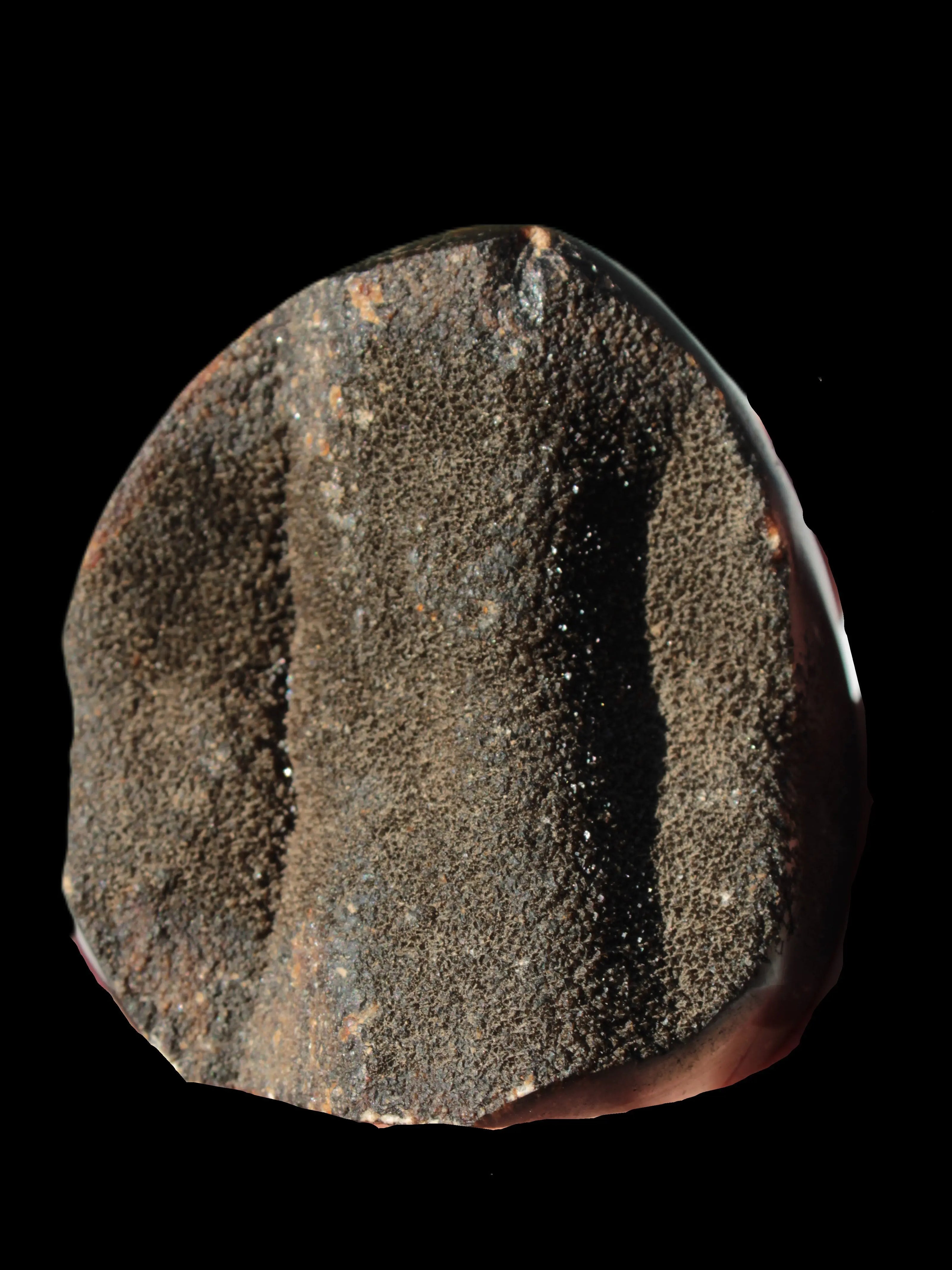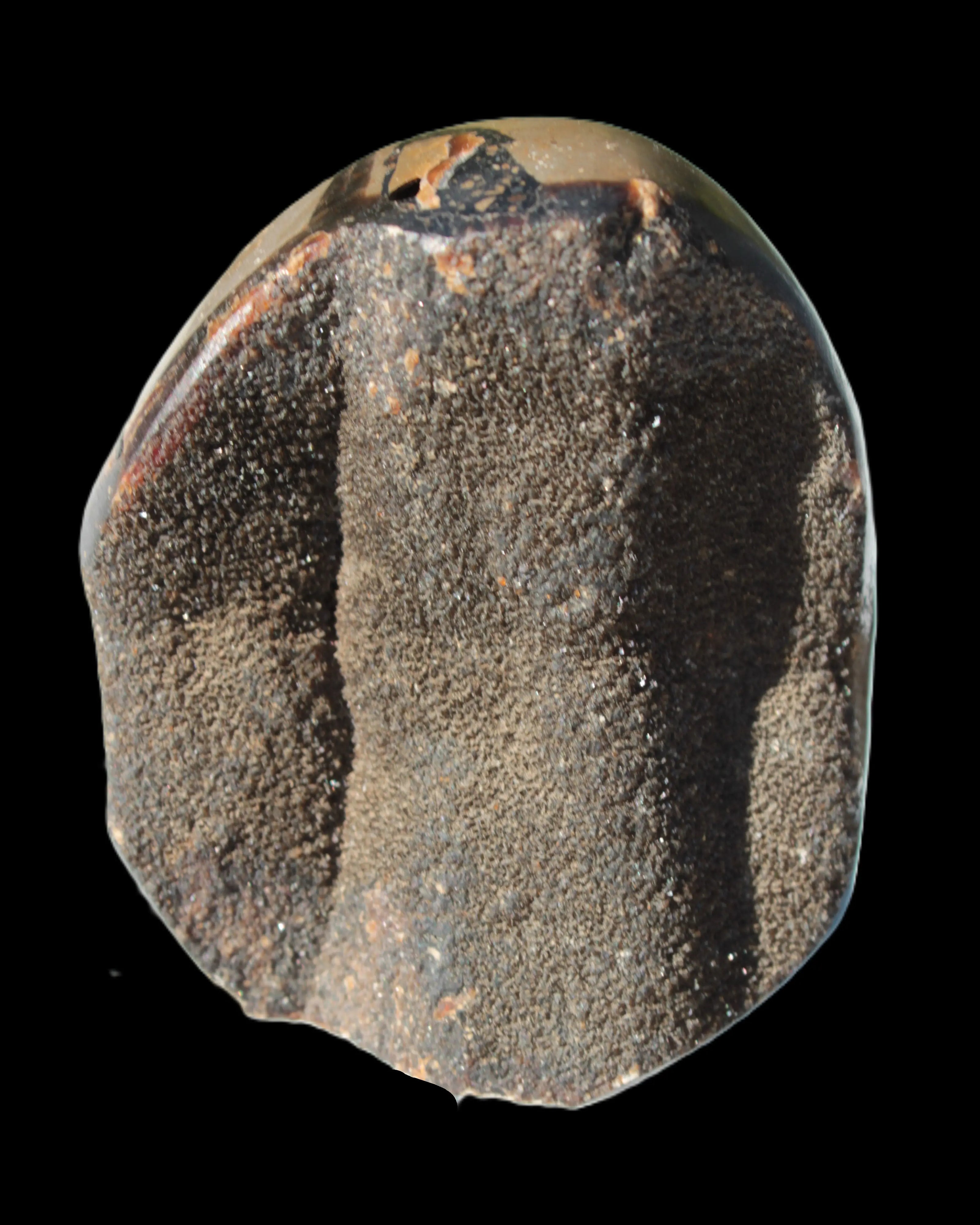 This Septarian Dragon Stone egg weighs 330g. It is black on the inside of the geode.  Septarian Dragon Stone is unique in that it resulted from volcanic eruptions on the sea floor and reactions with the shells of massed dead sea life. The altered sediment then formed mud balls which dried out into complex concretions.