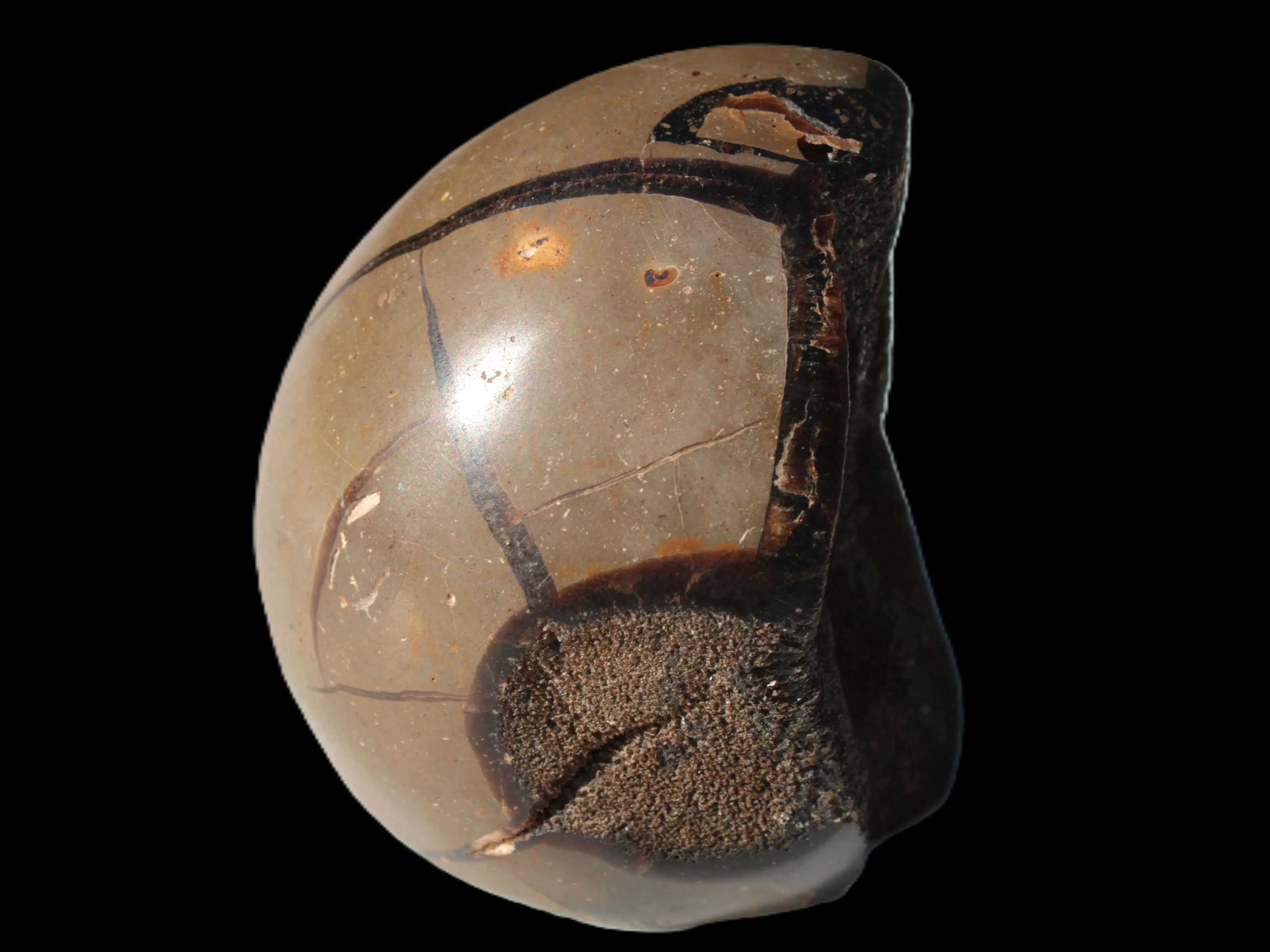 The geodes are composed of Calcite, which makes up the yellow centres and Aragonite which are the brown lines. The outer grey rock is Limestone. The name Septarian comes from the Latin word septum meaning seven, and saeptum, which means a wall or enclosure. As the balls dried, they shrank, with a tendency to create a distinctive pattern sometimes featuring seven points.