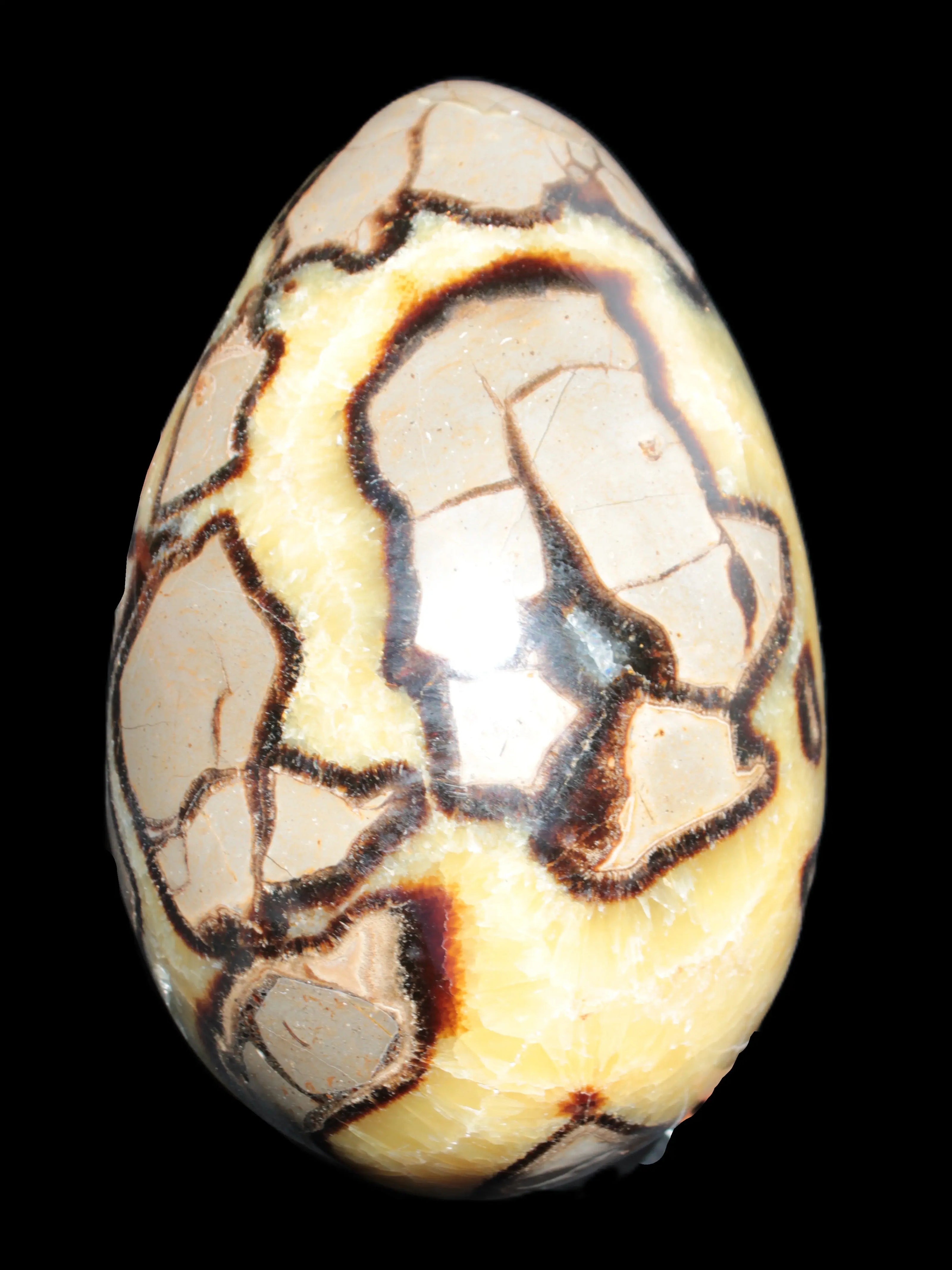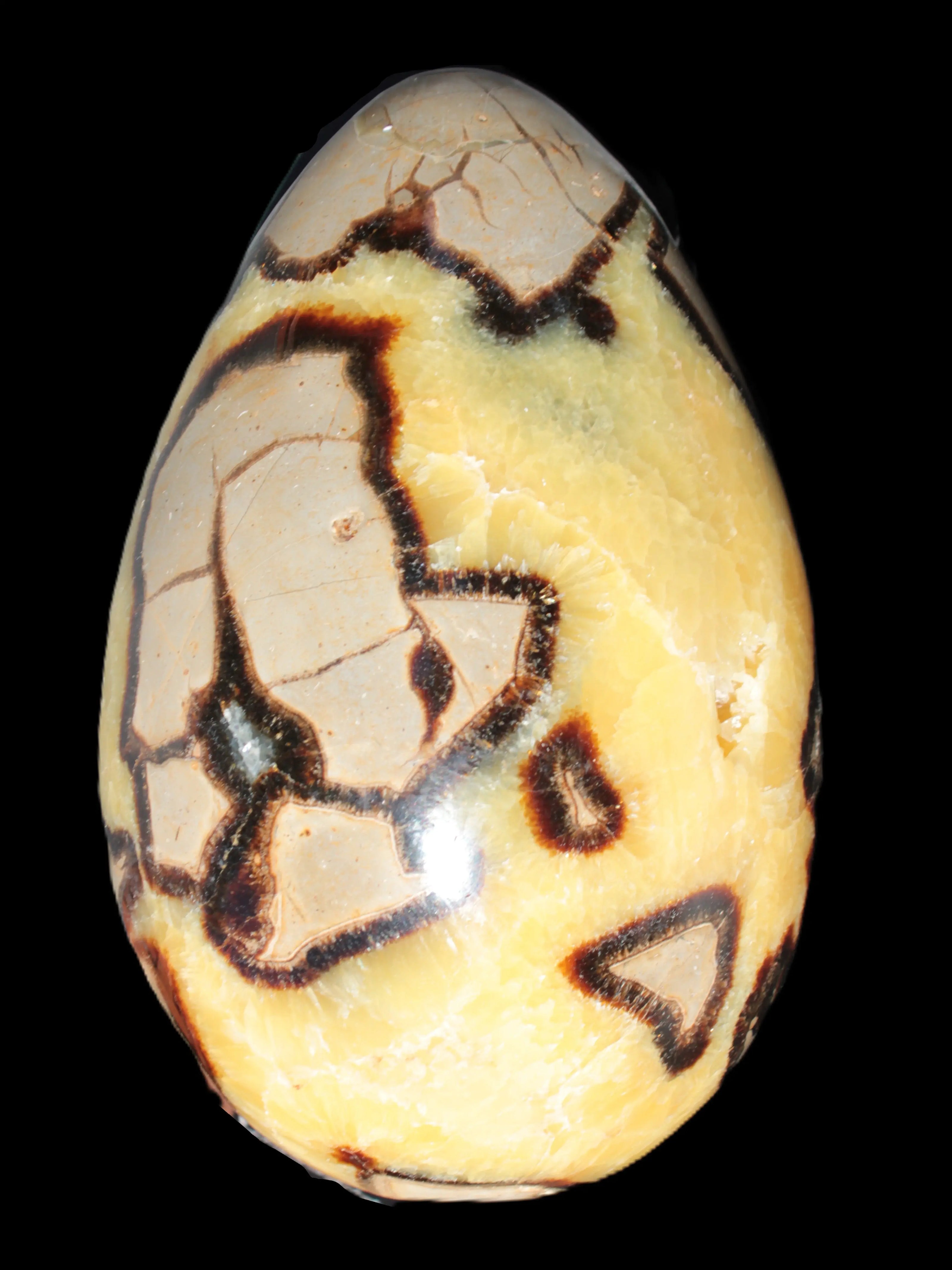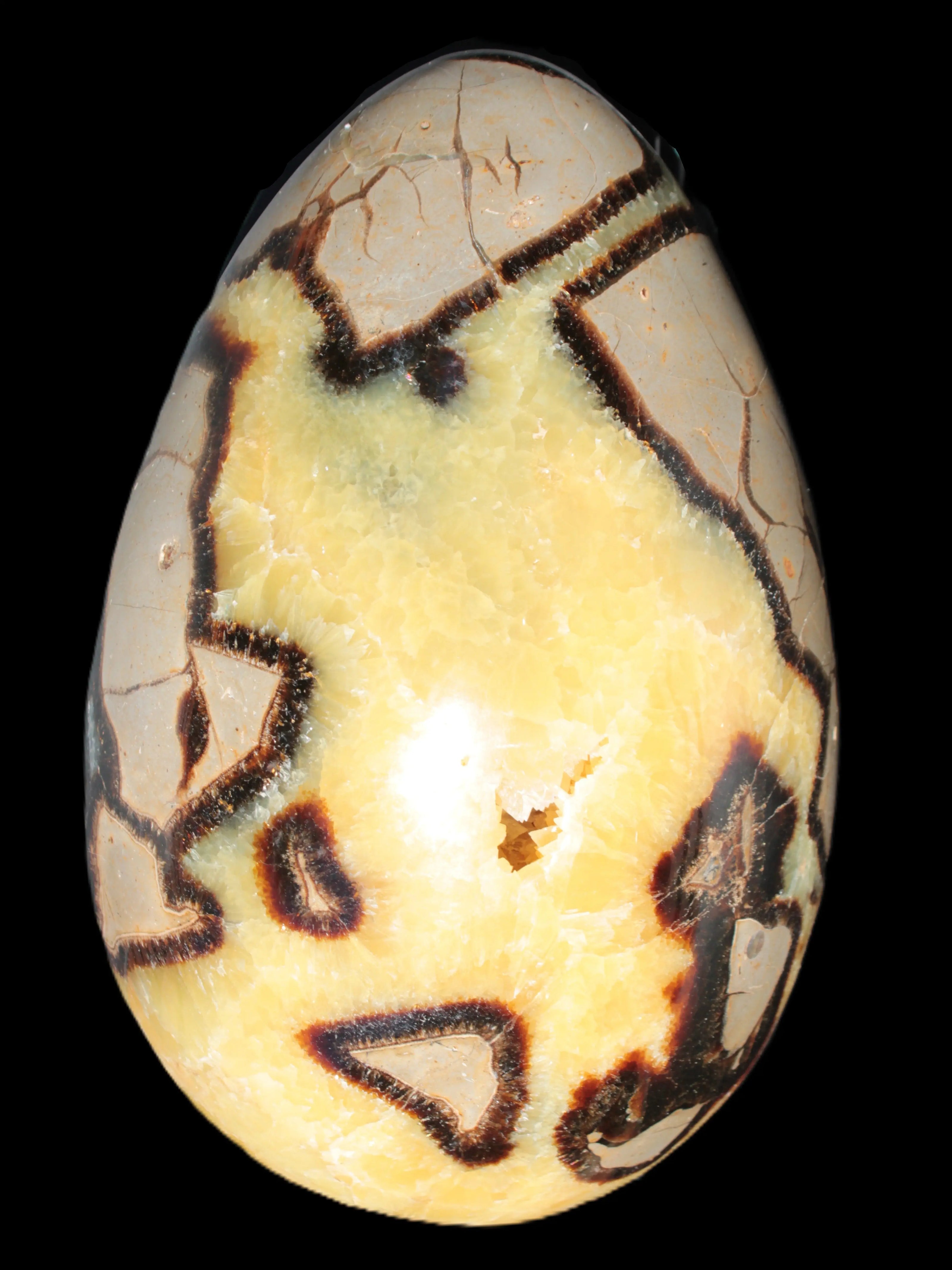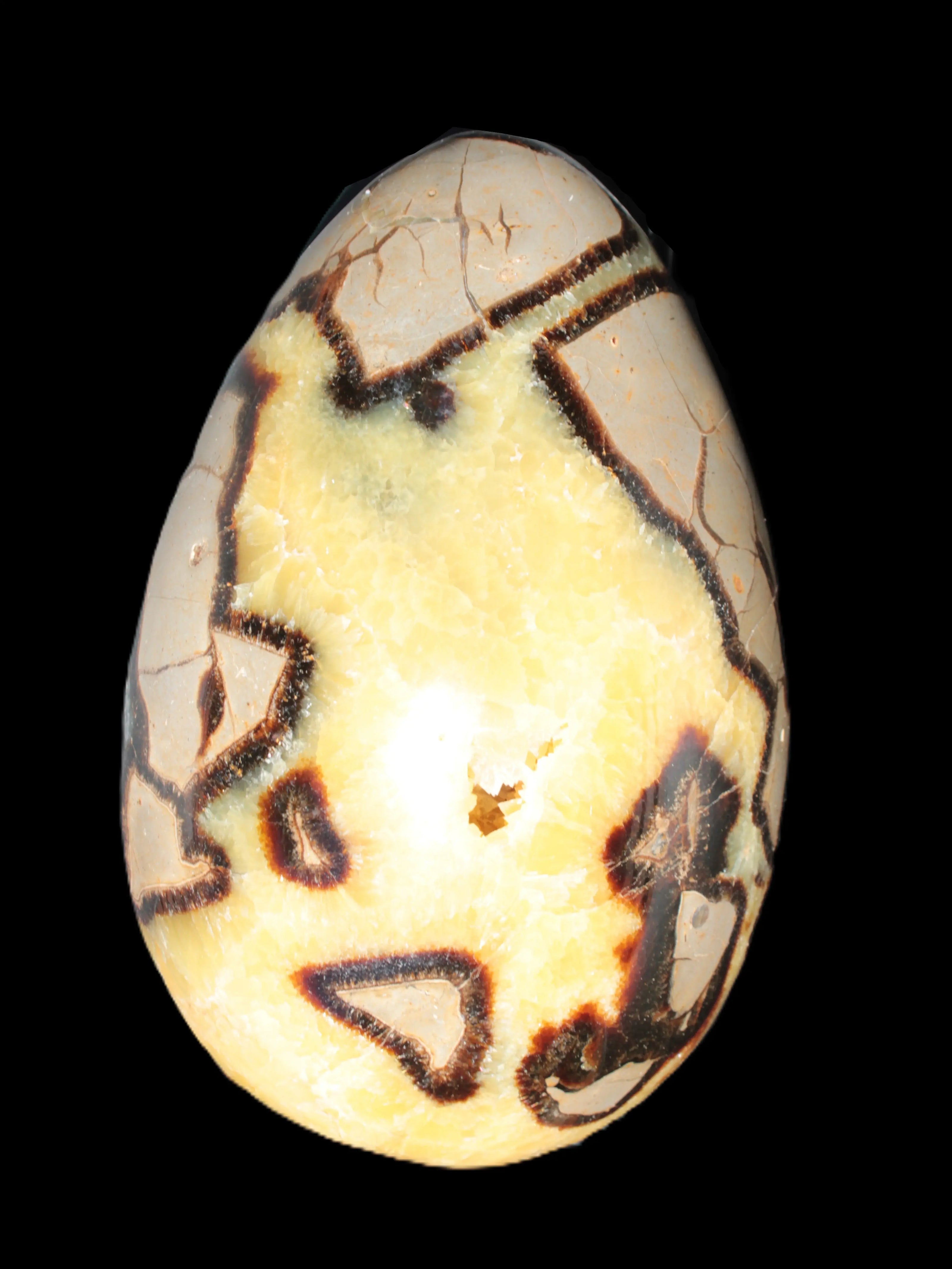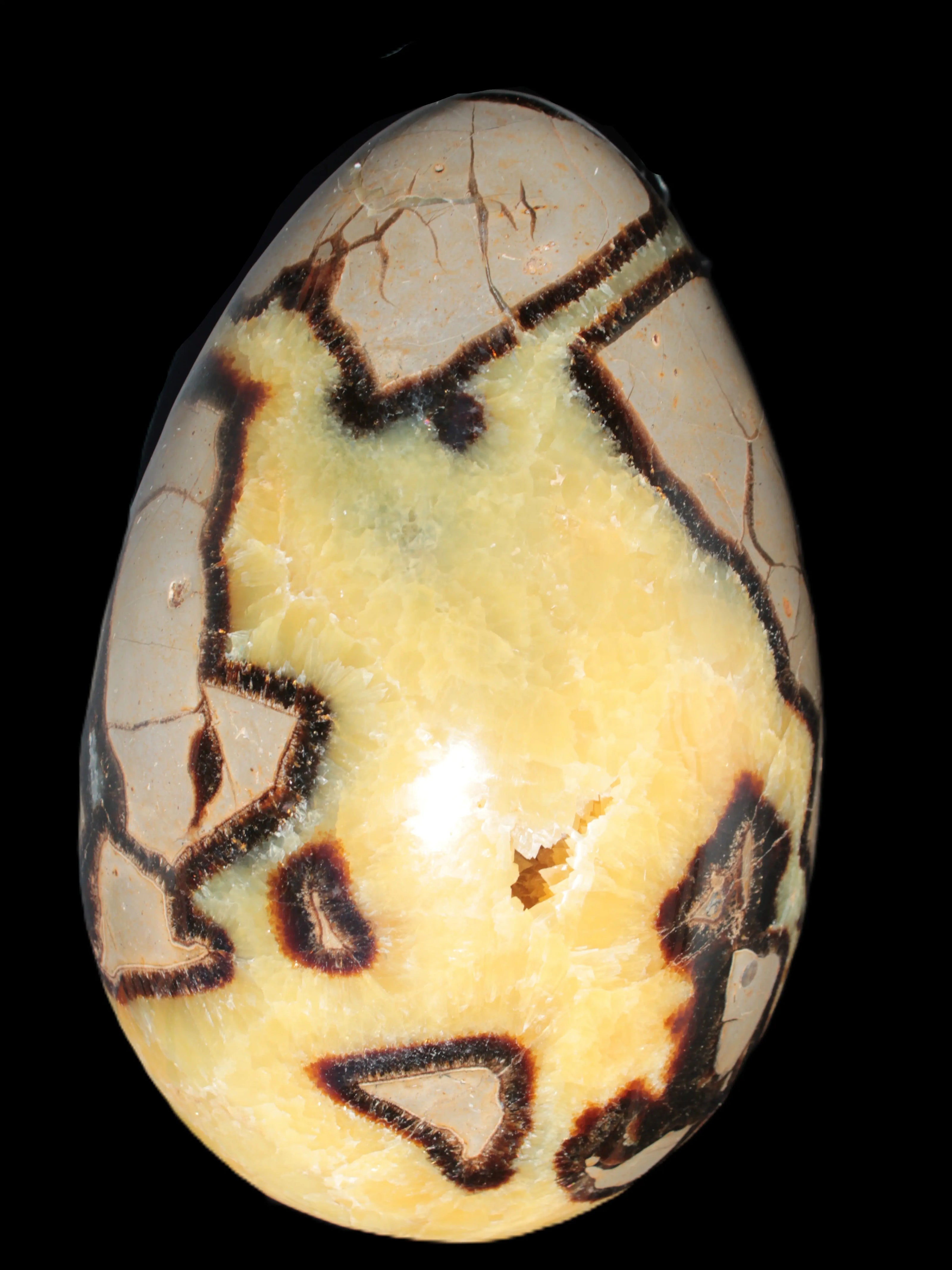 This big Septarian Dragon Stone geode 195*125*110mm weighs 4080g. It is a huge Septarian Dragons Egg. Septarian resulted from volcanic eruptions on the sea floor and reactions with the shells of dead sea life. The altered sediment then formed mud balls which dried out into complex concretions. The geodes are composed of Calcite, which makes up the yellow centres and Aragonite which are the brown lines. The outer grey rock is Limestone.