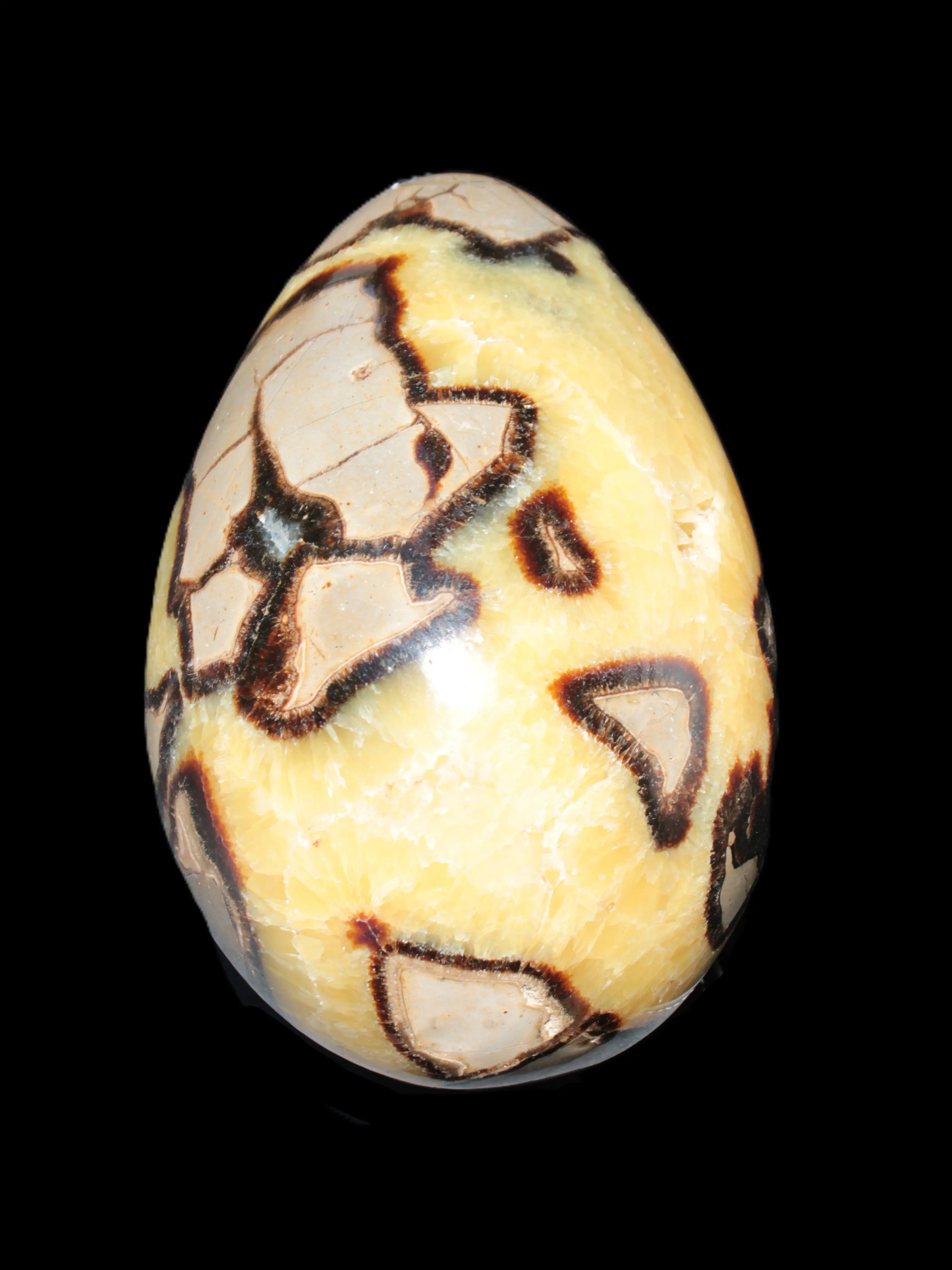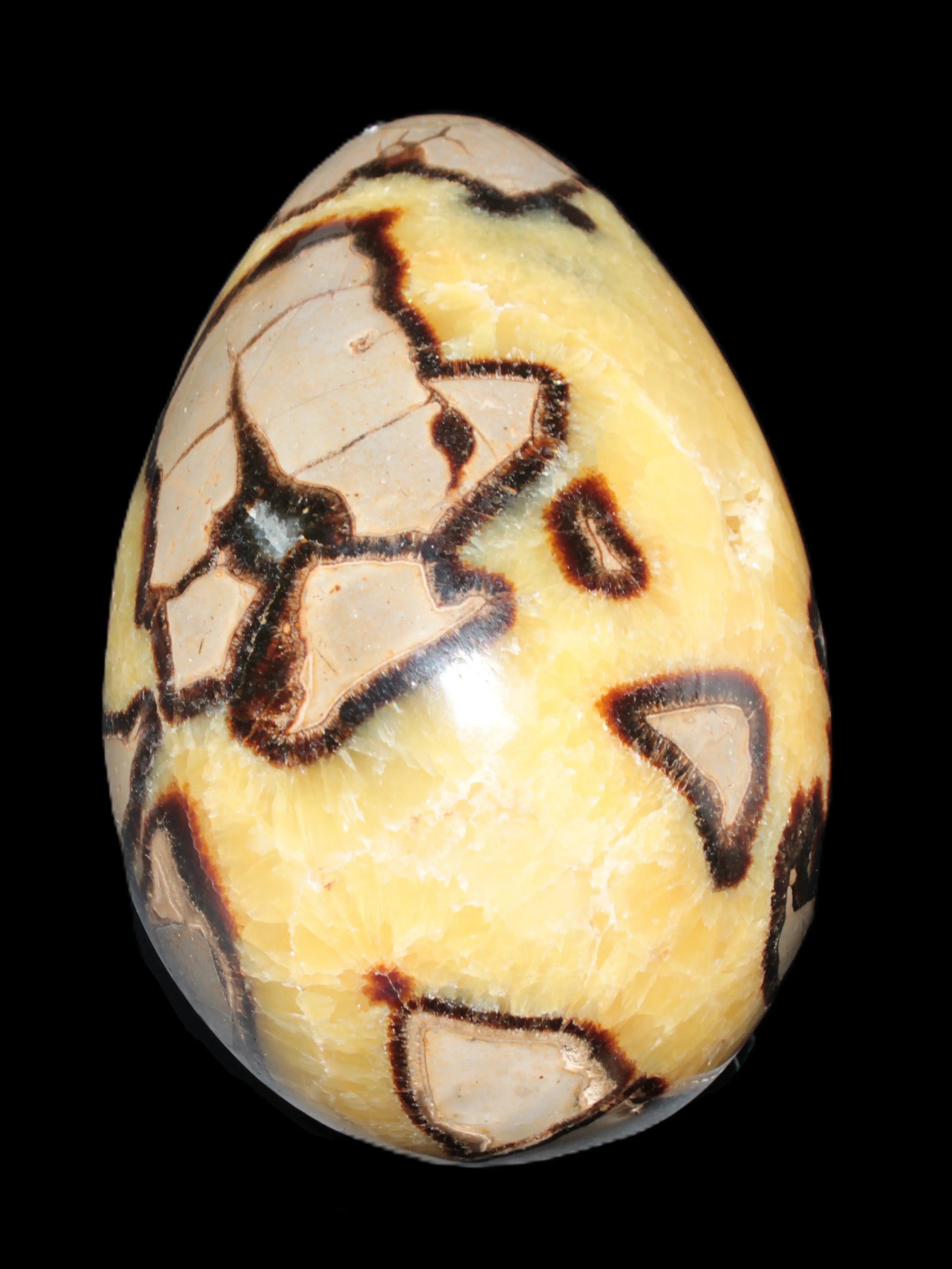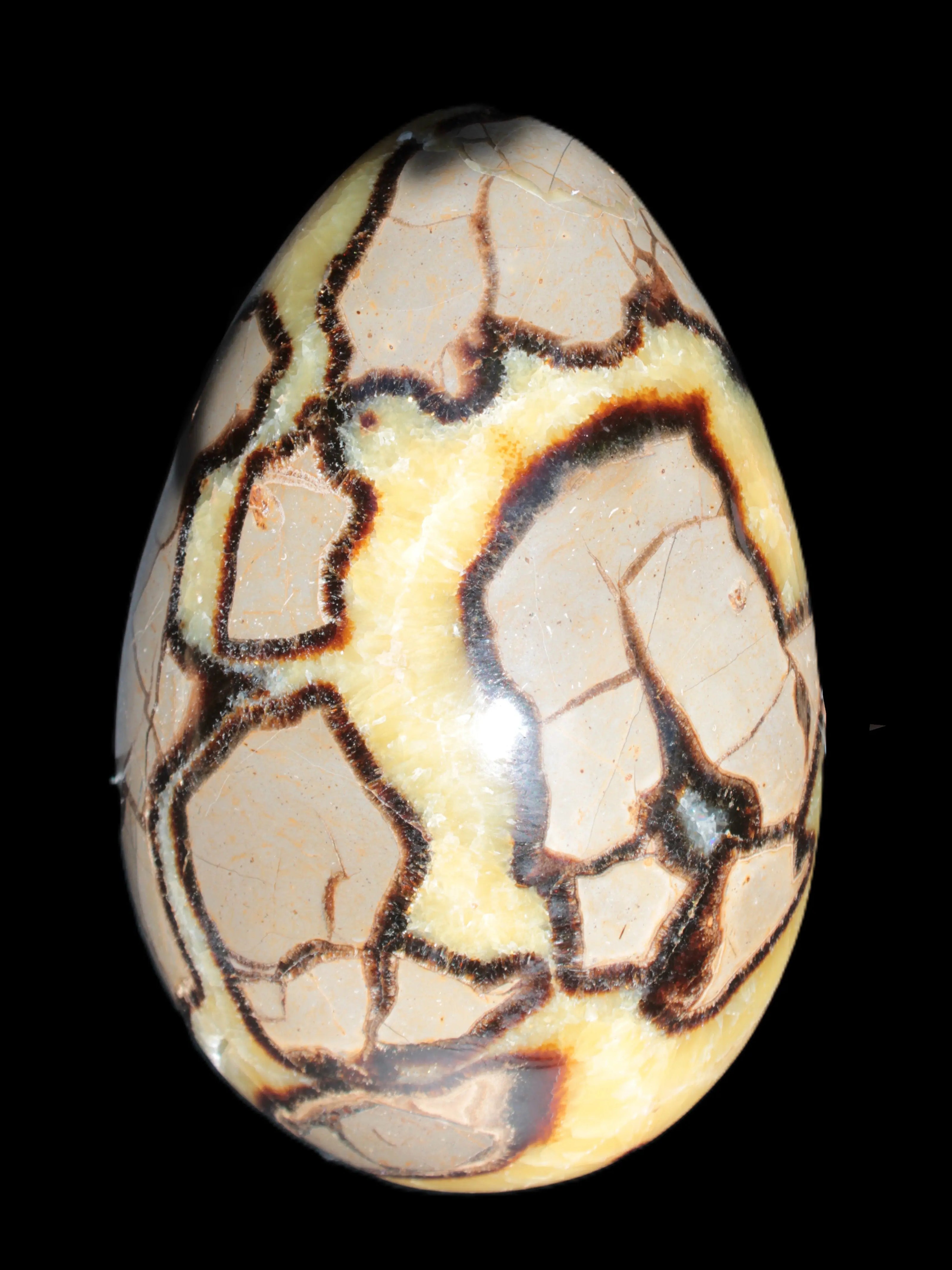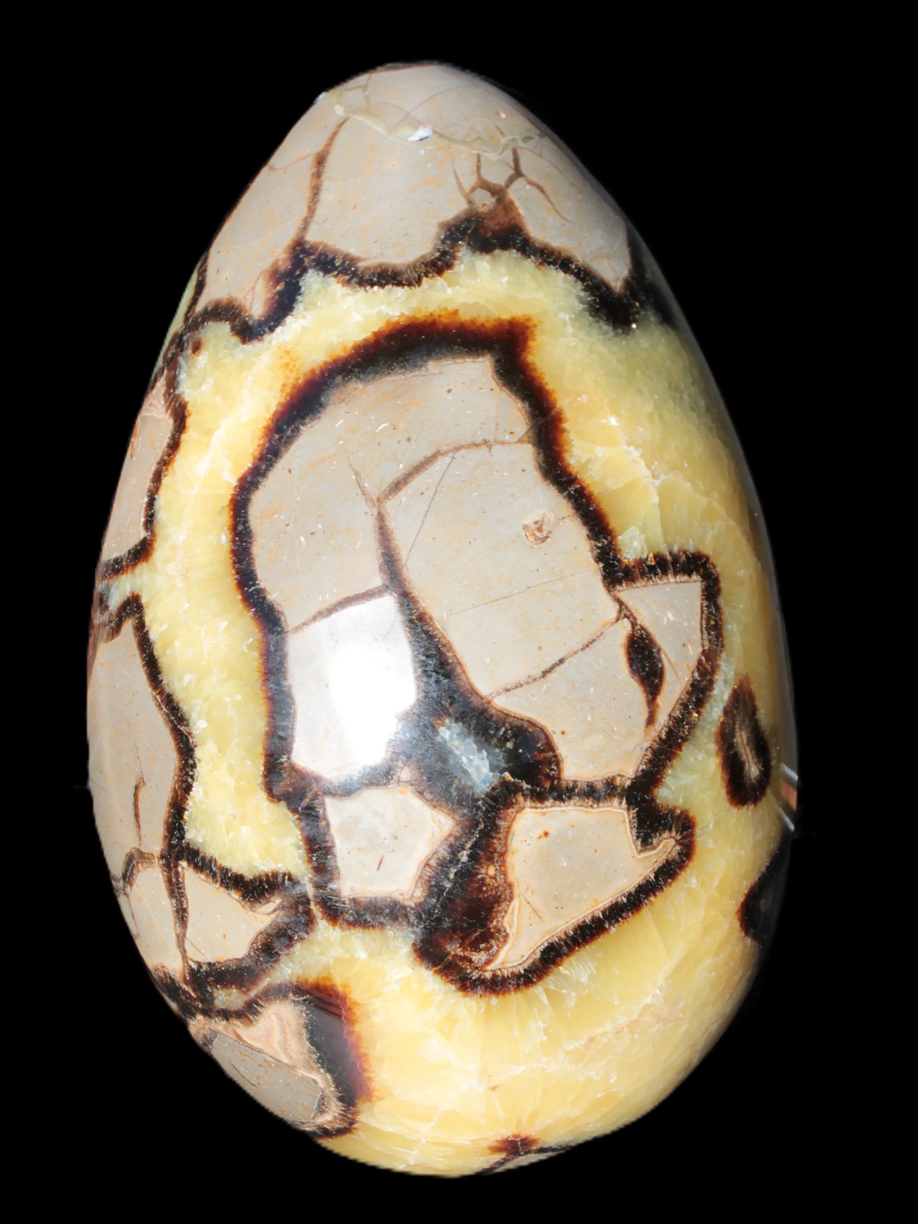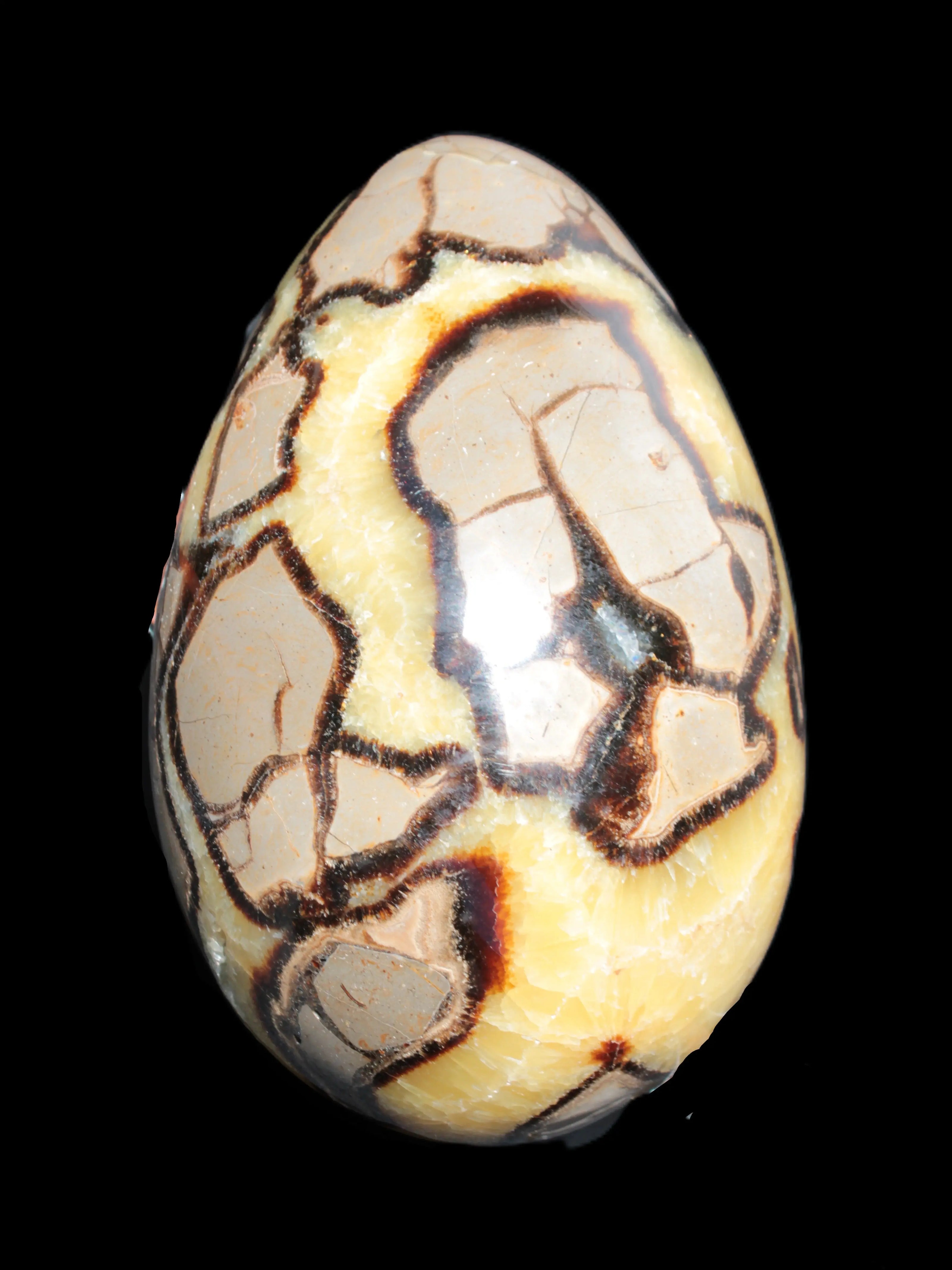 This big Septarian Dragon Stone geode 195*125*110mm weighs 4080g. It is a huge Septarian Dragons Egg. Septarian resulted from volcanic eruptions on the sea floor and reactions with the shells of dead sea life. The altered sediment then formed mud balls which dried out into complex concretions. The geodes are composed of Calcite, which makes up the yellow centres and Aragonite which are the brown lines. The outer grey rock is Limestone.
